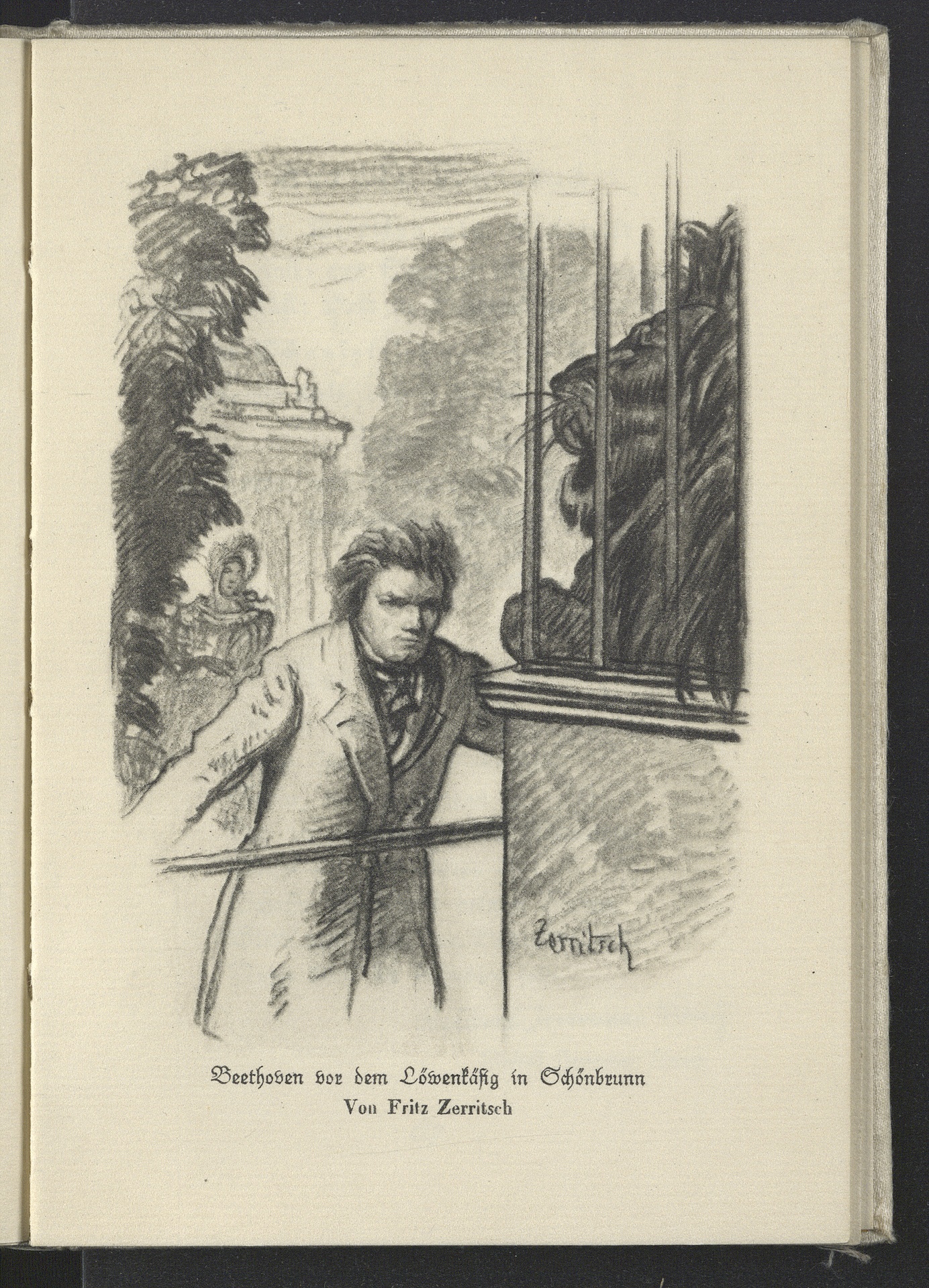 Beethoven vor dem Löwenkäfig in Schönbrunn - Druck einer Zeichnung von Fritz Zerritsch, gedruckt bei Elbemühl Papierfabriken und Graphische Industrie, Wien 1927