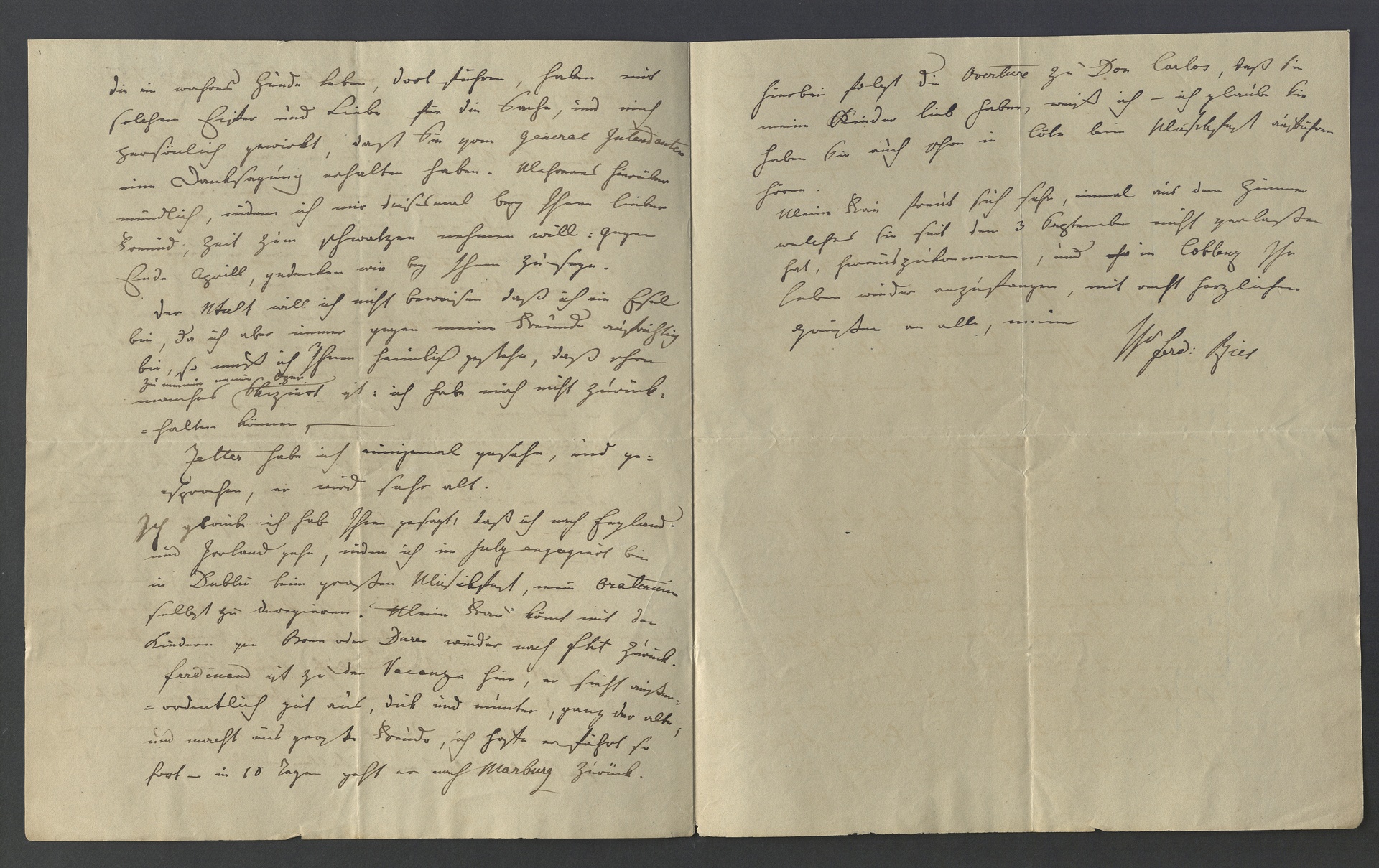 Ries hat sich vergebens Hoffnung auf Gaspare Spontinis Nachfolge an der Berliner Oper gemacht. Spontini wird aus Paris nach Berlin zurückkehren. Mit nur acht Proben ist unter dem neuen Generalintendanten der preußischen Hoftheater, Friedrich Wilhelm von Redern, eine künstlerisch hochwertige Aufführung von Ries' Oper "Die Räuberbraut" gegeben worden. Ries lobt besonders den Chor, der für seine Leistung vom Generalintendanten ausgezeichnet worden ist. Ries vertraut Wegeler an, dass er schon Teile der neuen Oper "The Sorceress" op. 164 skizziert hat. Mehrmals hat er den Komponisten und Musikpädagogen Karl Friedrich Zelter getroffen und mit ihm über die bevorstehende Konzertreise nach England und Irland gesprochen. Seinem Schreiben legt Ries die Wegeler gewidmete Ouvertüre zu Schillers "Don Carlos" op. 94 mit dem Hinweis bei: "Daß Sie meine Kinder lieb haben, weiß ich." Wegeler habe das Werk schon auf dem Niederrheinischen Musikfest in Köln gehört. Die Widmung auf dem Titel der bei Simrock 1831 erschienenen Stimmenausgabe lautet "seinem Freunde / dem Herrn geheimen Ober Medicinal- u. Regierungsrath / Wegeler / Ritter mehrerer Orden". (F.G.)