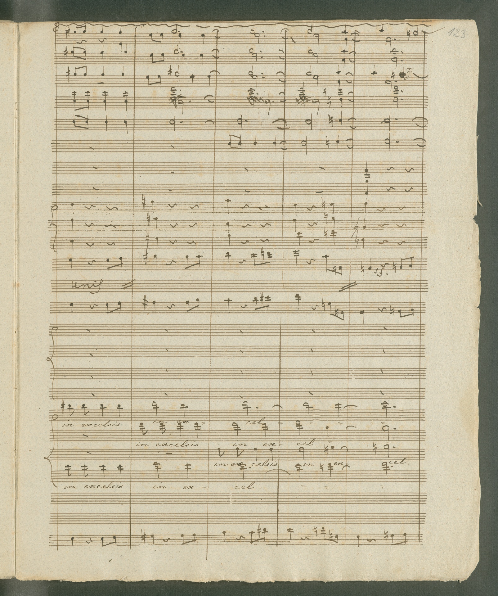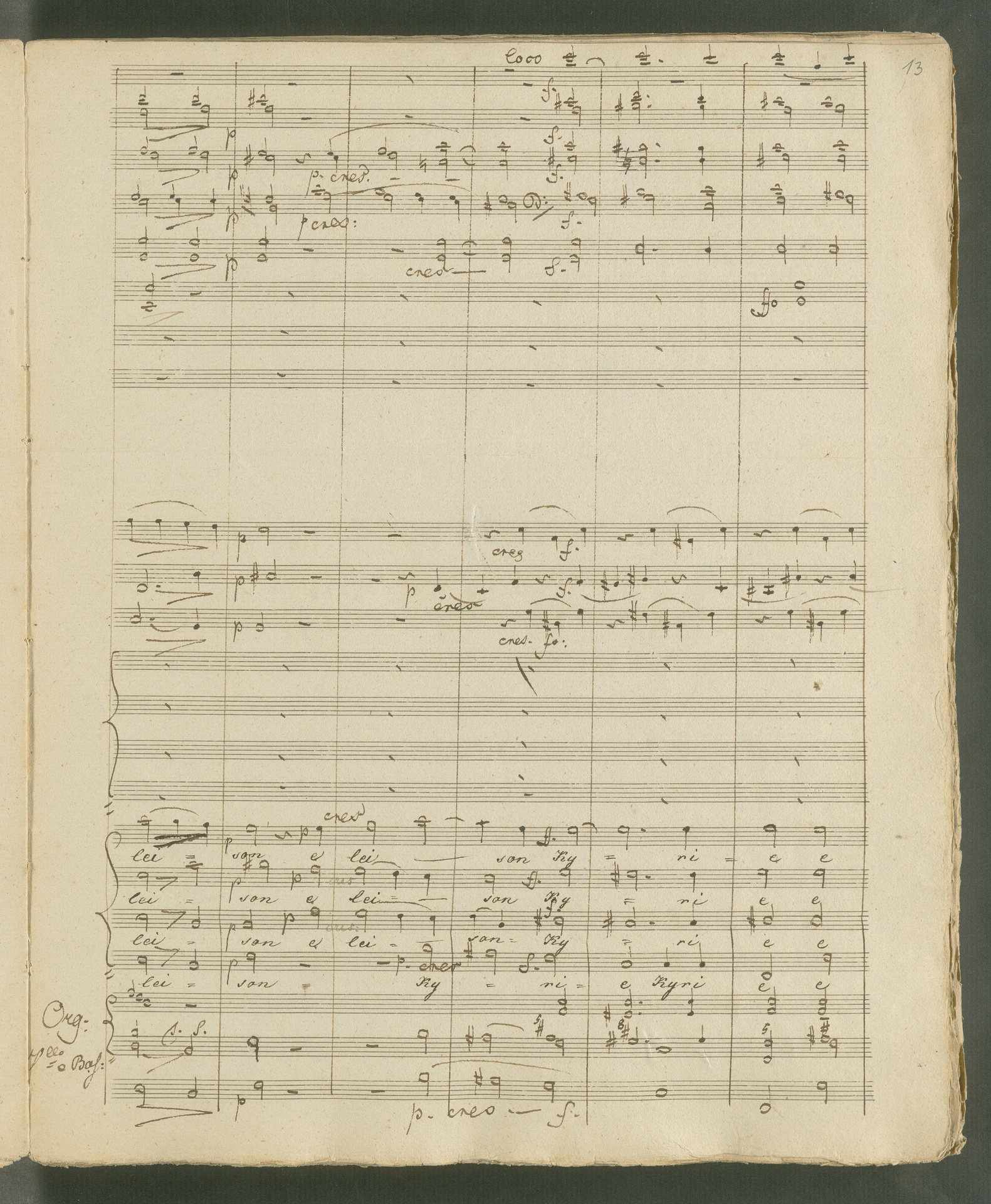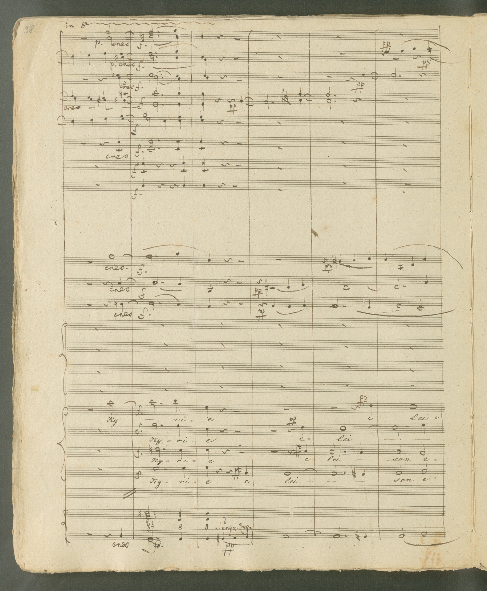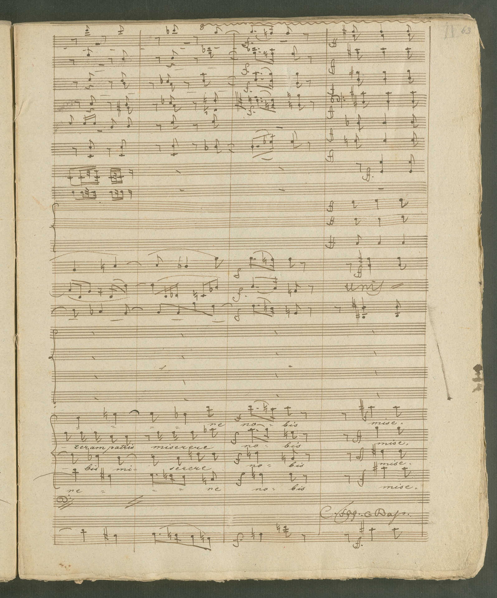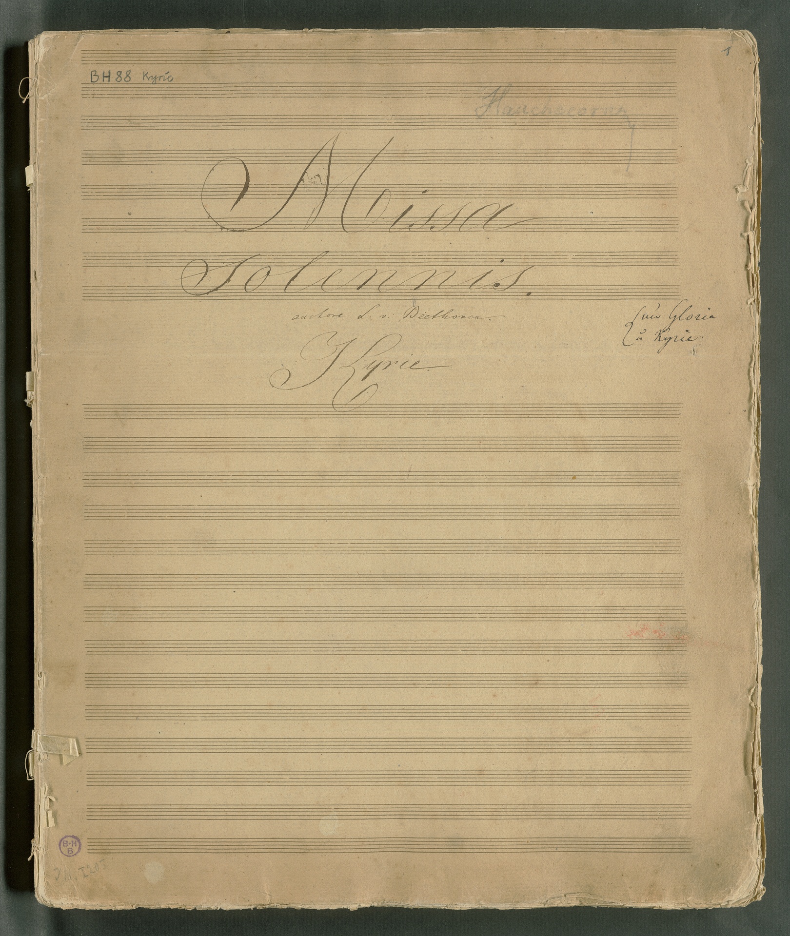 Diese überprüfte Abschrift der ersten beiden Sätze Kyrie und Gloria aus der Missa Solemnis entstand in der zweiten Jahreshälfte 1823. Beethoven schickte die Teilabschrift am 9. April 1825 zu seinem ehemaligen Schüler Ferdinand Ries nach Bonn. Die Messe sollte beim Niederrheinischen Musikfest des gleichen Jahres in Aachen aufgeführt werden, für das sich Ries sehr engagierte. "Kyrie u. gloria zwei der vorzüglichst. Stük sind ebenfalls schon (...) auf dem wege für sie" (BGA 1957. Beethoven an Ferdinand Ries in Bonn, Wien, 9. April 1825), schrieb Beethoven im zugehörigen Begleitbrief an Ries. Allerdings wurde die Messe schließlich doch nicht ins Programm genommen: Die Sendung traf zu spät bei Ries ein als dass sie noch hätte vernünftig geprobt werden können. (J.R.)