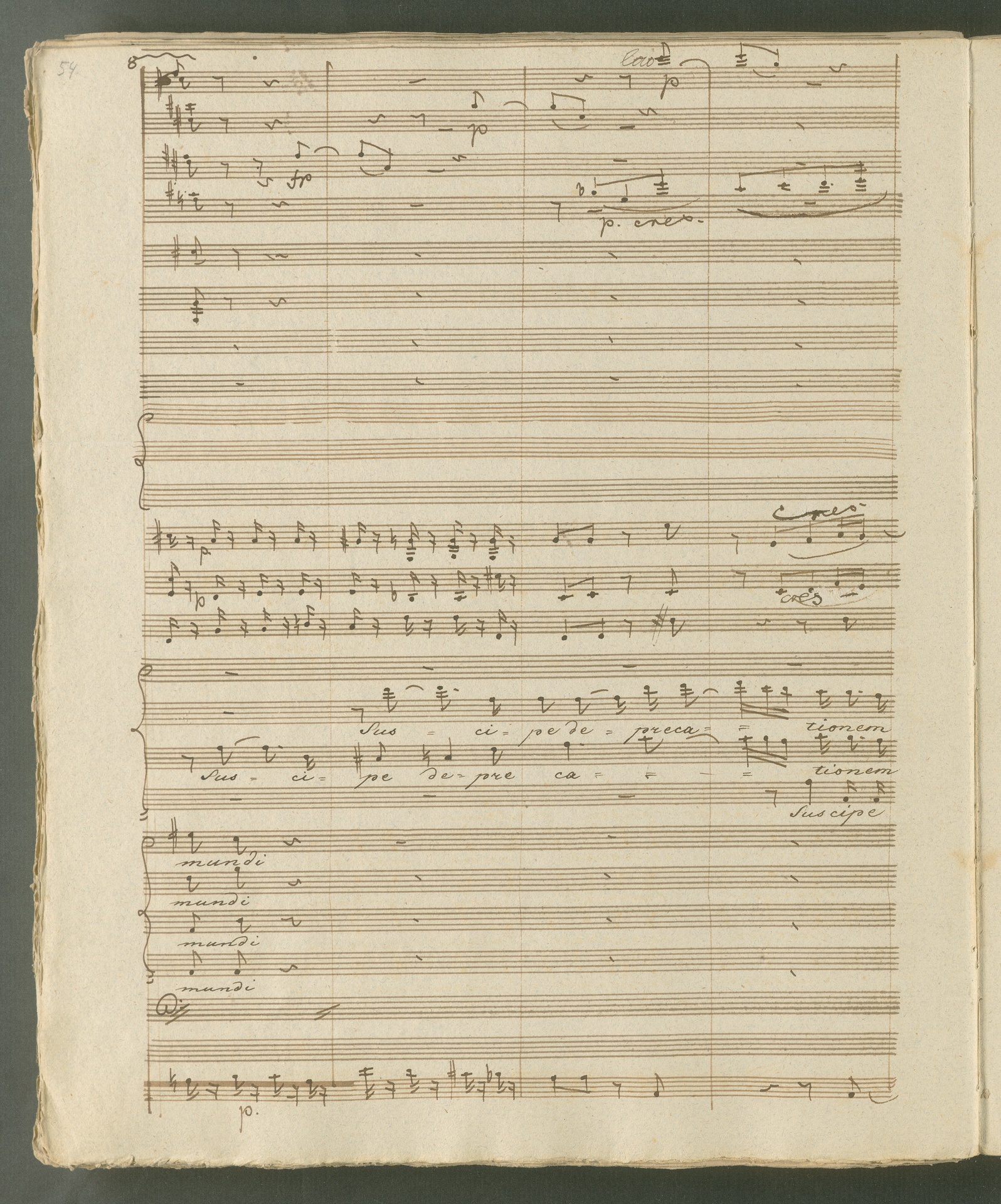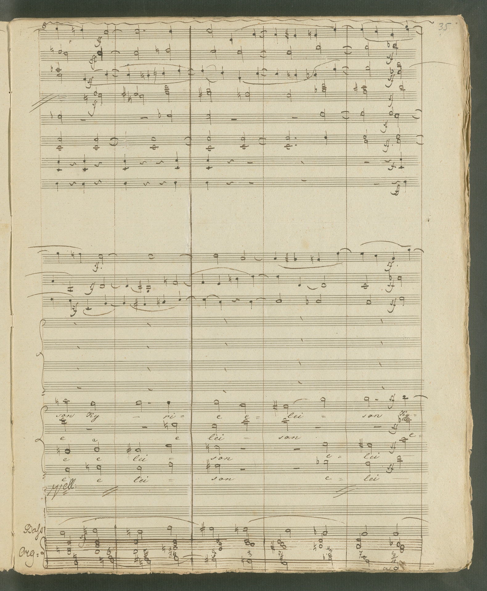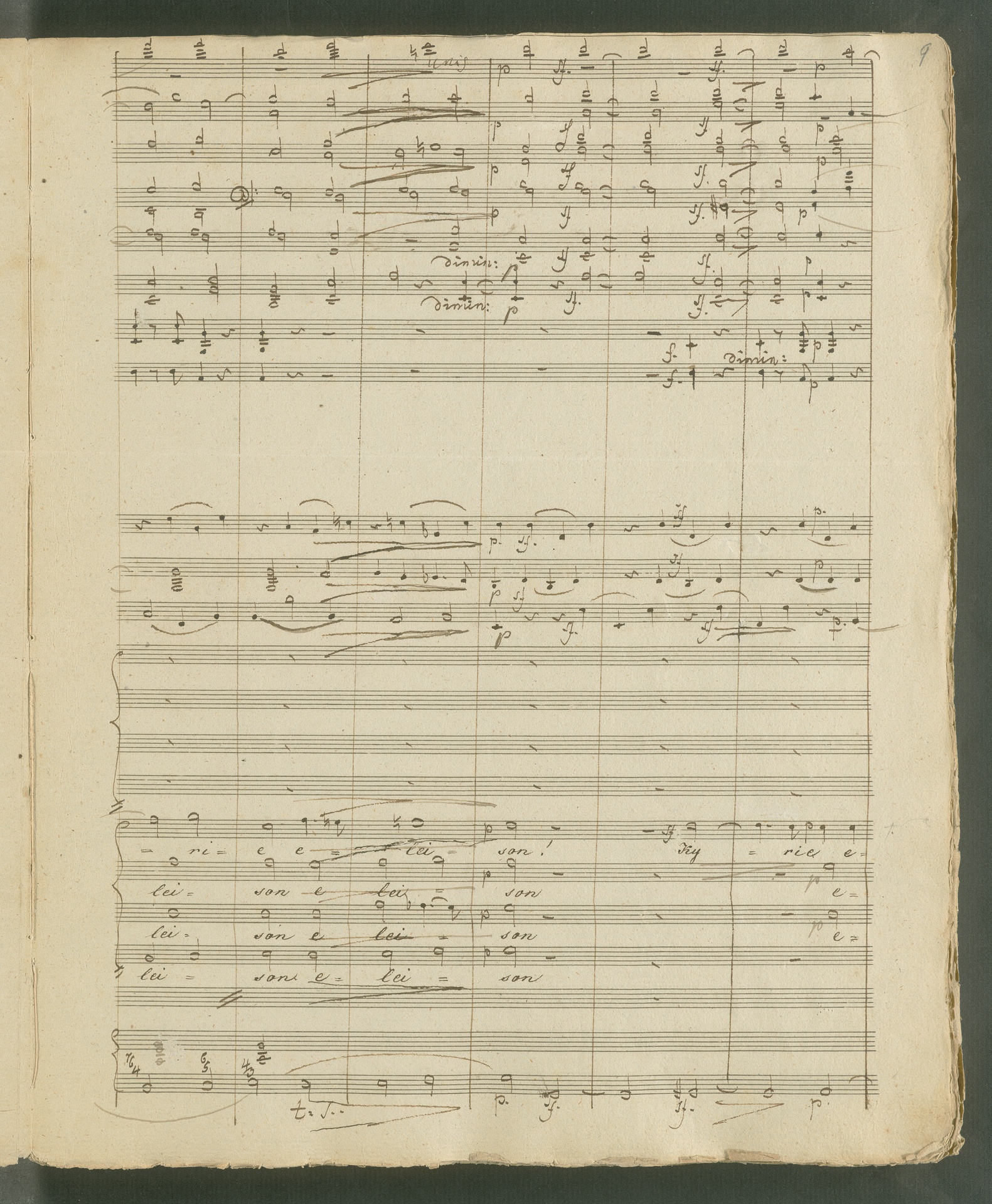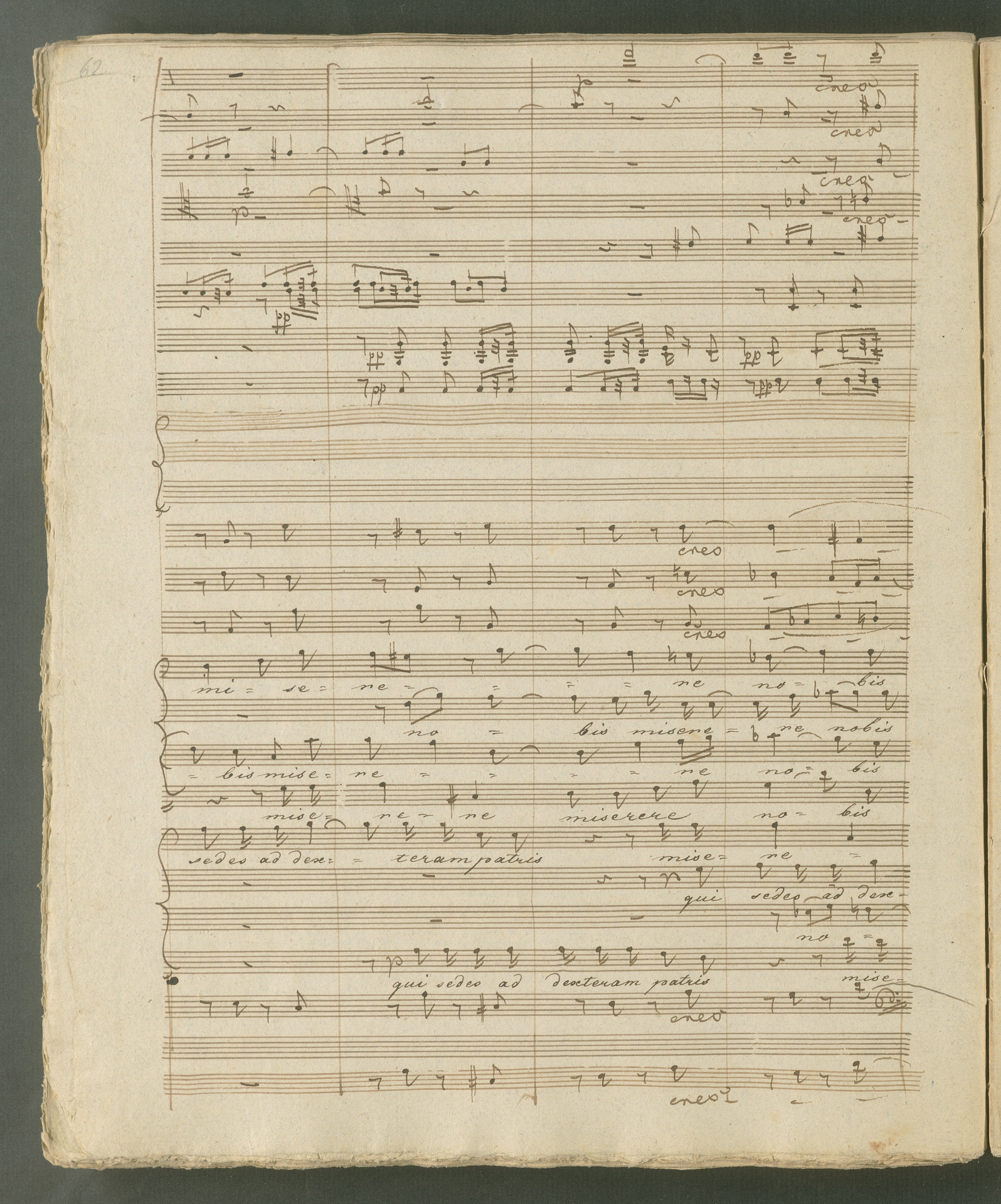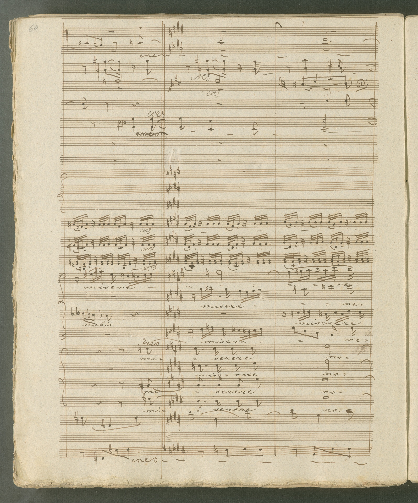 Diese überprüfte Abschrift der ersten beiden Sätze Kyrie und Gloria aus der Missa Solemnis entstand in der zweiten Jahreshälfte 1823. Beethoven schickte die Teilabschrift am 9. April 1825 zu seinem ehemaligen Schüler Ferdinand Ries nach Bonn. Die Messe sollte beim Niederrheinischen Musikfest des gleichen Jahres in Aachen aufgeführt werden, für das sich Ries sehr engagierte. "Kyrie u. gloria zwei der vorzüglichst. Stük sind ebenfalls schon (...) auf dem wege für sie" (BGA 1957. Beethoven an Ferdinand Ries in Bonn, Wien, 9. April 1825), schrieb Beethoven im zugehörigen Begleitbrief an Ries. Allerdings wurde die Messe schließlich doch nicht ins Programm genommen: Die Sendung traf zu spät bei Ries ein als dass sie noch hätte vernünftig geprobt werden können. (J.R.)