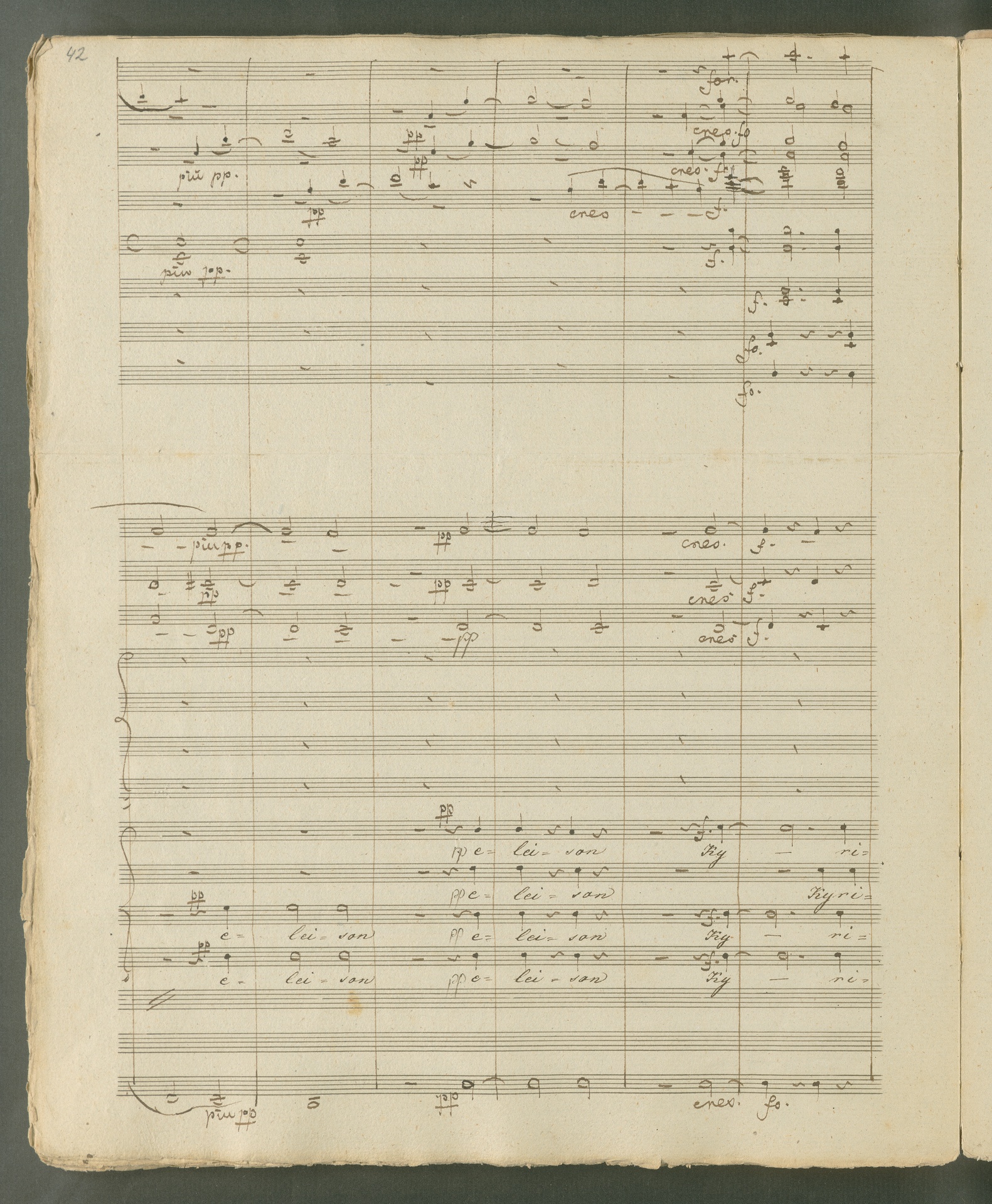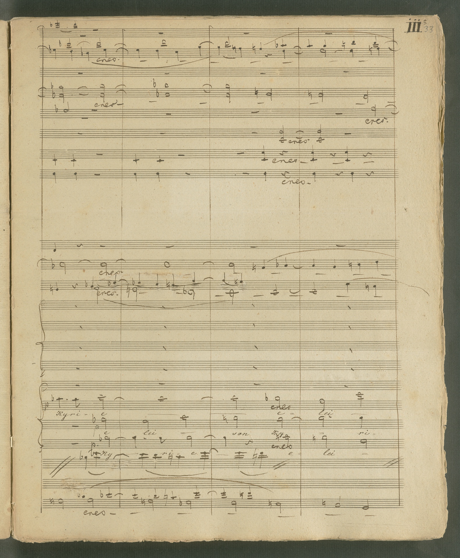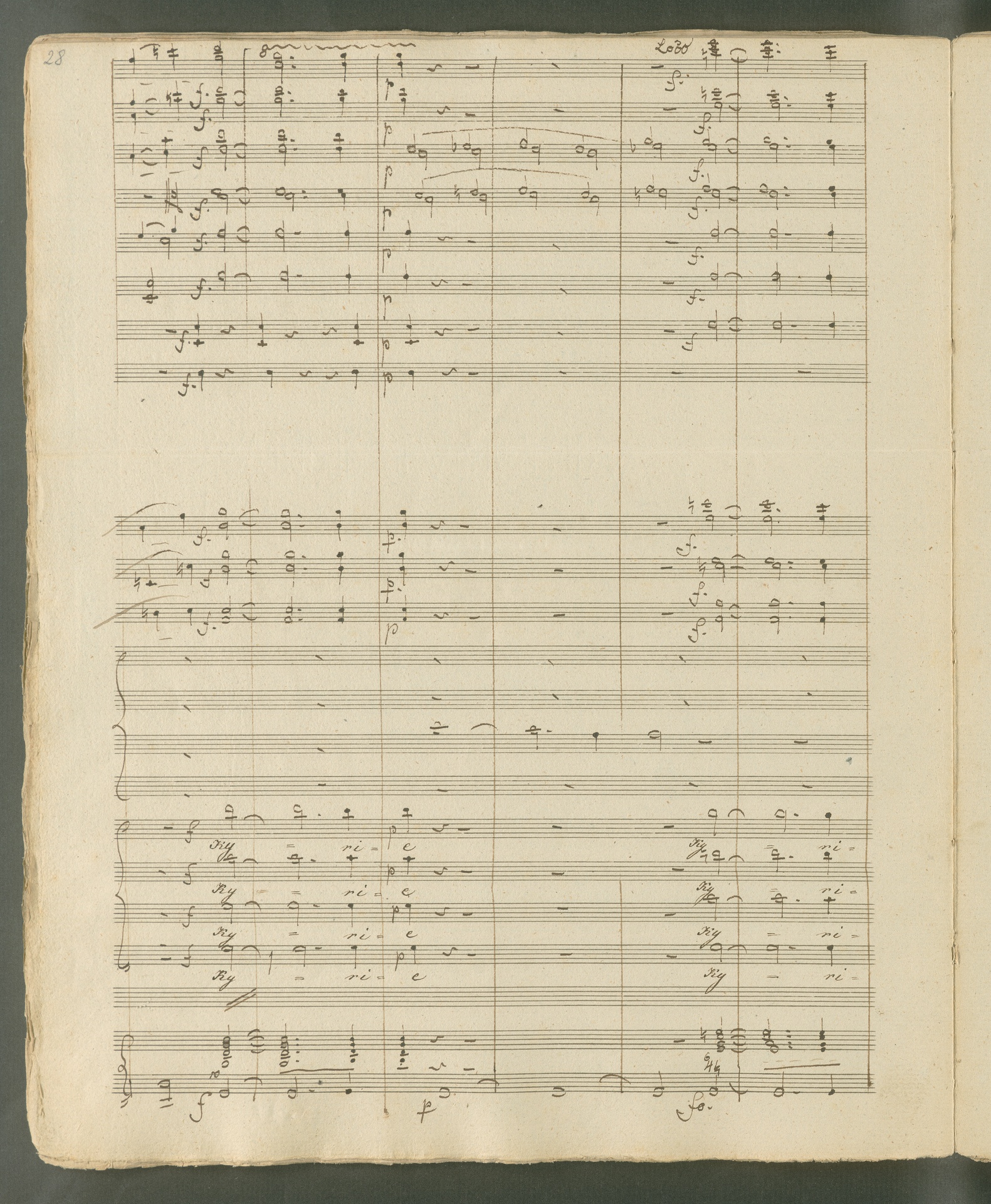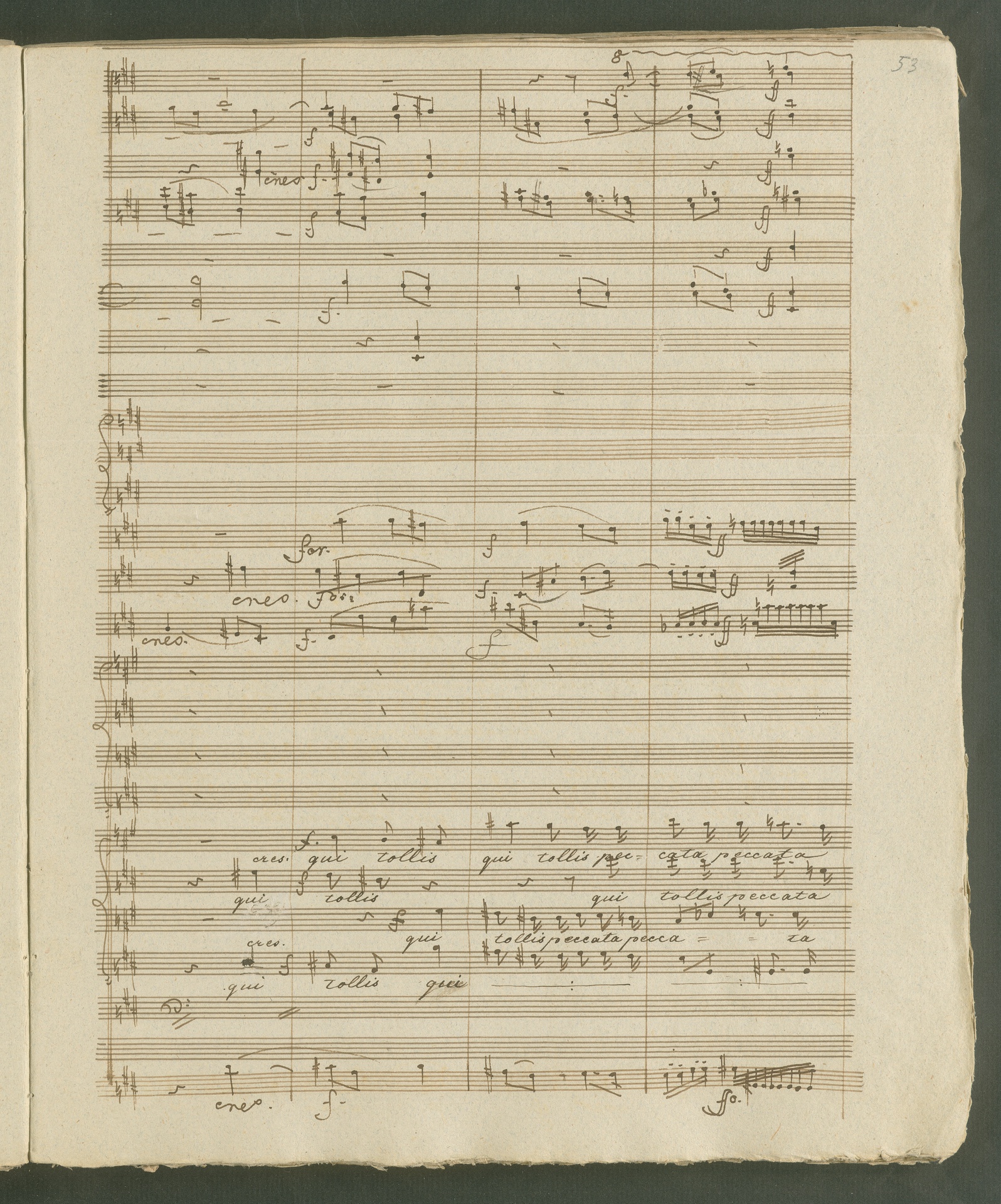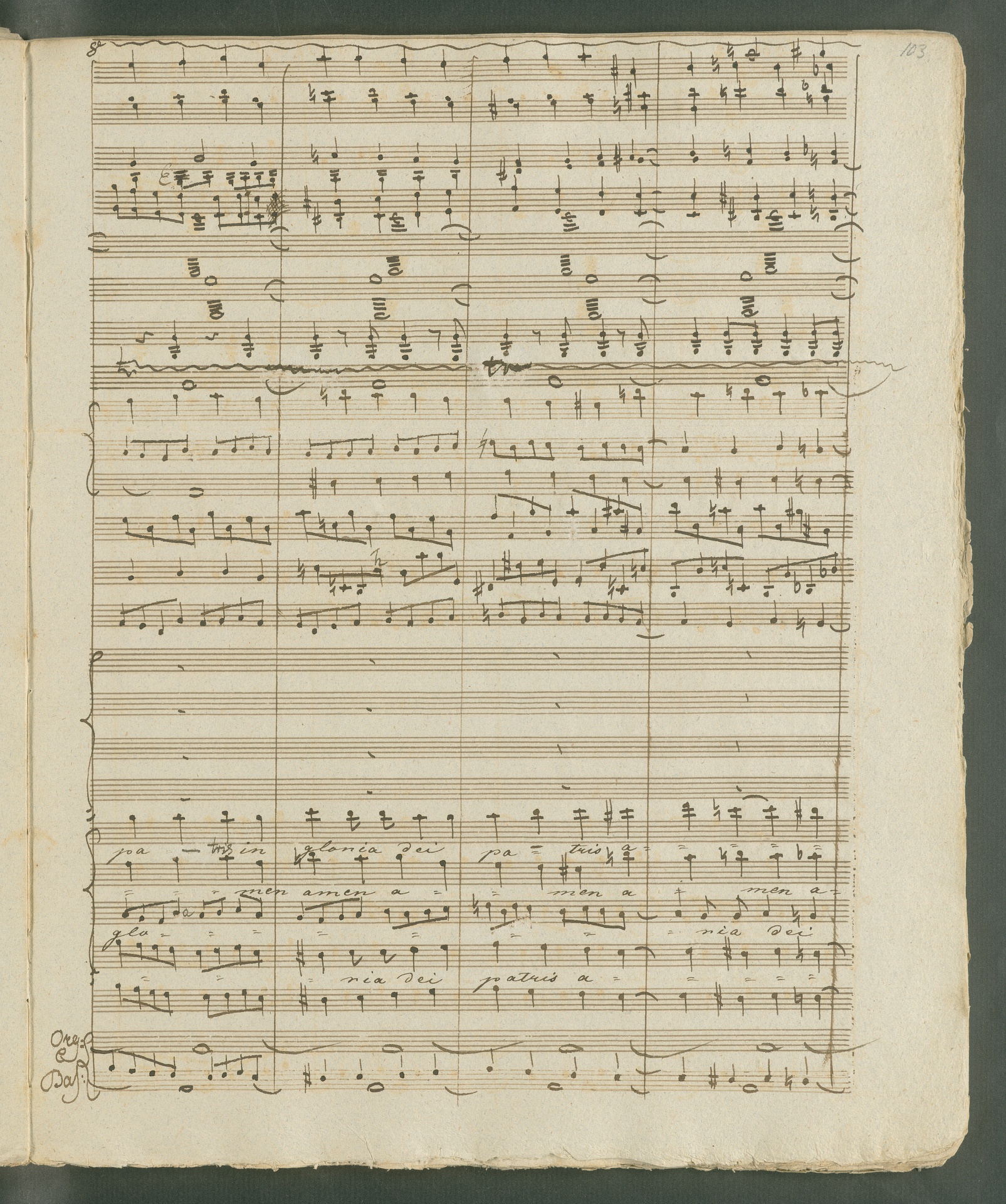 Diese überprüfte Abschrift der ersten beiden Sätze Kyrie und Gloria aus der Missa Solemnis entstand in der zweiten Jahreshälfte 1823. Beethoven schickte die Teilabschrift am 9. April 1825 zu seinem ehemaligen Schüler Ferdinand Ries nach Bonn. Die Messe sollte beim Niederrheinischen Musikfest des gleichen Jahres in Aachen aufgeführt werden, für das sich Ries sehr engagierte. "Kyrie u. gloria zwei der vorzüglichst. Stük sind ebenfalls schon (...) auf dem wege für sie" (BGA 1957. Beethoven an Ferdinand Ries in Bonn, Wien, 9. April 1825), schrieb Beethoven im zugehörigen Begleitbrief an Ries. Allerdings wurde die Messe schließlich doch nicht ins Programm genommen: Die Sendung traf zu spät bei Ries ein als dass sie noch hätte vernünftig geprobt werden können. (J.R.)