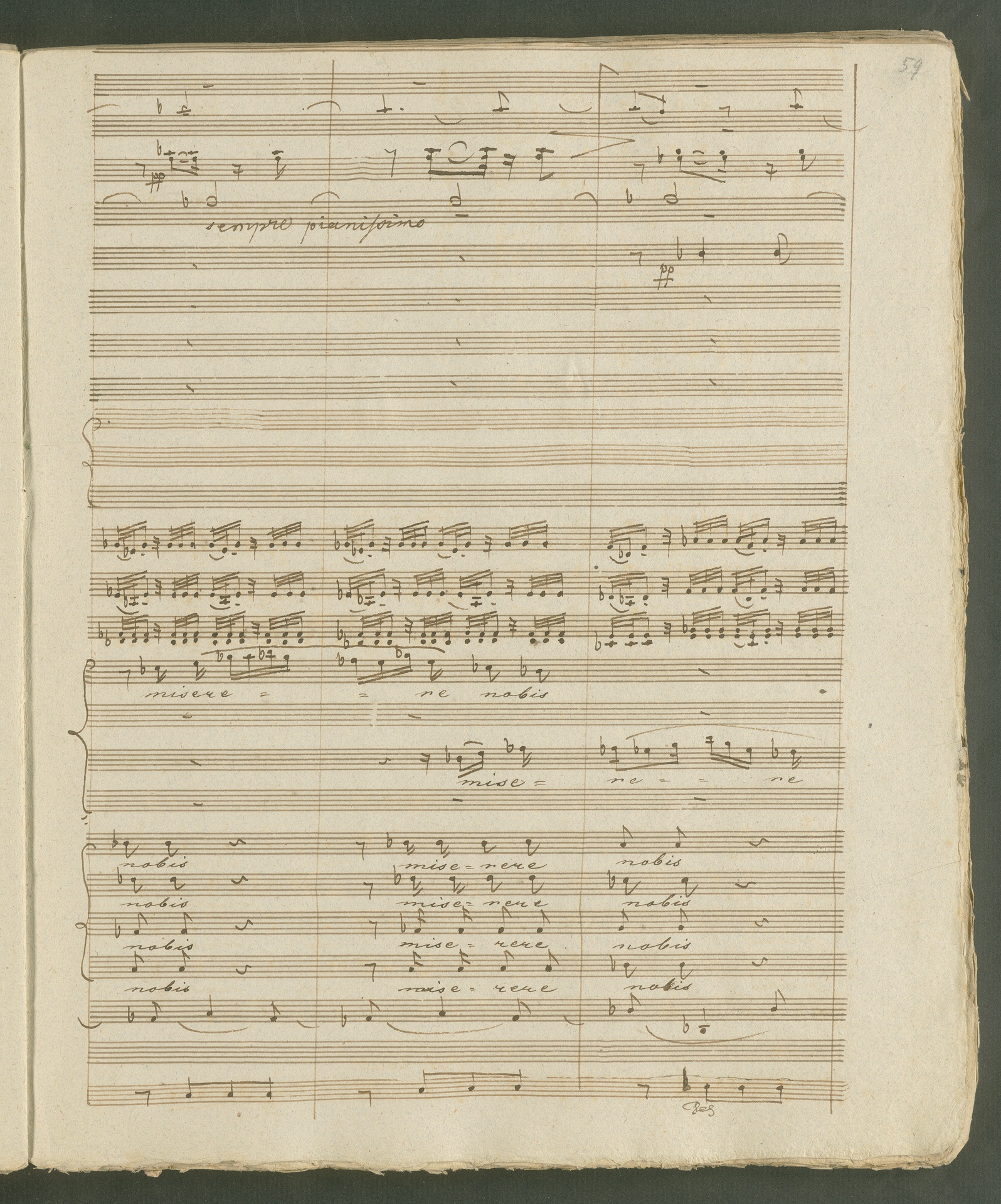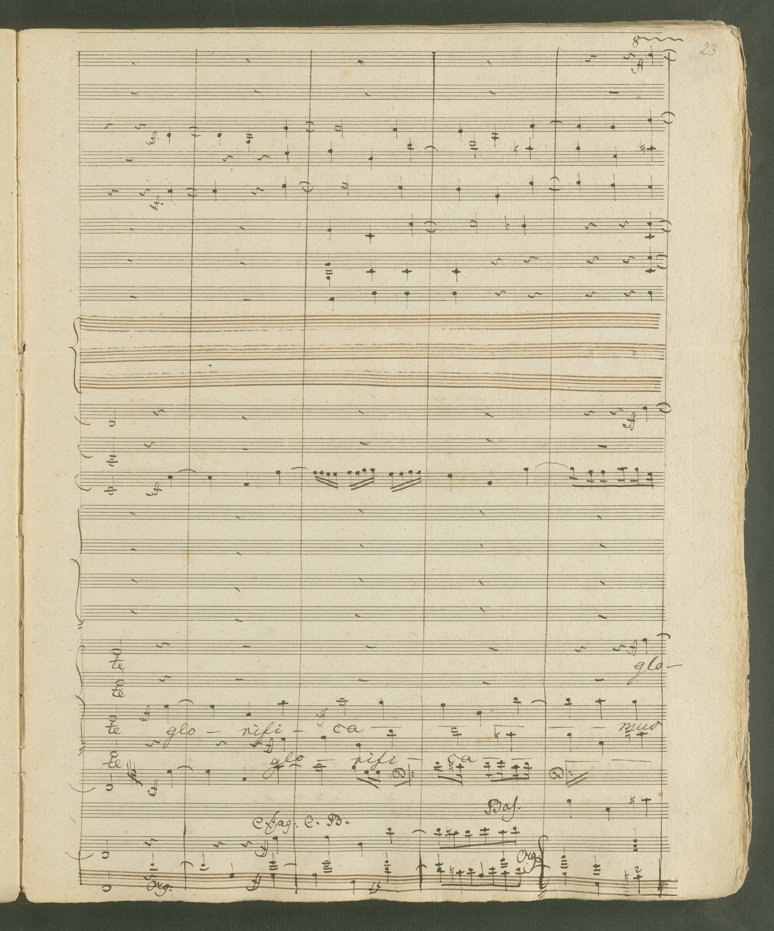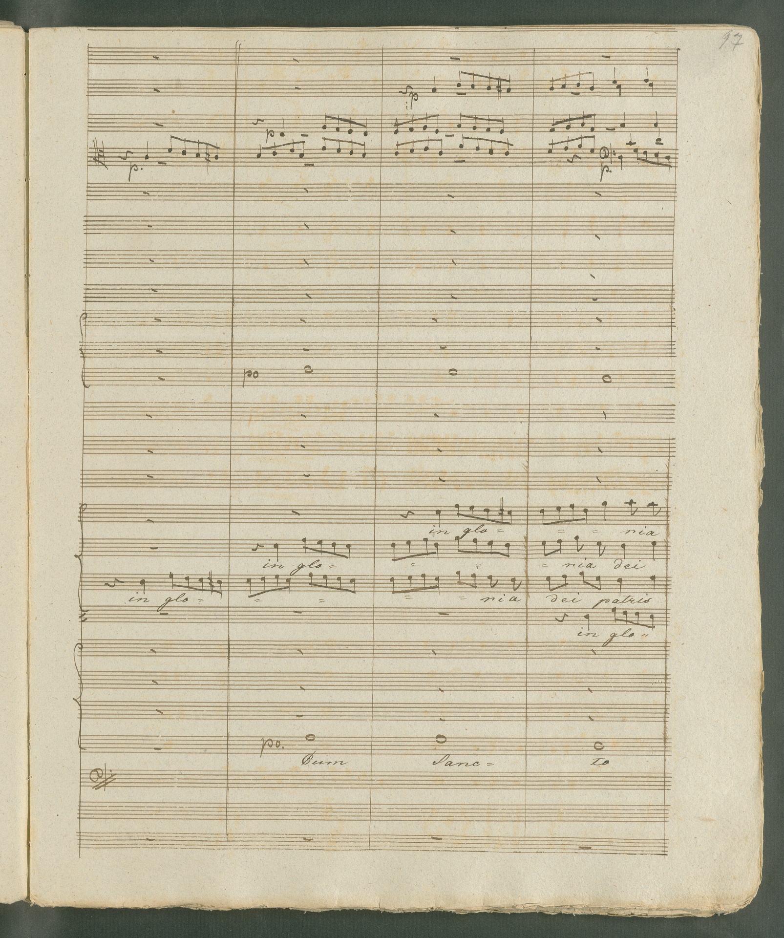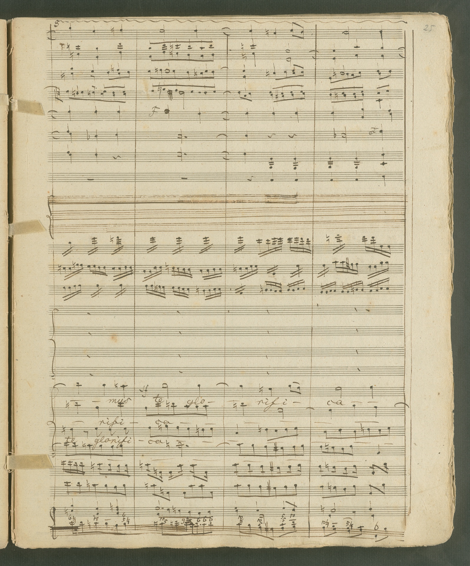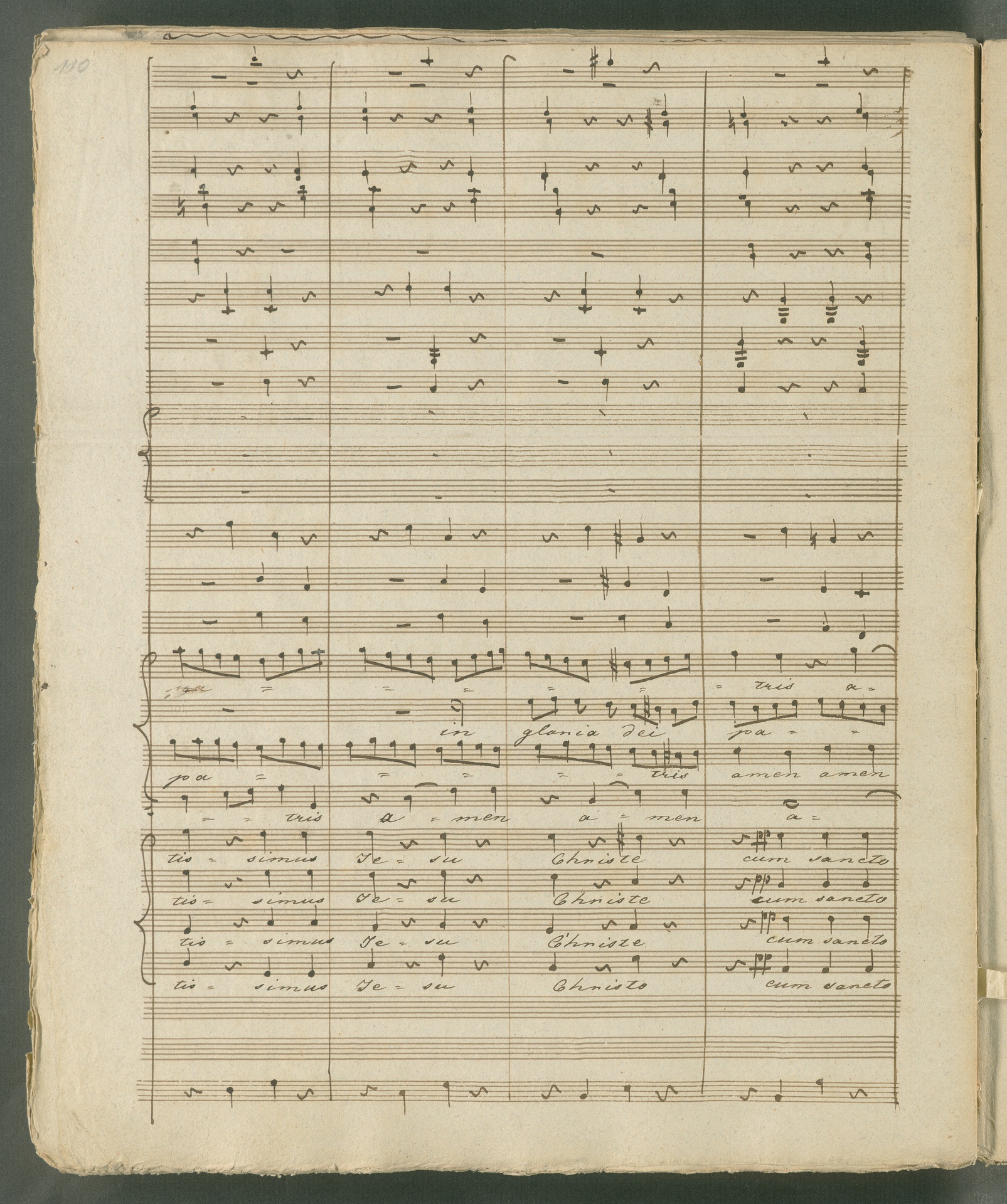 Diese überprüfte Abschrift der ersten beiden Sätze Kyrie und Gloria aus der Missa Solemnis entstand in der zweiten Jahreshälfte 1823. Beethoven schickte die Teilabschrift am 9. April 1825 zu seinem ehemaligen Schüler Ferdinand Ries nach Bonn. Die Messe sollte beim Niederrheinischen Musikfest des gleichen Jahres in Aachen aufgeführt werden, für das sich Ries sehr engagierte. "Kyrie u. gloria zwei der vorzüglichst. Stük sind ebenfalls schon (...) auf dem wege für sie" (BGA 1957. Beethoven an Ferdinand Ries in Bonn, Wien, 9. April 1825), schrieb Beethoven im zugehörigen Begleitbrief an Ries. Allerdings wurde die Messe schließlich doch nicht ins Programm genommen: Die Sendung traf zu spät bei Ries ein als dass sie noch hätte vernünftig geprobt werden können. (J.R.)