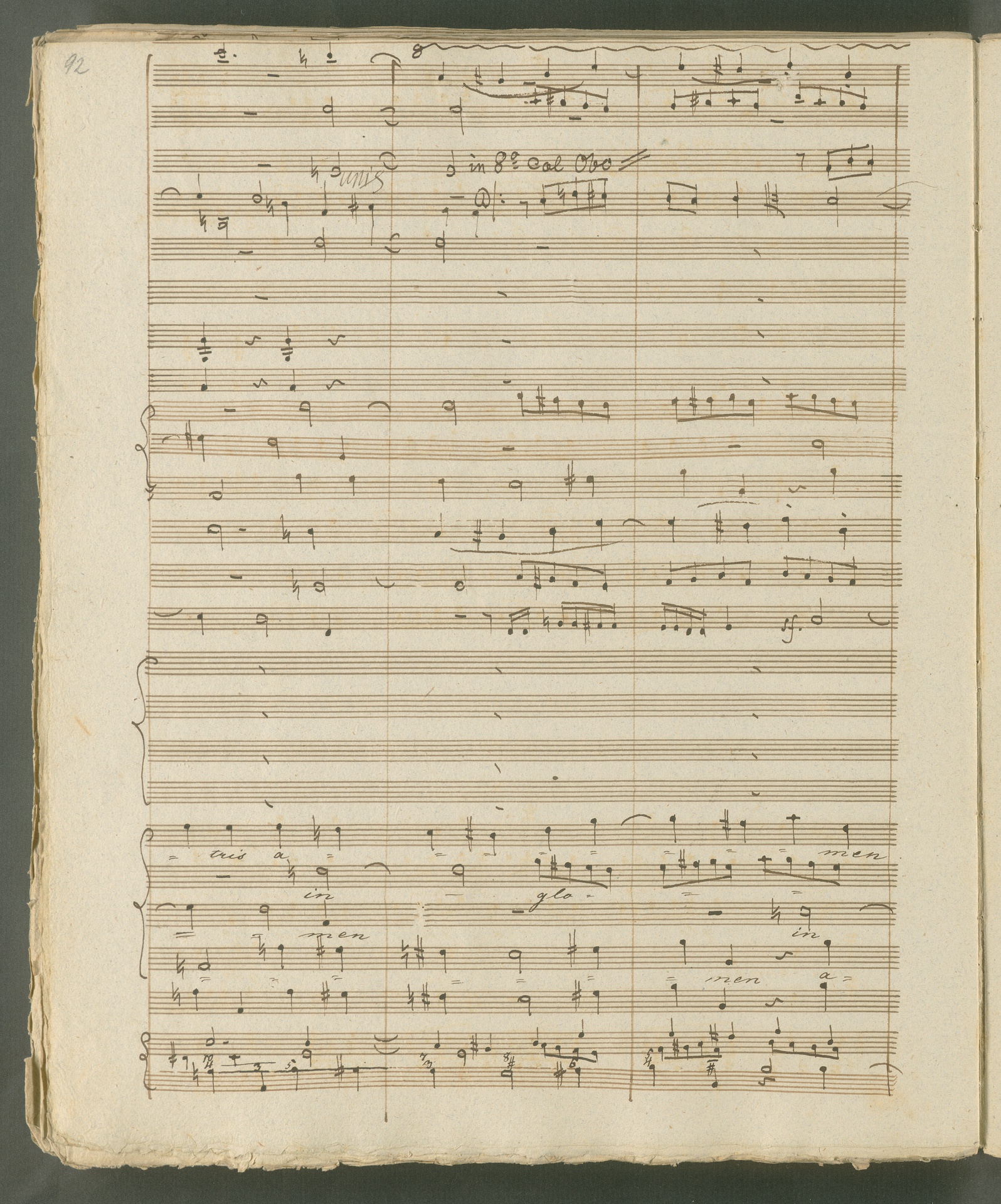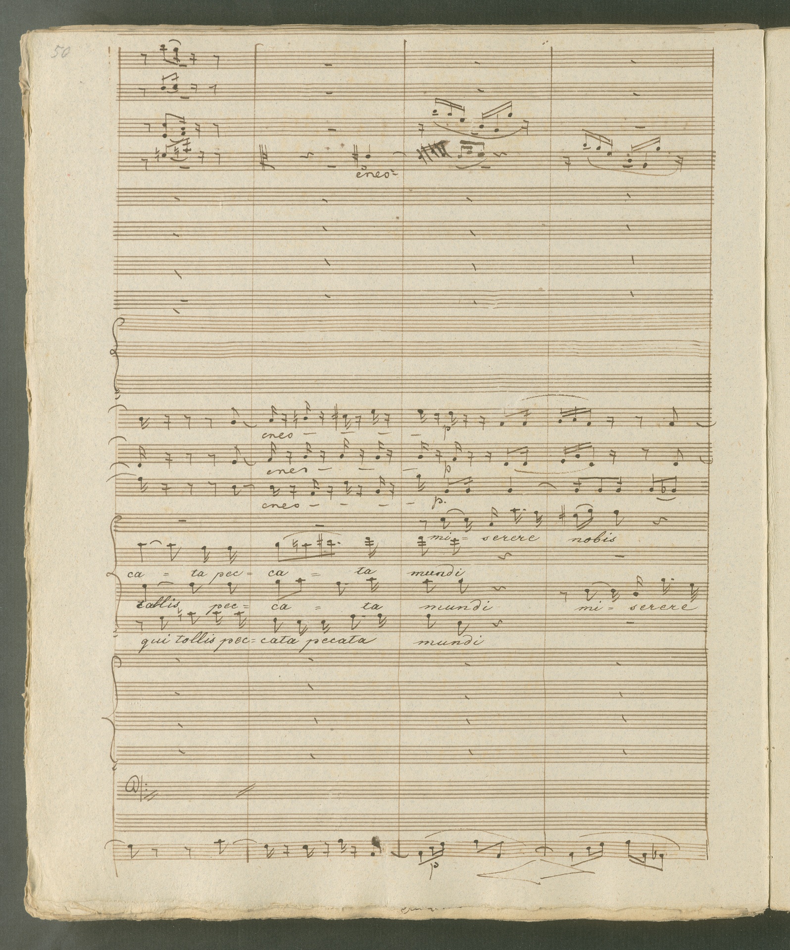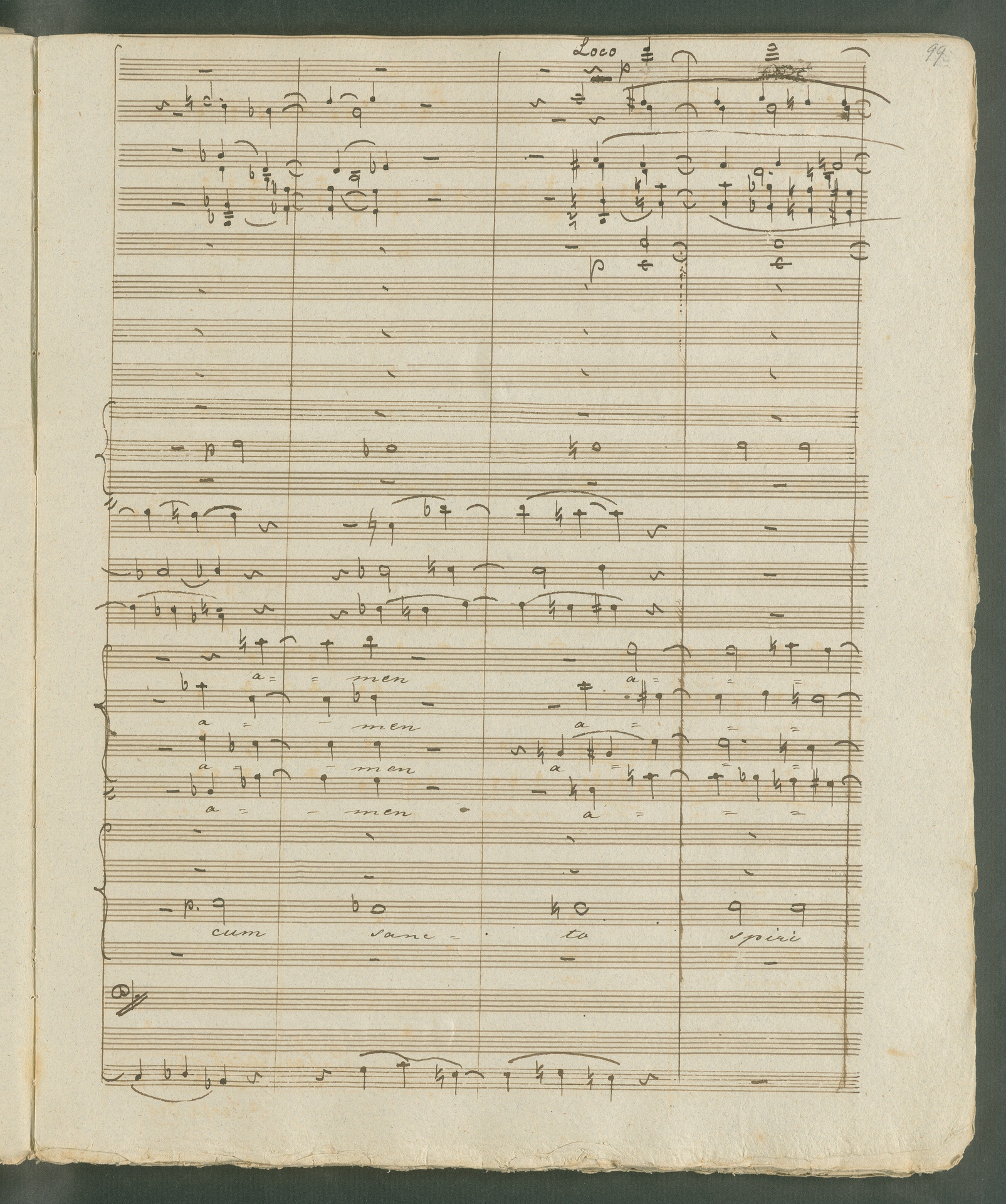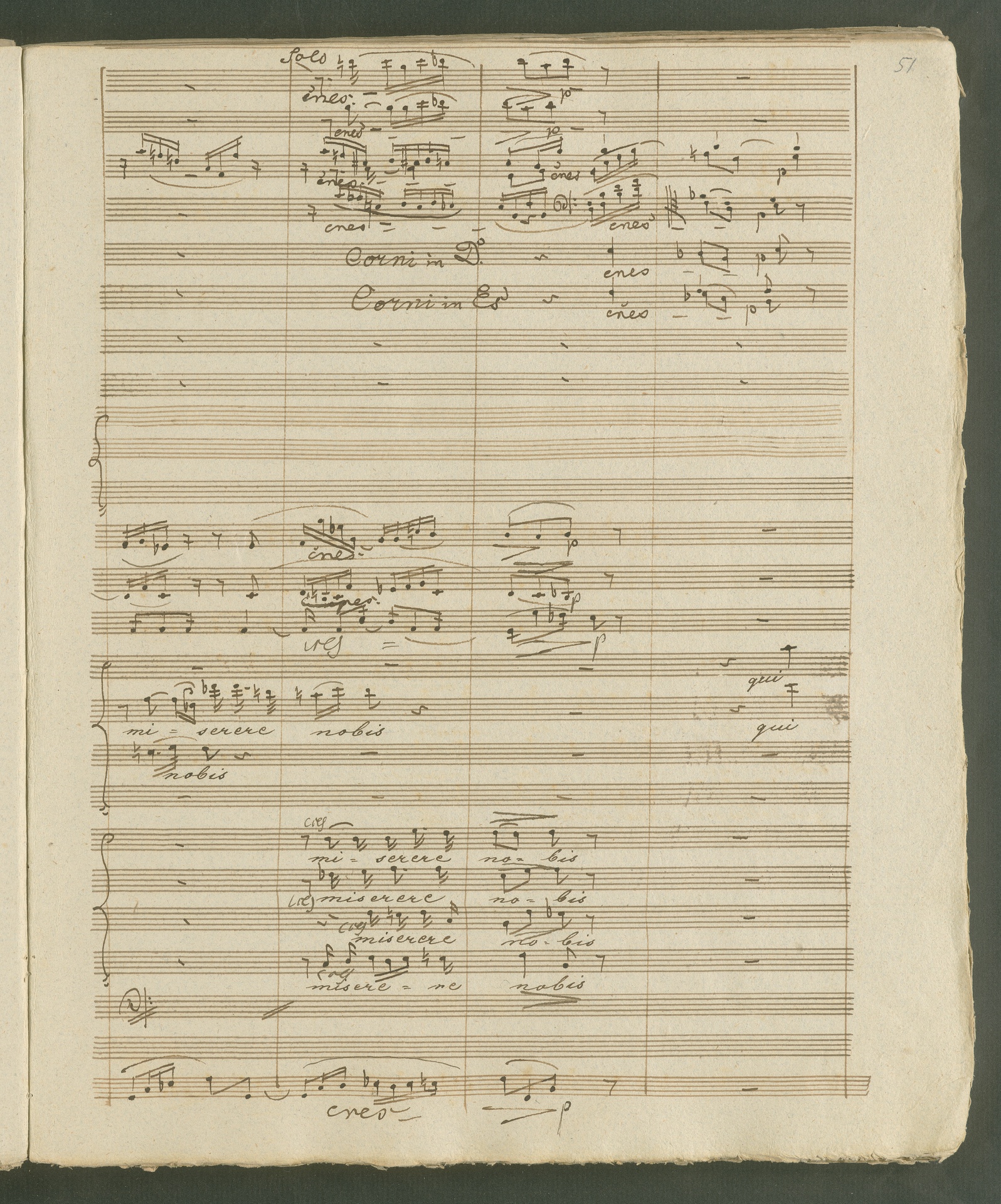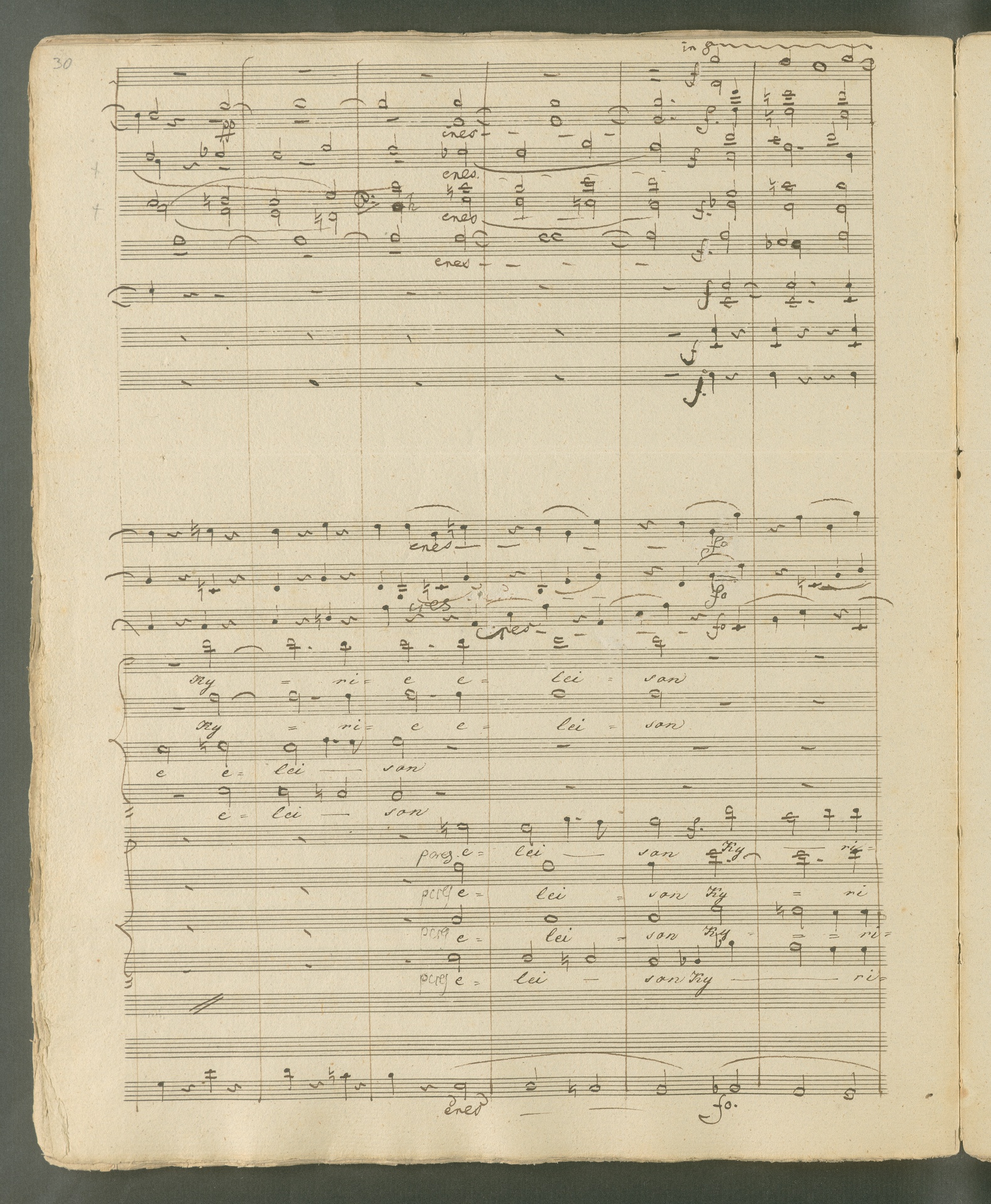 Diese überprüfte Abschrift der ersten beiden Sätze Kyrie und Gloria aus der Missa Solemnis entstand in der zweiten Jahreshälfte 1823. Beethoven schickte die Teilabschrift am 9. April 1825 zu seinem ehemaligen Schüler Ferdinand Ries nach Bonn. Die Messe sollte beim Niederrheinischen Musikfest des gleichen Jahres in Aachen aufgeführt werden, für das sich Ries sehr engagierte. "Kyrie u. gloria zwei der vorzüglichst. Stük sind ebenfalls schon (...) auf dem wege für sie" (BGA 1957. Beethoven an Ferdinand Ries in Bonn, Wien, 9. April 1825), schrieb Beethoven im zugehörigen Begleitbrief an Ries. Allerdings wurde die Messe schließlich doch nicht ins Programm genommen: Die Sendung traf zu spät bei Ries ein als dass sie noch hätte vernünftig geprobt werden können. (J.R.)