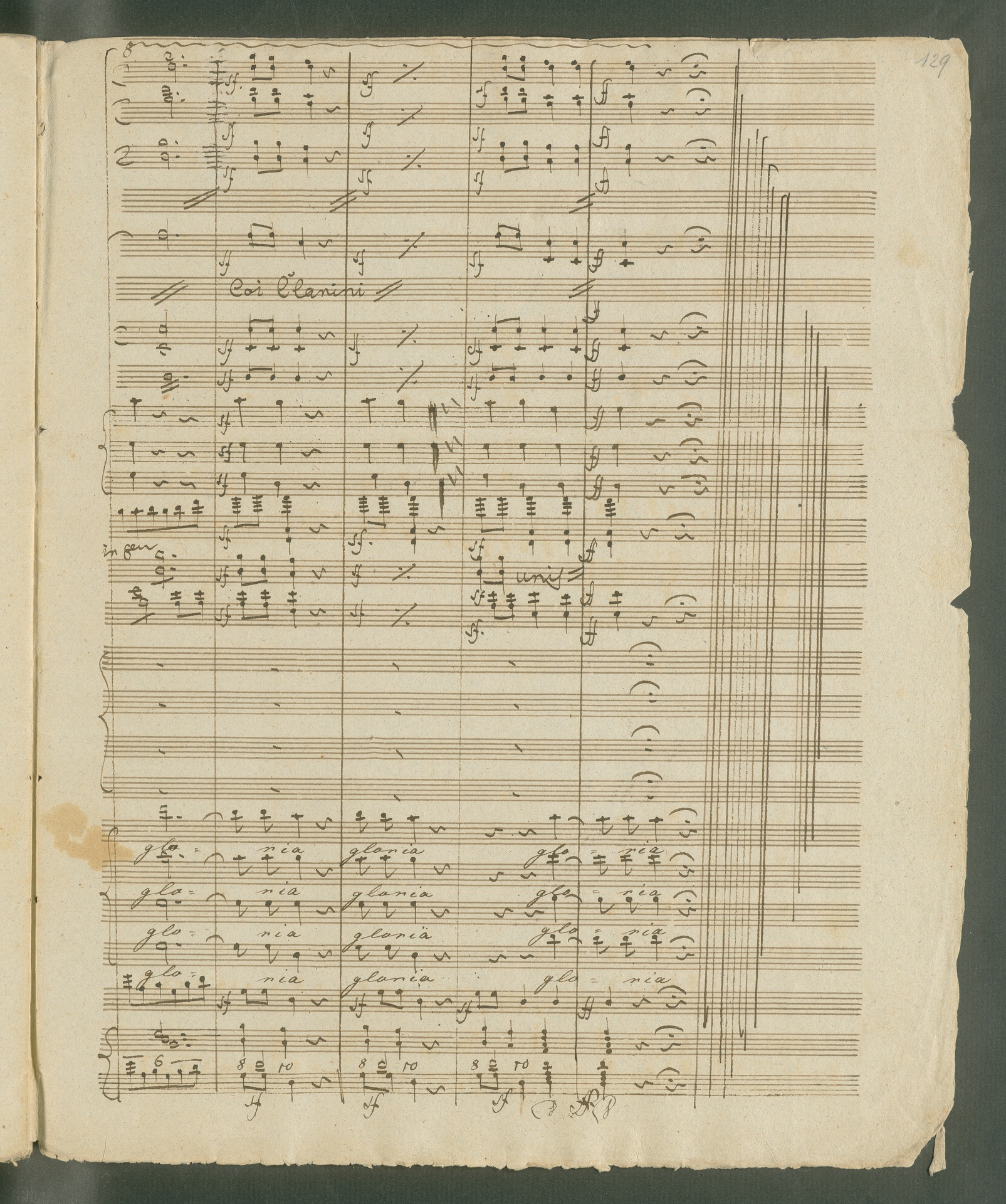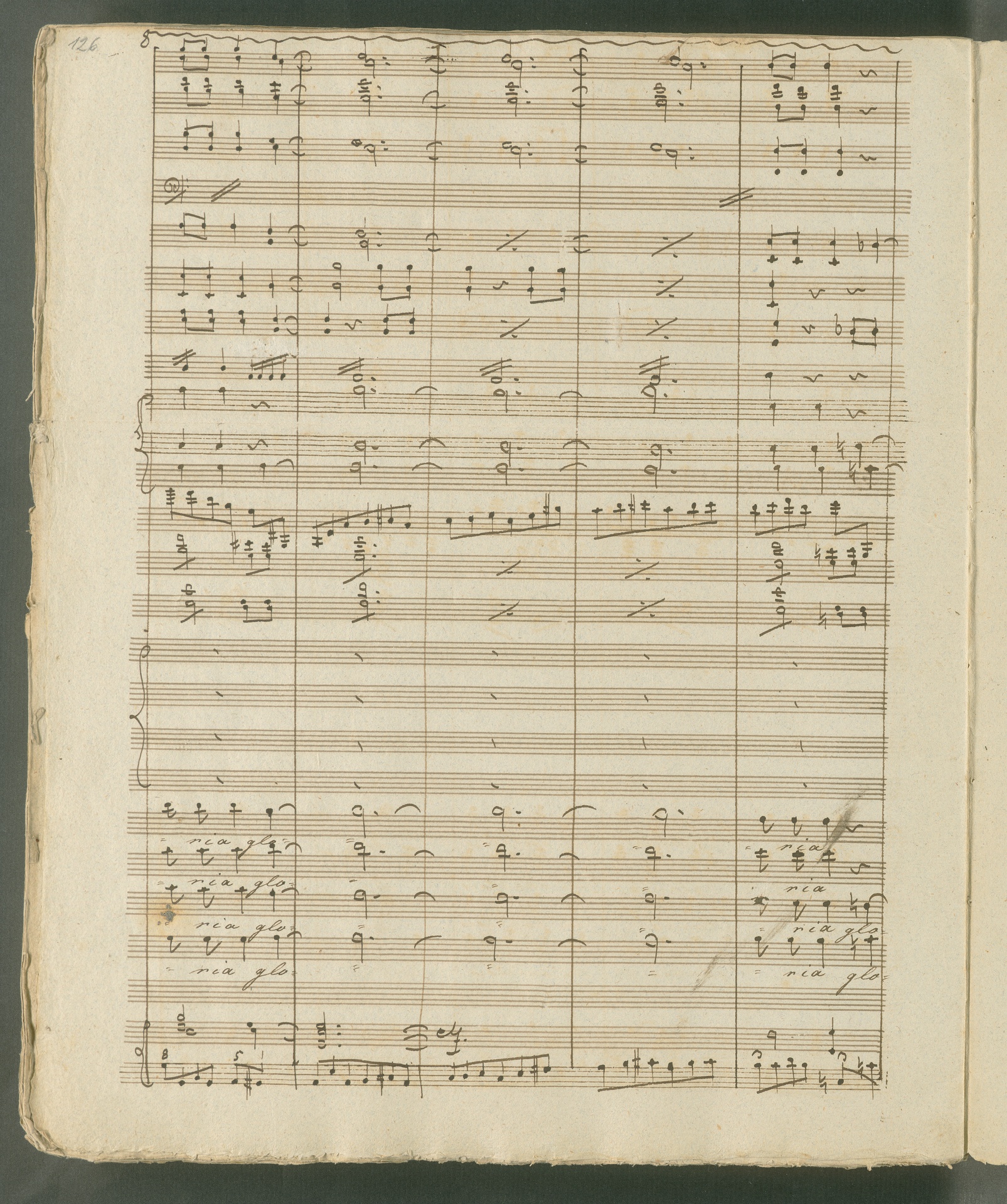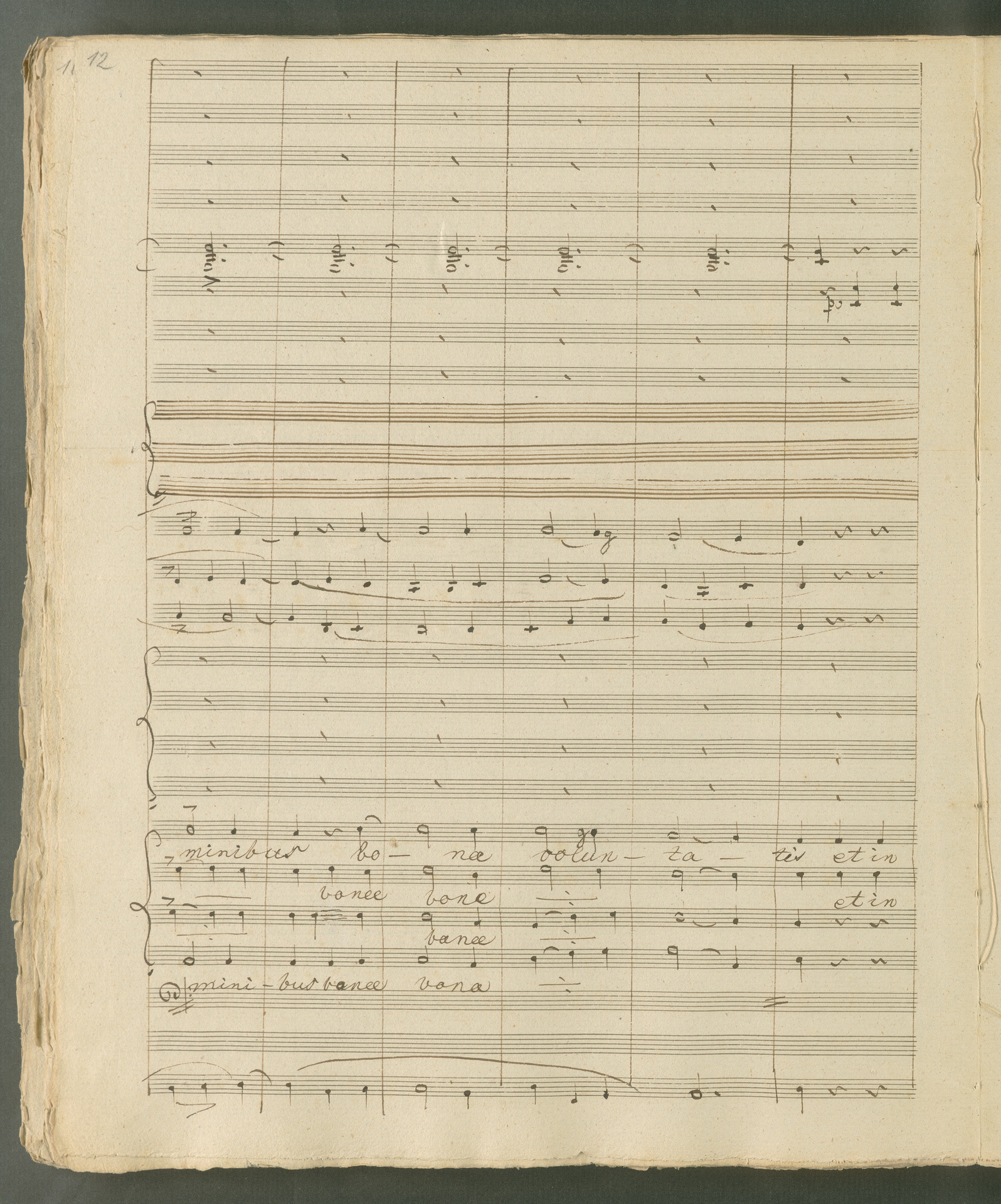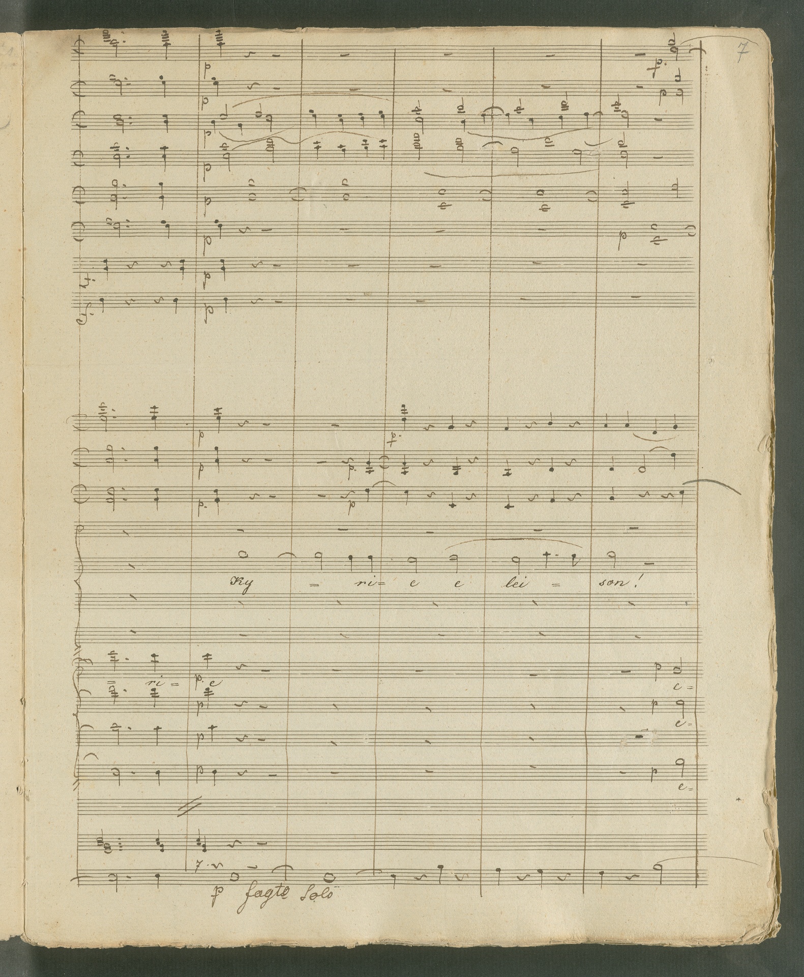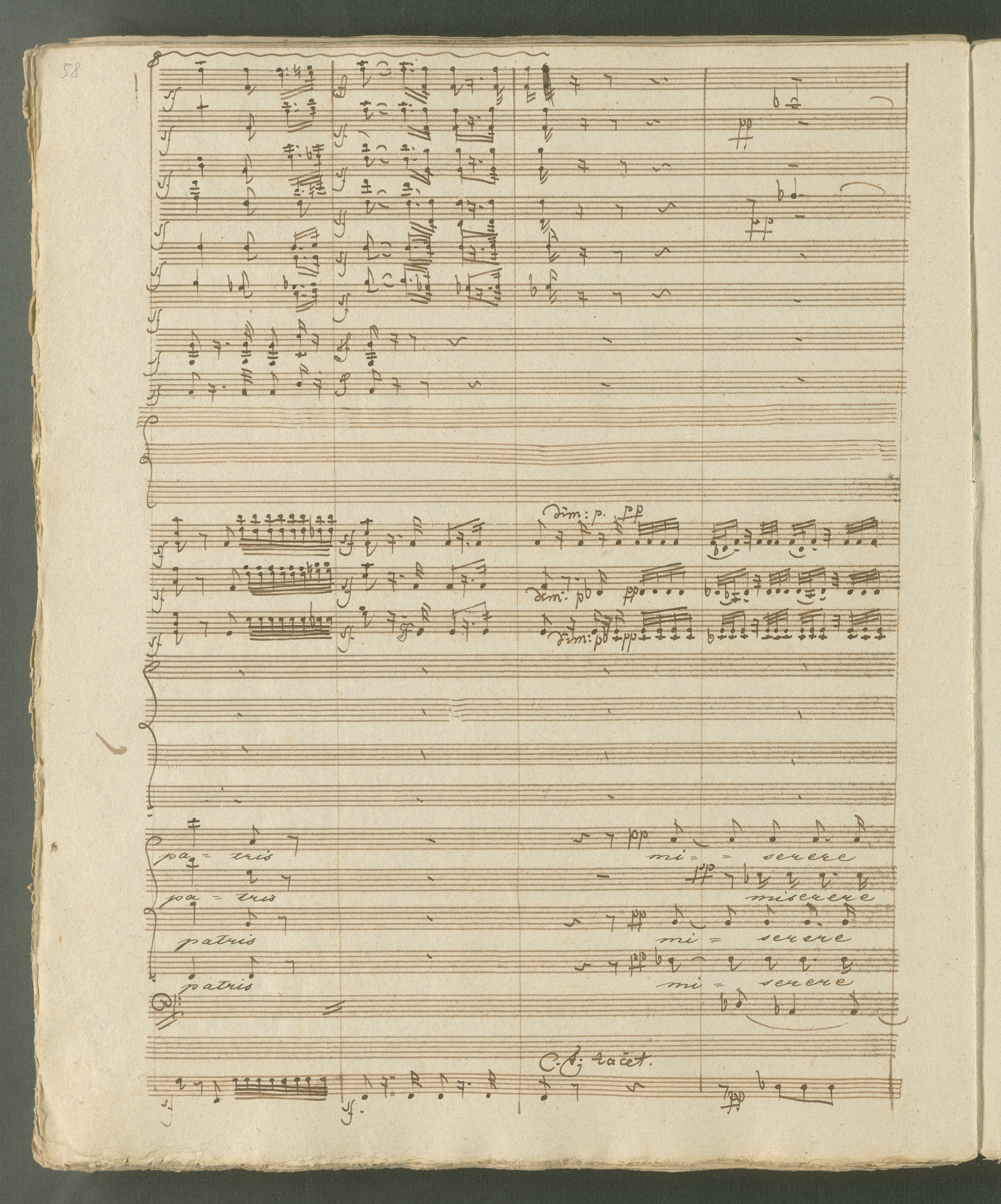 Diese überprüfte Abschrift der ersten beiden Sätze Kyrie und Gloria aus der Missa Solemnis entstand in der zweiten Jahreshälfte 1823. Beethoven schickte die Teilabschrift am 9. April 1825 zu seinem ehemaligen Schüler Ferdinand Ries nach Bonn. Die Messe sollte beim Niederrheinischen Musikfest des gleichen Jahres in Aachen aufgeführt werden, für das sich Ries sehr engagierte. "Kyrie u. gloria zwei der vorzüglichst. Stük sind ebenfalls schon (...) auf dem wege für sie" (BGA 1957. Beethoven an Ferdinand Ries in Bonn, Wien, 9. April 1825), schrieb Beethoven im zugehörigen Begleitbrief an Ries. Allerdings wurde die Messe schließlich doch nicht ins Programm genommen: Die Sendung traf zu spät bei Ries ein als dass sie noch hätte vernünftig geprobt werden können. (J.R.)