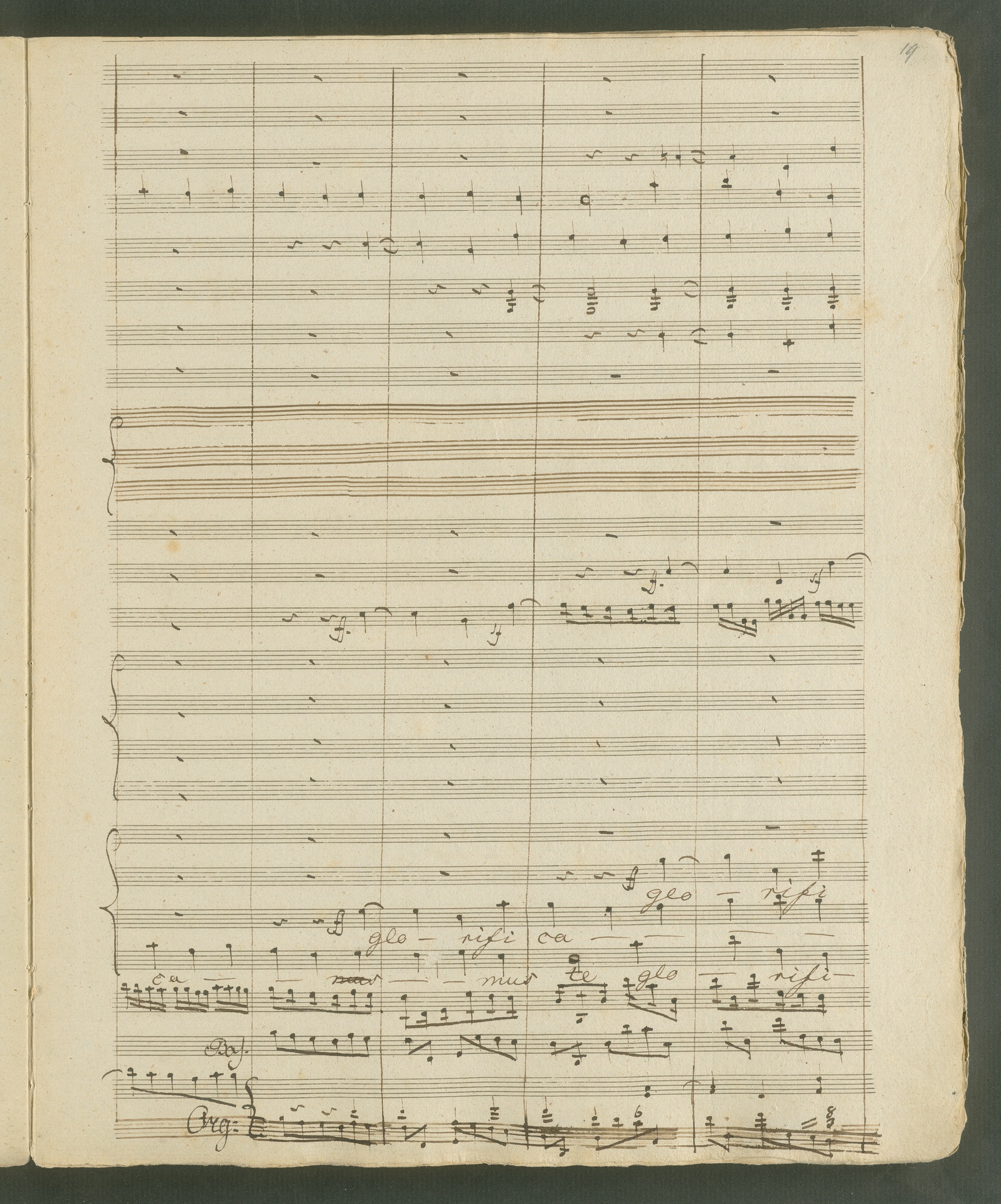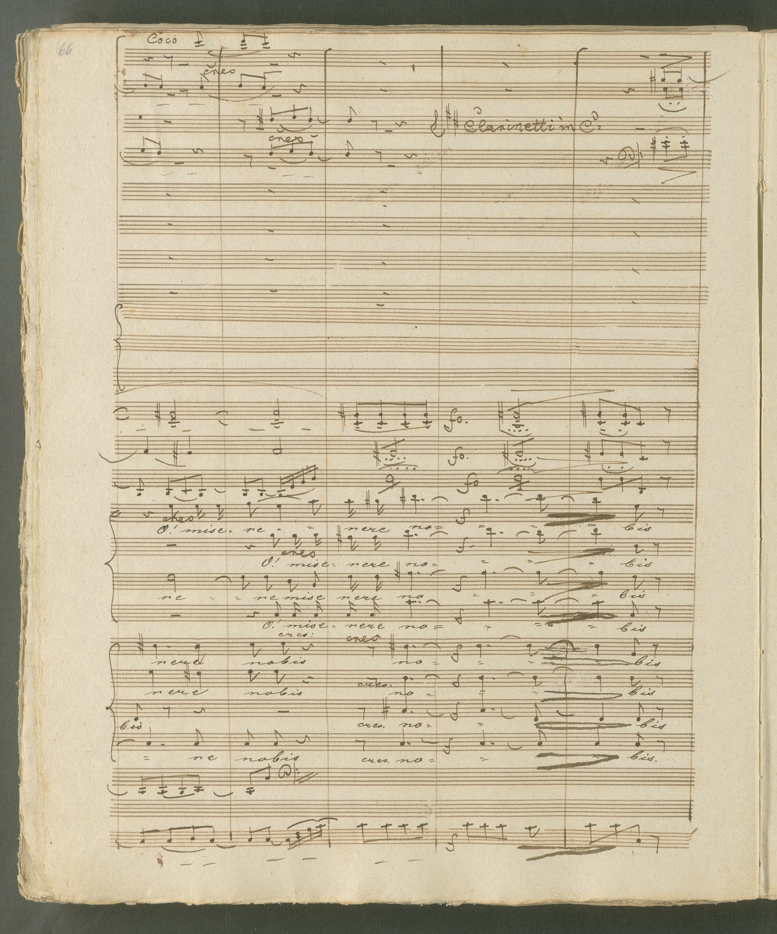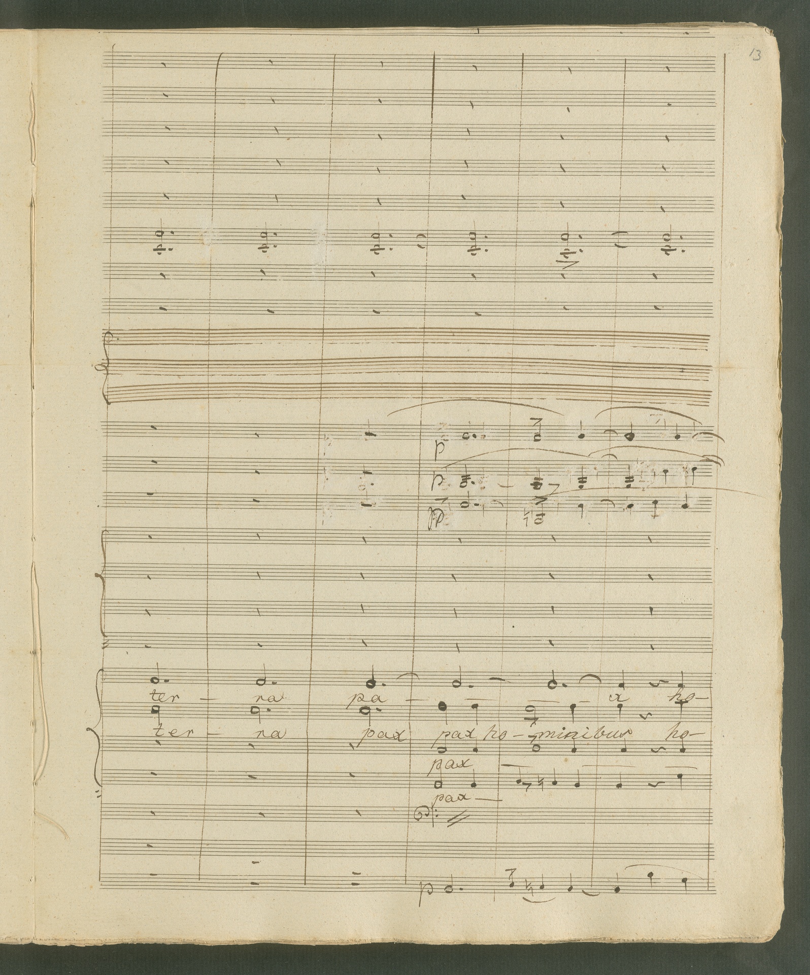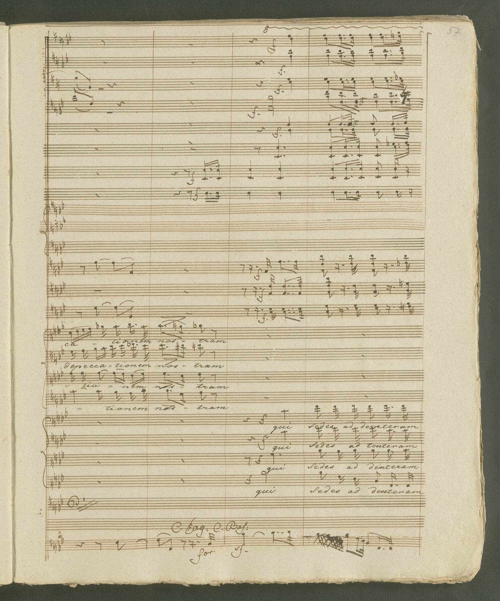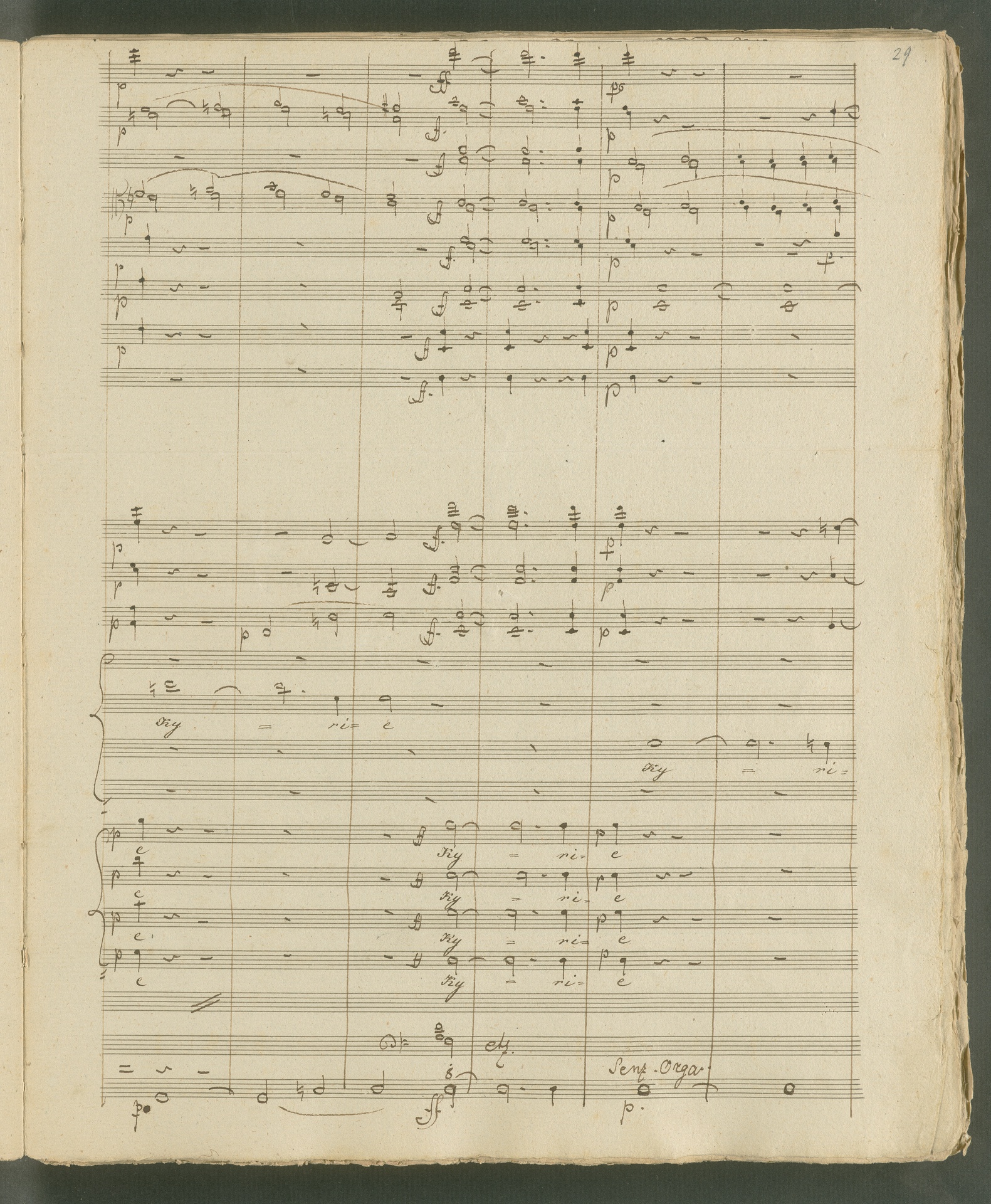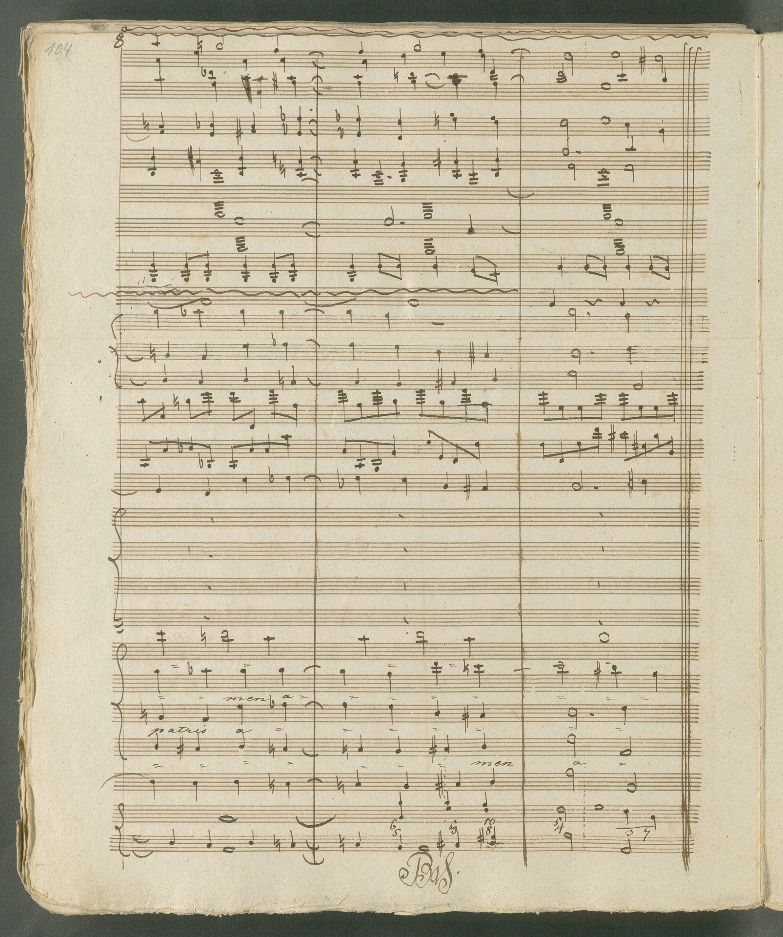 Diese überprüfte Abschrift der ersten beiden Sätze Kyrie und Gloria aus der Missa Solemnis entstand in der zweiten Jahreshälfte 1823. Beethoven schickte die Teilabschrift am 9. April 1825 zu seinem ehemaligen Schüler Ferdinand Ries nach Bonn. Die Messe sollte beim Niederrheinischen Musikfest des gleichen Jahres in Aachen aufgeführt werden, für das sich Ries sehr engagierte. "Kyrie u. gloria zwei der vorzüglichst. Stük sind ebenfalls schon (...) auf dem wege für sie" (BGA 1957. Beethoven an Ferdinand Ries in Bonn, Wien, 9. April 1825), schrieb Beethoven im zugehörigen Begleitbrief an Ries. Allerdings wurde die Messe schließlich doch nicht ins Programm genommen: Die Sendung traf zu spät bei Ries ein als dass sie noch hätte vernünftig geprobt werden können. (J.R.)