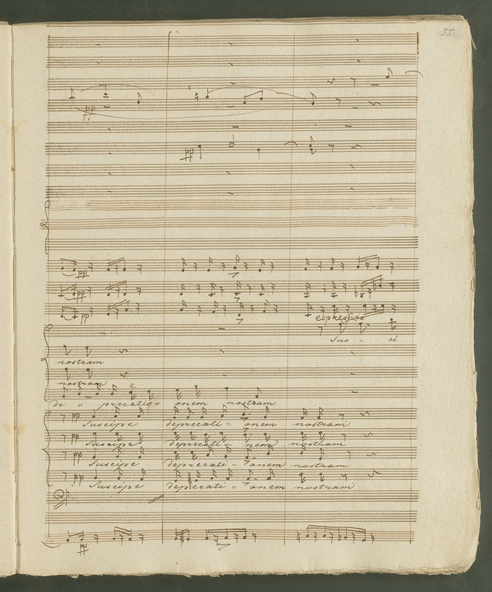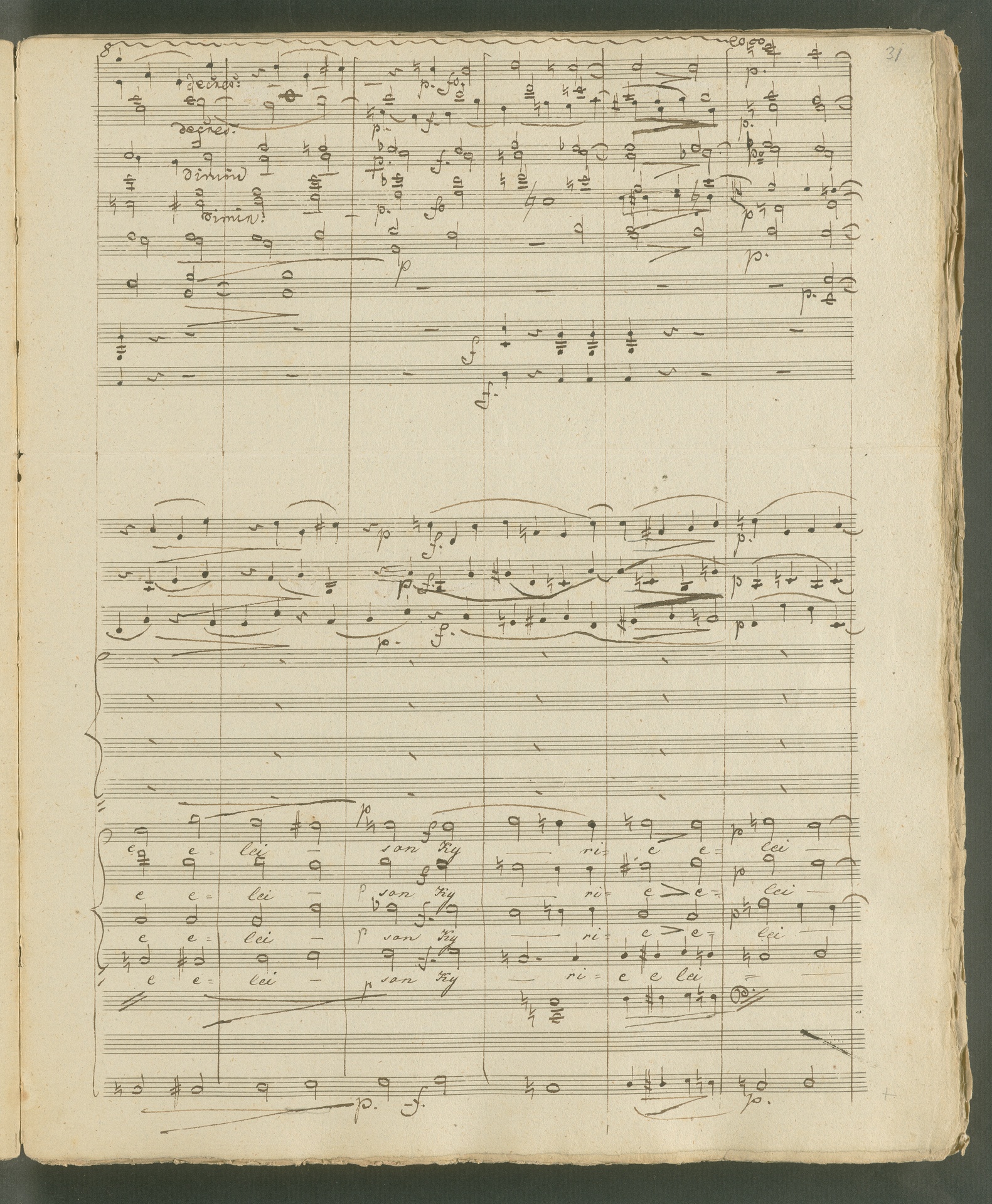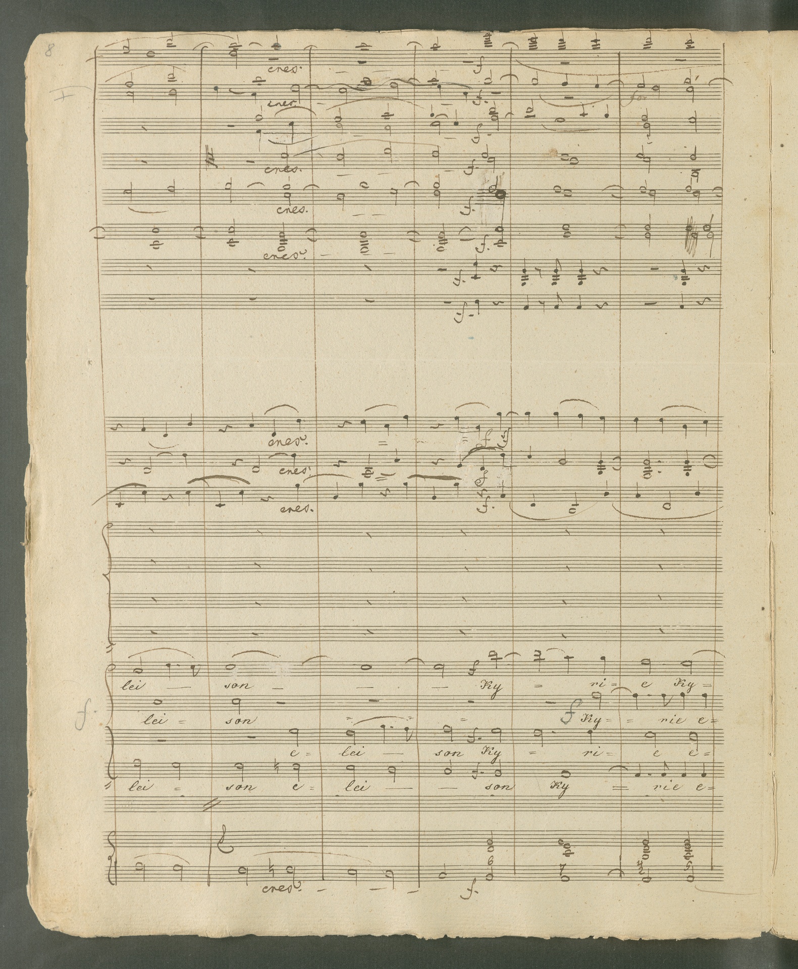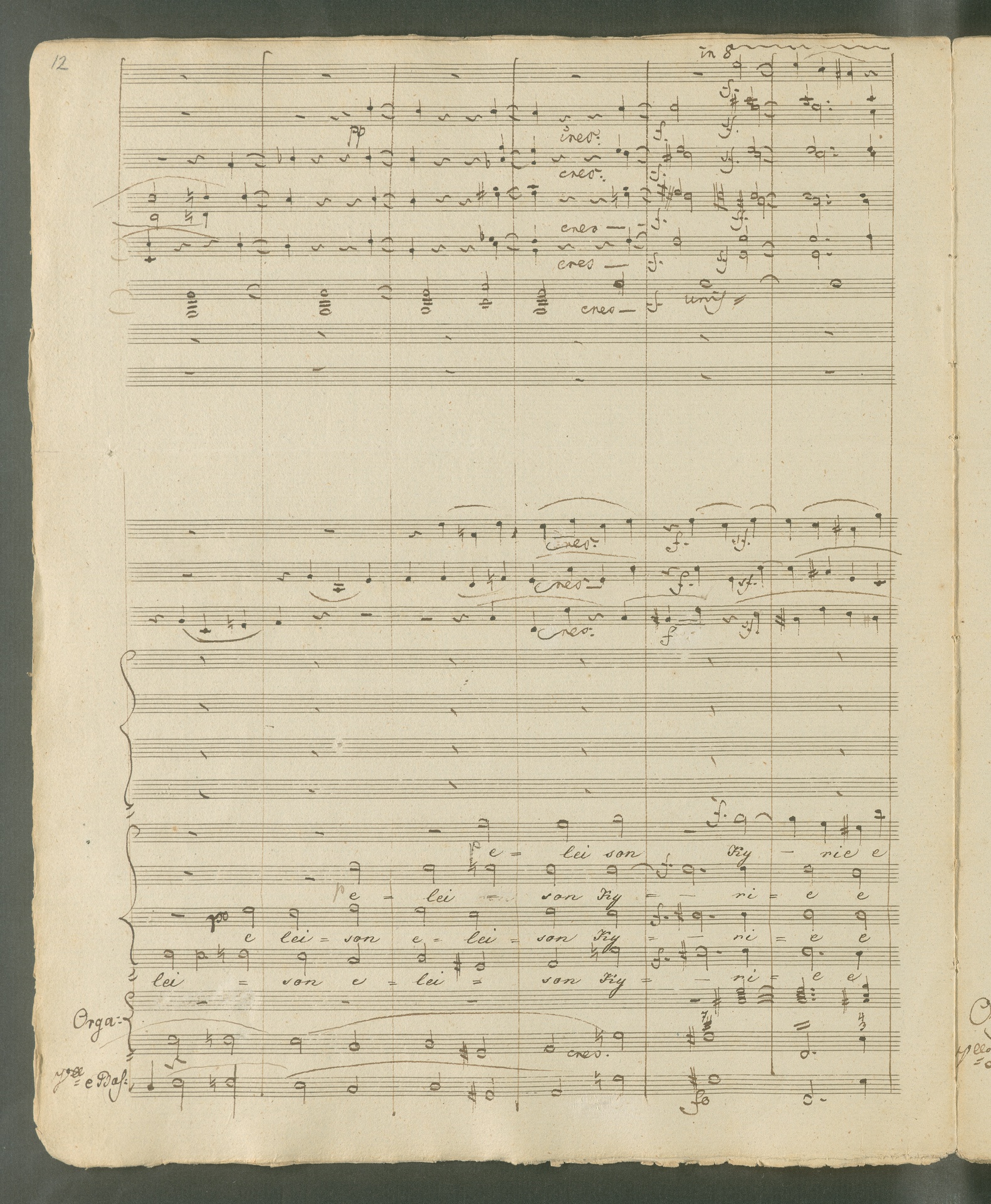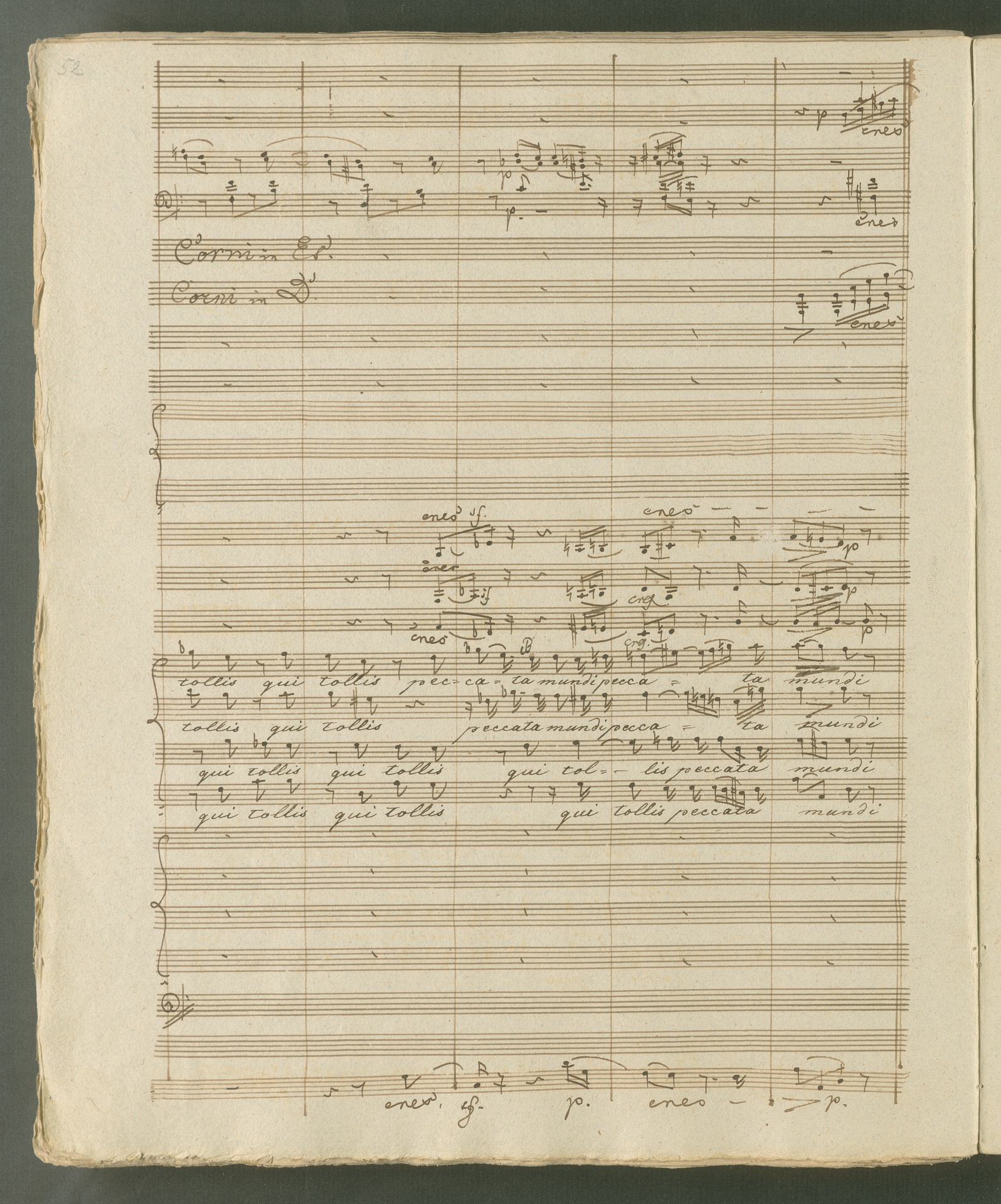 Diese überprüfte Abschrift der ersten beiden Sätze Kyrie und Gloria aus der Missa Solemnis entstand in der zweiten Jahreshälfte 1823. Beethoven schickte die Teilabschrift am 9. April 1825 zu seinem ehemaligen Schüler Ferdinand Ries nach Bonn. Die Messe sollte beim Niederrheinischen Musikfest des gleichen Jahres in Aachen aufgeführt werden, für das sich Ries sehr engagierte. "Kyrie u. gloria zwei der vorzüglichst. Stük sind ebenfalls schon (...) auf dem wege für sie" (BGA 1957. Beethoven an Ferdinand Ries in Bonn, Wien, 9. April 1825), schrieb Beethoven im zugehörigen Begleitbrief an Ries. Allerdings wurde die Messe schließlich doch nicht ins Programm genommen: Die Sendung traf zu spät bei Ries ein als dass sie noch hätte vernünftig geprobt werden können. (J.R.)