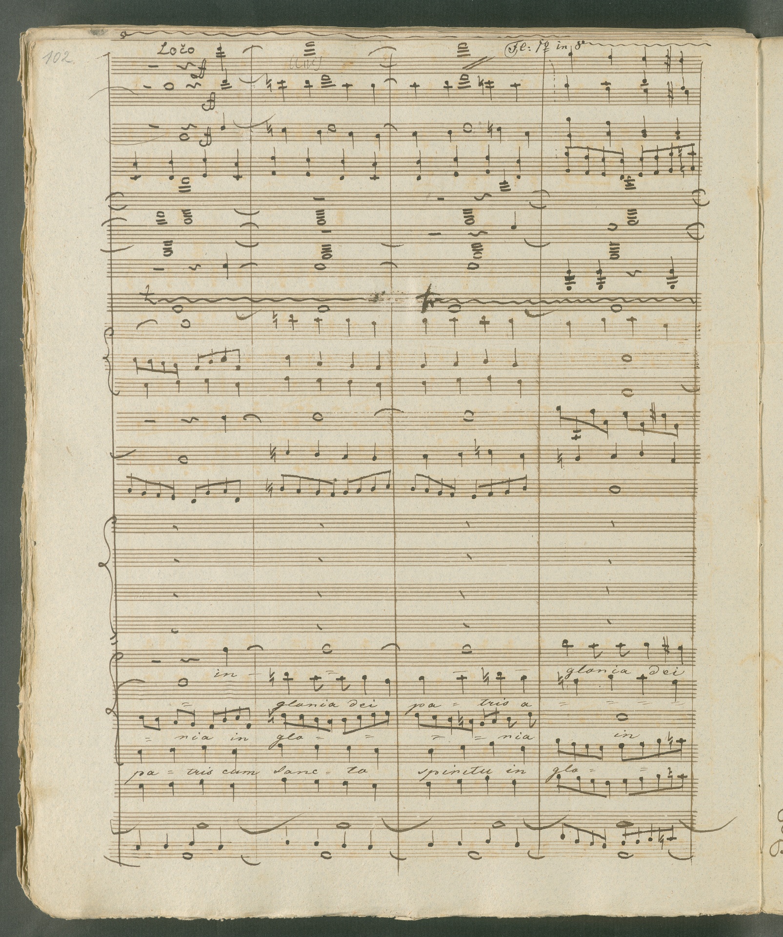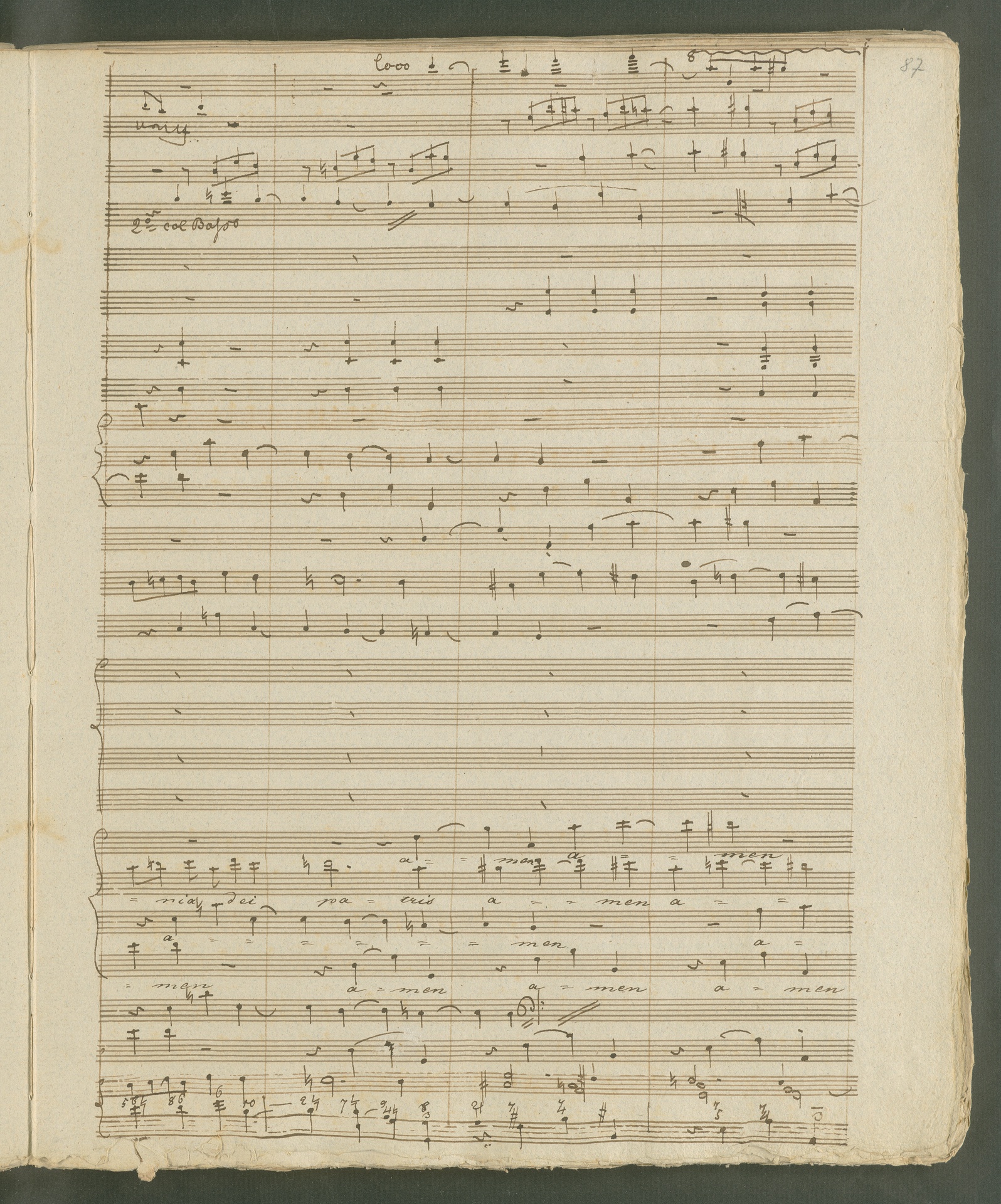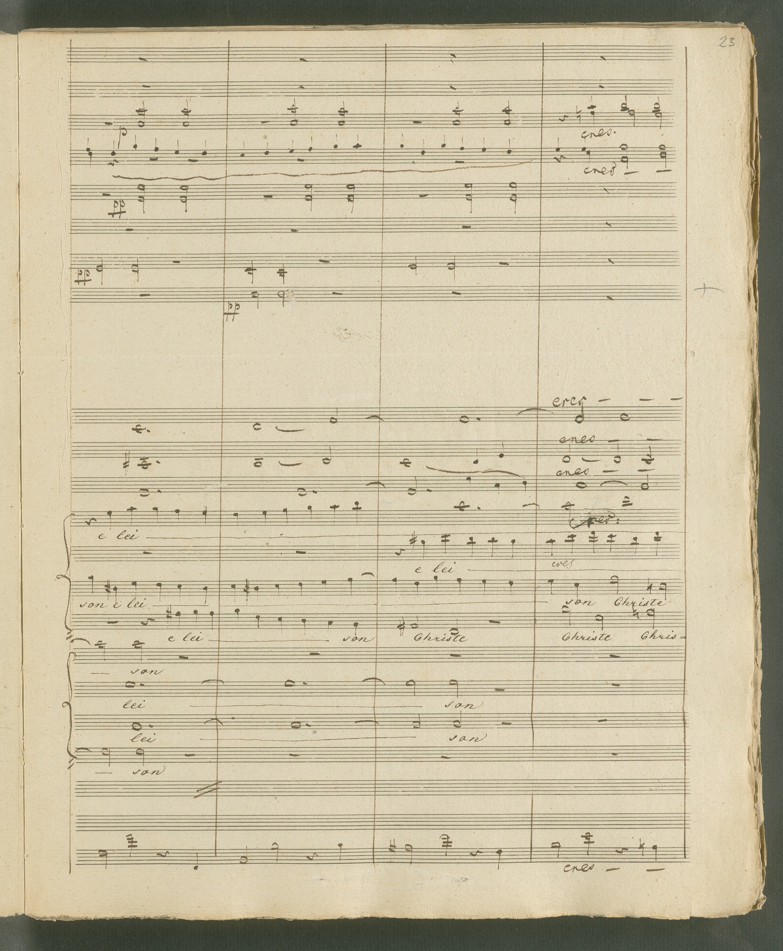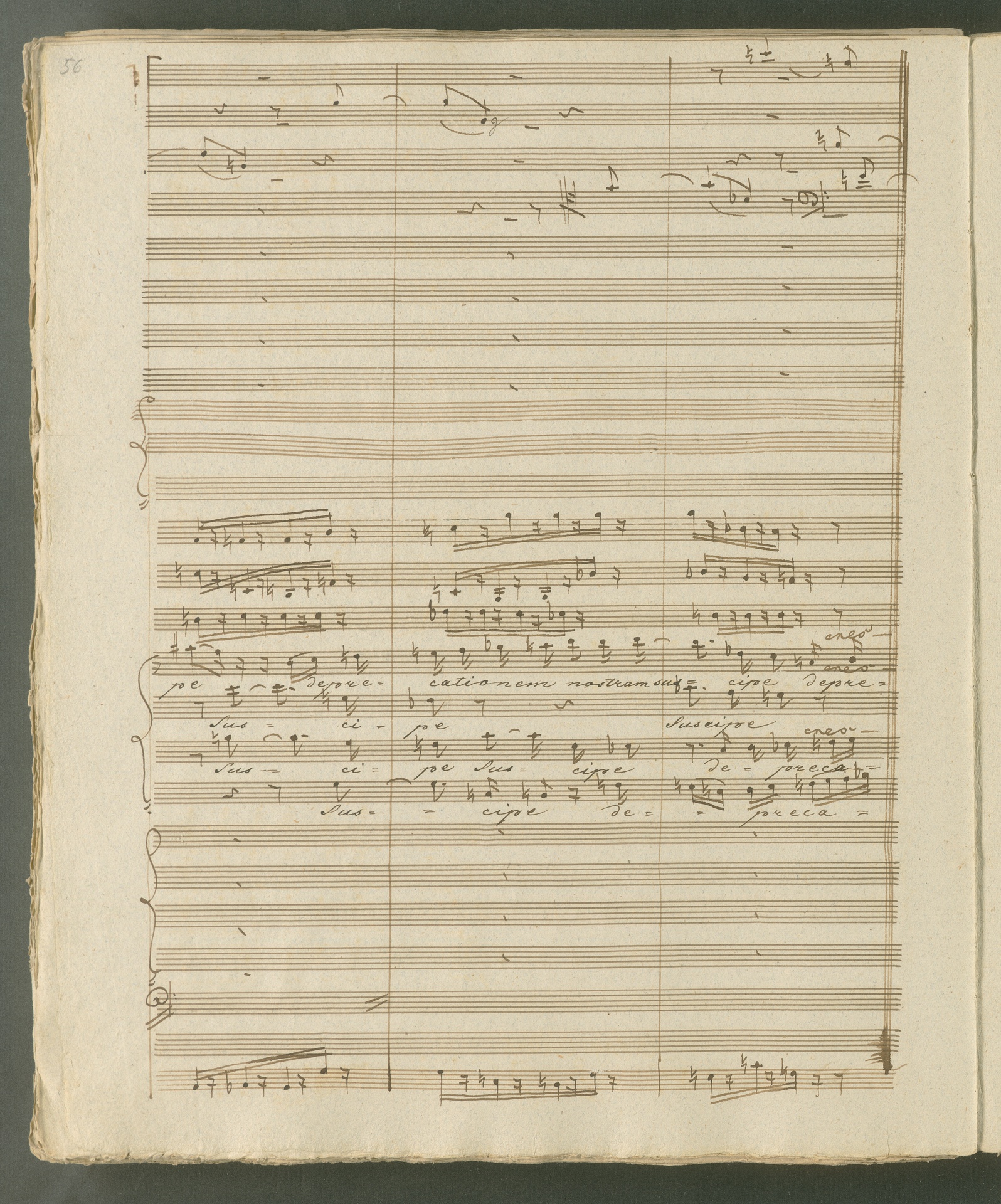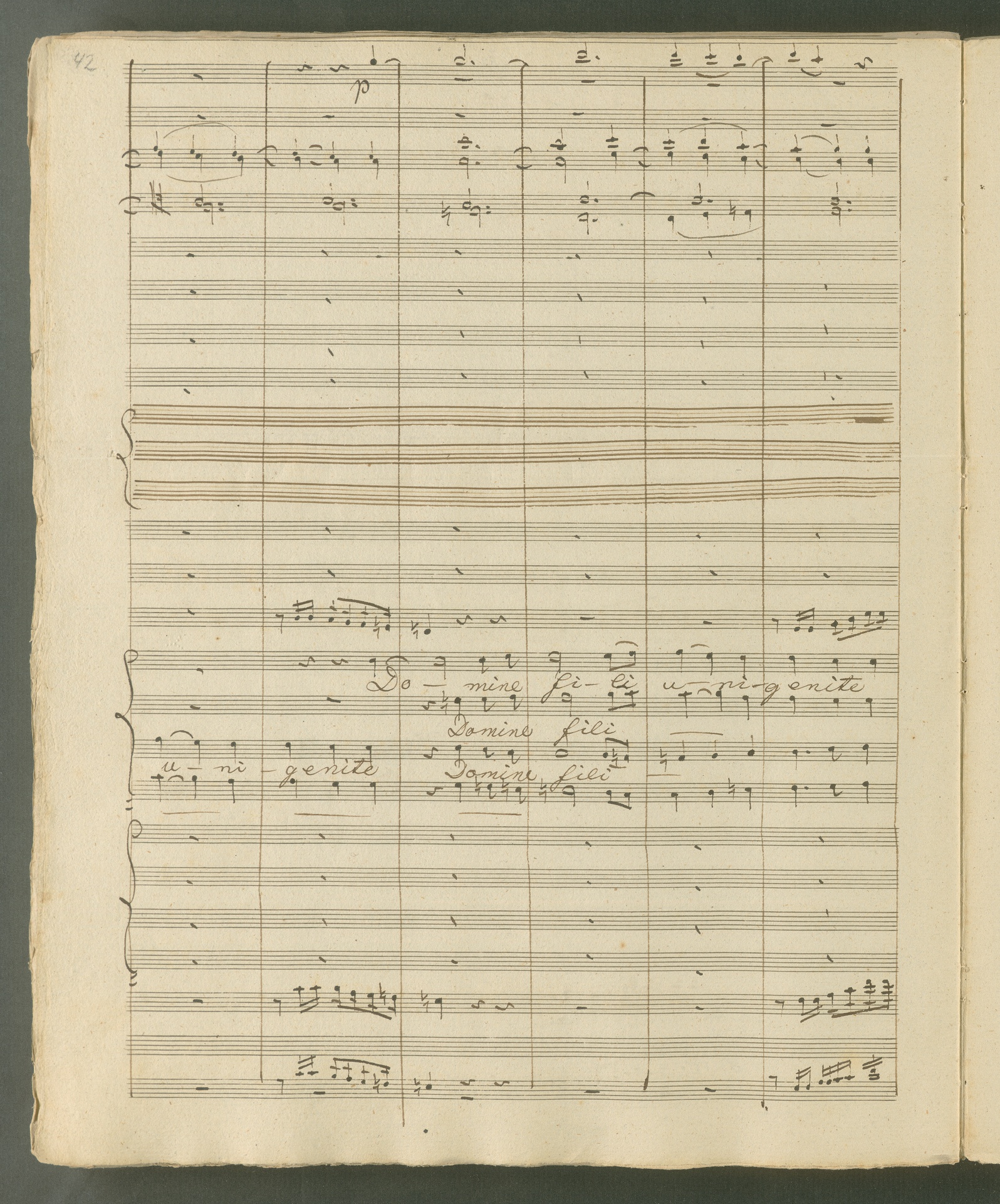 Diese überprüfte Abschrift der ersten beiden Sätze Kyrie und Gloria aus der Missa Solemnis entstand in der zweiten Jahreshälfte 1823. Beethoven schickte die Teilabschrift am 9. April 1825 zu seinem ehemaligen Schüler Ferdinand Ries nach Bonn. Die Messe sollte beim Niederrheinischen Musikfest des gleichen Jahres in Aachen aufgeführt werden, für das sich Ries sehr engagierte. "Kyrie u. gloria zwei der vorzüglichst. Stük sind ebenfalls schon (...) auf dem wege für sie" (BGA 1957. Beethoven an Ferdinand Ries in Bonn, Wien, 9. April 1825), schrieb Beethoven im zugehörigen Begleitbrief an Ries. Allerdings wurde die Messe schließlich doch nicht ins Programm genommen: Die Sendung traf zu spät bei Ries ein als dass sie noch hätte vernünftig geprobt werden können. (J.R.)