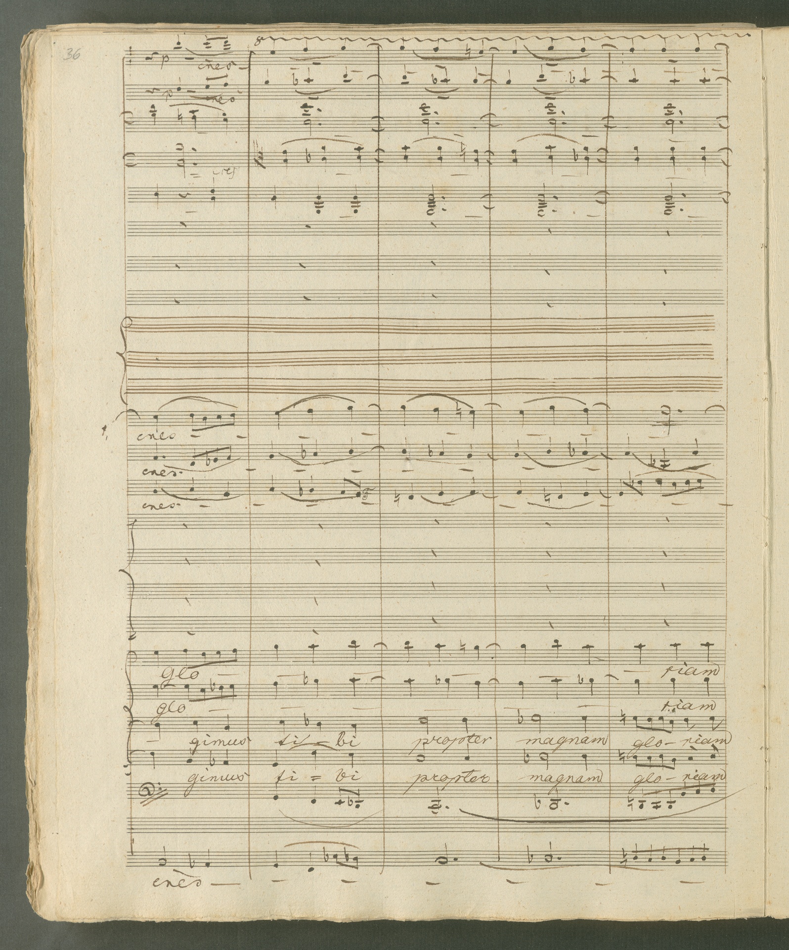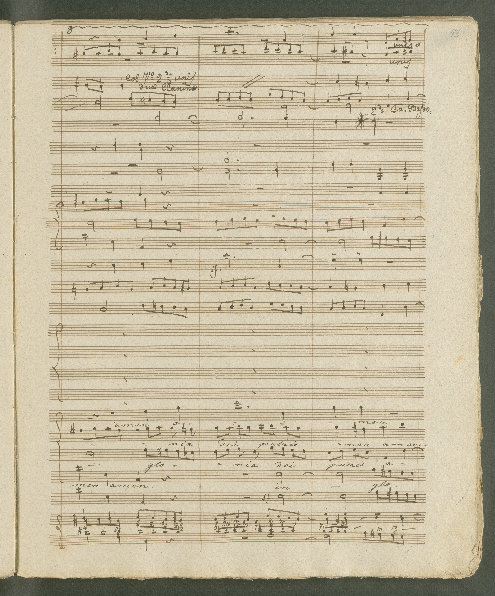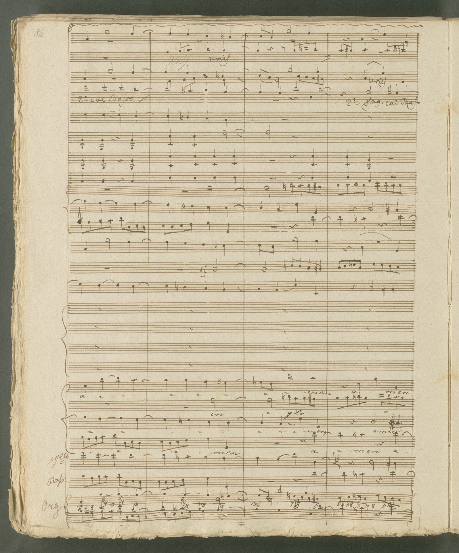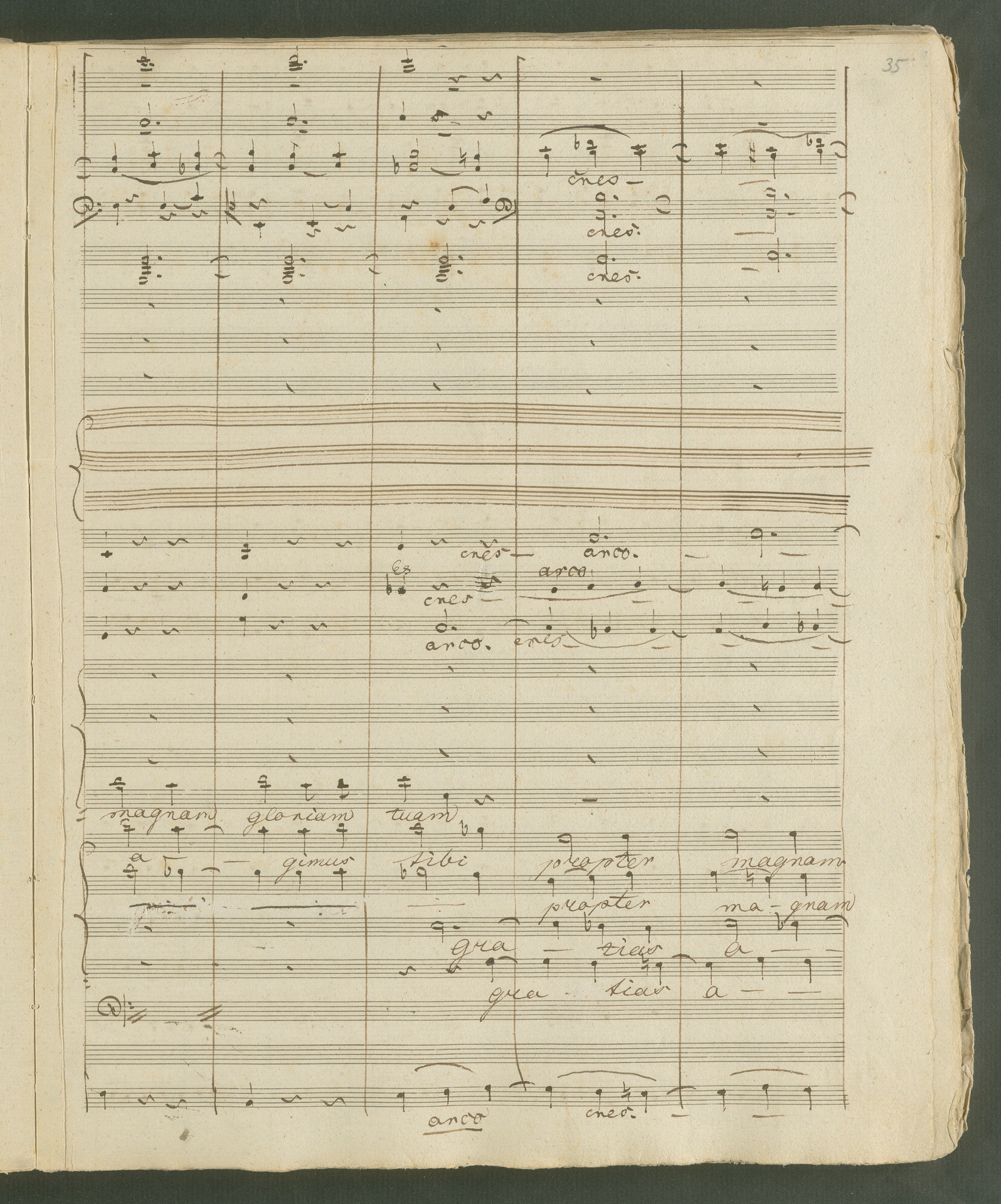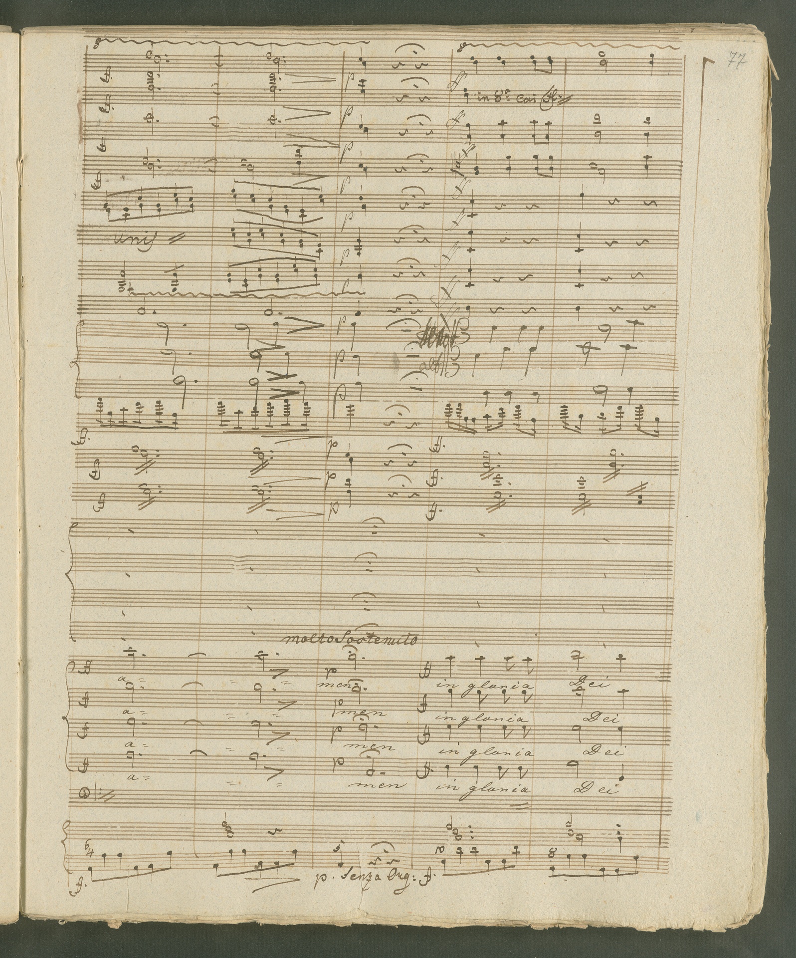 Diese überprüfte Abschrift der ersten beiden Sätze Kyrie und Gloria aus der Missa Solemnis entstand in der zweiten Jahreshälfte 1823. Beethoven schickte die Teilabschrift am 9. April 1825 zu seinem ehemaligen Schüler Ferdinand Ries nach Bonn. Die Messe sollte beim Niederrheinischen Musikfest des gleichen Jahres in Aachen aufgeführt werden, für das sich Ries sehr engagierte. "Kyrie u. gloria zwei der vorzüglichst. Stük sind ebenfalls schon (...) auf dem wege für sie" (BGA 1957. Beethoven an Ferdinand Ries in Bonn, Wien, 9. April 1825), schrieb Beethoven im zugehörigen Begleitbrief an Ries. Allerdings wurde die Messe schließlich doch nicht ins Programm genommen: Die Sendung traf zu spät bei Ries ein als dass sie noch hätte vernünftig geprobt werden können. (J.R.)