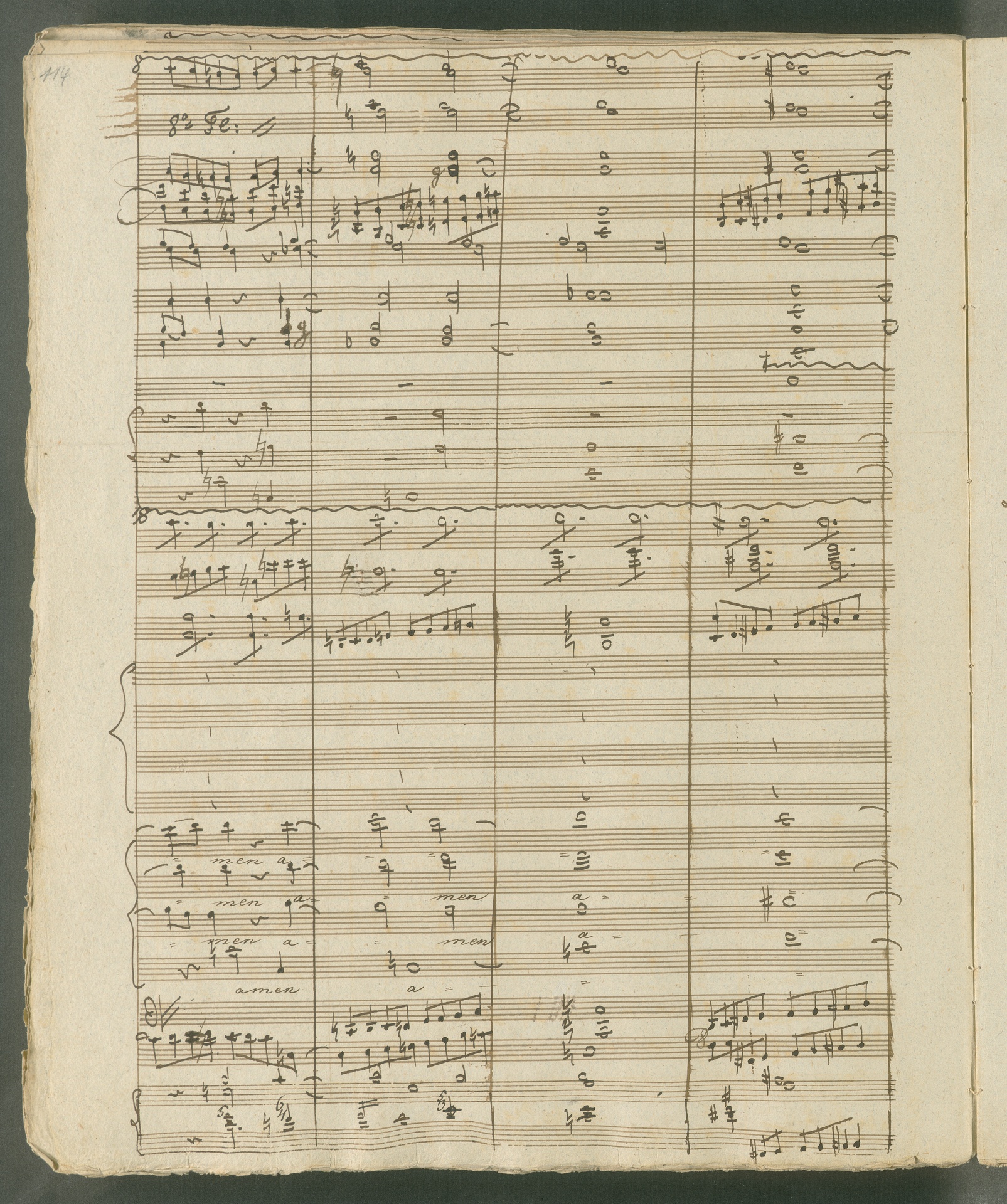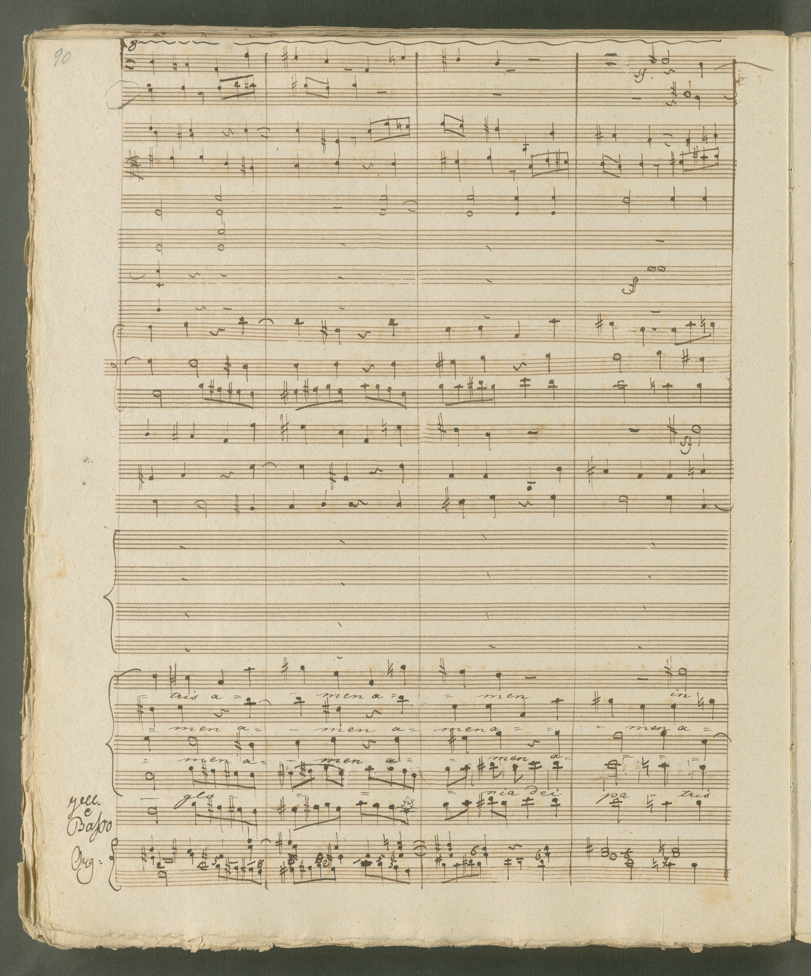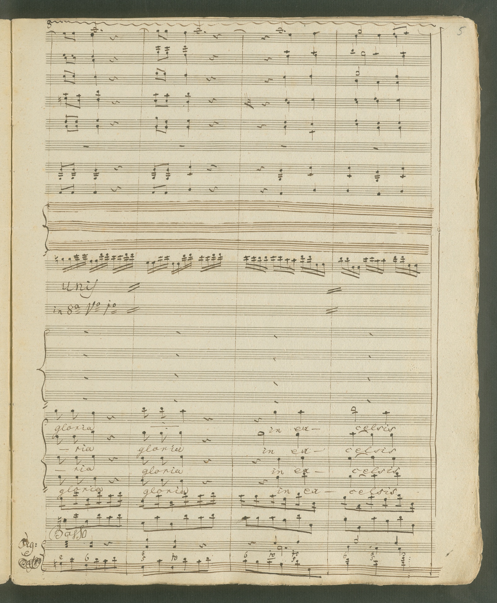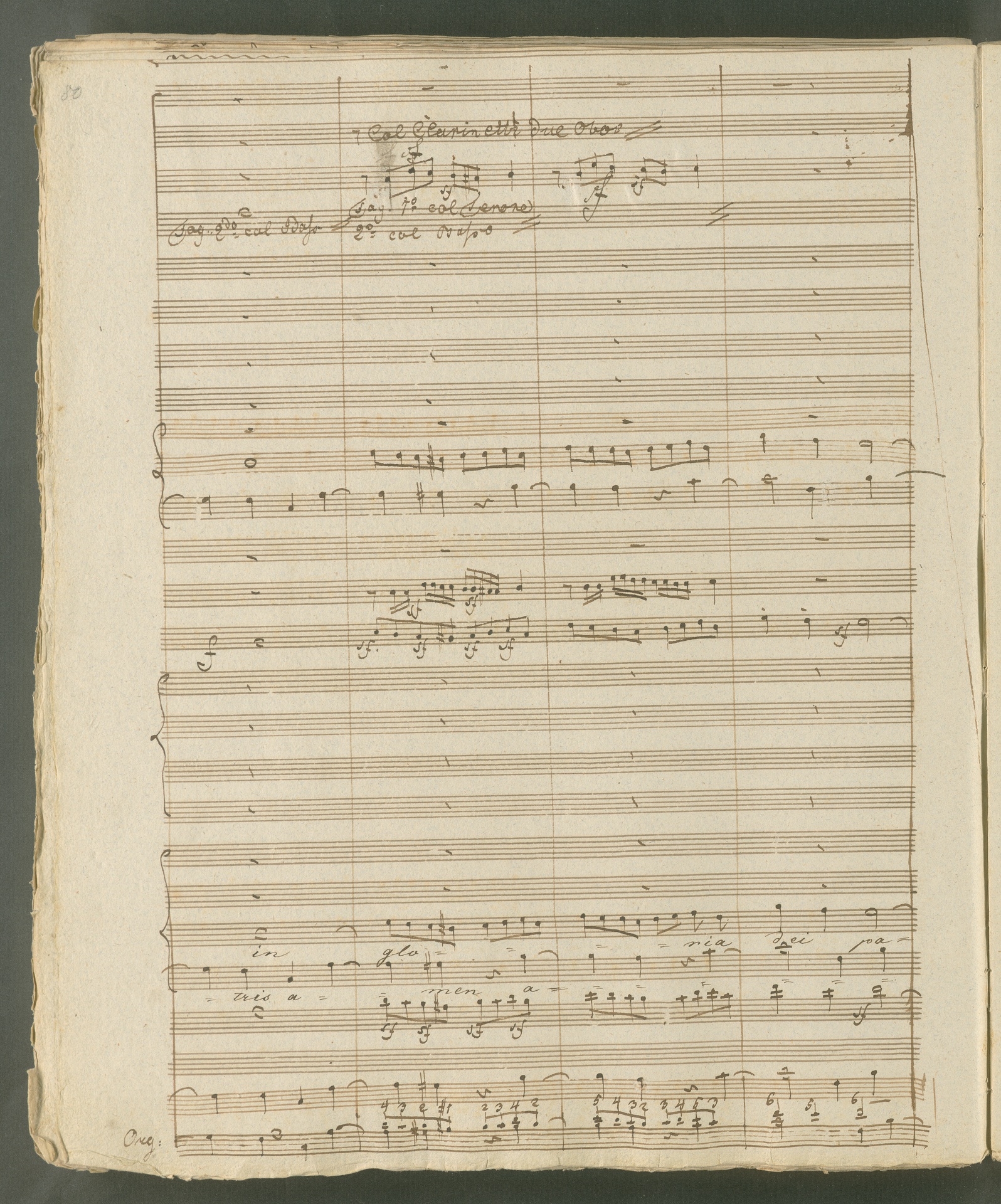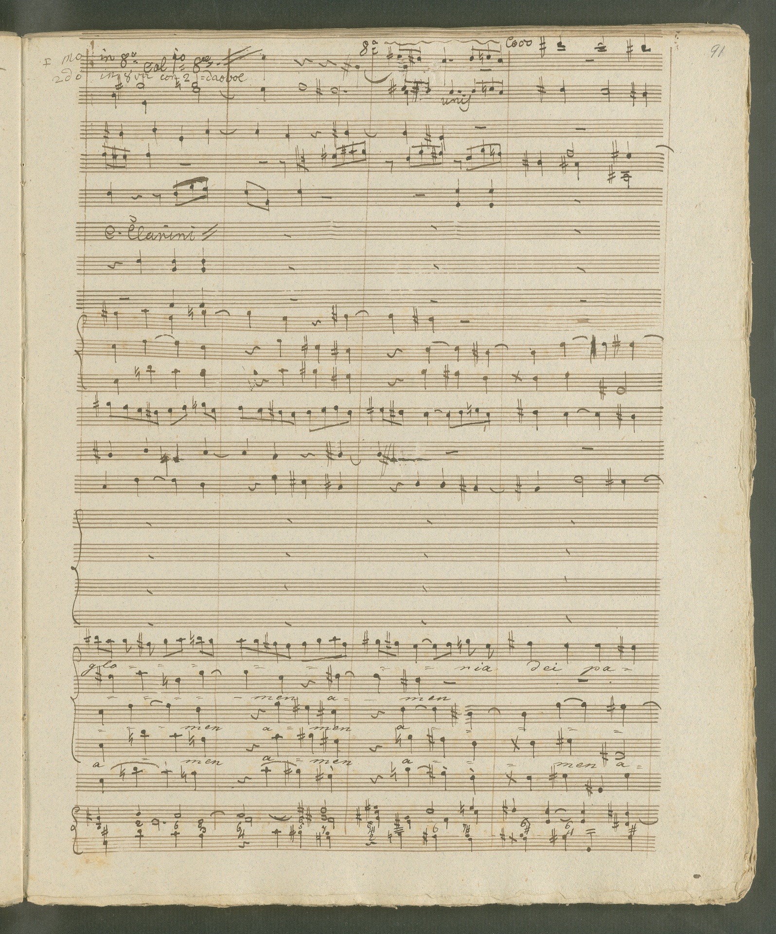 Diese überprüfte Abschrift der ersten beiden Sätze Kyrie und Gloria aus der Missa Solemnis entstand in der zweiten Jahreshälfte 1823. Beethoven schickte die Teilabschrift am 9. April 1825 zu seinem ehemaligen Schüler Ferdinand Ries nach Bonn. Die Messe sollte beim Niederrheinischen Musikfest des gleichen Jahres in Aachen aufgeführt werden, für das sich Ries sehr engagierte. "Kyrie u. gloria zwei der vorzüglichst. Stük sind ebenfalls schon (...) auf dem wege für sie" (BGA 1957. Beethoven an Ferdinand Ries in Bonn, Wien, 9. April 1825), schrieb Beethoven im zugehörigen Begleitbrief an Ries. Allerdings wurde die Messe schließlich doch nicht ins Programm genommen: Die Sendung traf zu spät bei Ries ein als dass sie noch hätte vernünftig geprobt werden können. (J.R.)