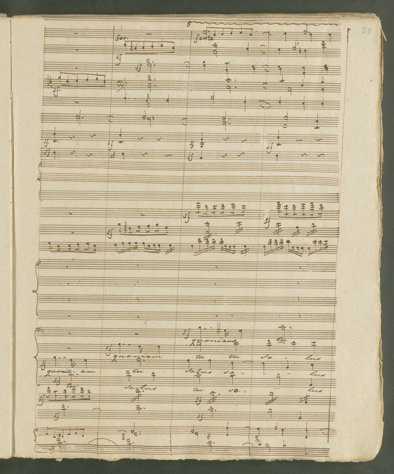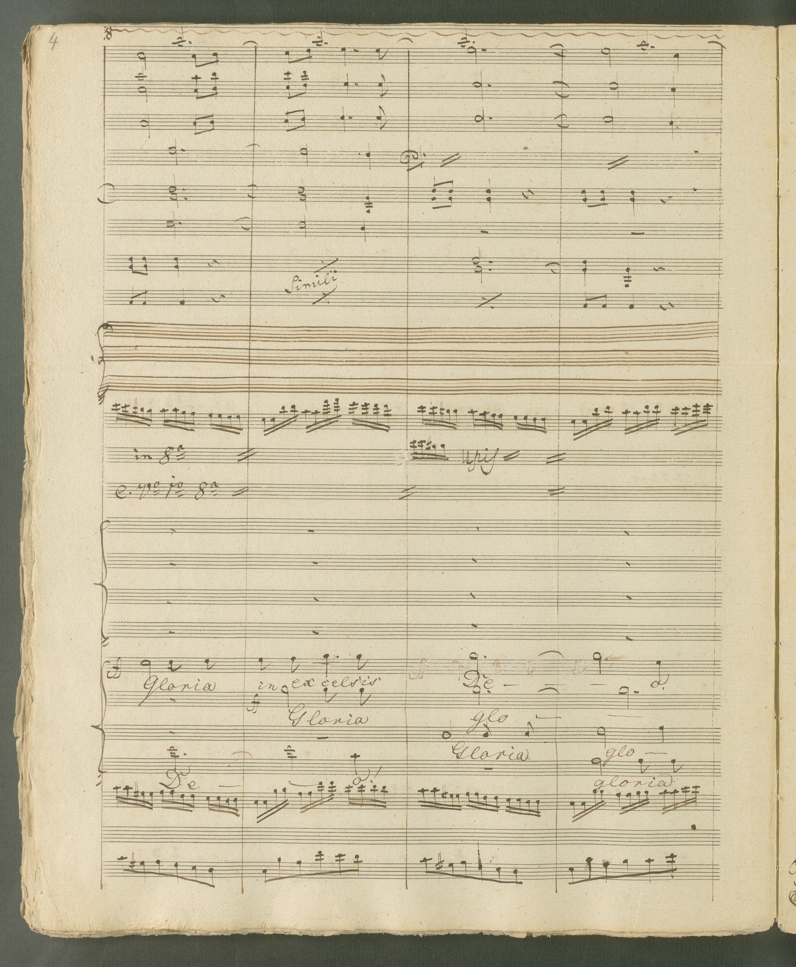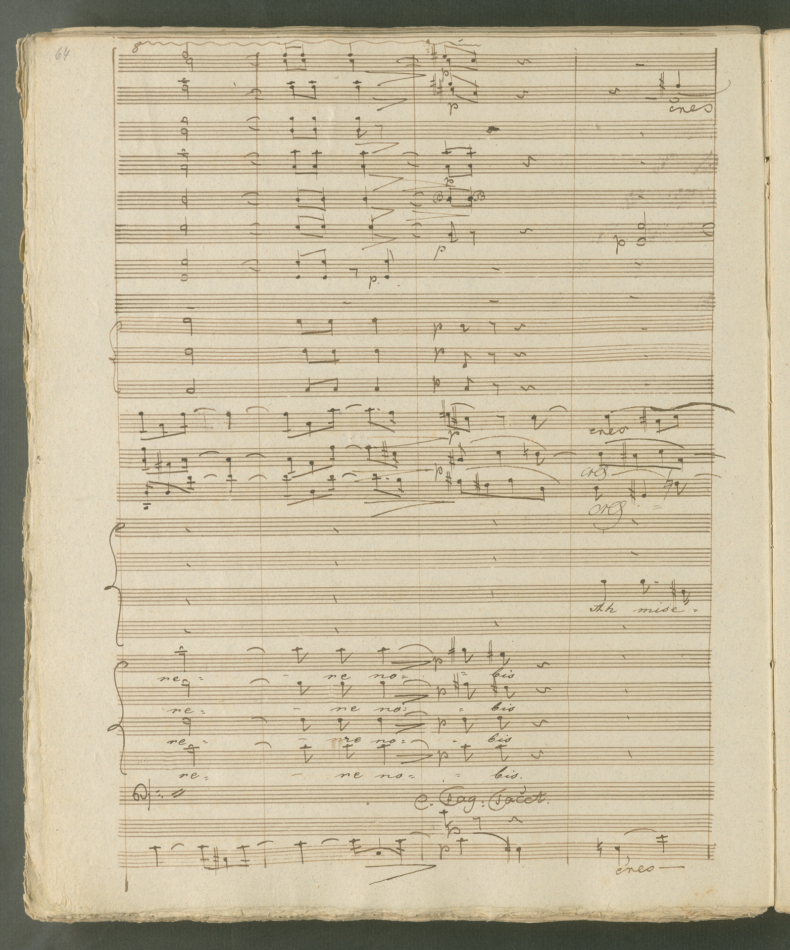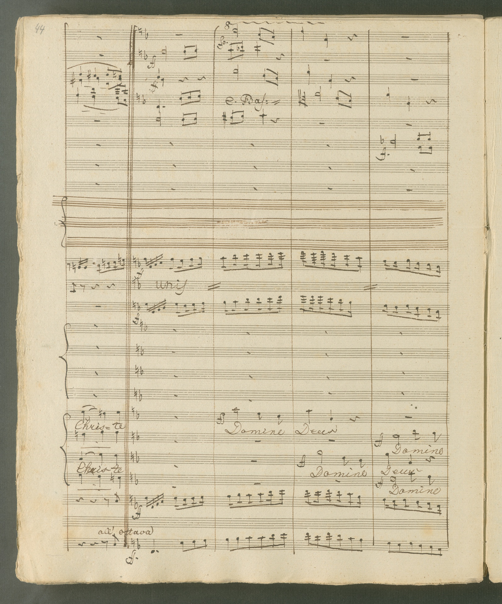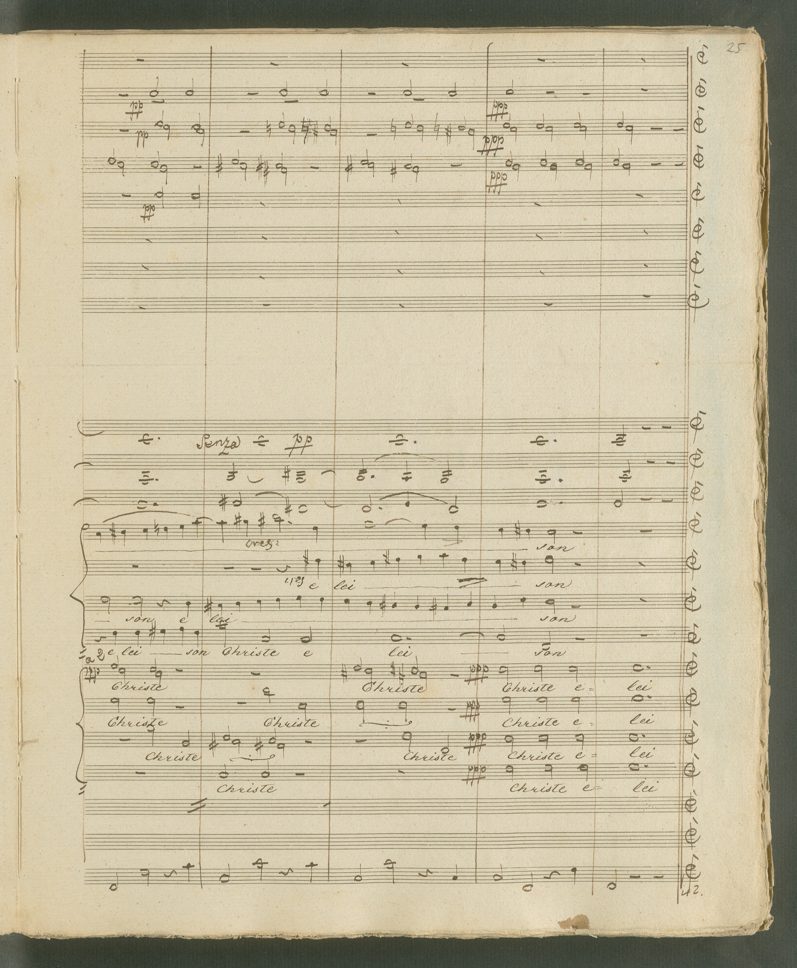 Diese überprüfte Abschrift der ersten beiden Sätze Kyrie und Gloria aus der Missa Solemnis entstand in der zweiten Jahreshälfte 1823. Beethoven schickte die Teilabschrift am 9. April 1825 zu seinem ehemaligen Schüler Ferdinand Ries nach Bonn. Die Messe sollte beim Niederrheinischen Musikfest des gleichen Jahres in Aachen aufgeführt werden, für das sich Ries sehr engagierte. "Kyrie u. gloria zwei der vorzüglichst. Stük sind ebenfalls schon (...) auf dem wege für sie" (BGA 1957. Beethoven an Ferdinand Ries in Bonn, Wien, 9. April 1825), schrieb Beethoven im zugehörigen Begleitbrief an Ries. Allerdings wurde die Messe schließlich doch nicht ins Programm genommen: Die Sendung traf zu spät bei Ries ein als dass sie noch hätte vernünftig geprobt werden können. (J.R.)