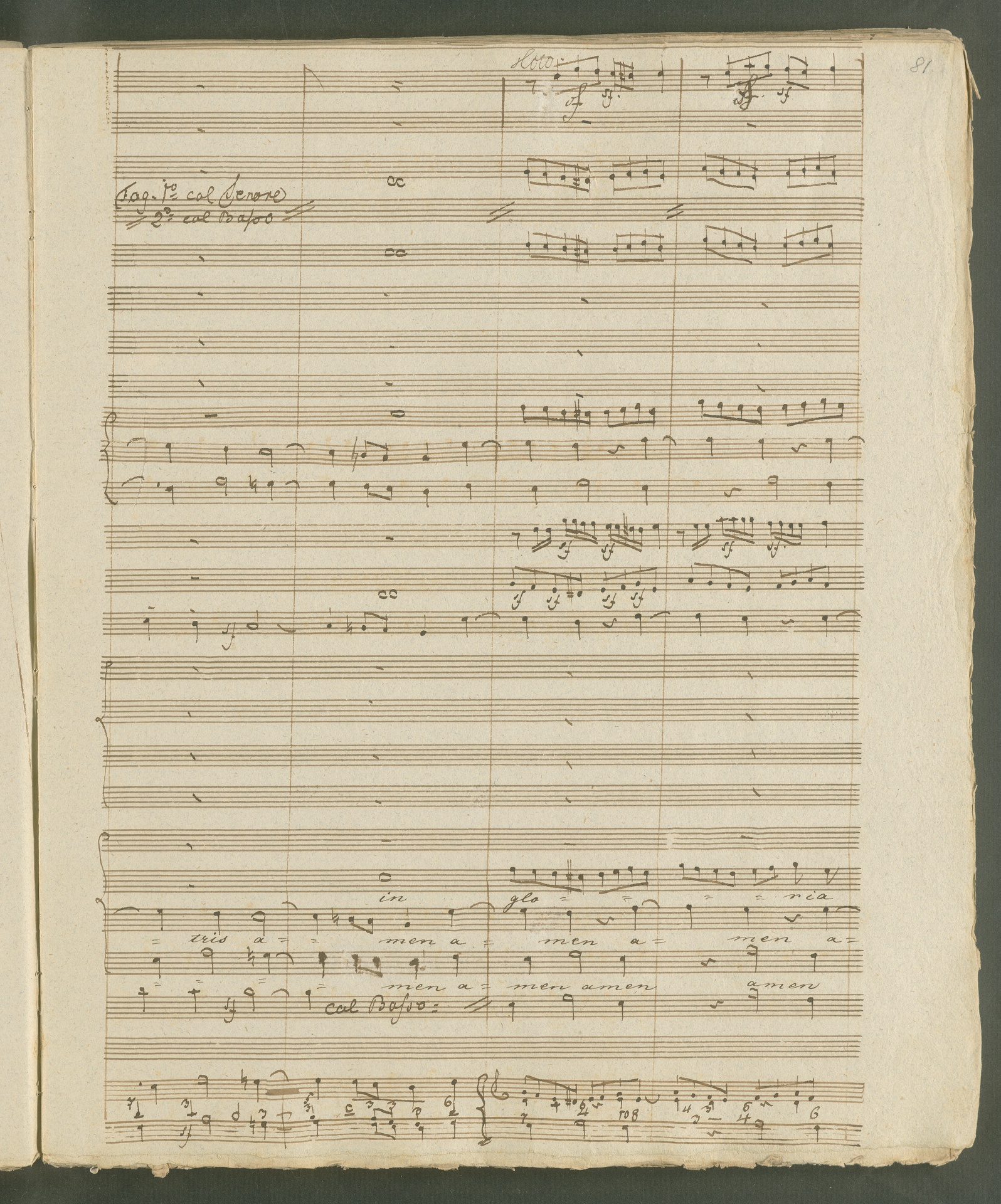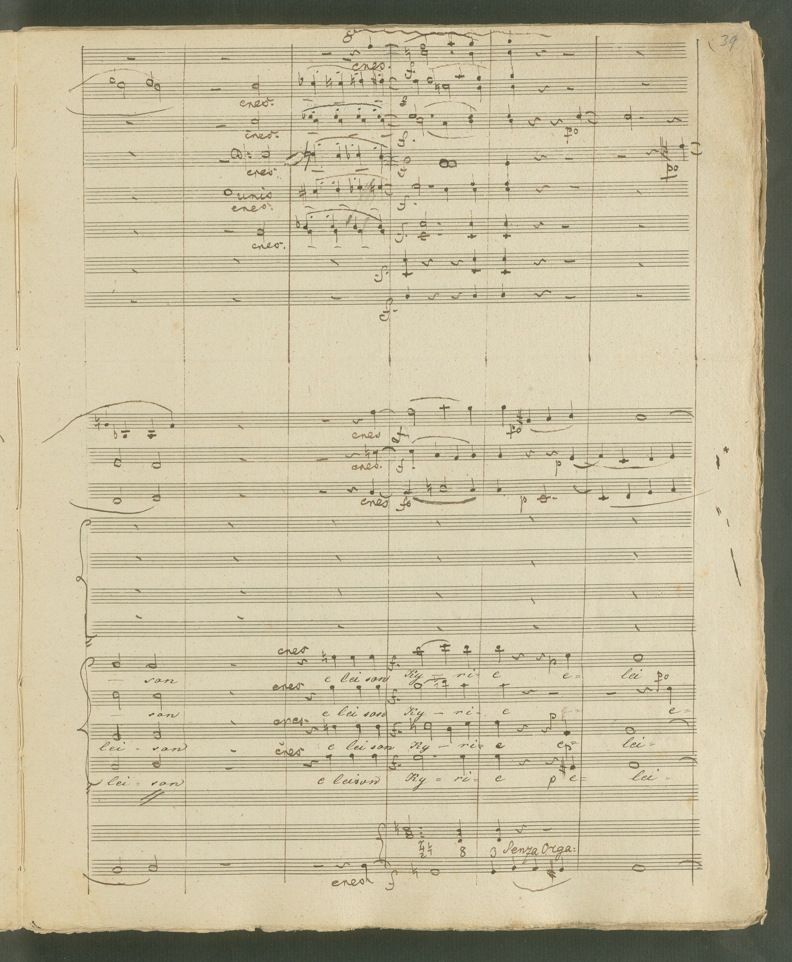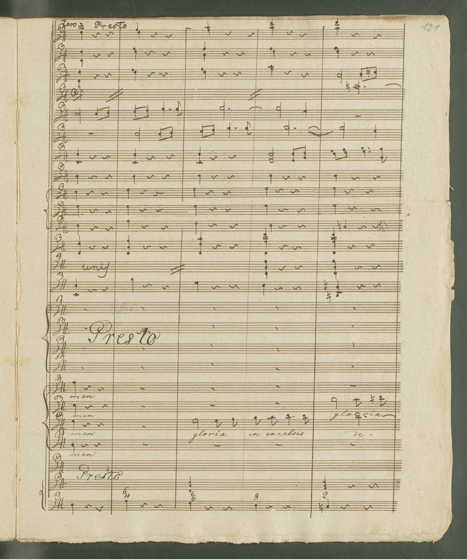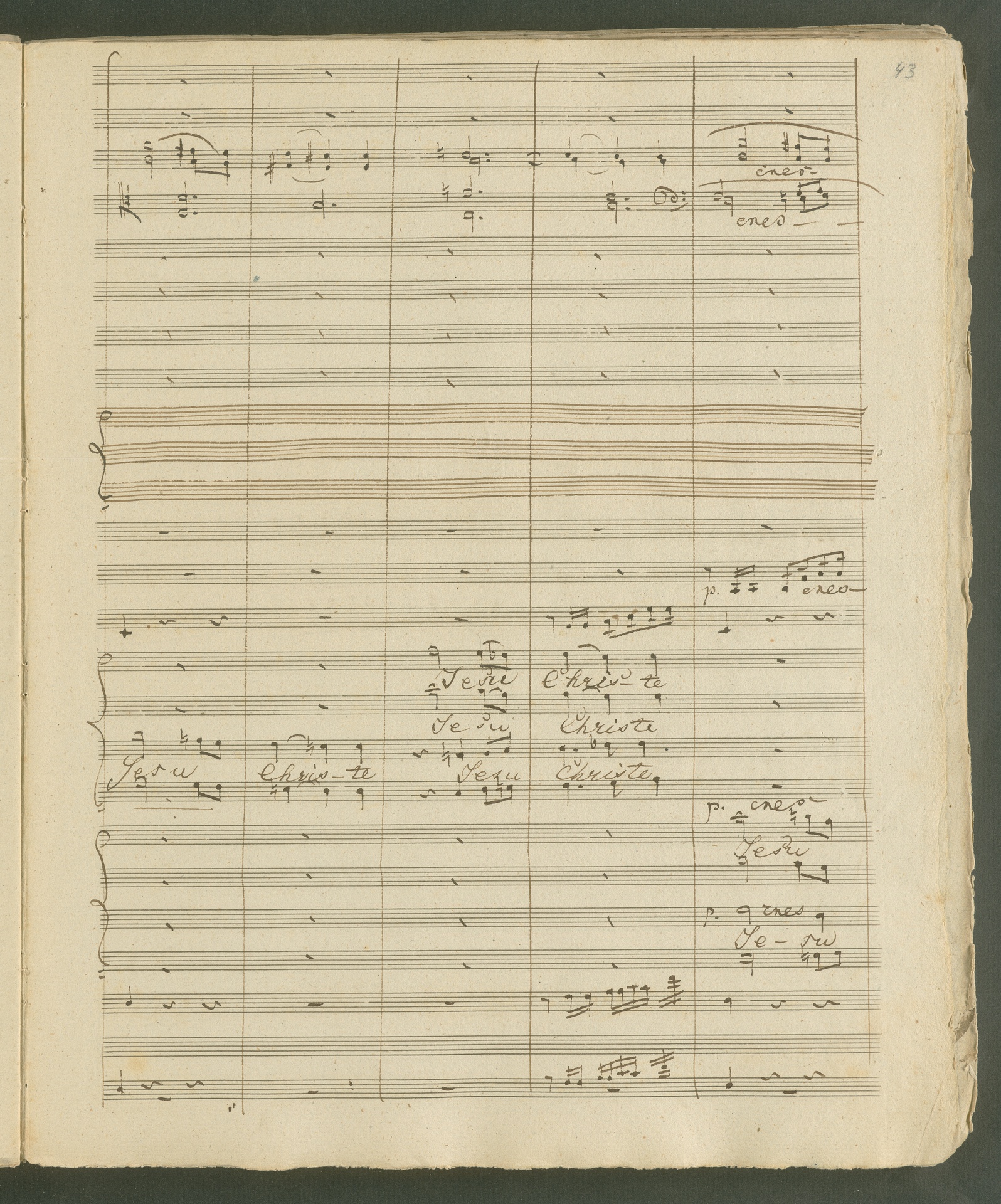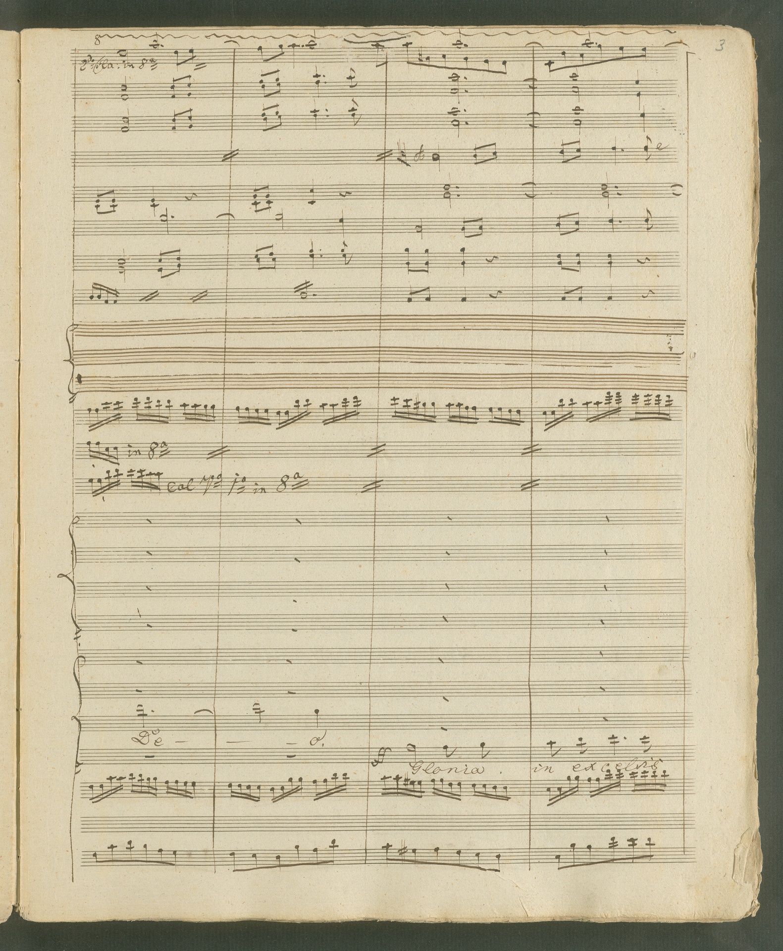 Diese überprüfte Abschrift der ersten beiden Sätze Kyrie und Gloria aus der Missa Solemnis entstand in der zweiten Jahreshälfte 1823. Beethoven schickte die Teilabschrift am 9. April 1825 zu seinem ehemaligen Schüler Ferdinand Ries nach Bonn. Die Messe sollte beim Niederrheinischen Musikfest des gleichen Jahres in Aachen aufgeführt werden, für das sich Ries sehr engagierte. "Kyrie u. gloria zwei der vorzüglichst. Stük sind ebenfalls schon (...) auf dem wege für sie" (BGA 1957. Beethoven an Ferdinand Ries in Bonn, Wien, 9. April 1825), schrieb Beethoven im zugehörigen Begleitbrief an Ries. Allerdings wurde die Messe schließlich doch nicht ins Programm genommen: Die Sendung traf zu spät bei Ries ein als dass sie noch hätte vernünftig geprobt werden können. (J.R.)