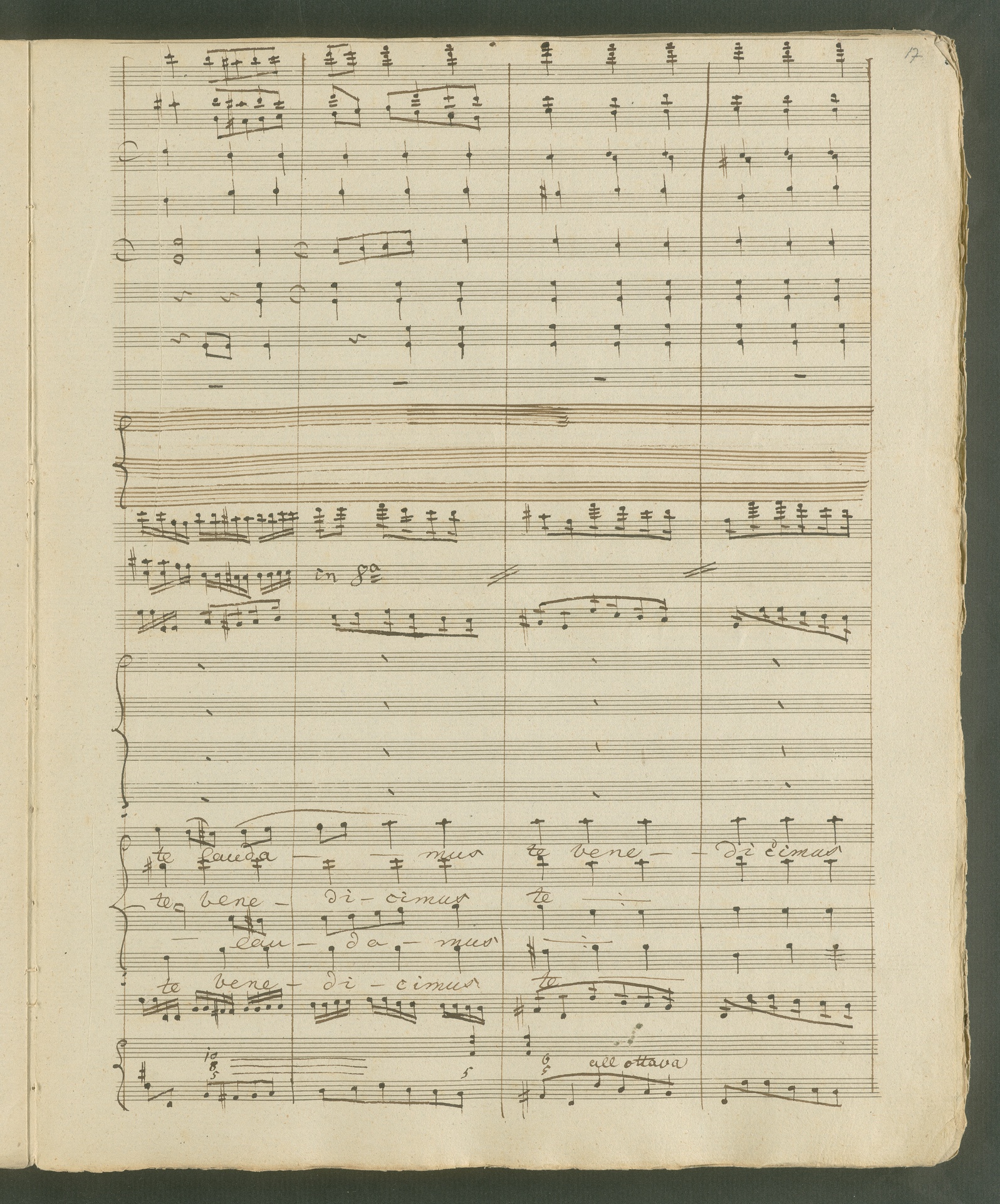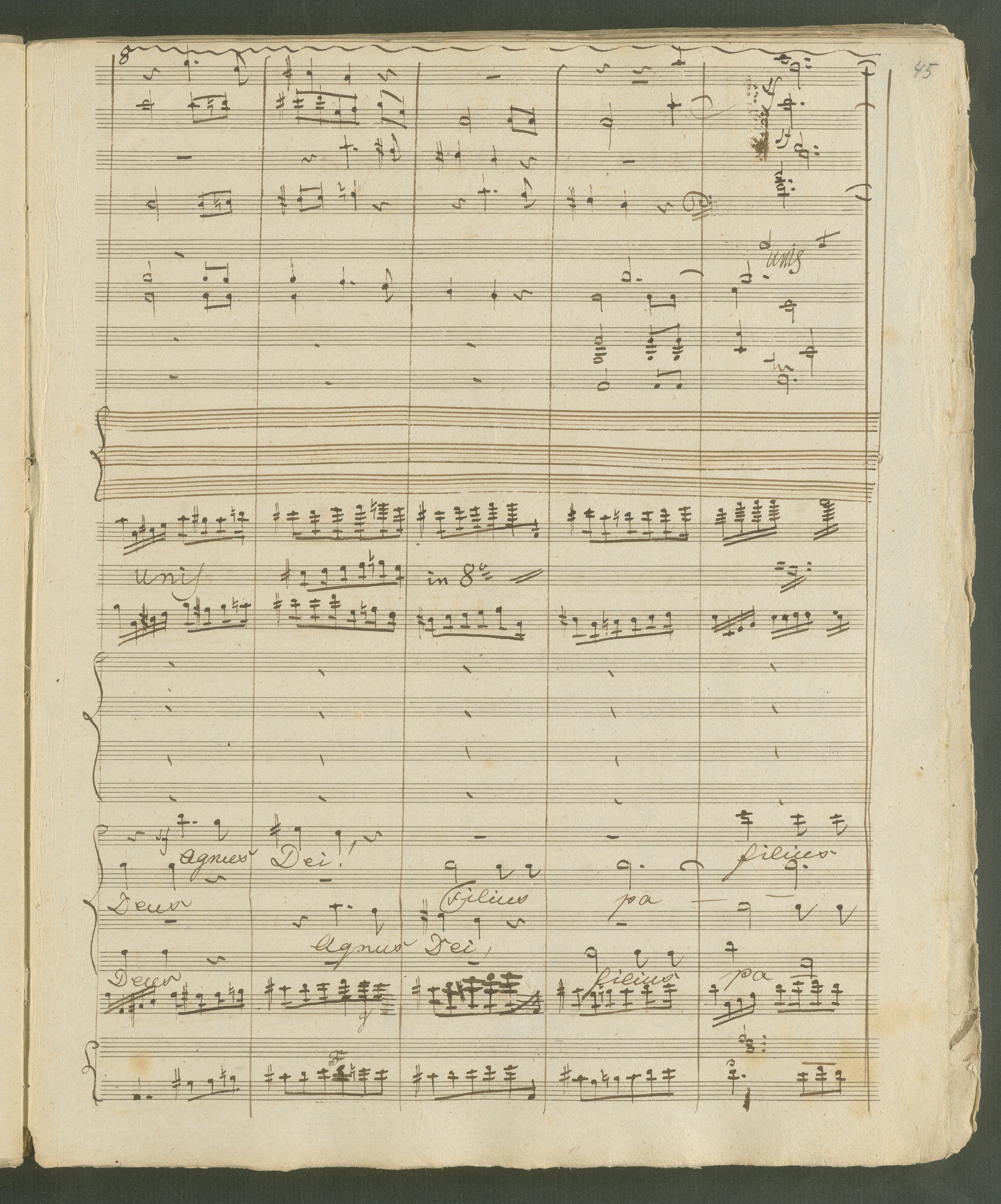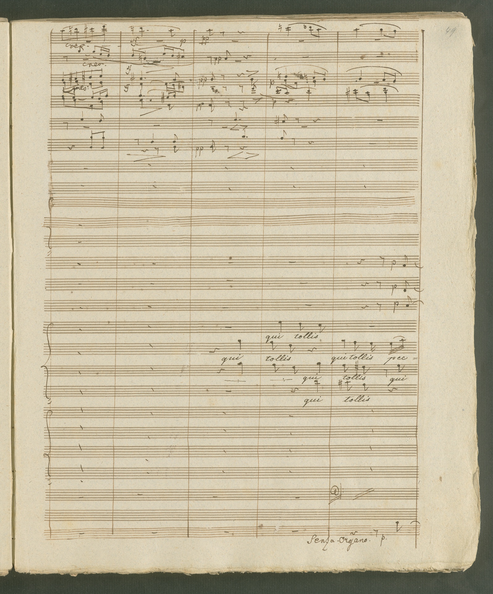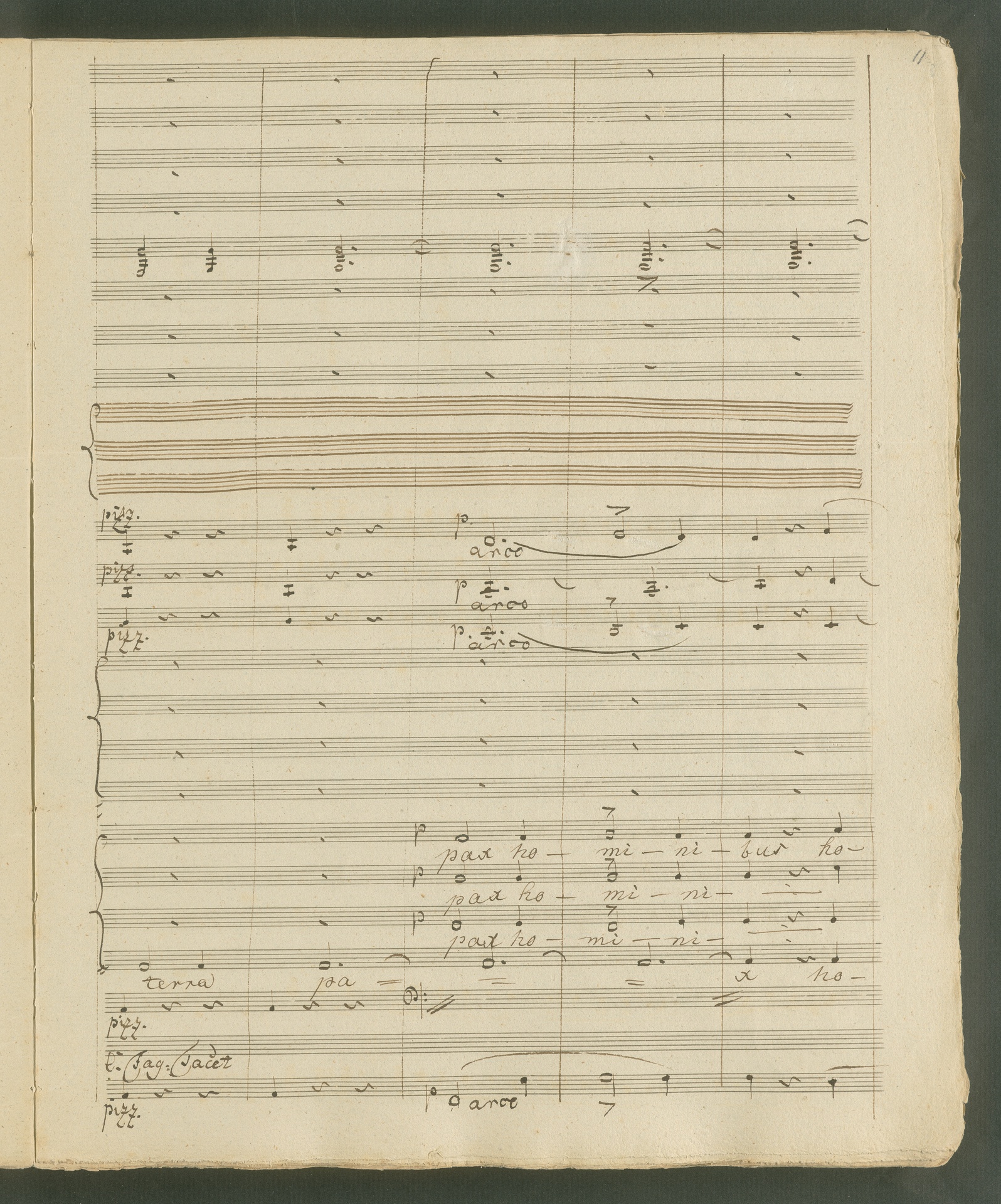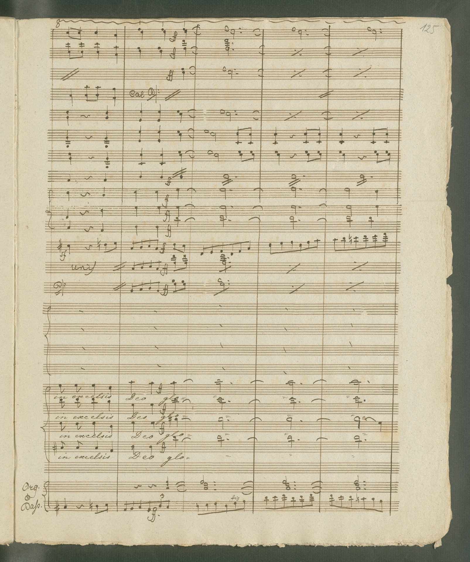 Diese überprüfte Abschrift der ersten beiden Sätze Kyrie und Gloria aus der Missa Solemnis entstand in der zweiten Jahreshälfte 1823. Beethoven schickte die Teilabschrift am 9. April 1825 zu seinem ehemaligen Schüler Ferdinand Ries nach Bonn. Die Messe sollte beim Niederrheinischen Musikfest des gleichen Jahres in Aachen aufgeführt werden, für das sich Ries sehr engagierte. "Kyrie u. gloria zwei der vorzüglichst. Stük sind ebenfalls schon (...) auf dem wege für sie" (BGA 1957. Beethoven an Ferdinand Ries in Bonn, Wien, 9. April 1825), schrieb Beethoven im zugehörigen Begleitbrief an Ries. Allerdings wurde die Messe schließlich doch nicht ins Programm genommen: Die Sendung traf zu spät bei Ries ein als dass sie noch hätte vernünftig geprobt werden können. (J.R.)