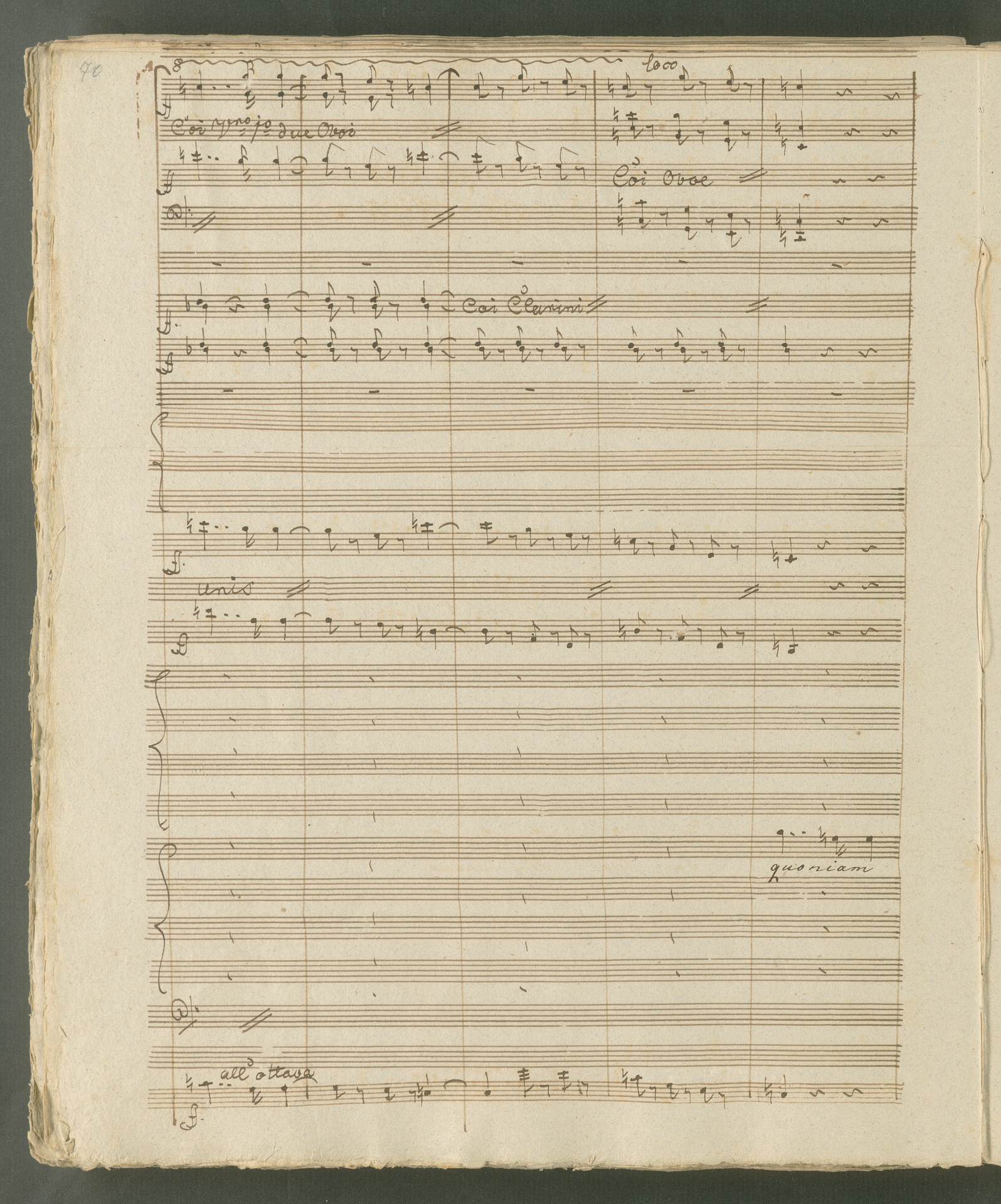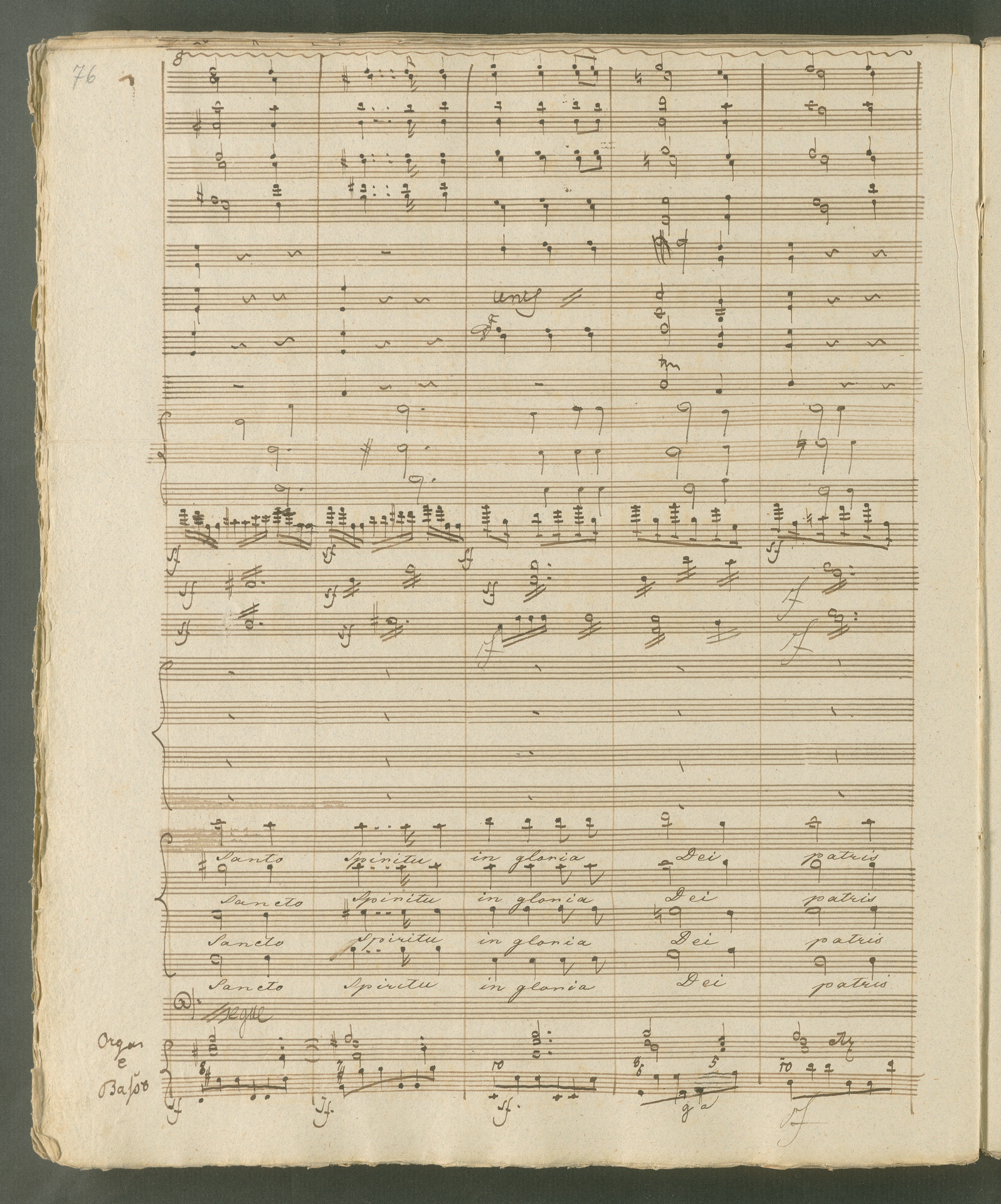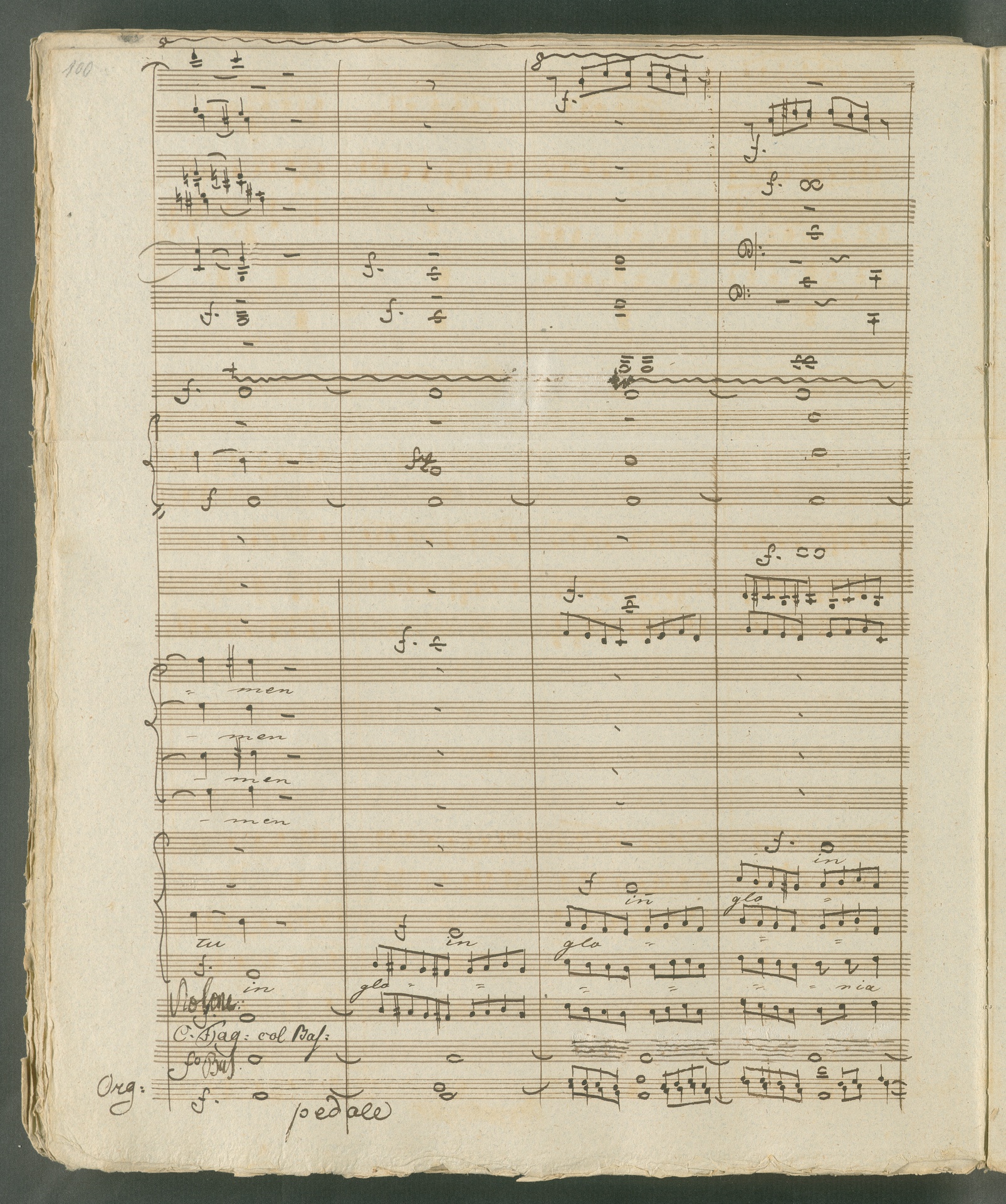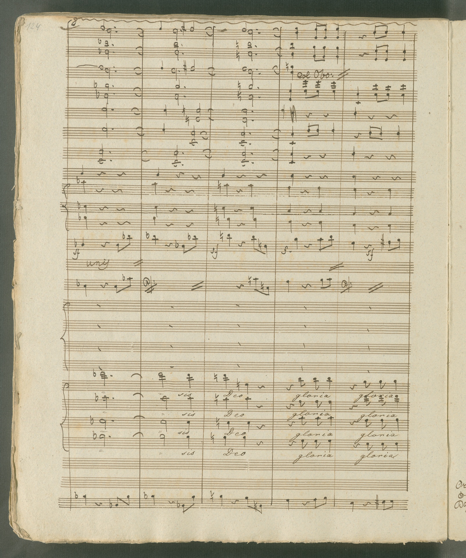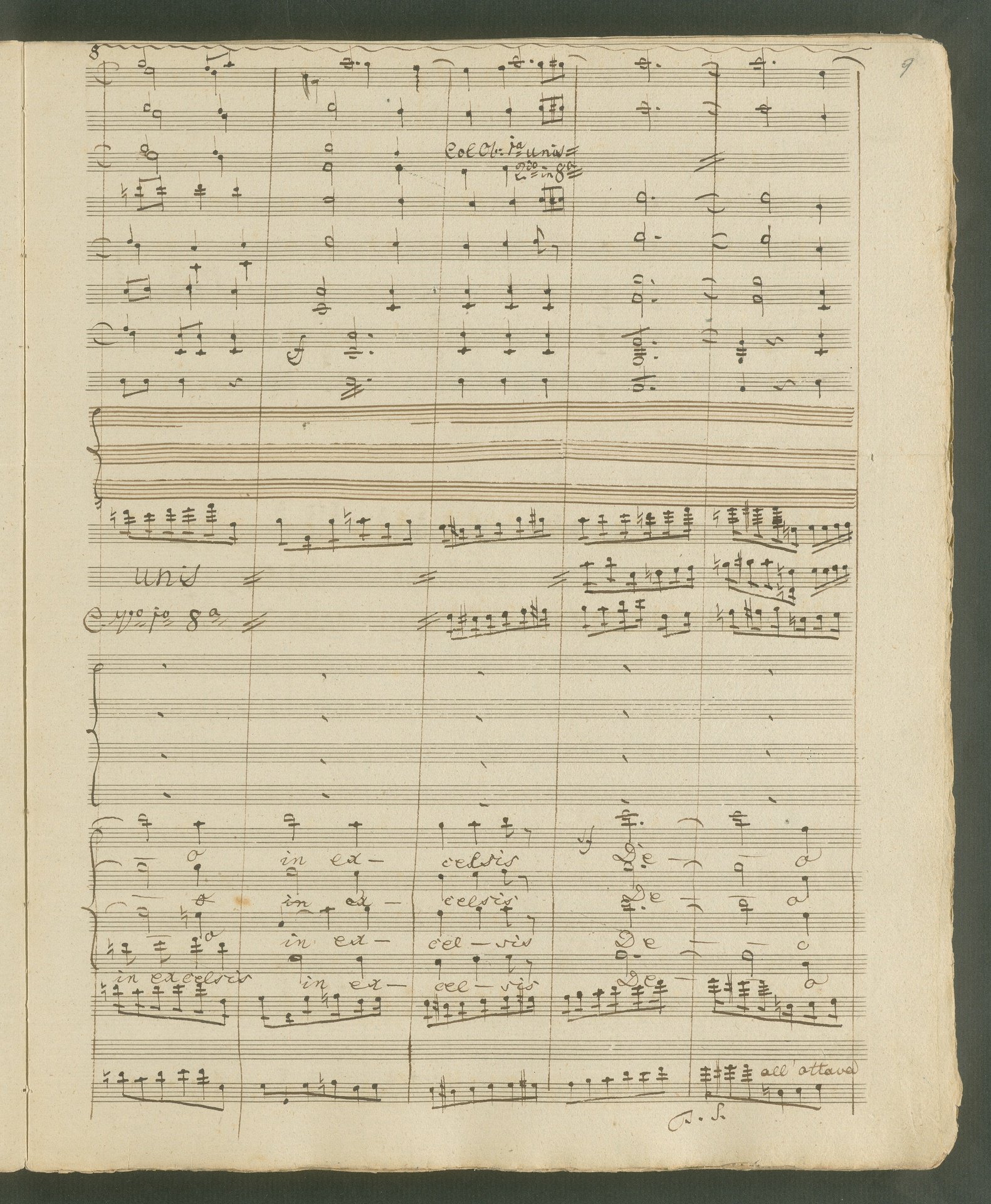 Diese überprüfte Abschrift der ersten beiden Sätze Kyrie und Gloria aus der Missa Solemnis entstand in der zweiten Jahreshälfte 1823. Beethoven schickte die Teilabschrift am 9. April 1825 zu seinem ehemaligen Schüler Ferdinand Ries nach Bonn. Die Messe sollte beim Niederrheinischen Musikfest des gleichen Jahres in Aachen aufgeführt werden, für das sich Ries sehr engagierte. "Kyrie u. gloria zwei der vorzüglichst. Stük sind ebenfalls schon (...) auf dem wege für sie" (BGA 1957. Beethoven an Ferdinand Ries in Bonn, Wien, 9. April 1825), schrieb Beethoven im zugehörigen Begleitbrief an Ries. Allerdings wurde die Messe schließlich doch nicht ins Programm genommen: Die Sendung traf zu spät bei Ries ein als dass sie noch hätte vernünftig geprobt werden können. (J.R.)