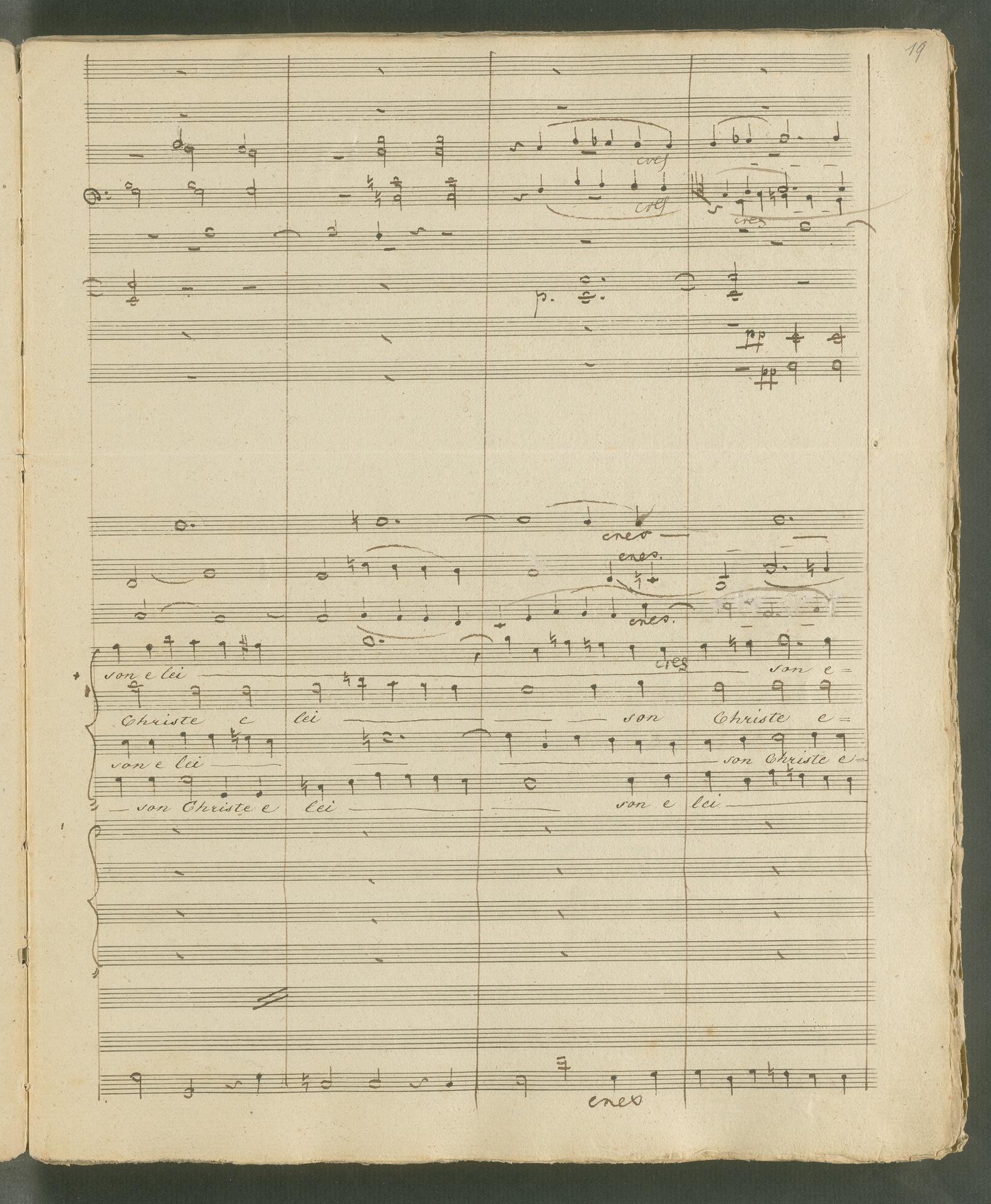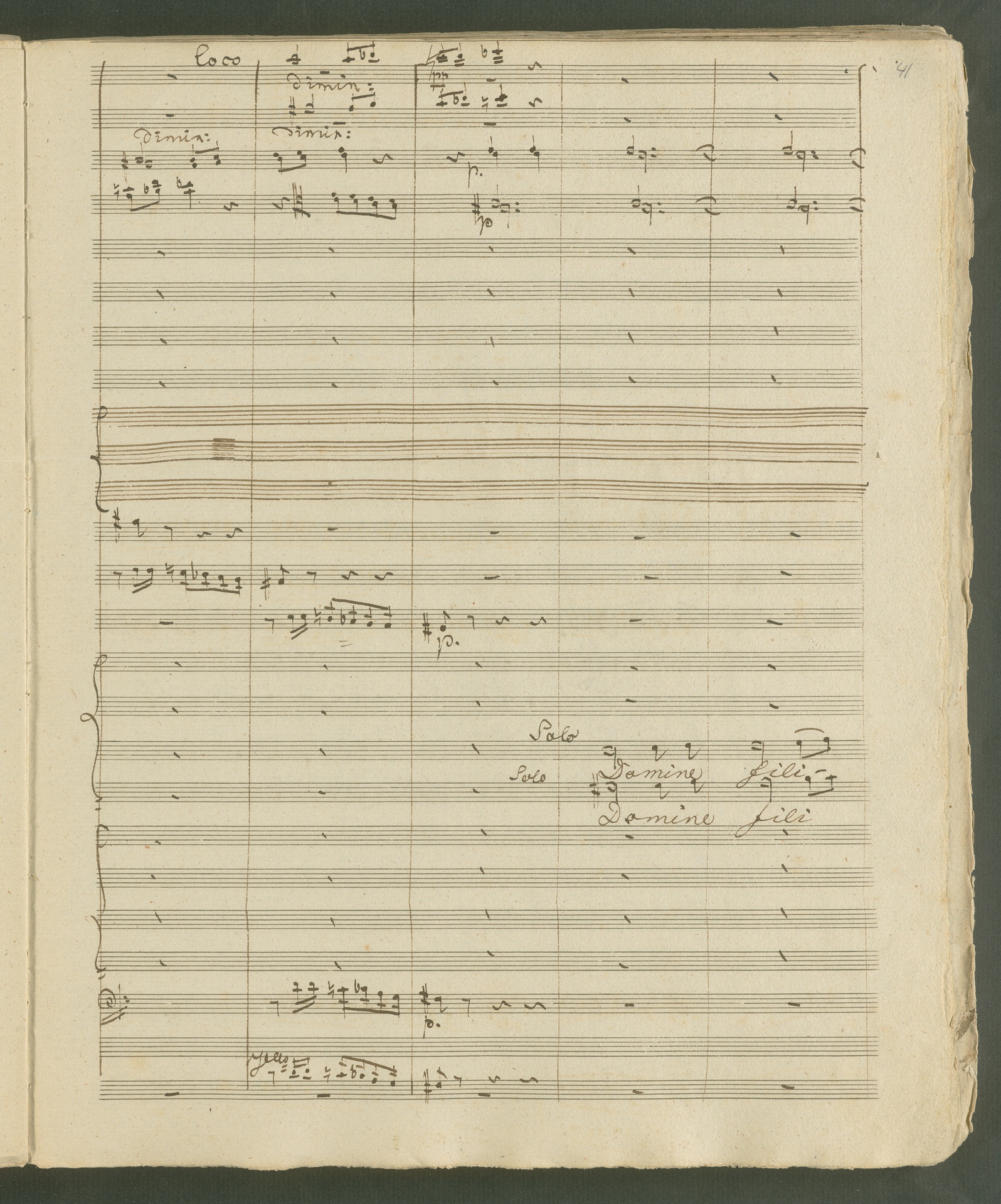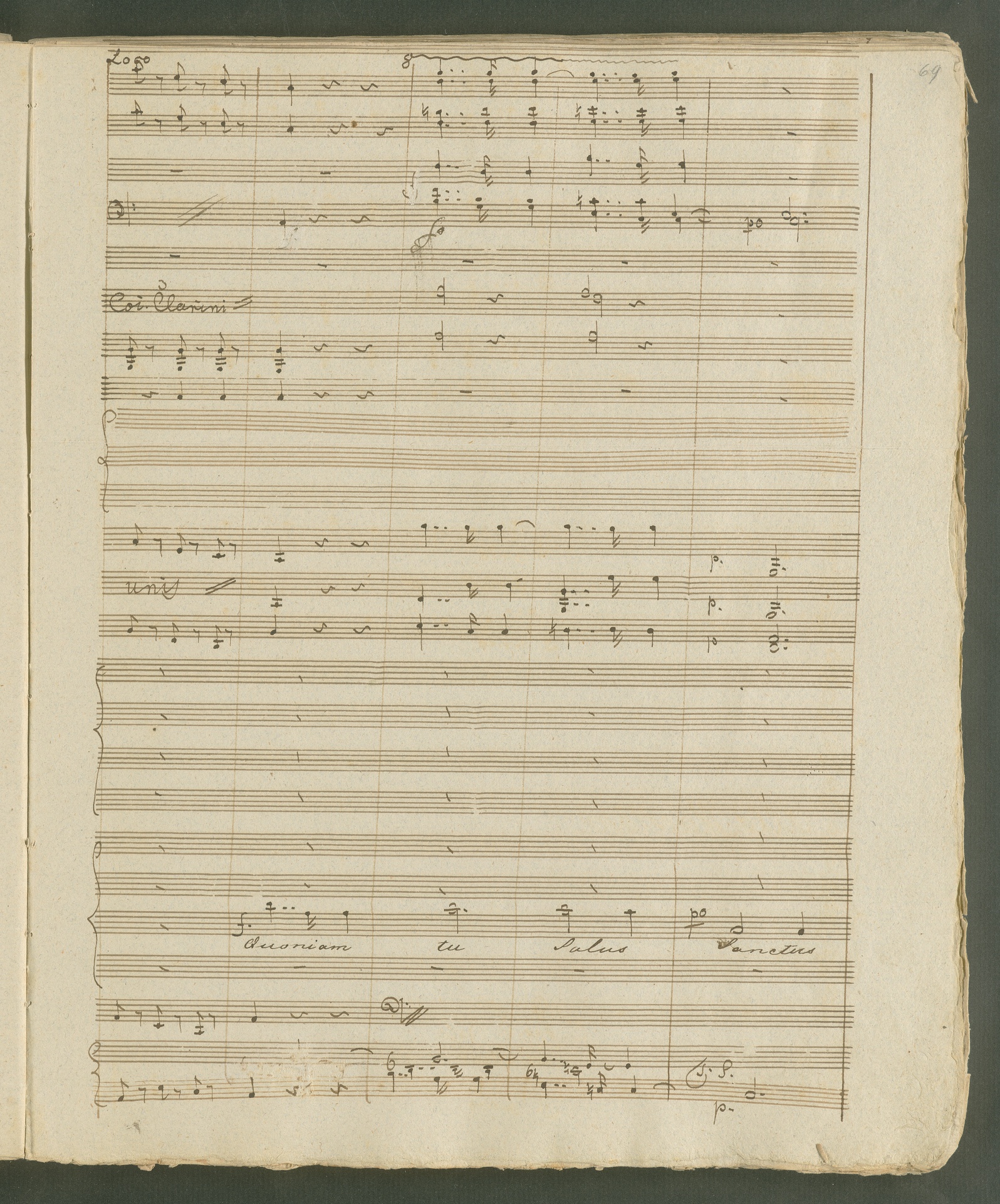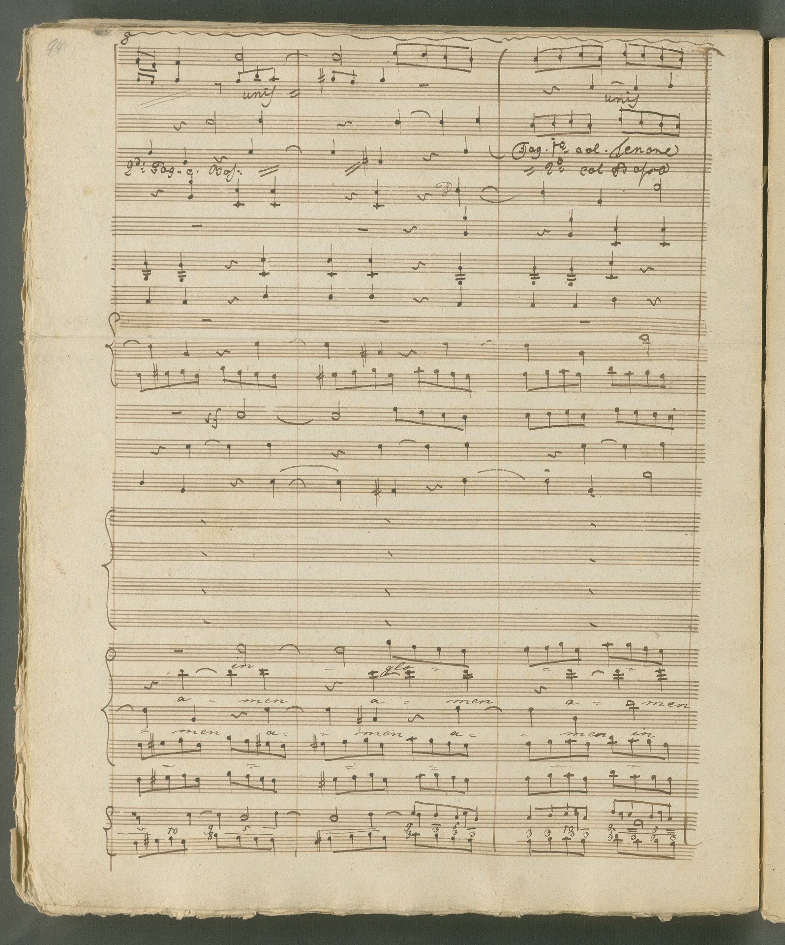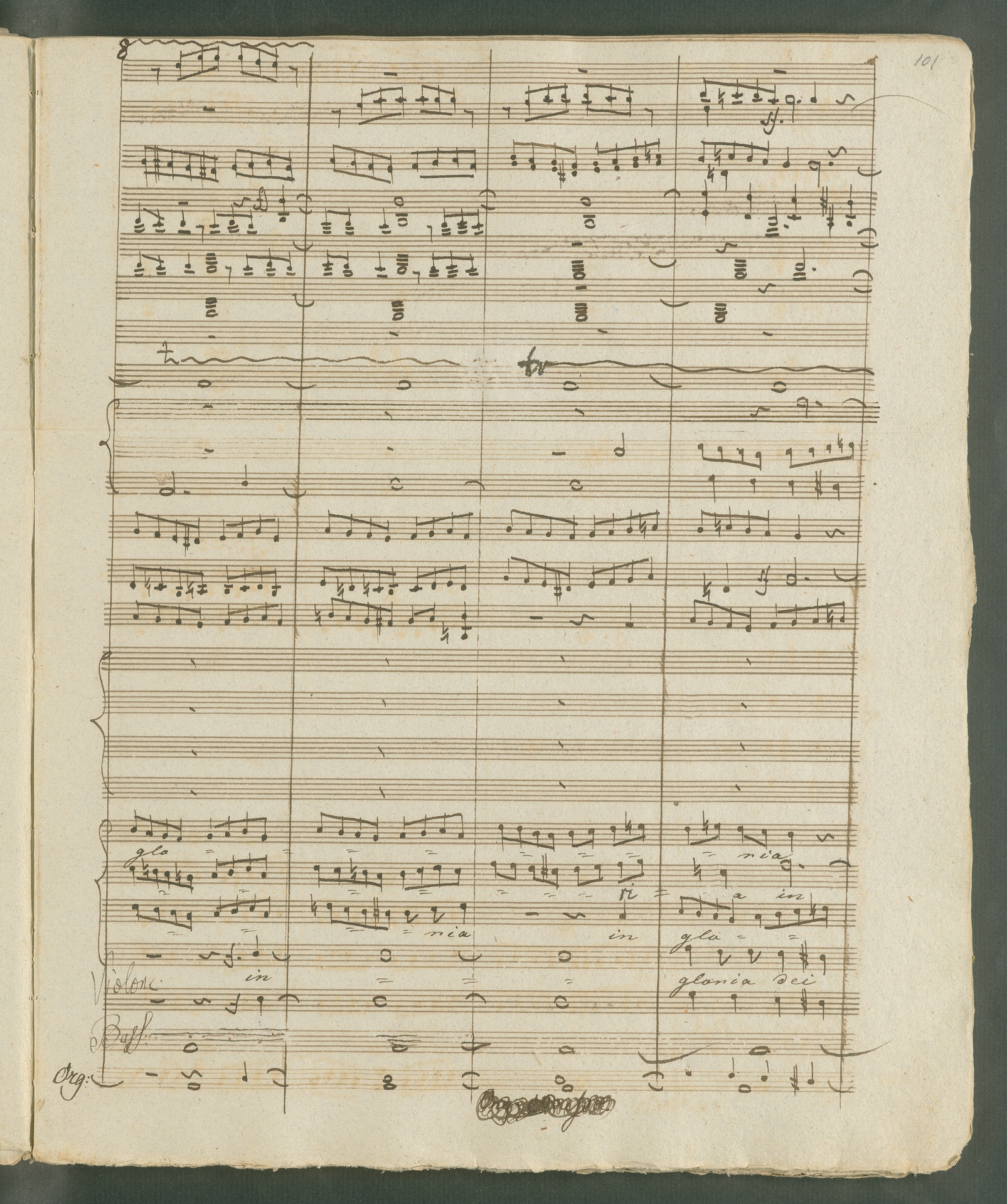 Diese überprüfte Abschrift der ersten beiden Sätze Kyrie und Gloria aus der Missa Solemnis entstand in der zweiten Jahreshälfte 1823. Beethoven schickte die Teilabschrift am 9. April 1825 zu seinem ehemaligen Schüler Ferdinand Ries nach Bonn. Die Messe sollte beim Niederrheinischen Musikfest des gleichen Jahres in Aachen aufgeführt werden, für das sich Ries sehr engagierte. "Kyrie u. gloria zwei der vorzüglichst. Stük sind ebenfalls schon (...) auf dem wege für sie" (BGA 1957. Beethoven an Ferdinand Ries in Bonn, Wien, 9. April 1825), schrieb Beethoven im zugehörigen Begleitbrief an Ries. Allerdings wurde die Messe schließlich doch nicht ins Programm genommen: Die Sendung traf zu spät bei Ries ein als dass sie noch hätte vernünftig geprobt werden können. (J.R.)