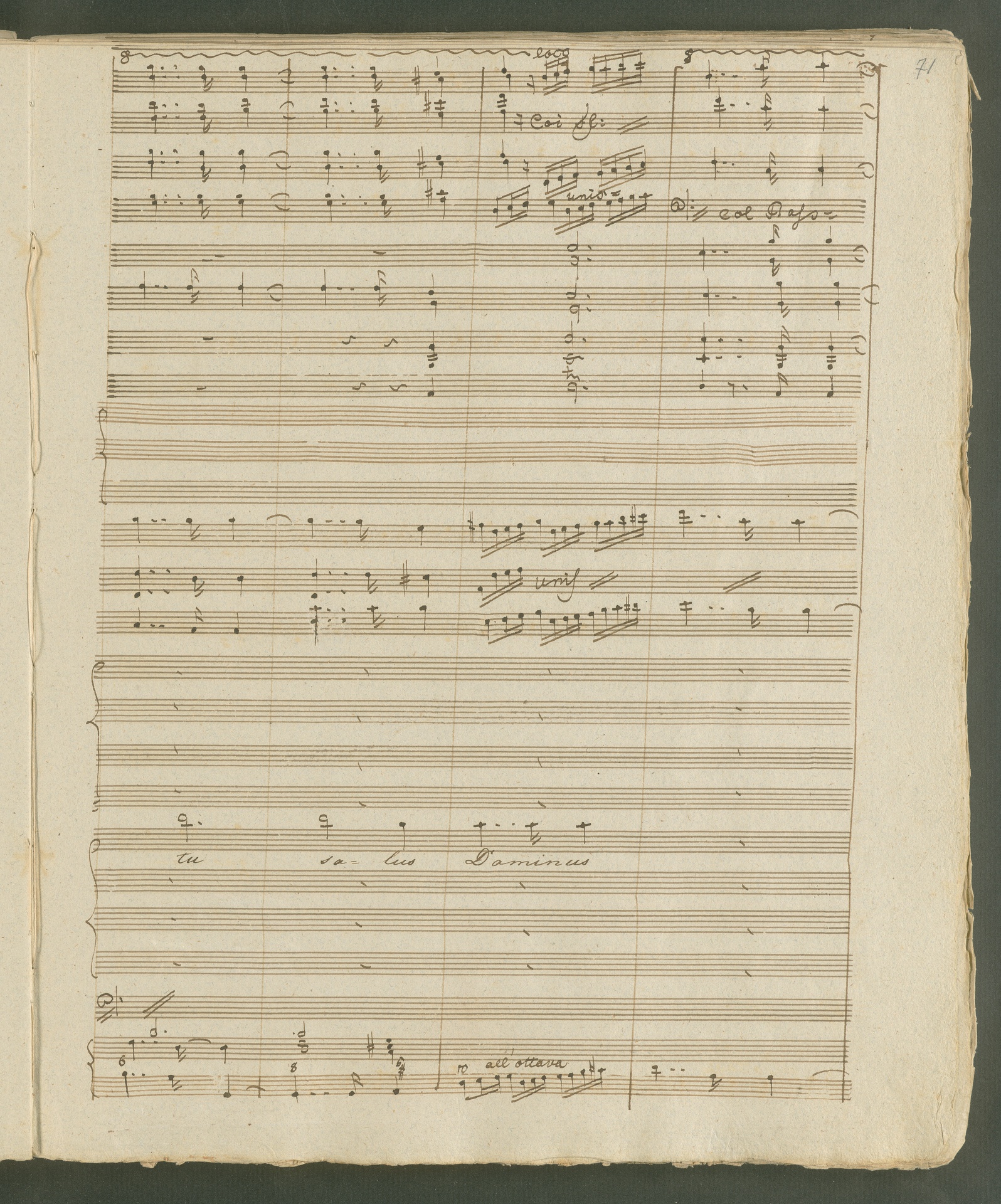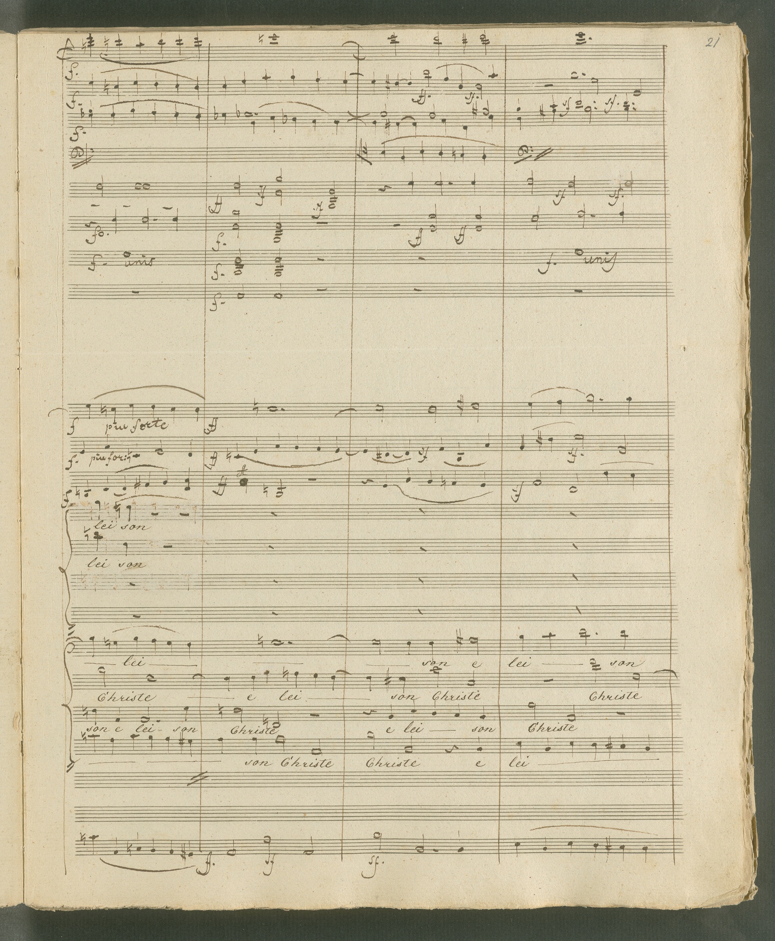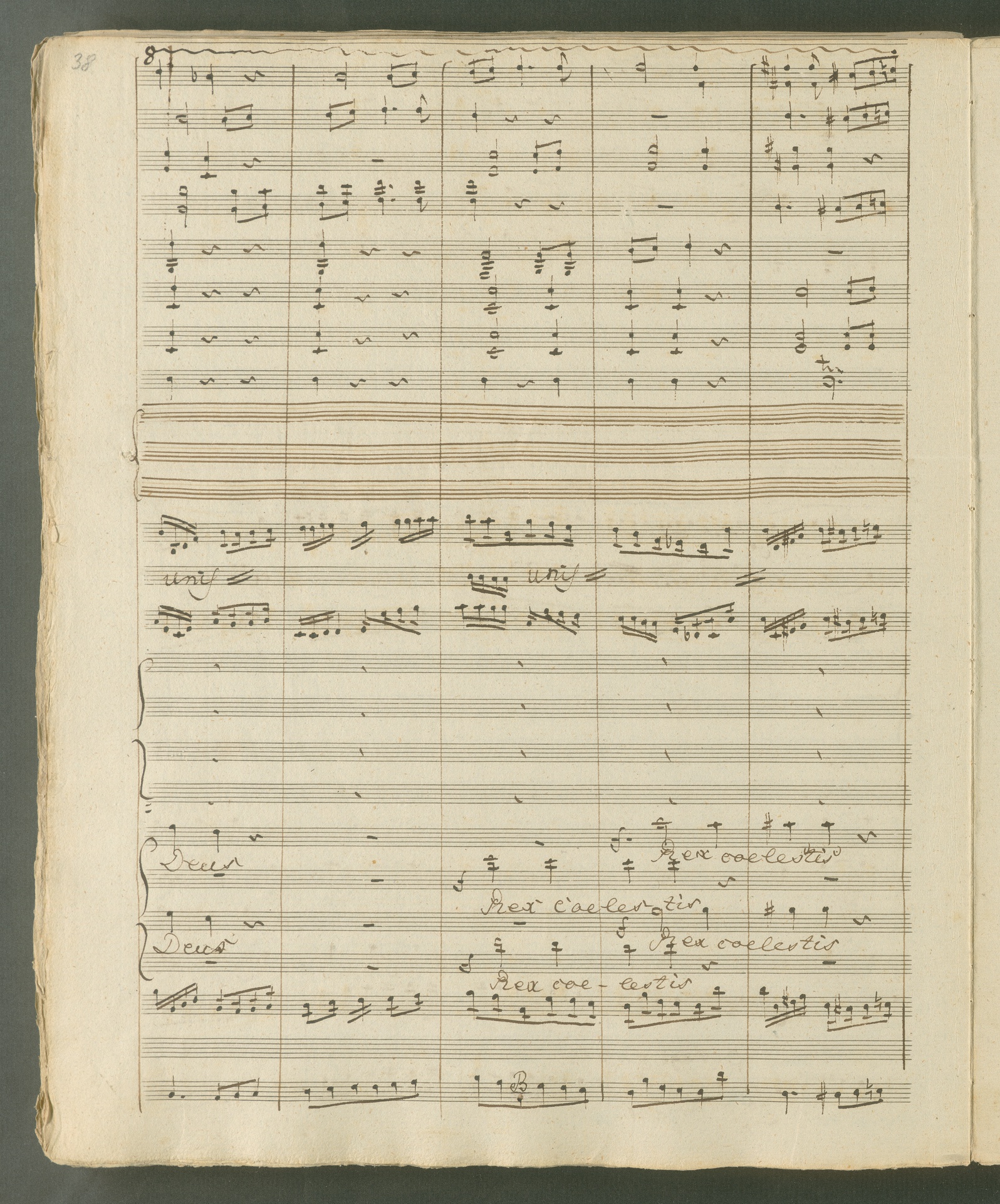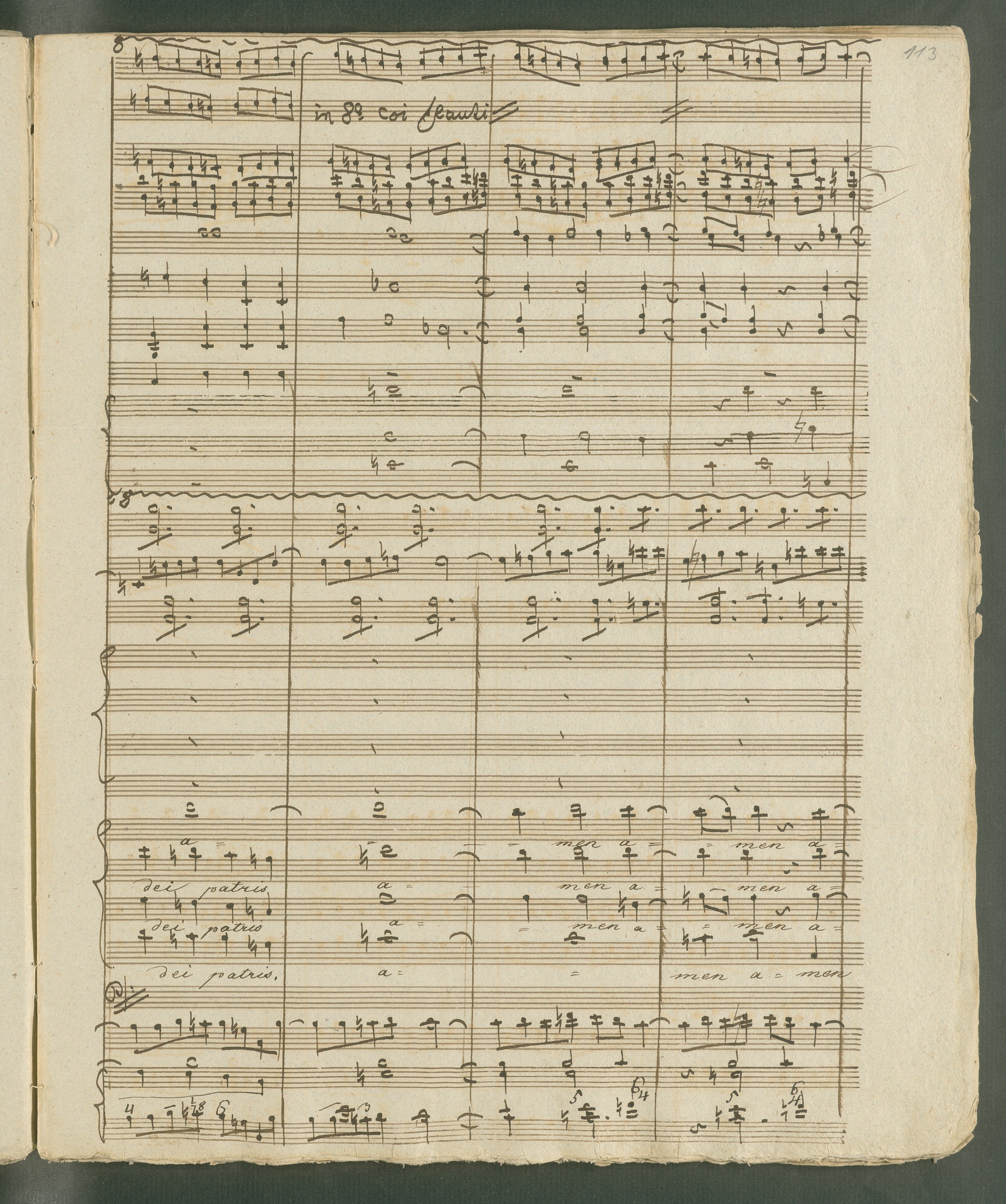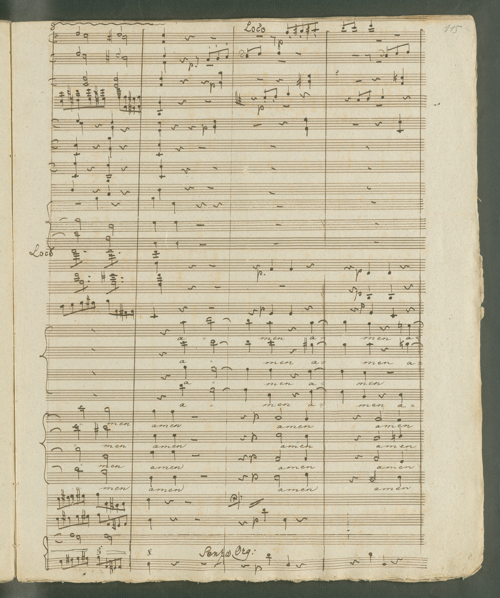 Diese überprüfte Abschrift der ersten beiden Sätze Kyrie und Gloria aus der Missa Solemnis entstand in der zweiten Jahreshälfte 1823. Beethoven schickte die Teilabschrift am 9. April 1825 zu seinem ehemaligen Schüler Ferdinand Ries nach Bonn. Die Messe sollte beim Niederrheinischen Musikfest des gleichen Jahres in Aachen aufgeführt werden, für das sich Ries sehr engagierte. "Kyrie u. gloria zwei der vorzüglichst. Stük sind ebenfalls schon (...) auf dem wege für sie" (BGA 1957. Beethoven an Ferdinand Ries in Bonn, Wien, 9. April 1825), schrieb Beethoven im zugehörigen Begleitbrief an Ries. Allerdings wurde die Messe schließlich doch nicht ins Programm genommen: Die Sendung traf zu spät bei Ries ein als dass sie noch hätte vernünftig geprobt werden können. (J.R.)