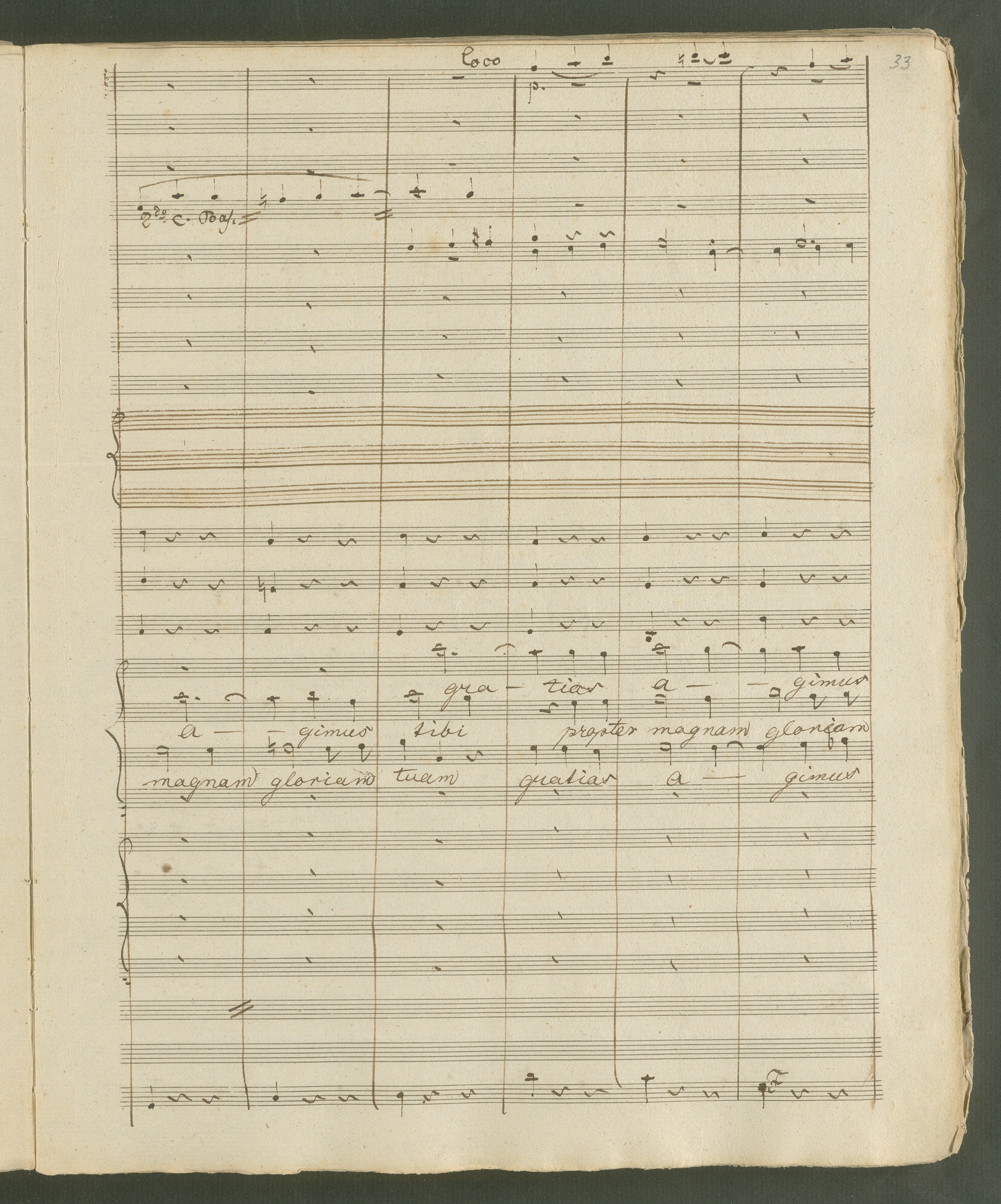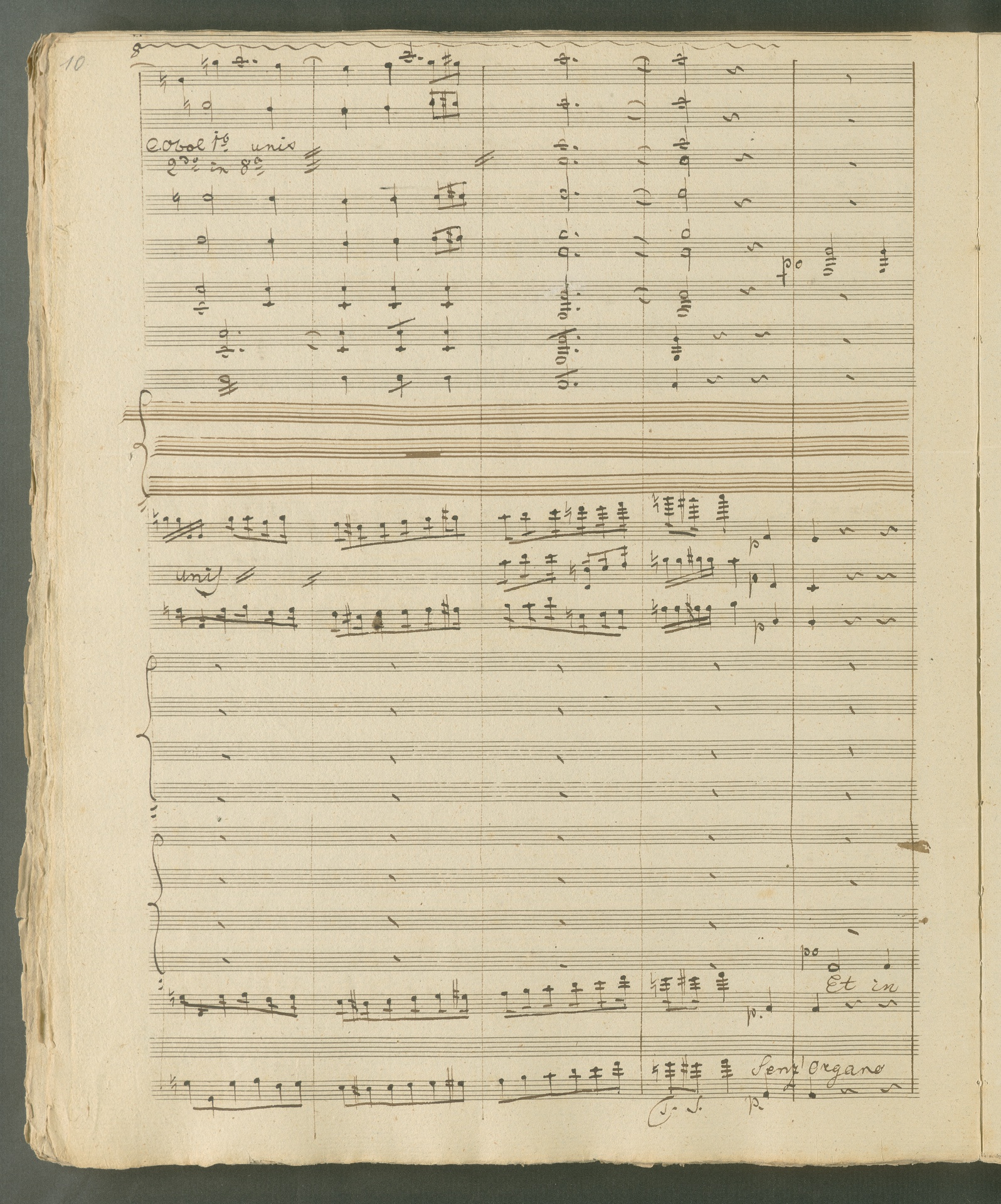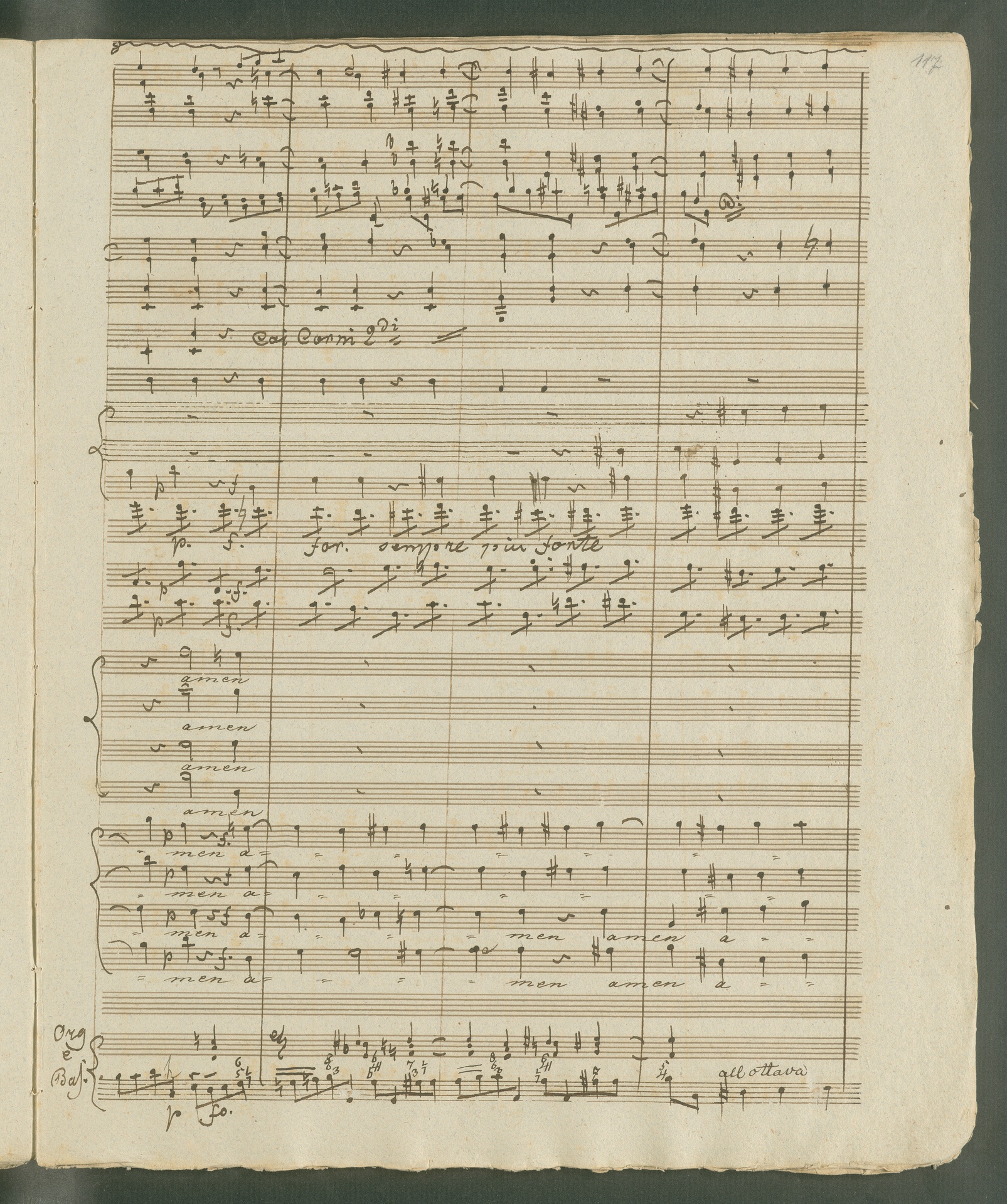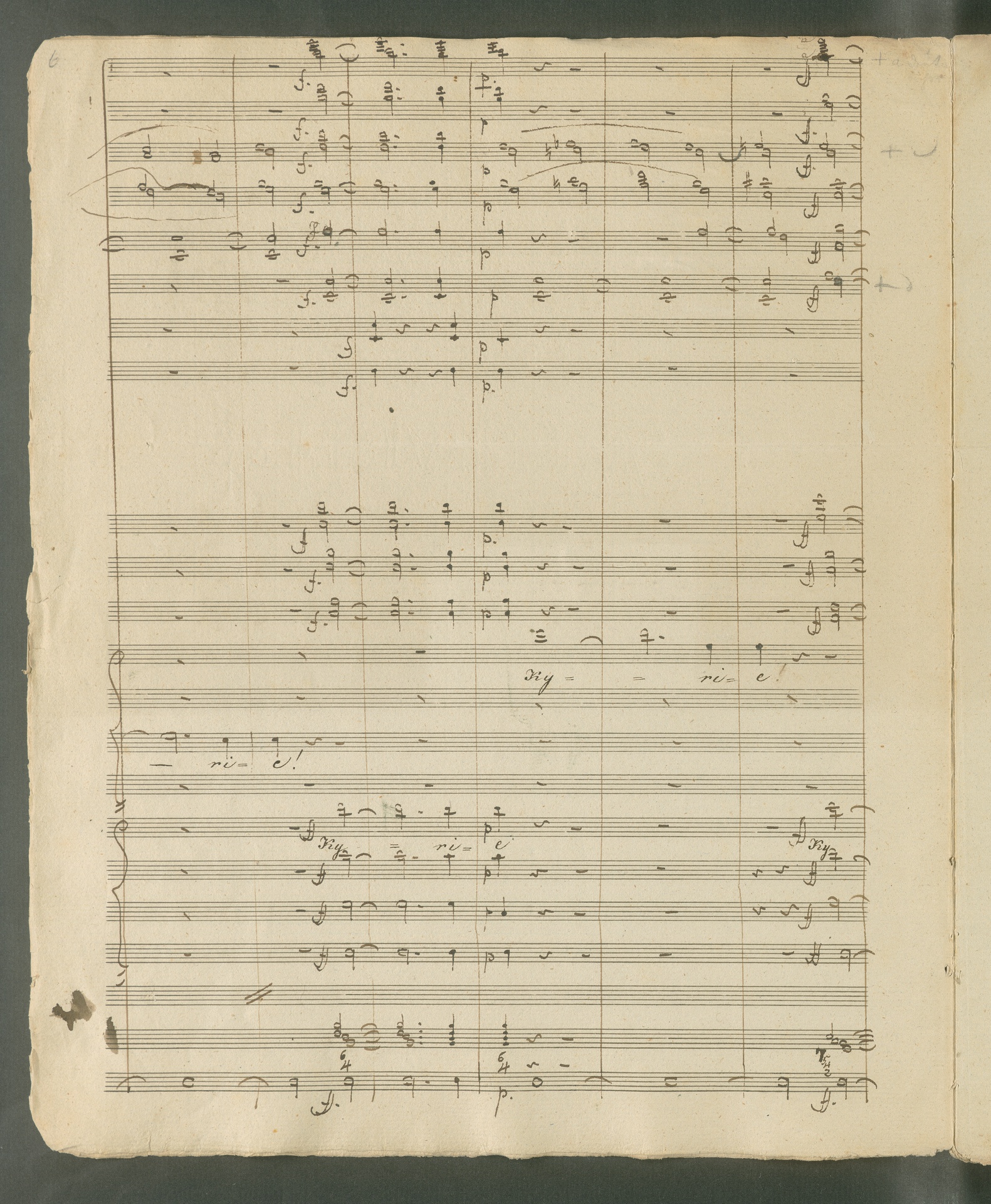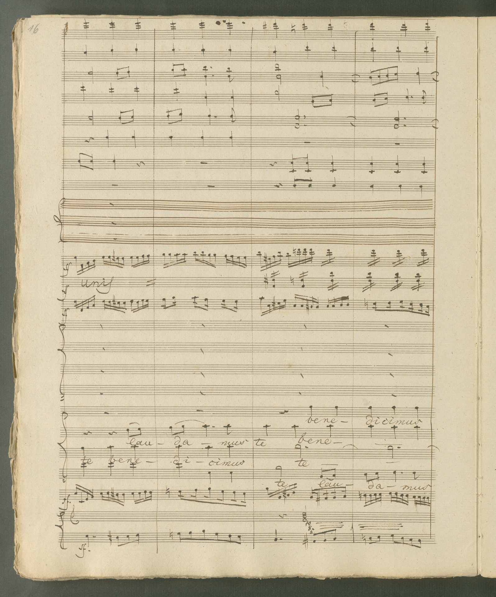 Diese überprüfte Abschrift der ersten beiden Sätze Kyrie und Gloria aus der Missa Solemnis entstand in der zweiten Jahreshälfte 1823. Beethoven schickte die Teilabschrift am 9. April 1825 zu seinem ehemaligen Schüler Ferdinand Ries nach Bonn. Die Messe sollte beim Niederrheinischen Musikfest des gleichen Jahres in Aachen aufgeführt werden, für das sich Ries sehr engagierte. "Kyrie u. gloria zwei der vorzüglichst. Stük sind ebenfalls schon (...) auf dem wege für sie" (BGA 1957. Beethoven an Ferdinand Ries in Bonn, Wien, 9. April 1825), schrieb Beethoven im zugehörigen Begleitbrief an Ries. Allerdings wurde die Messe schließlich doch nicht ins Programm genommen: Die Sendung traf zu spät bei Ries ein als dass sie noch hätte vernünftig geprobt werden können. (J.R.)