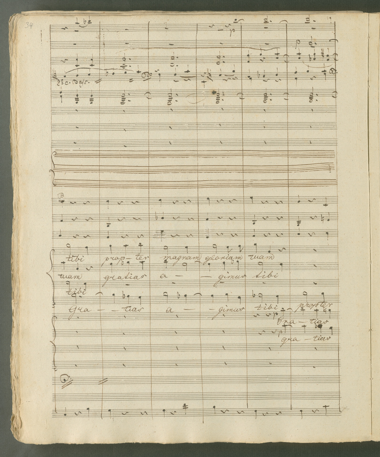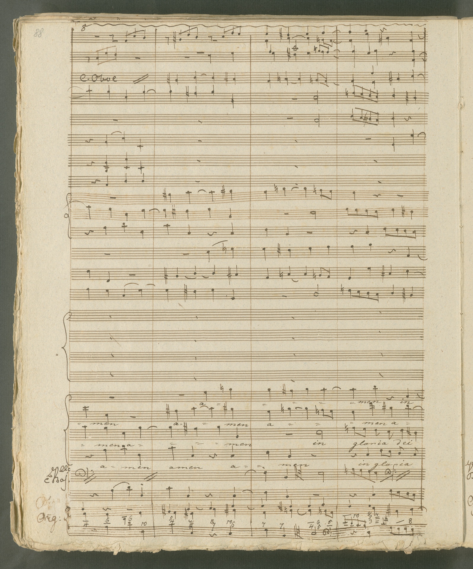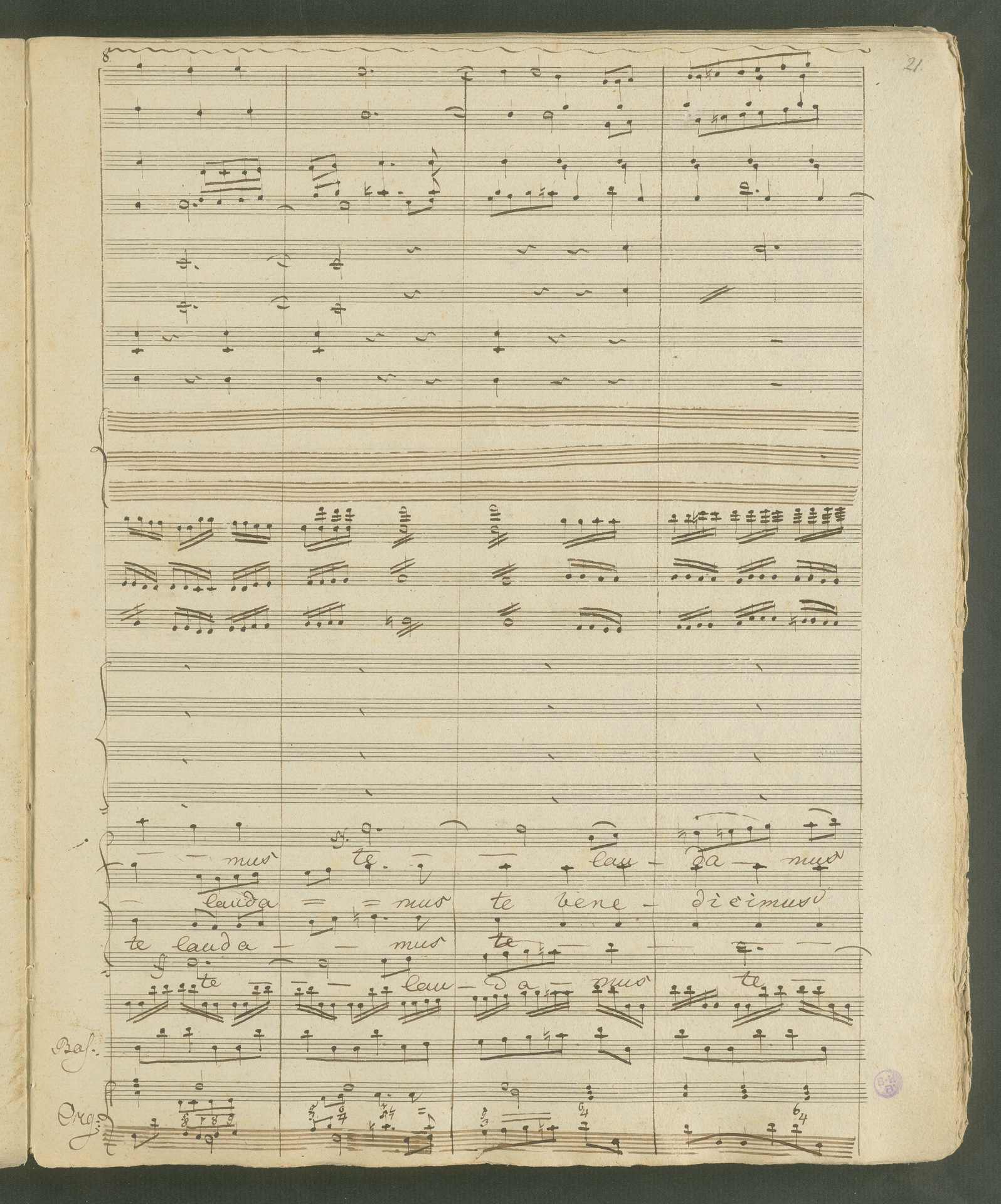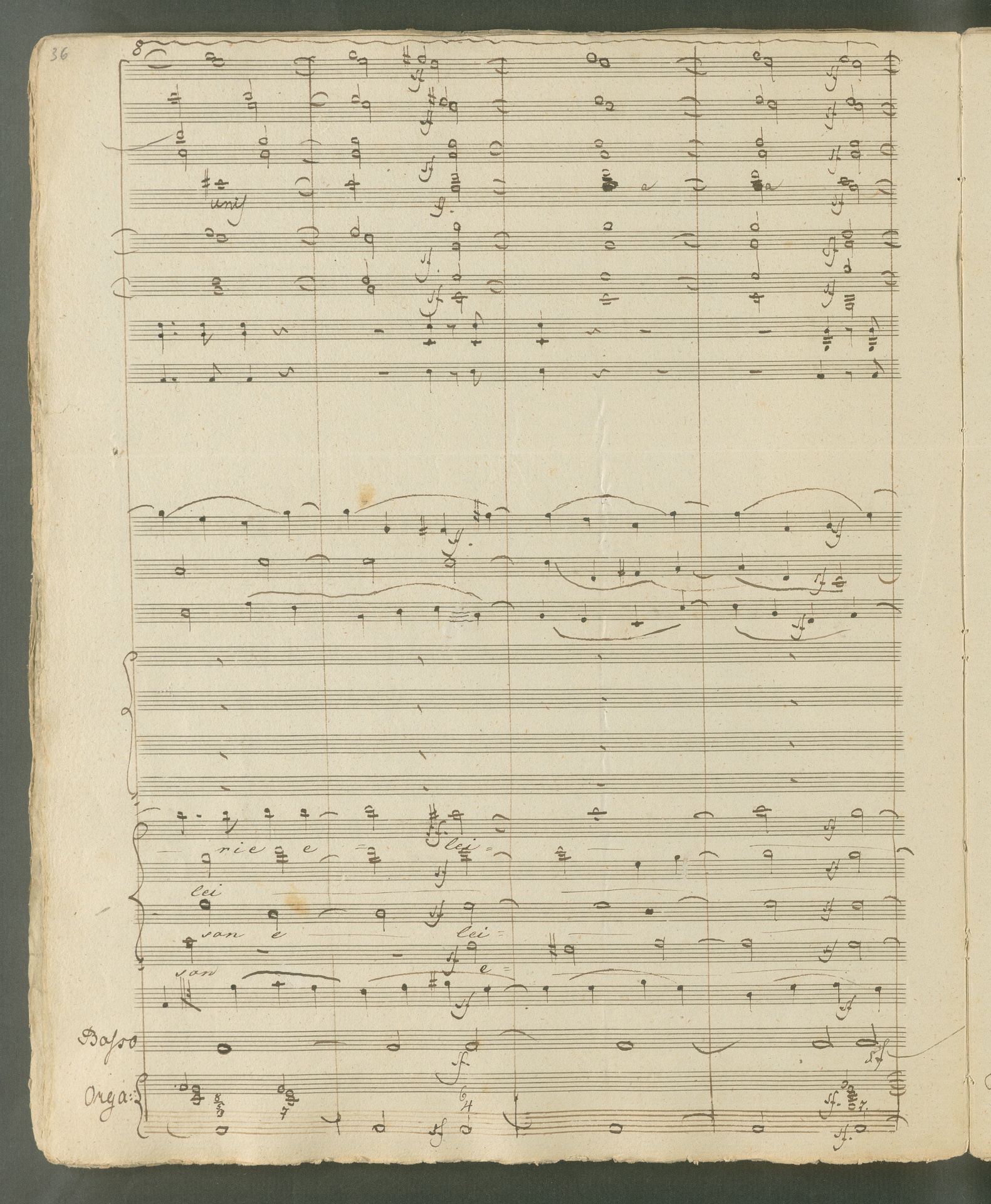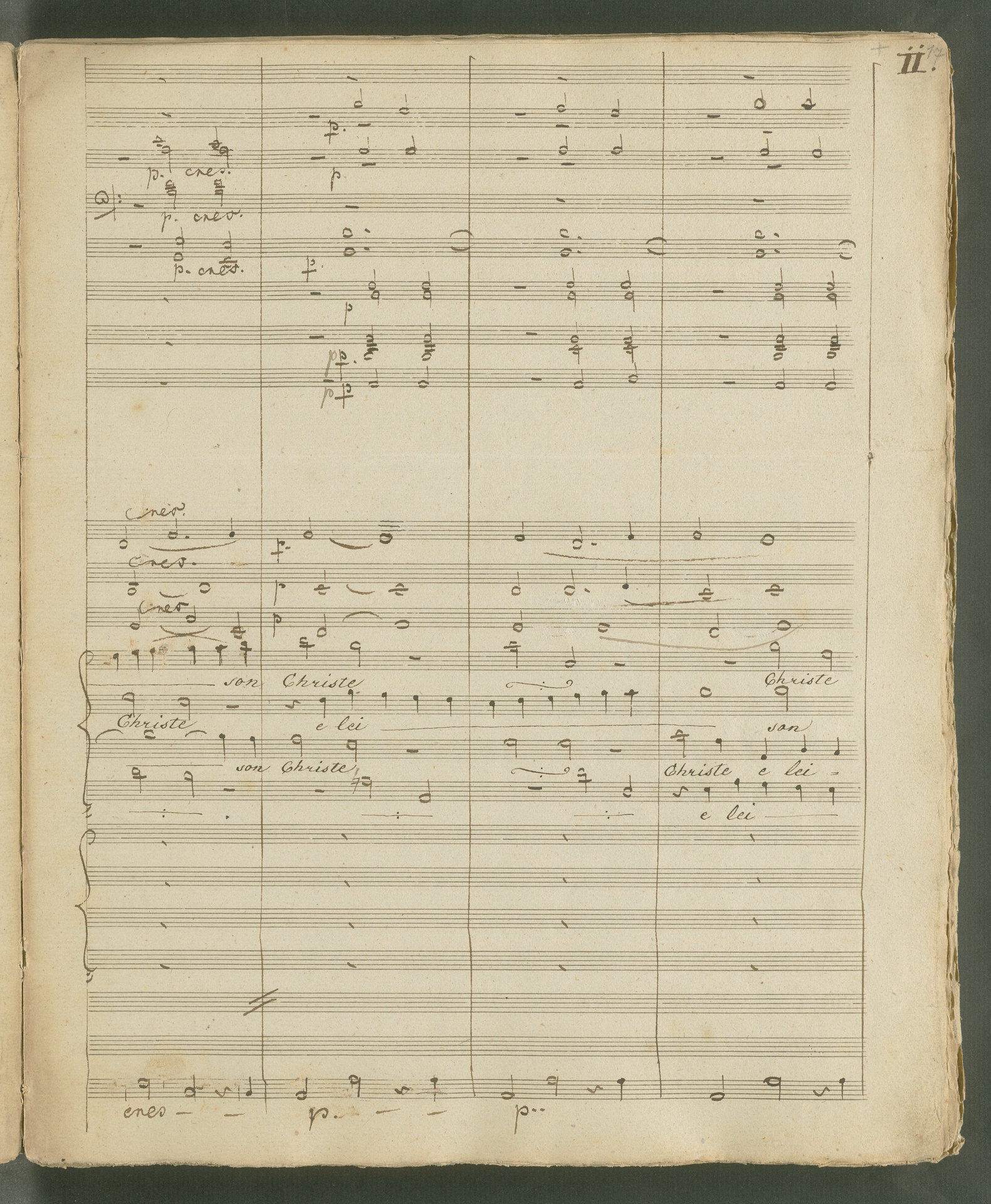 Diese überprüfte Abschrift der ersten beiden Sätze Kyrie und Gloria aus der Missa Solemnis entstand in der zweiten Jahreshälfte 1823. Beethoven schickte die Teilabschrift am 9. April 1825 zu seinem ehemaligen Schüler Ferdinand Ries nach Bonn. Die Messe sollte beim Niederrheinischen Musikfest des gleichen Jahres in Aachen aufgeführt werden, für das sich Ries sehr engagierte. "Kyrie u. gloria zwei der vorzüglichst. Stük sind ebenfalls schon (...) auf dem wege für sie" (BGA 1957. Beethoven an Ferdinand Ries in Bonn, Wien, 9. April 1825), schrieb Beethoven im zugehörigen Begleitbrief an Ries. Allerdings wurde die Messe schließlich doch nicht ins Programm genommen: Die Sendung traf zu spät bei Ries ein als dass sie noch hätte vernünftig geprobt werden können. (J.R.)