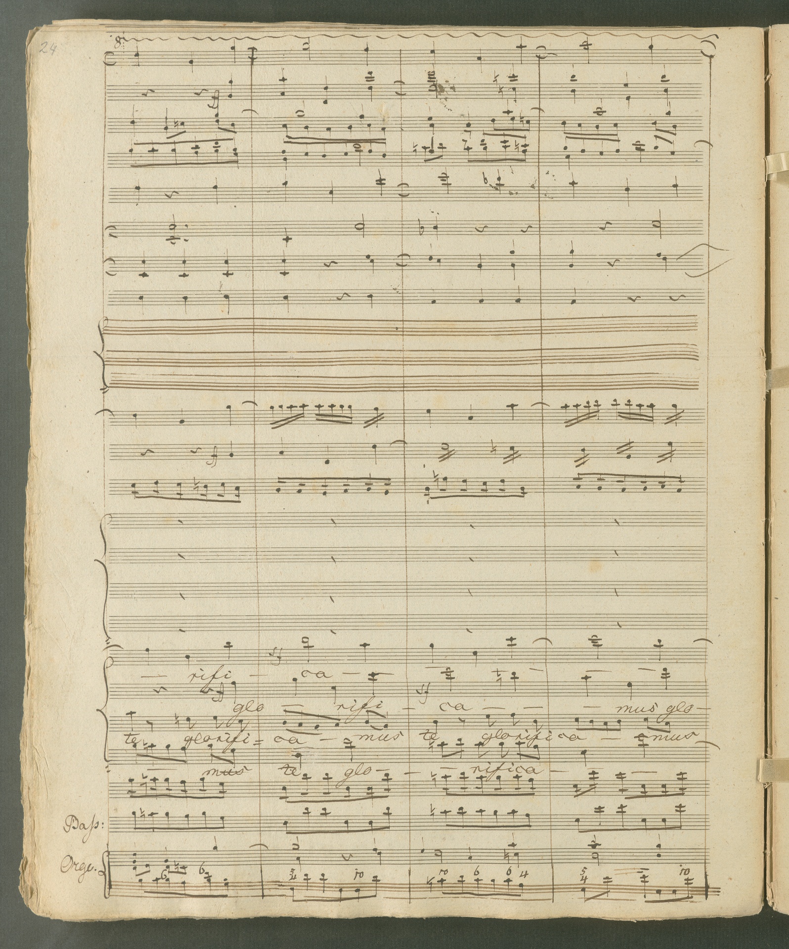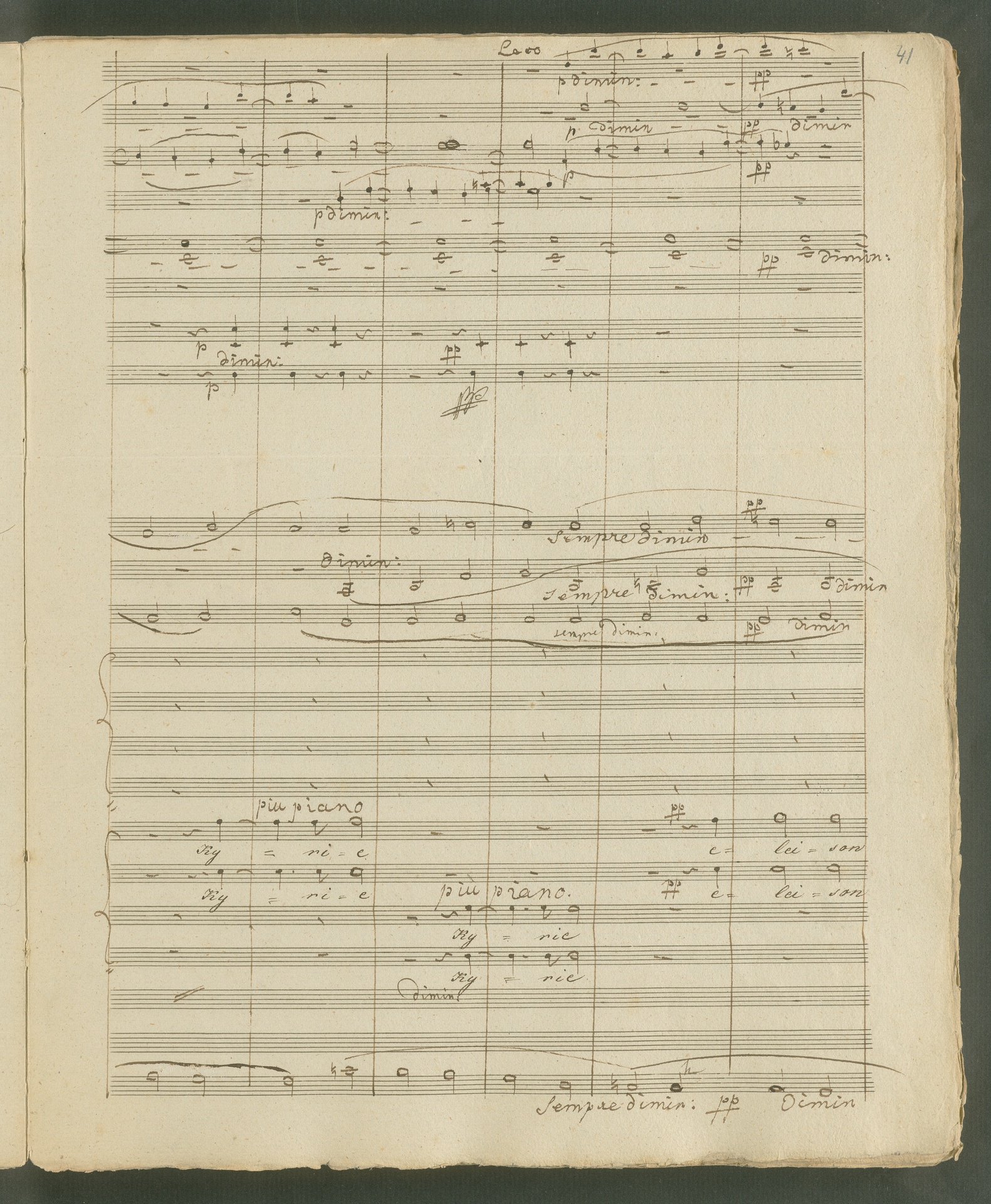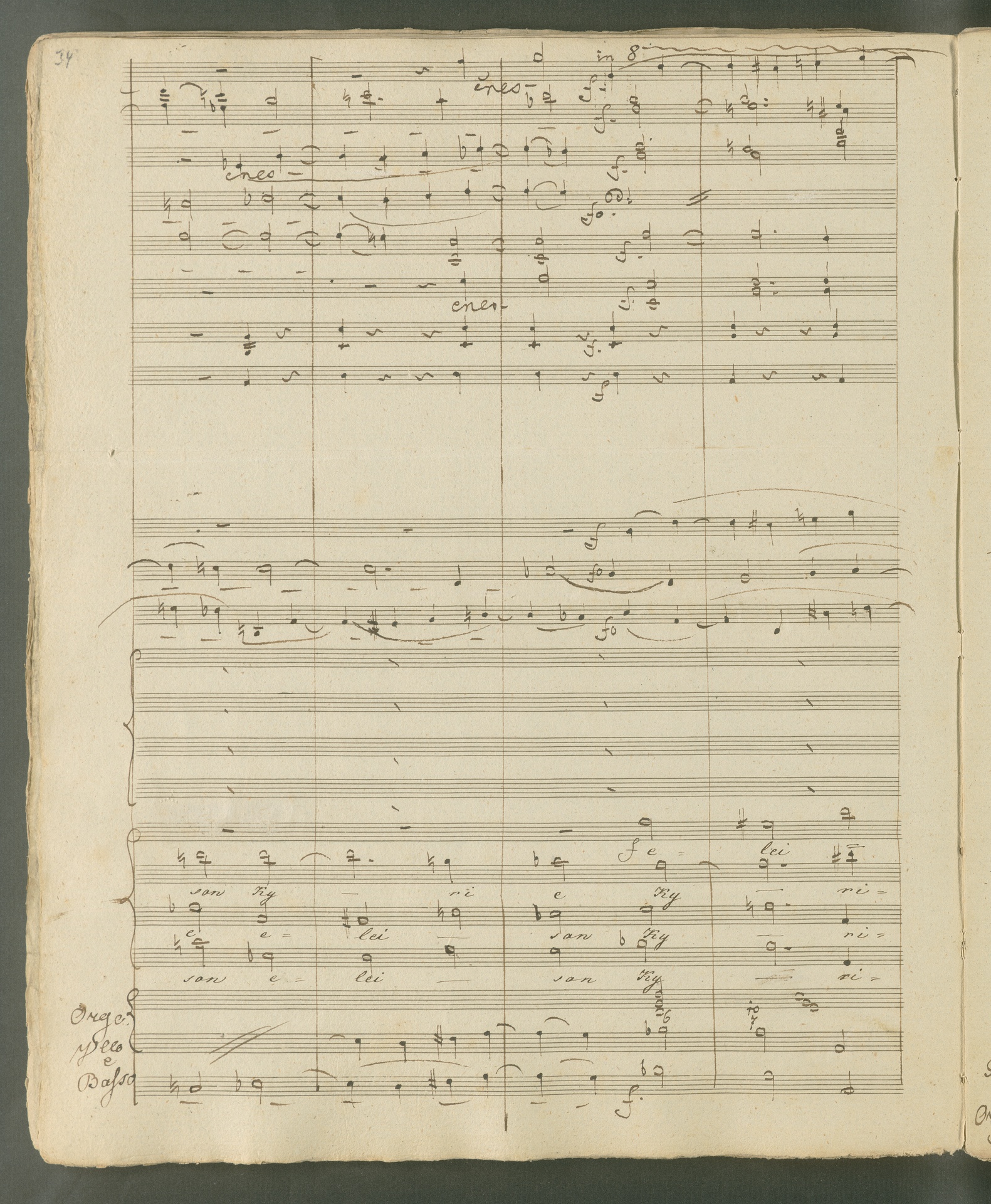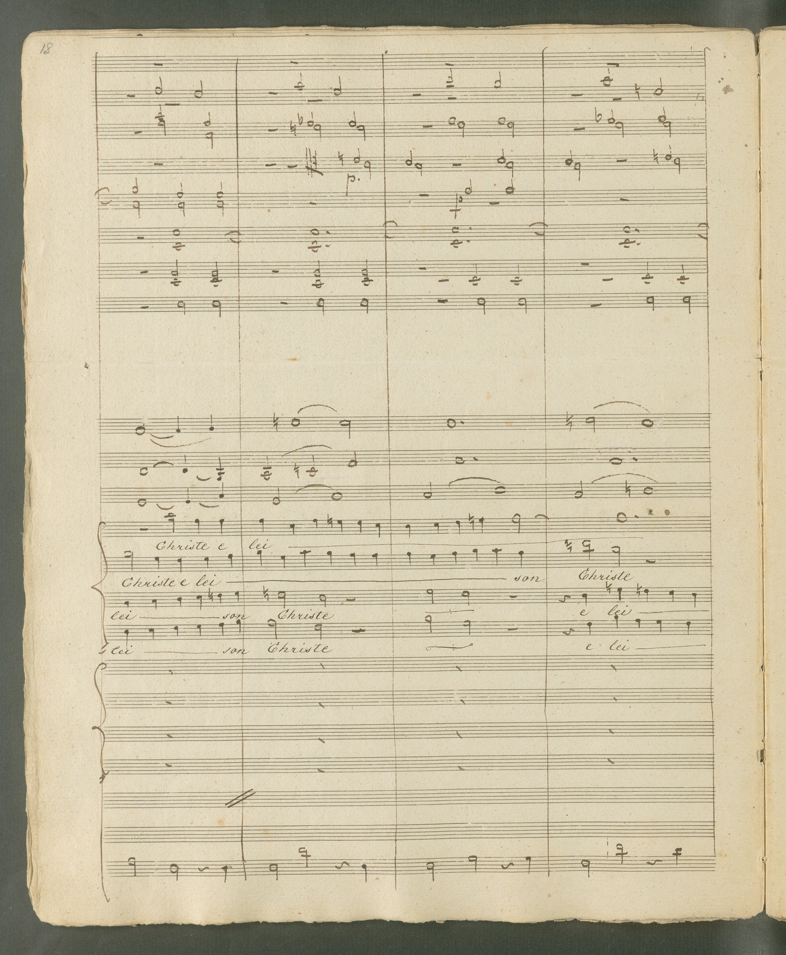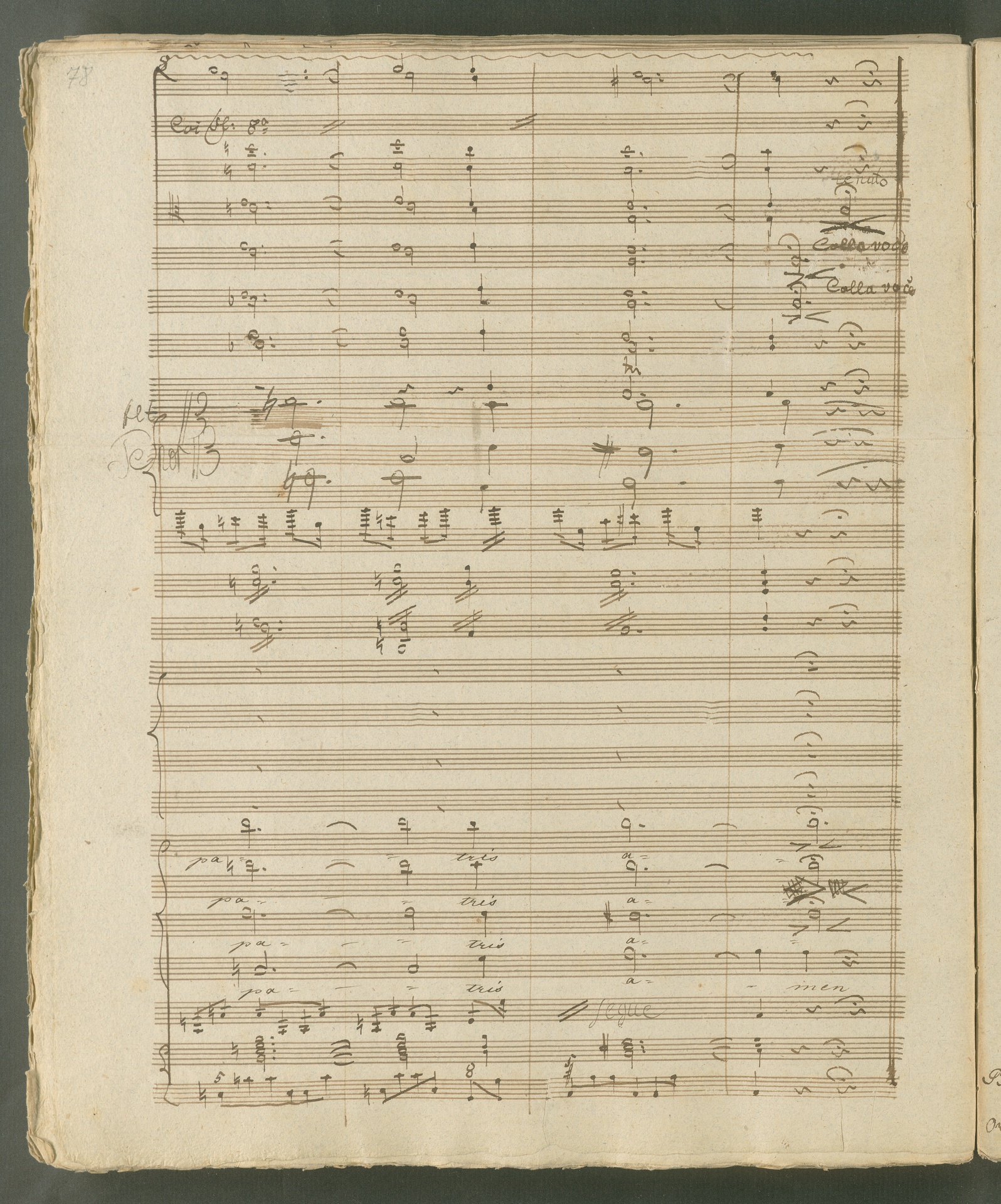 Diese überprüfte Abschrift der ersten beiden Sätze Kyrie und Gloria aus der Missa Solemnis entstand in der zweiten Jahreshälfte 1823. Beethoven schickte die Teilabschrift am 9. April 1825 zu seinem ehemaligen Schüler Ferdinand Ries nach Bonn. Die Messe sollte beim Niederrheinischen Musikfest des gleichen Jahres in Aachen aufgeführt werden, für das sich Ries sehr engagierte. "Kyrie u. gloria zwei der vorzüglichst. Stük sind ebenfalls schon (...) auf dem wege für sie" (BGA 1957. Beethoven an Ferdinand Ries in Bonn, Wien, 9. April 1825), schrieb Beethoven im zugehörigen Begleitbrief an Ries. Allerdings wurde die Messe schließlich doch nicht ins Programm genommen: Die Sendung traf zu spät bei Ries ein als dass sie noch hätte vernünftig geprobt werden können. (J.R.)