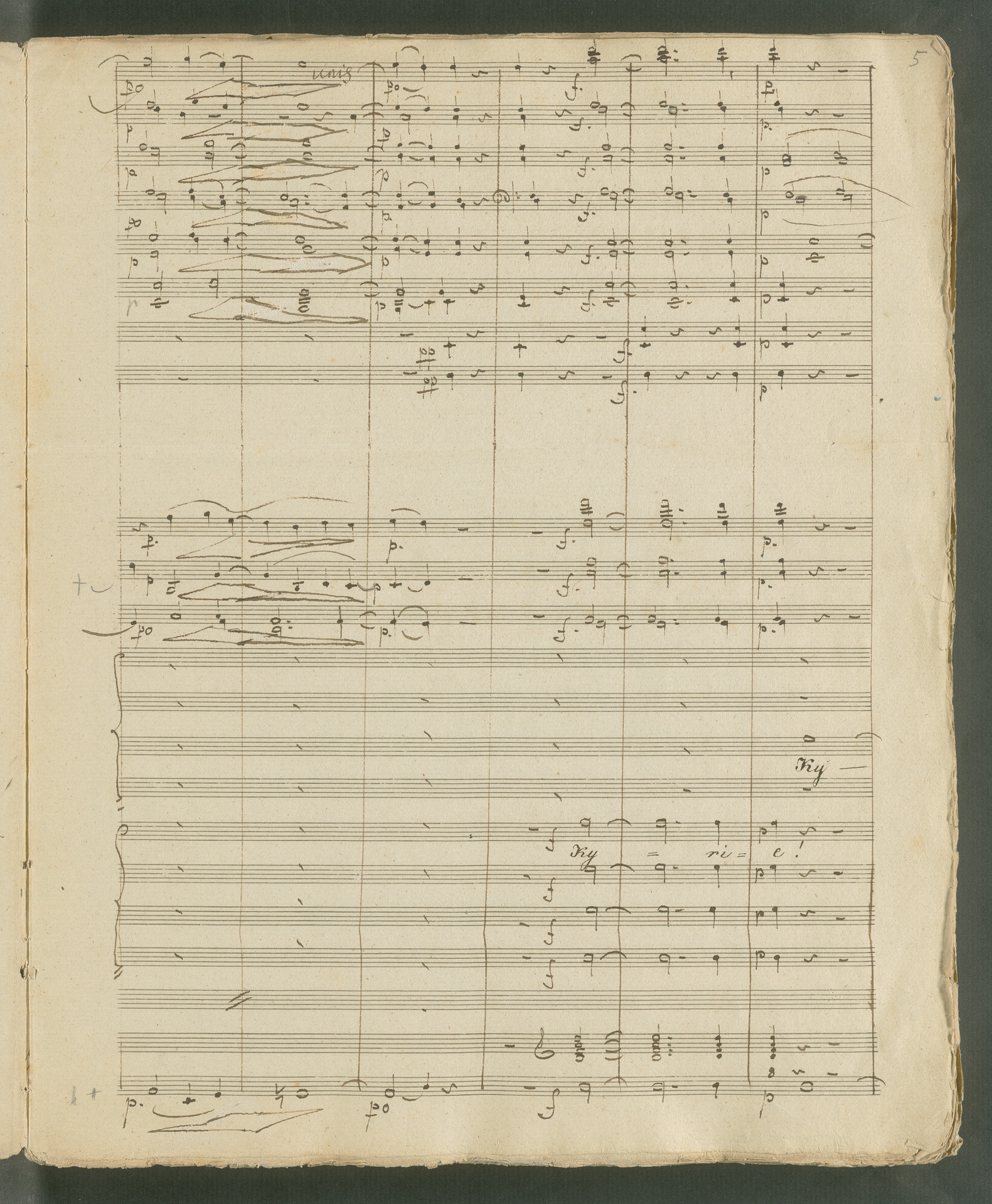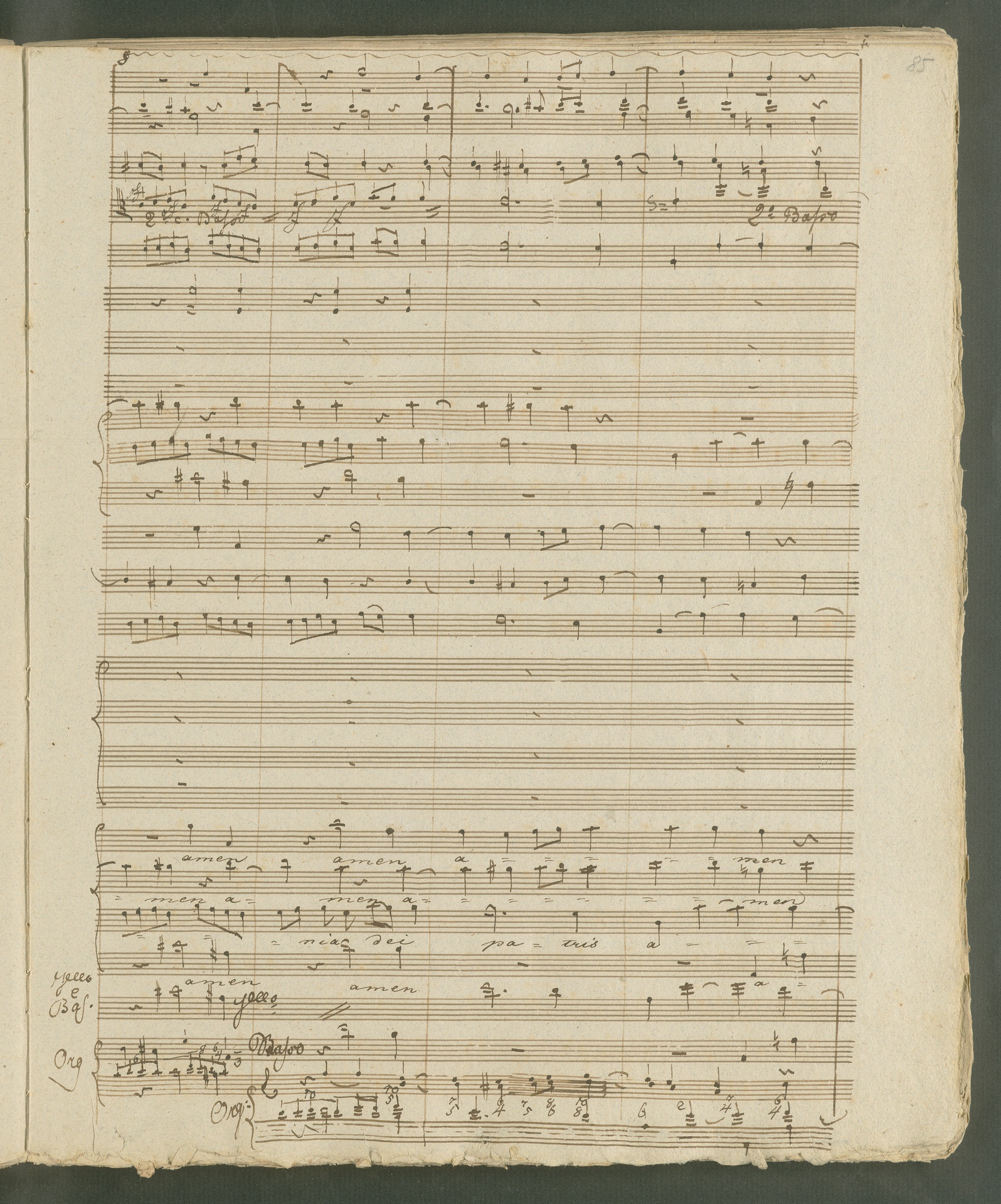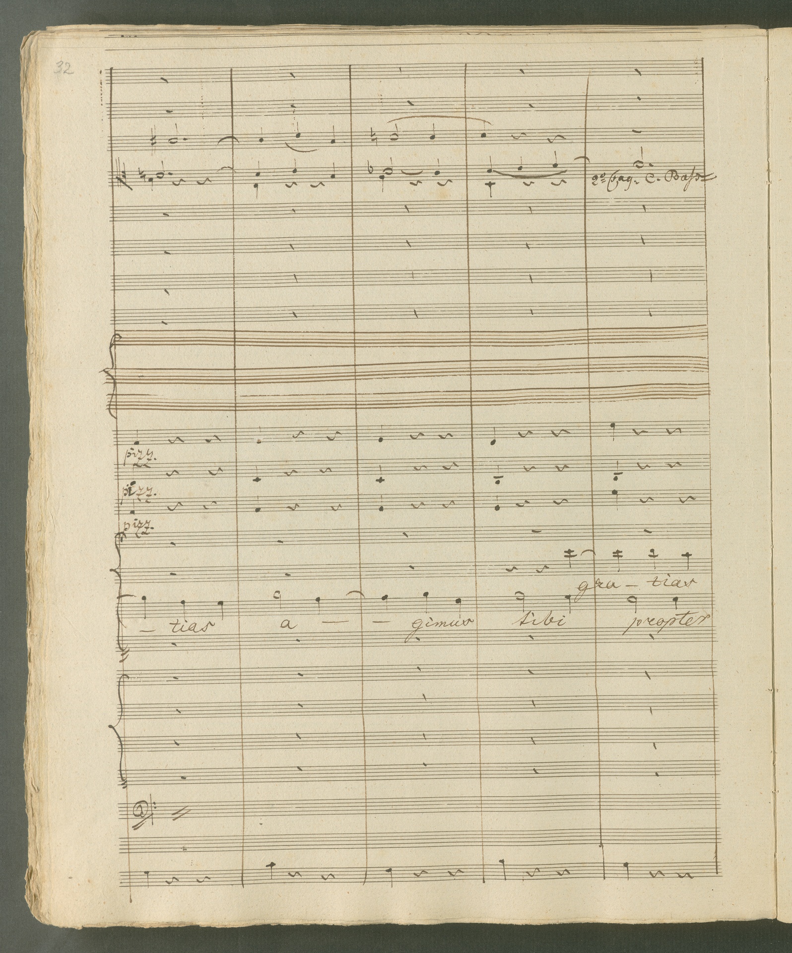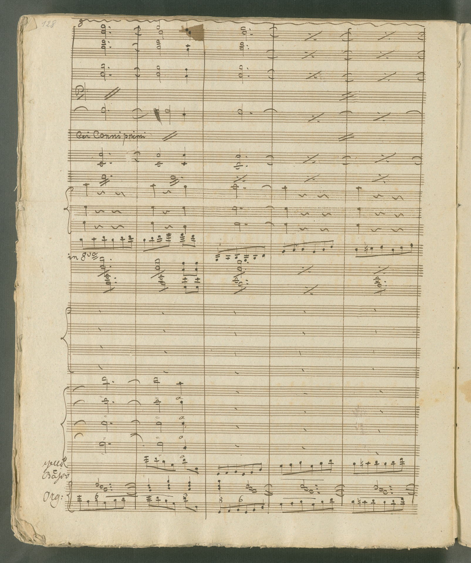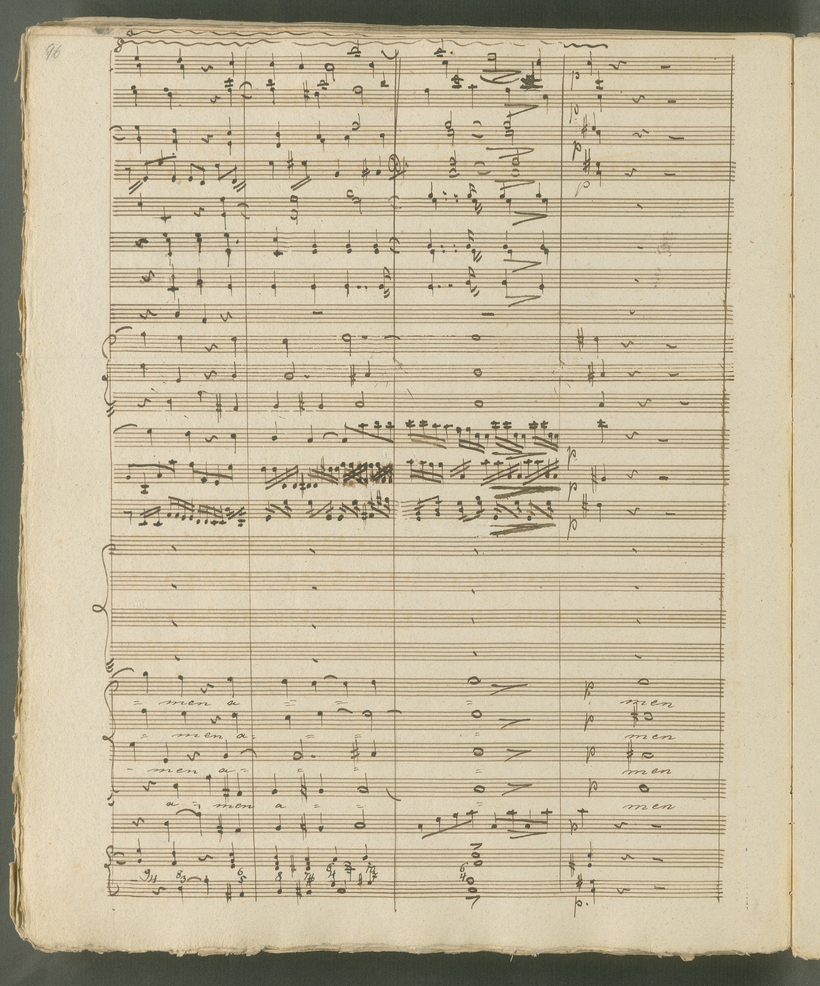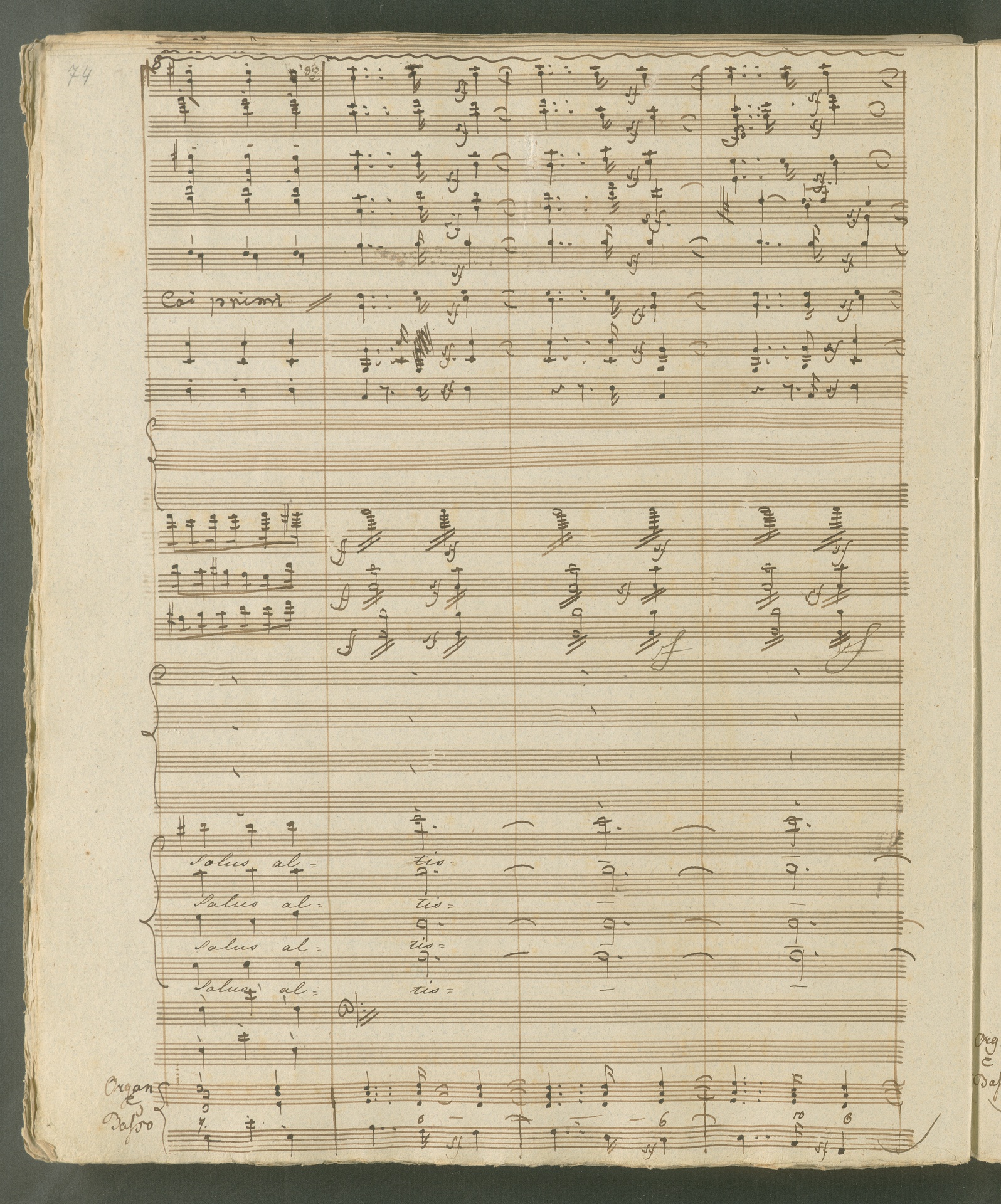 Diese überprüfte Abschrift der ersten beiden Sätze Kyrie und Gloria aus der Missa Solemnis entstand in der zweiten Jahreshälfte 1823. Beethoven schickte die Teilabschrift am 9. April 1825 zu seinem ehemaligen Schüler Ferdinand Ries nach Bonn. Die Messe sollte beim Niederrheinischen Musikfest des gleichen Jahres in Aachen aufgeführt werden, für das sich Ries sehr engagierte. "Kyrie u. gloria zwei der vorzüglichst. Stük sind ebenfalls schon (...) auf dem wege für sie" (BGA 1957. Beethoven an Ferdinand Ries in Bonn, Wien, 9. April 1825), schrieb Beethoven im zugehörigen Begleitbrief an Ries. Allerdings wurde die Messe schließlich doch nicht ins Programm genommen: Die Sendung traf zu spät bei Ries ein als dass sie noch hätte vernünftig geprobt werden können. (J.R.)