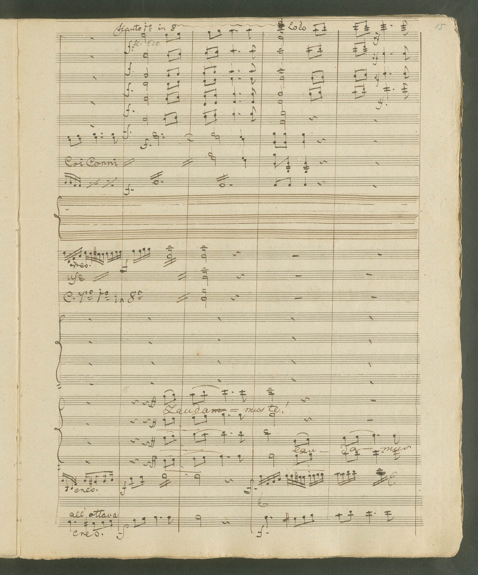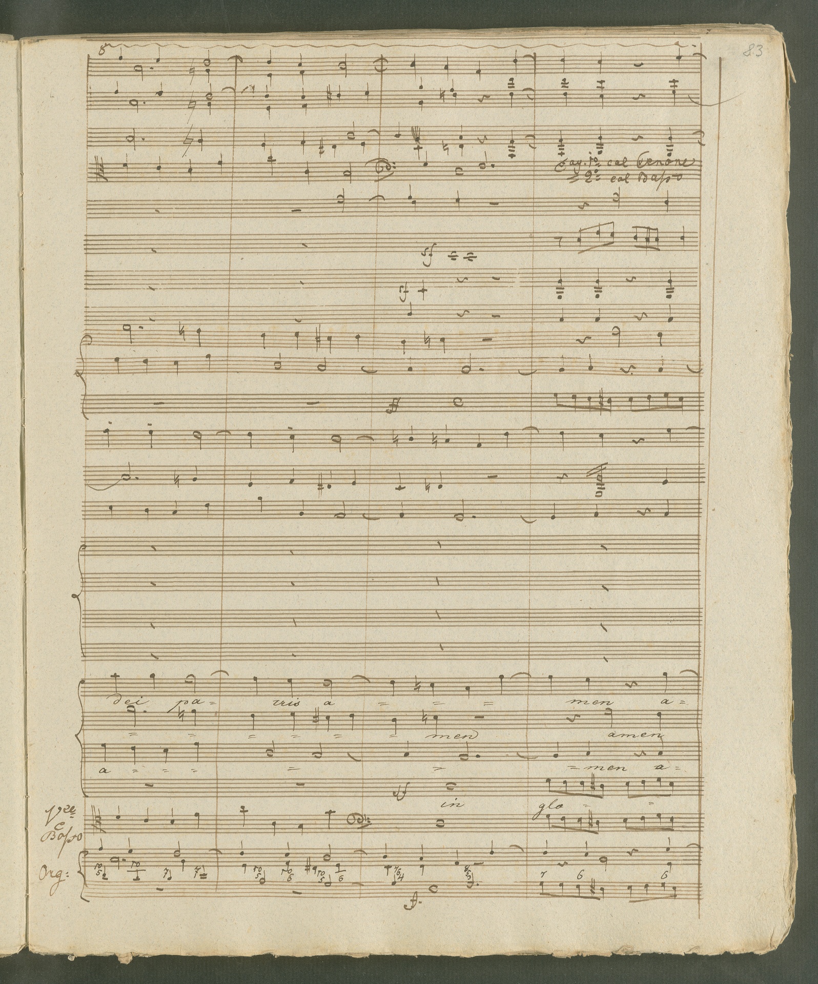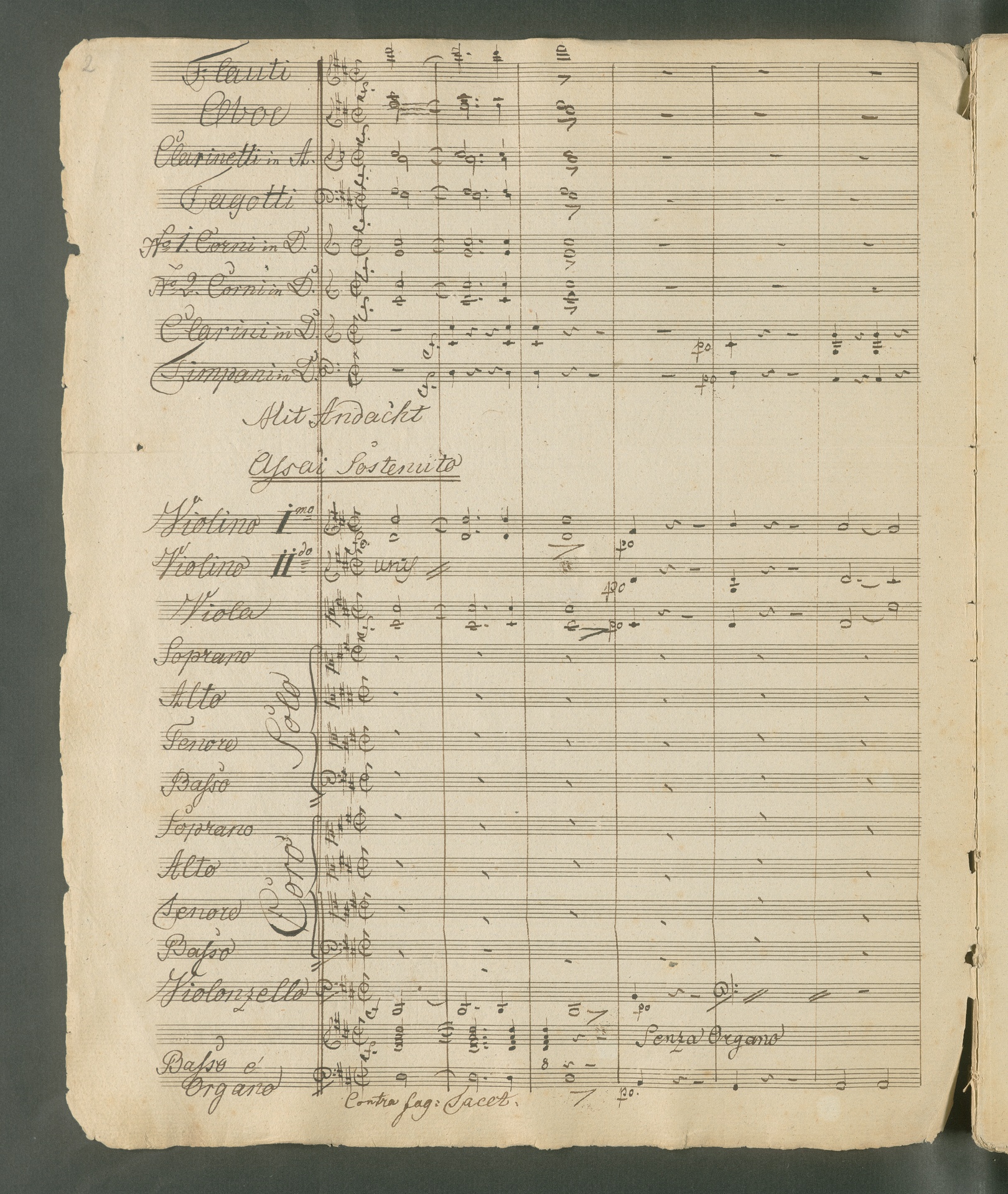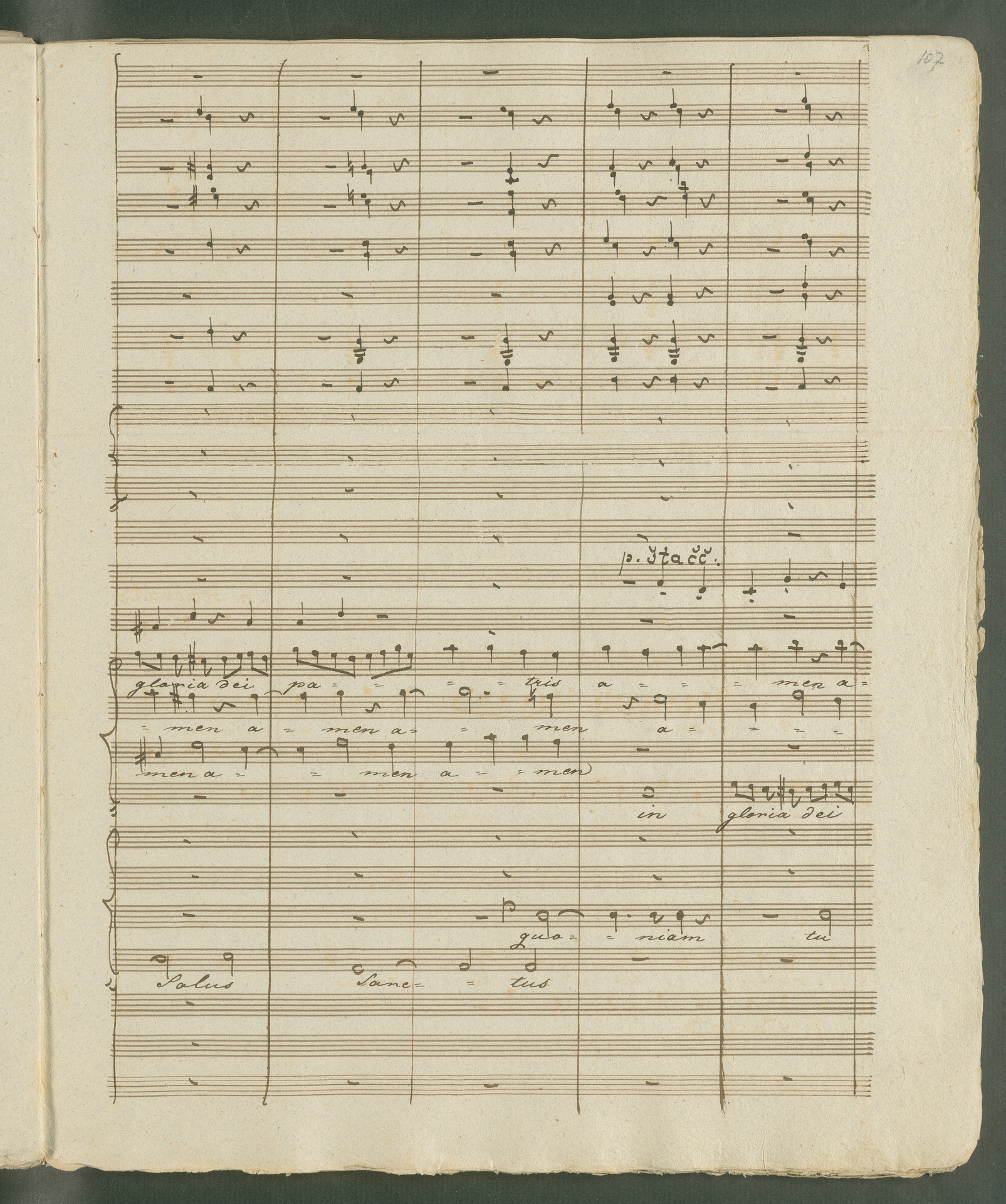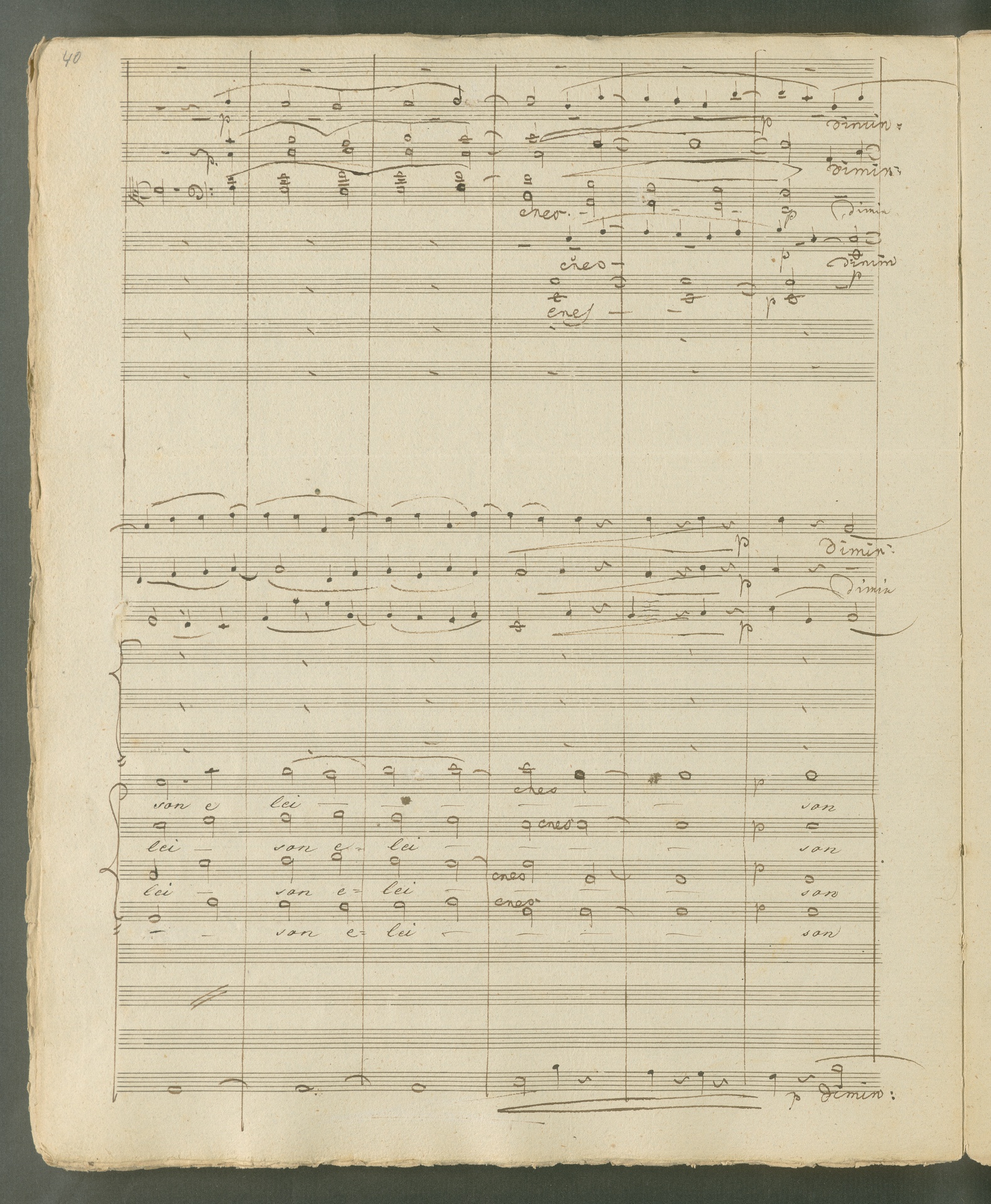 Diese überprüfte Abschrift der ersten beiden Sätze Kyrie und Gloria aus der Missa Solemnis entstand in der zweiten Jahreshälfte 1823. Beethoven schickte die Teilabschrift am 9. April 1825 zu seinem ehemaligen Schüler Ferdinand Ries nach Bonn. Die Messe sollte beim Niederrheinischen Musikfest des gleichen Jahres in Aachen aufgeführt werden, für das sich Ries sehr engagierte. "Kyrie u. gloria zwei der vorzüglichst. Stük sind ebenfalls schon (...) auf dem wege für sie" (BGA 1957. Beethoven an Ferdinand Ries in Bonn, Wien, 9. April 1825), schrieb Beethoven im zugehörigen Begleitbrief an Ries. Allerdings wurde die Messe schließlich doch nicht ins Programm genommen: Die Sendung traf zu spät bei Ries ein als dass sie noch hätte vernünftig geprobt werden können. (J.R.)