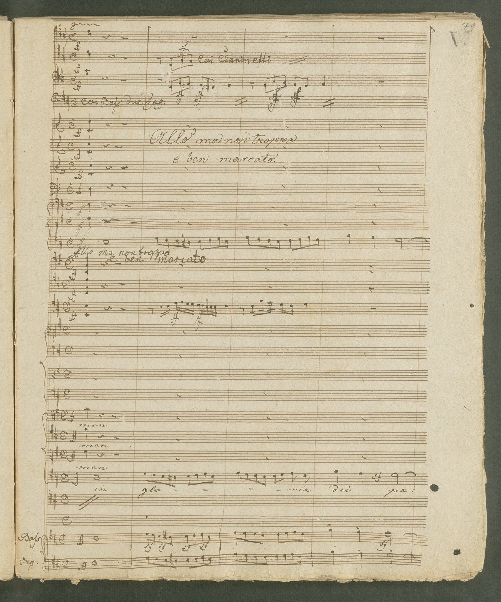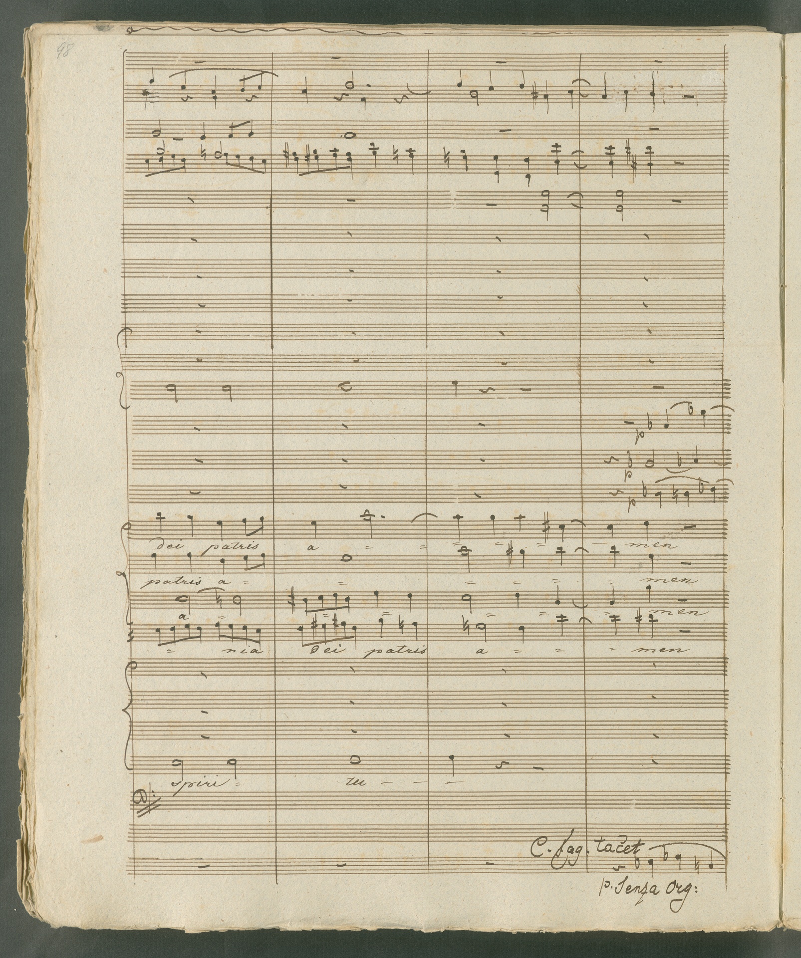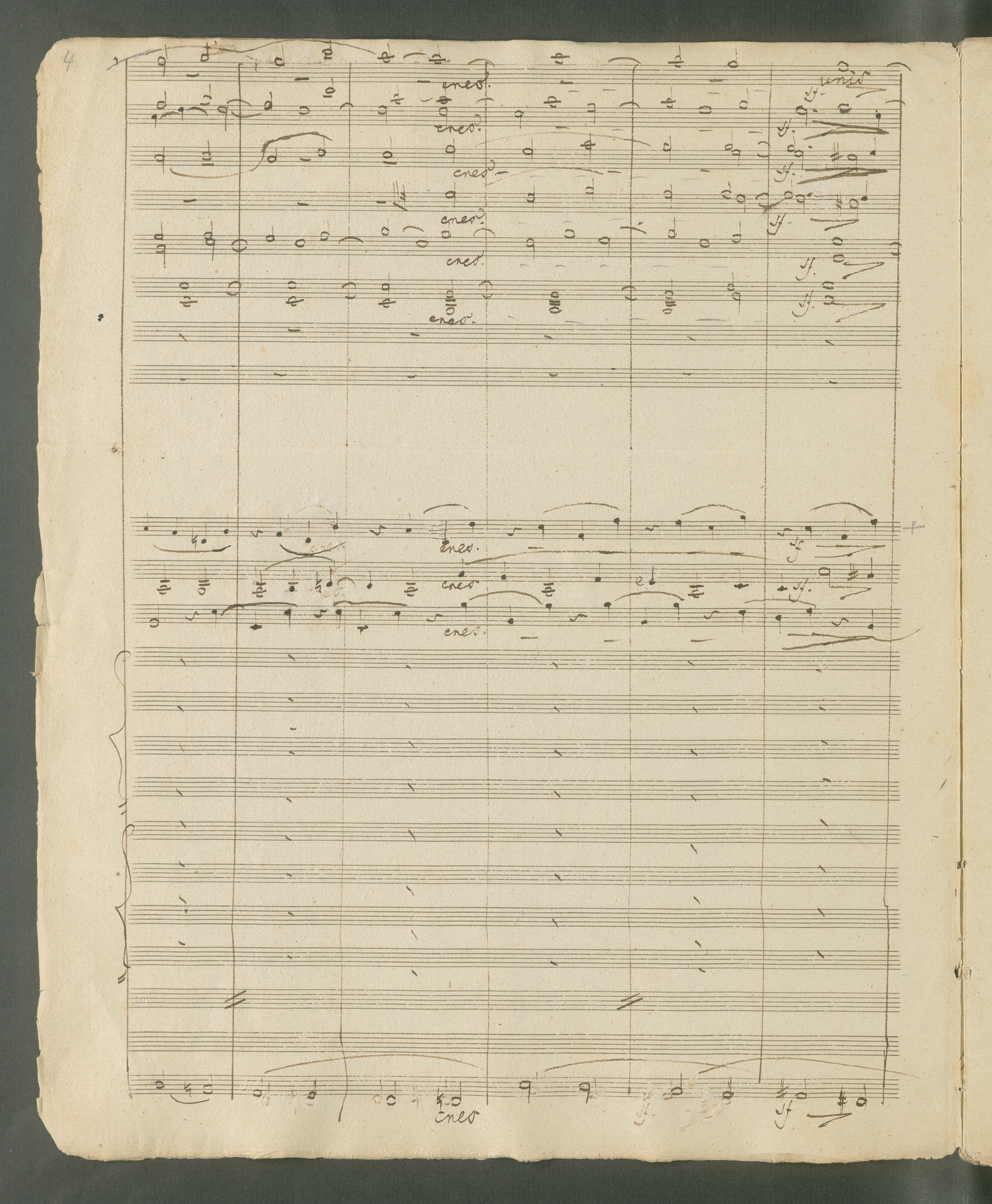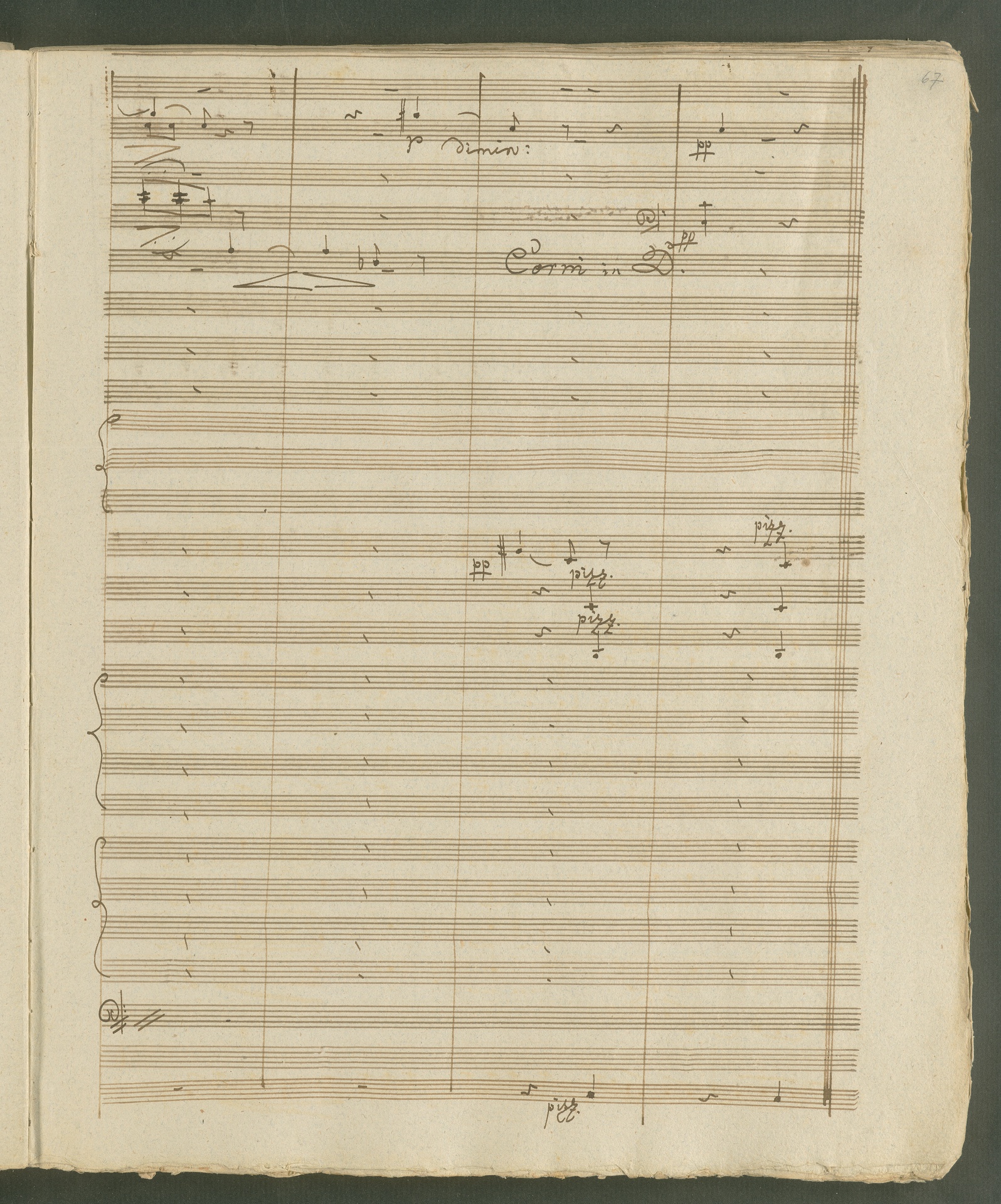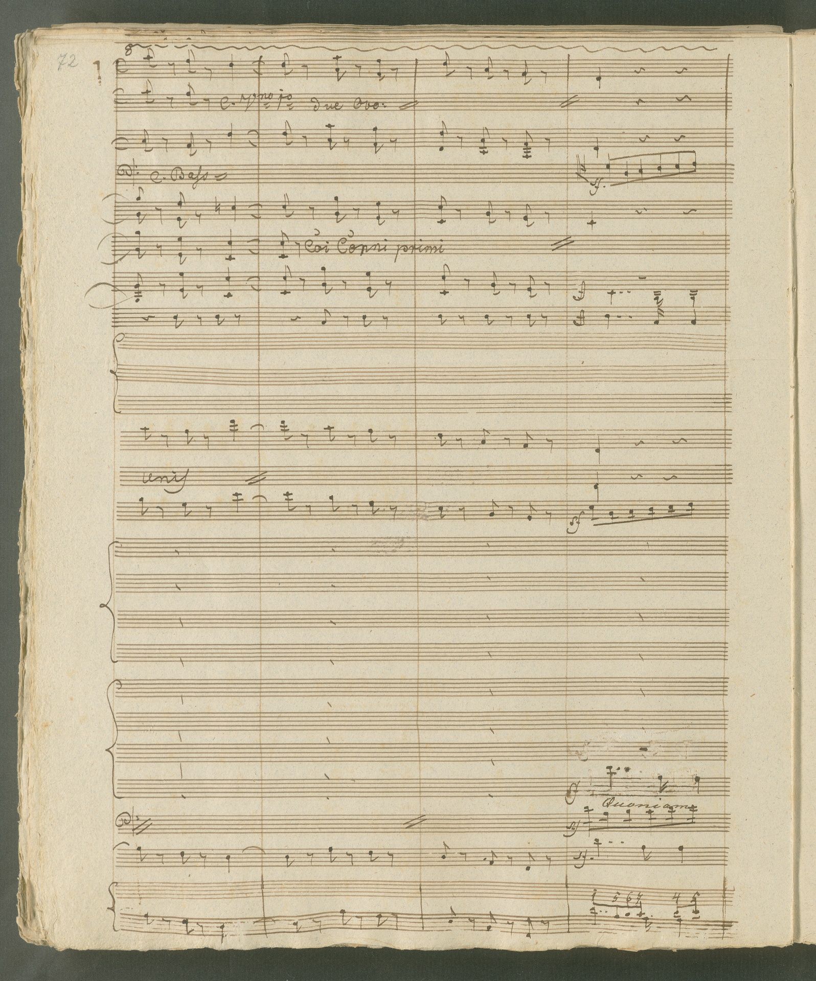 Diese überprüfte Abschrift der ersten beiden Sätze Kyrie und Gloria aus der Missa Solemnis entstand in der zweiten Jahreshälfte 1823. Beethoven schickte die Teilabschrift am 9. April 1825 zu seinem ehemaligen Schüler Ferdinand Ries nach Bonn. Die Messe sollte beim Niederrheinischen Musikfest des gleichen Jahres in Aachen aufgeführt werden, für das sich Ries sehr engagierte. "Kyrie u. gloria zwei der vorzüglichst. Stük sind ebenfalls schon (...) auf dem wege für sie" (BGA 1957. Beethoven an Ferdinand Ries in Bonn, Wien, 9. April 1825), schrieb Beethoven im zugehörigen Begleitbrief an Ries. Allerdings wurde die Messe schließlich doch nicht ins Programm genommen: Die Sendung traf zu spät bei Ries ein als dass sie noch hätte vernünftig geprobt werden können. (J.R.)