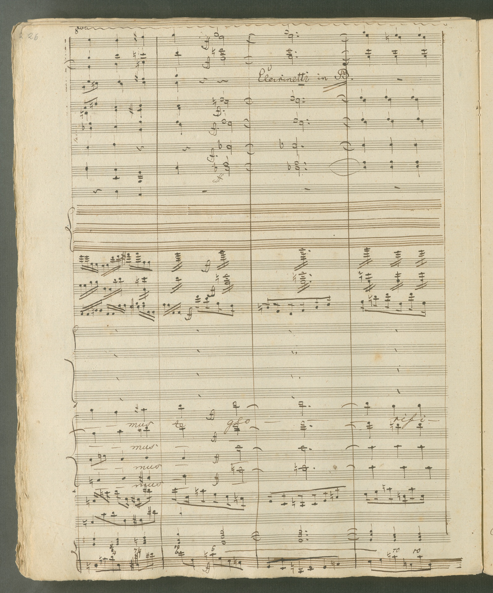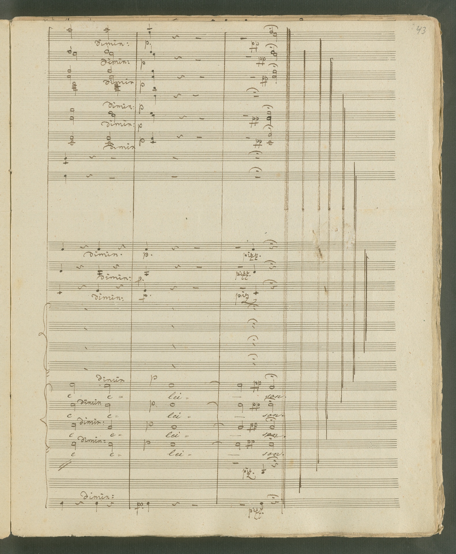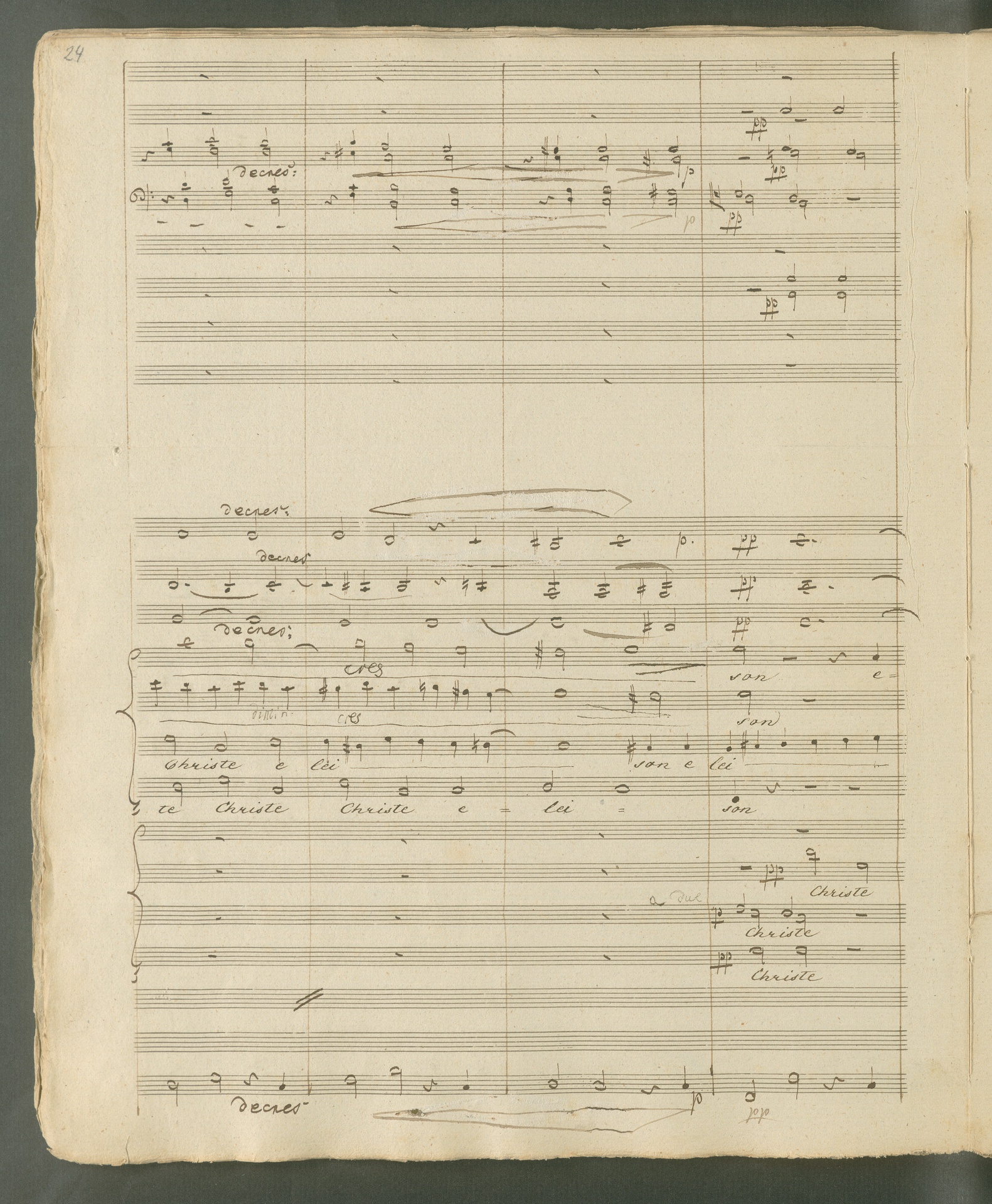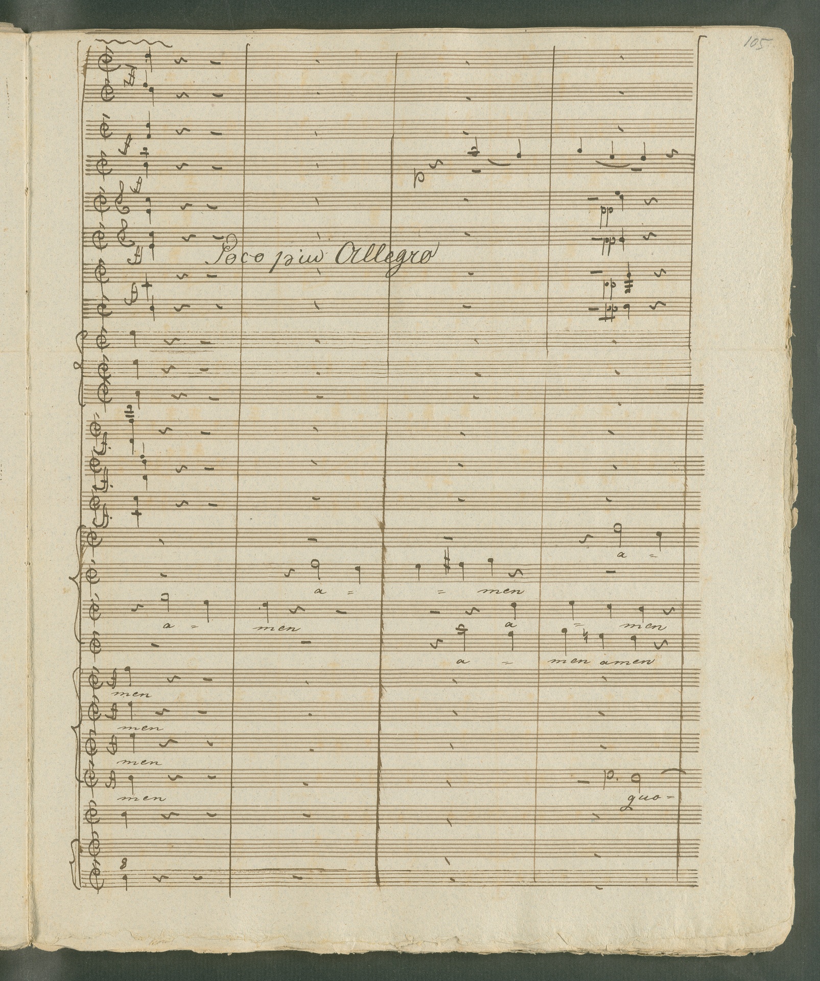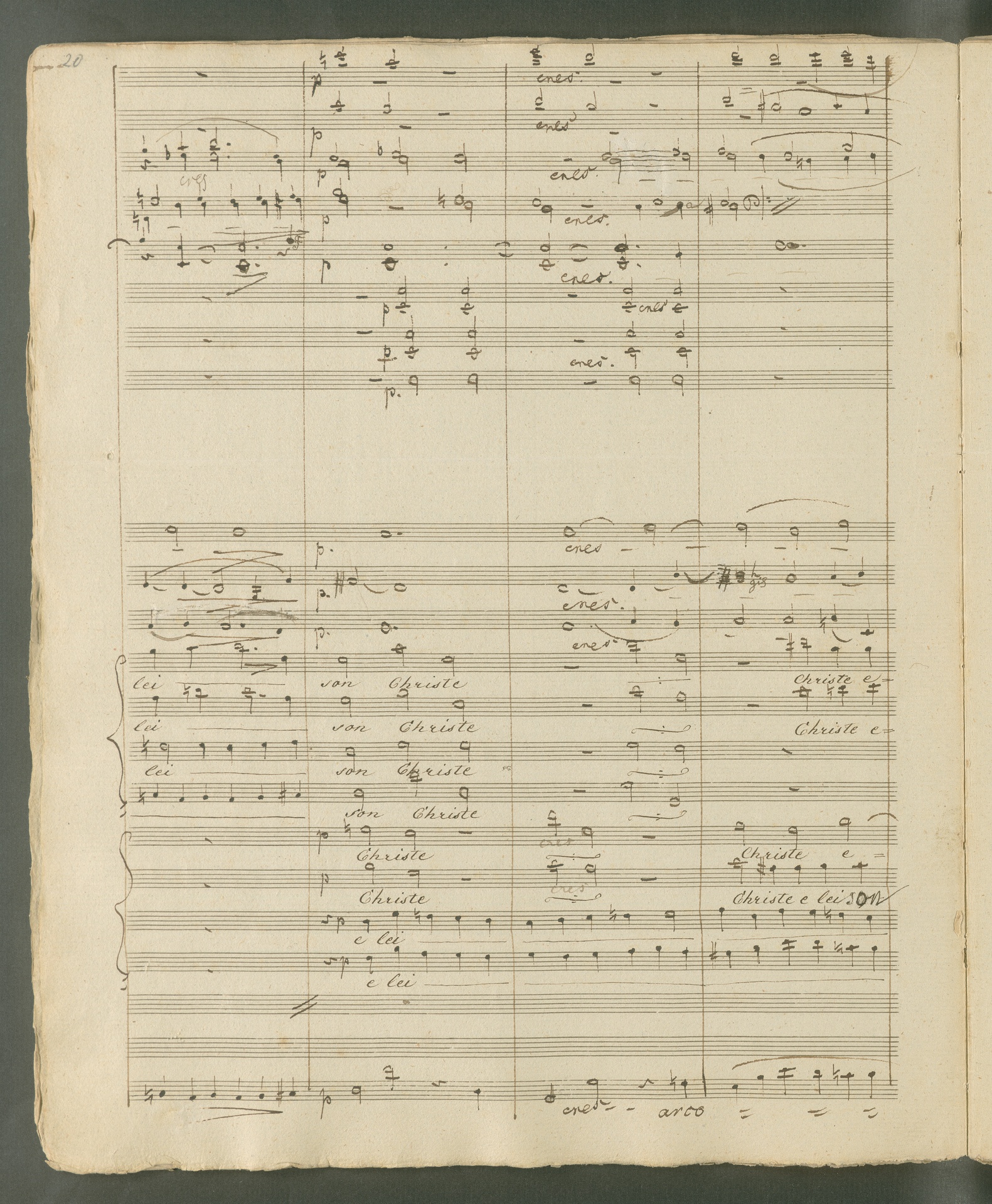 Diese überprüfte Abschrift der ersten beiden Sätze Kyrie und Gloria aus der Missa Solemnis entstand in der zweiten Jahreshälfte 1823. Beethoven schickte die Teilabschrift am 9. April 1825 zu seinem ehemaligen Schüler Ferdinand Ries nach Bonn. Die Messe sollte beim Niederrheinischen Musikfest des gleichen Jahres in Aachen aufgeführt werden, für das sich Ries sehr engagierte. "Kyrie u. gloria zwei der vorzüglichst. Stük sind ebenfalls schon (...) auf dem wege für sie" (BGA 1957. Beethoven an Ferdinand Ries in Bonn, Wien, 9. April 1825), schrieb Beethoven im zugehörigen Begleitbrief an Ries. Allerdings wurde die Messe schließlich doch nicht ins Programm genommen: Die Sendung traf zu spät bei Ries ein als dass sie noch hätte vernünftig geprobt werden können. (J.R.)