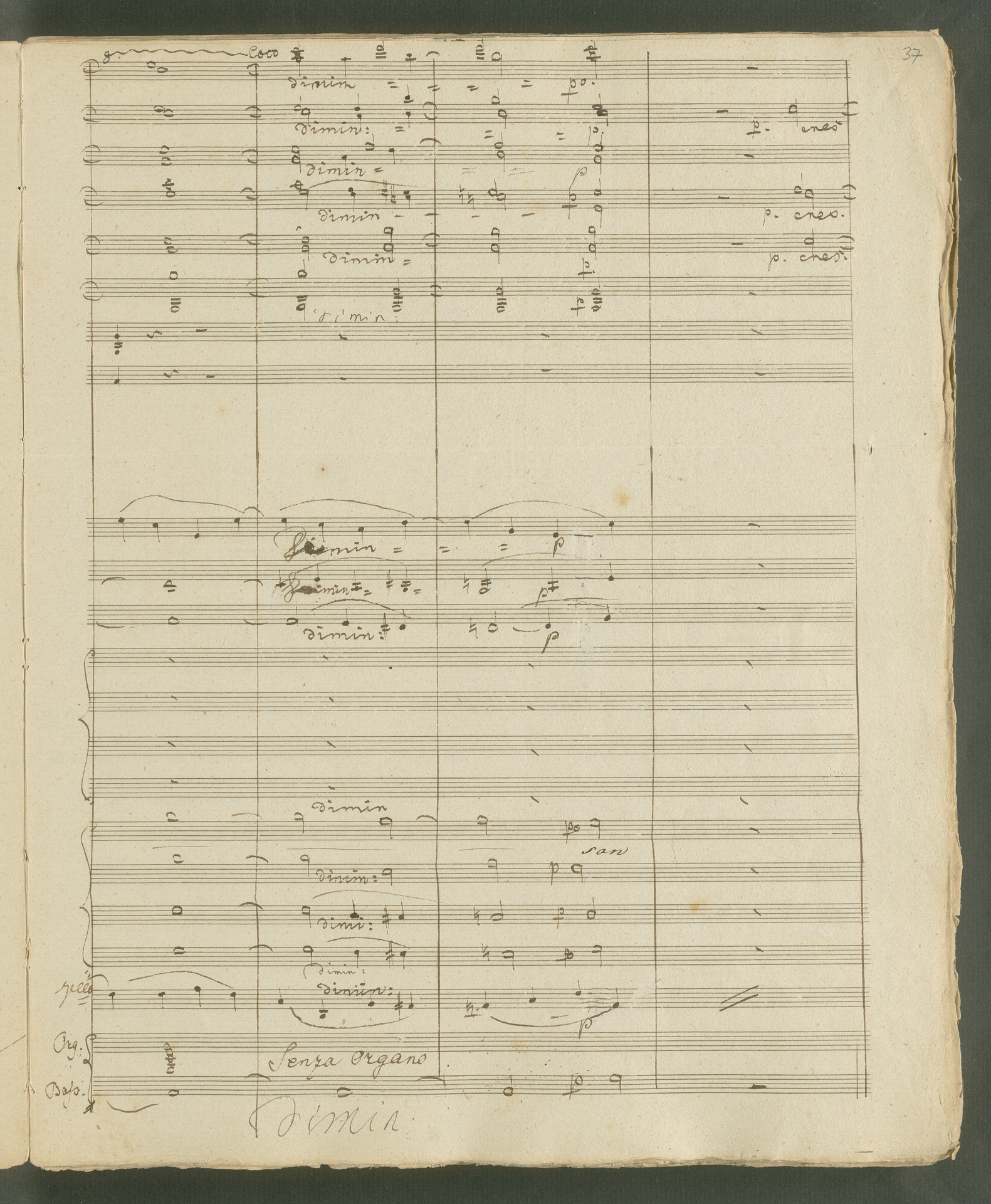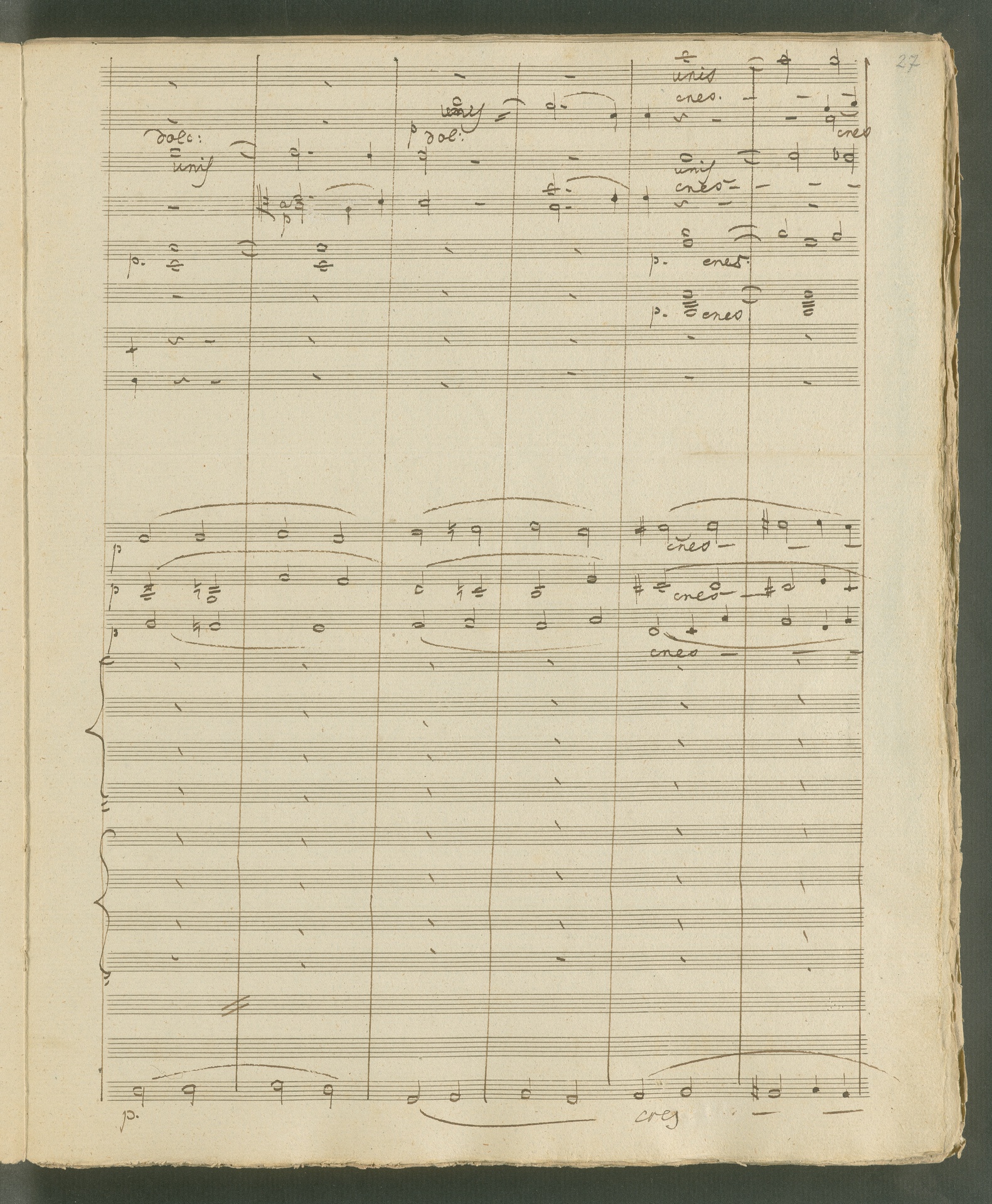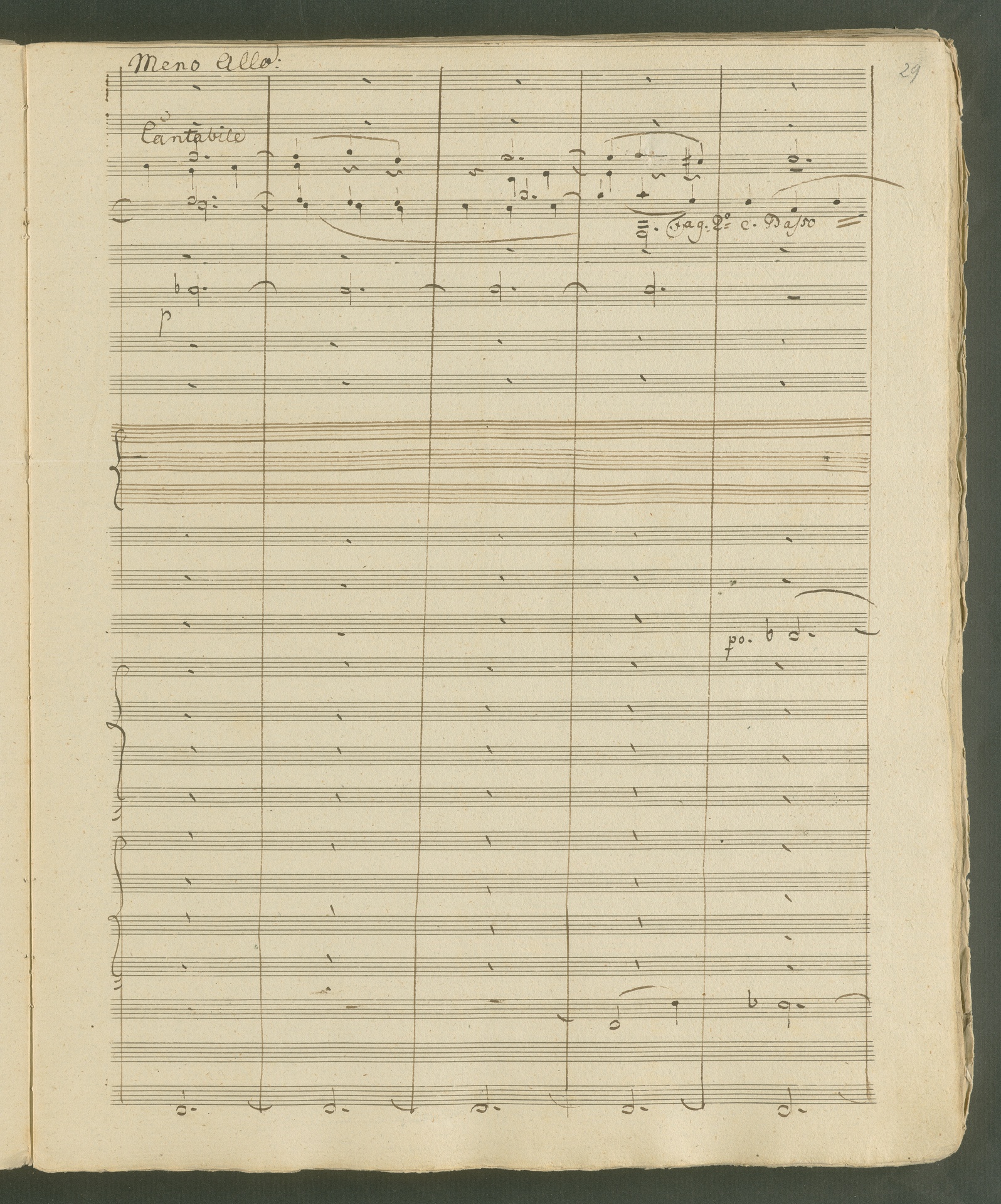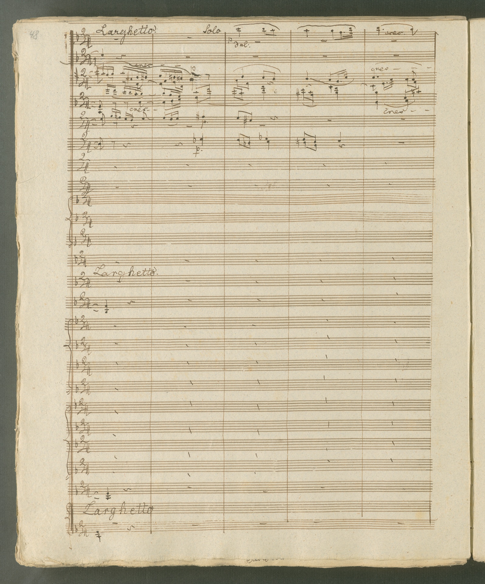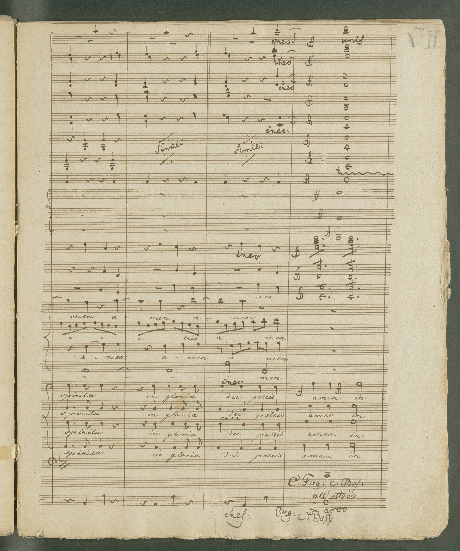 Diese überprüfte Abschrift der ersten beiden Sätze Kyrie und Gloria aus der Missa Solemnis entstand in der zweiten Jahreshälfte 1823. Beethoven schickte die Teilabschrift am 9. April 1825 zu seinem ehemaligen Schüler Ferdinand Ries nach Bonn. Die Messe sollte beim Niederrheinischen Musikfest des gleichen Jahres in Aachen aufgeführt werden, für das sich Ries sehr engagierte. "Kyrie u. gloria zwei der vorzüglichst. Stük sind ebenfalls schon (...) auf dem wege für sie" (BGA 1957. Beethoven an Ferdinand Ries in Bonn, Wien, 9. April 1825), schrieb Beethoven im zugehörigen Begleitbrief an Ries. Allerdings wurde die Messe schließlich doch nicht ins Programm genommen: Die Sendung traf zu spät bei Ries ein als dass sie noch hätte vernünftig geprobt werden können. (J.R.)