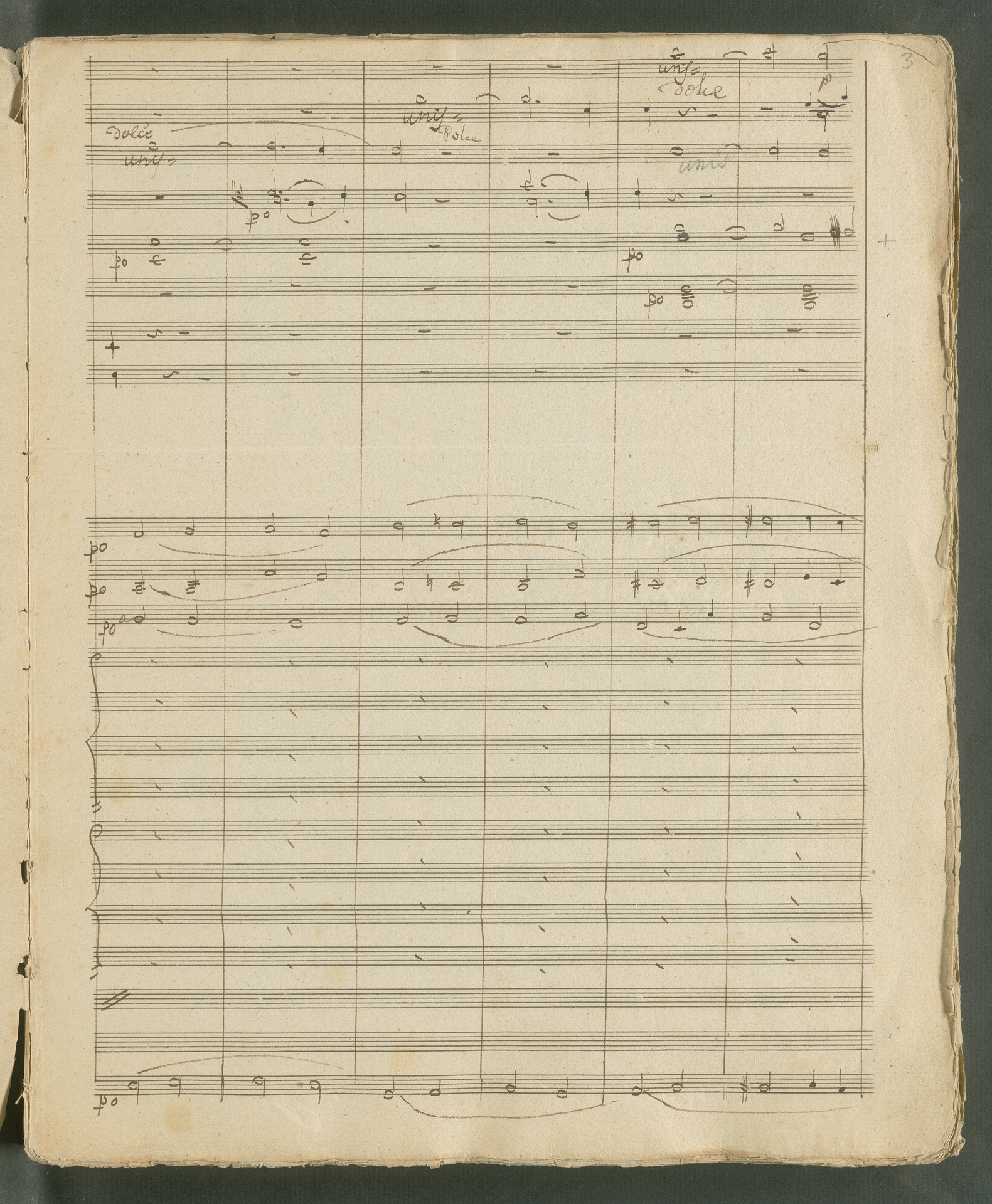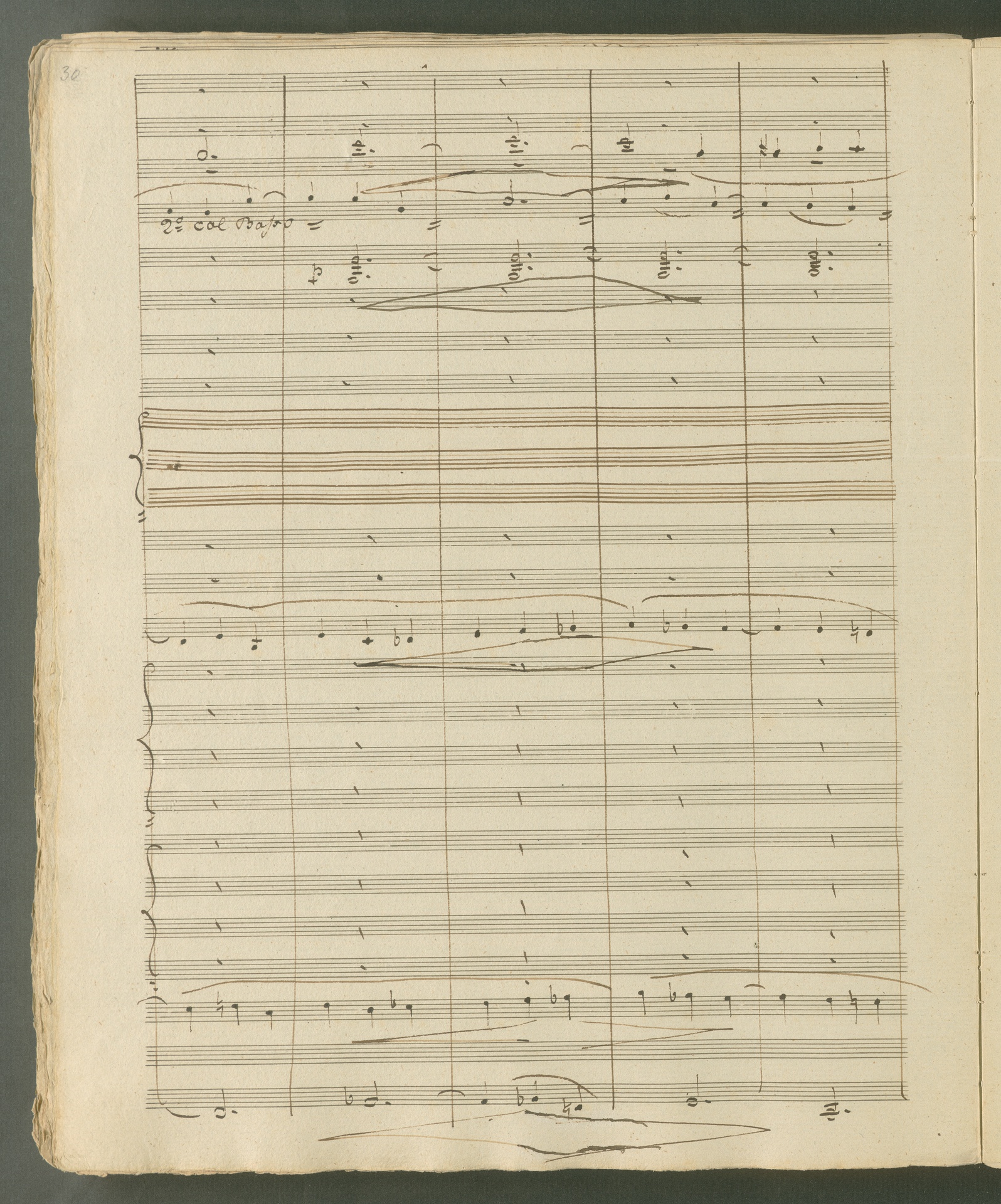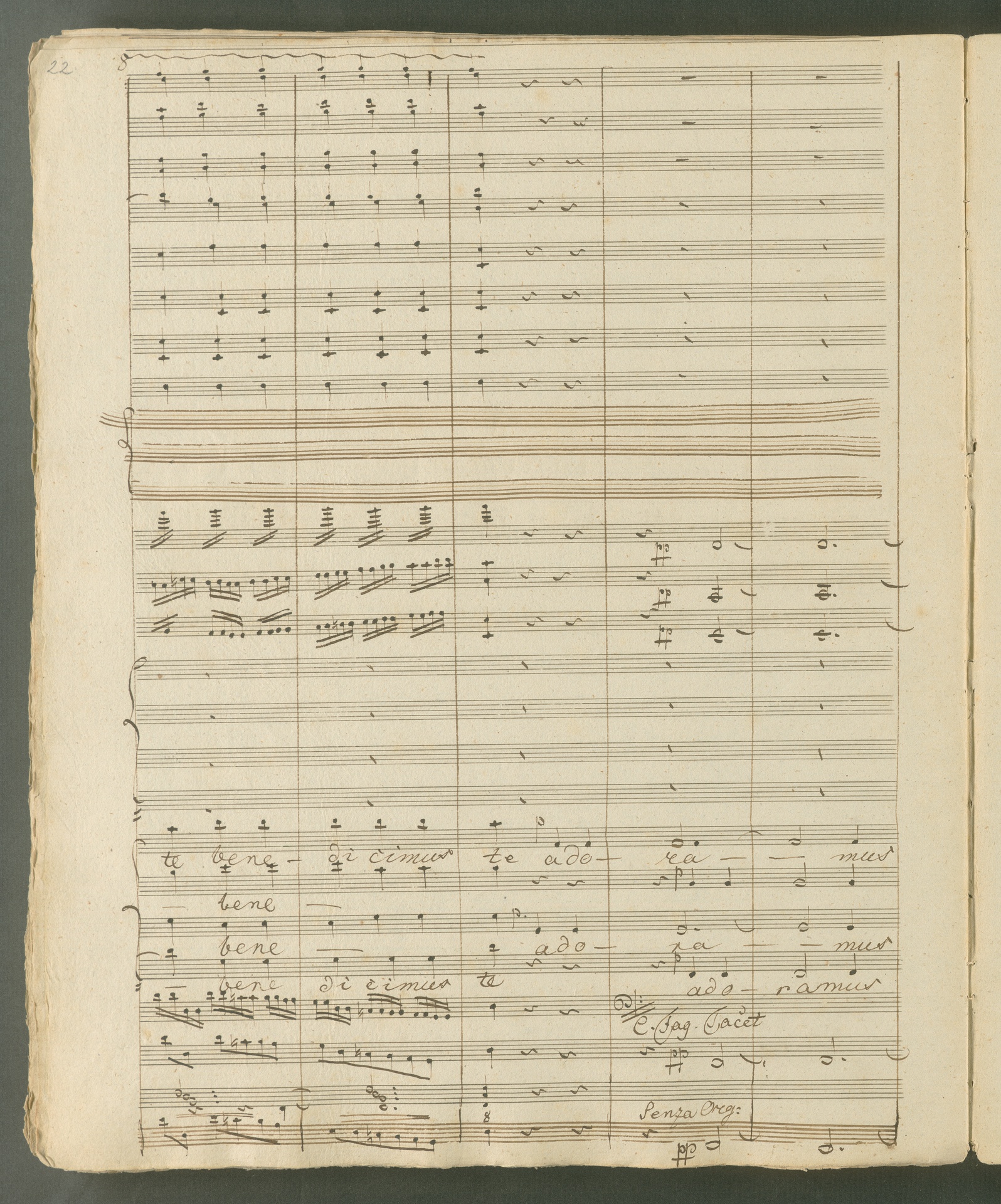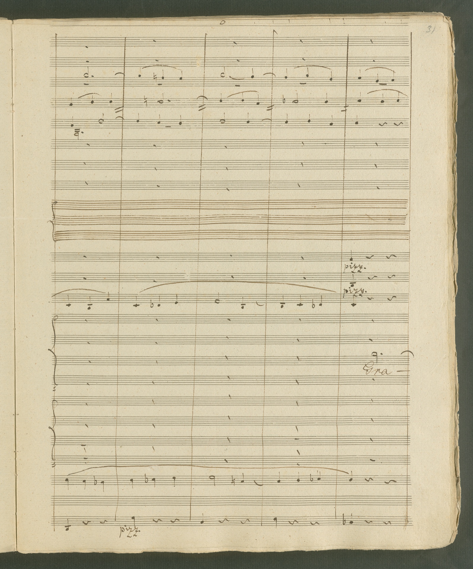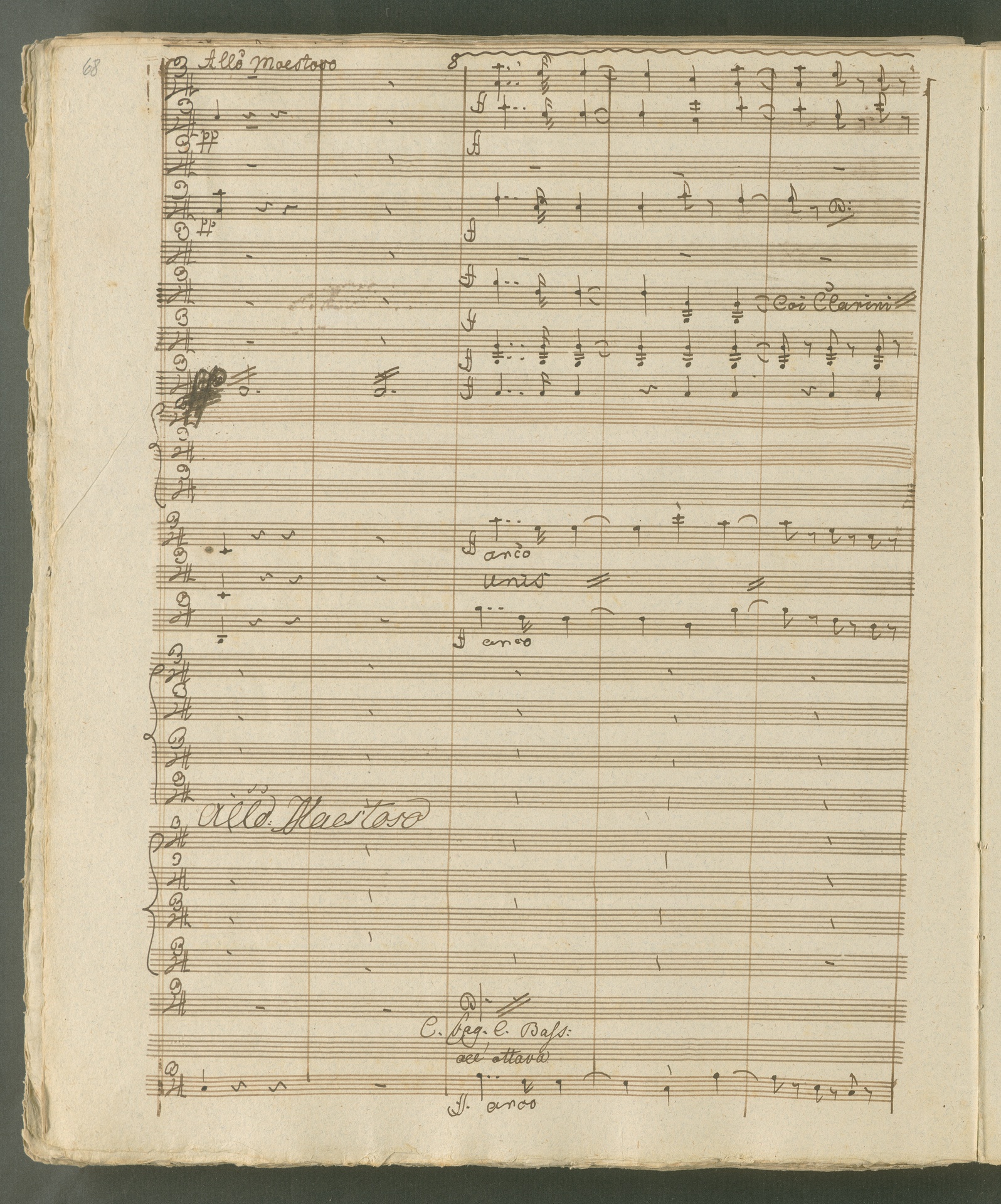 Diese überprüfte Abschrift der ersten beiden Sätze Kyrie und Gloria aus der Missa Solemnis entstand in der zweiten Jahreshälfte 1823. Beethoven schickte die Teilabschrift am 9. April 1825 zu seinem ehemaligen Schüler Ferdinand Ries nach Bonn. Die Messe sollte beim Niederrheinischen Musikfest des gleichen Jahres in Aachen aufgeführt werden, für das sich Ries sehr engagierte. "Kyrie u. gloria zwei der vorzüglichst. Stük sind ebenfalls schon (...) auf dem wege für sie" (BGA 1957. Beethoven an Ferdinand Ries in Bonn, Wien, 9. April 1825), schrieb Beethoven im zugehörigen Begleitbrief an Ries. Allerdings wurde die Messe schließlich doch nicht ins Programm genommen: Die Sendung traf zu spät bei Ries ein als dass sie noch hätte vernünftig geprobt werden können. (J.R.)