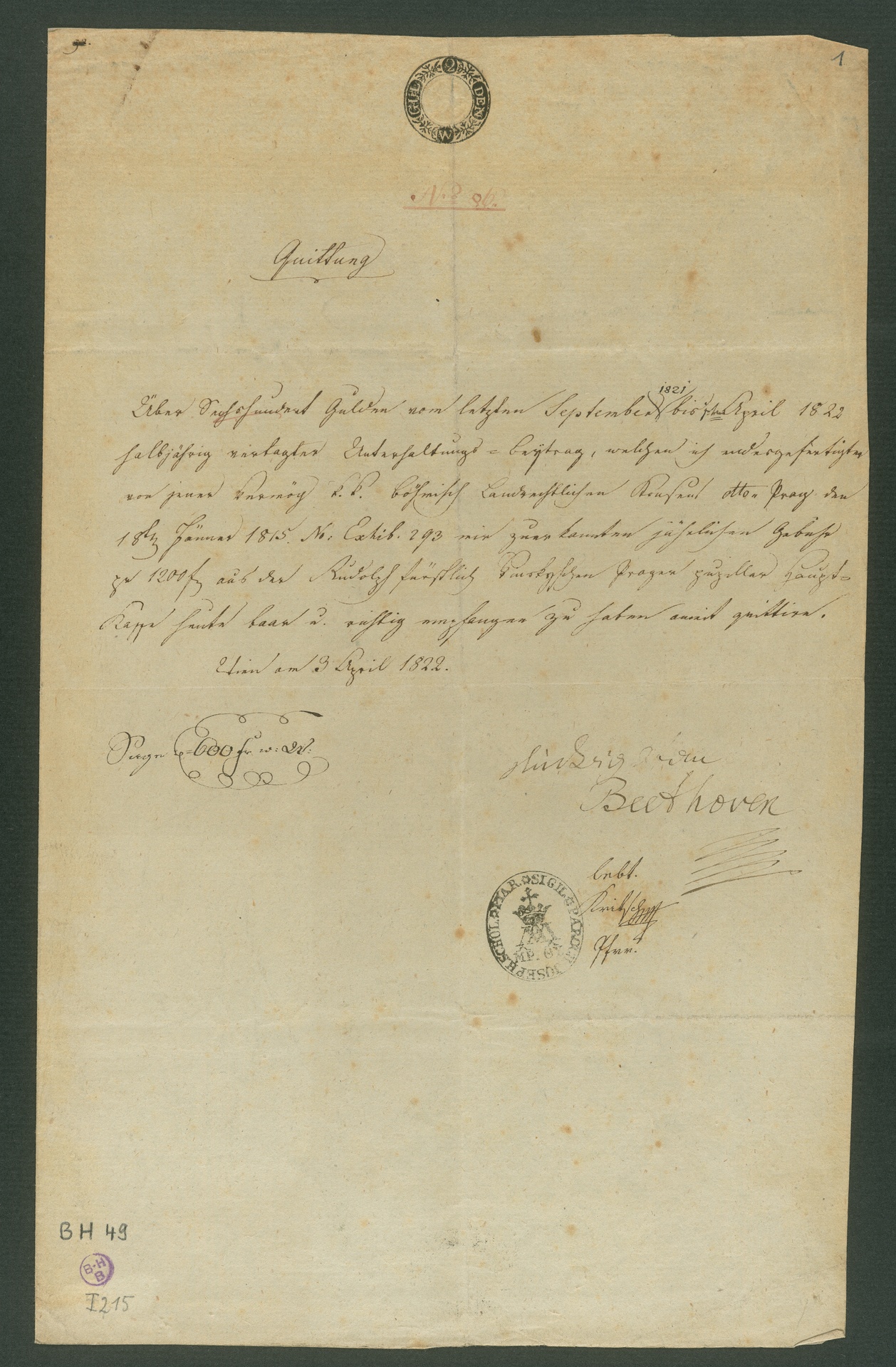 Beethoven bezog von der fürstlich-kinskyschen Hauptkasse in Prag ein Gehalt von 1200 Gulden pro Jahr, das er halbjährlich ausbezahlt bekam und persönlich quittieren musste. Trotz seines mit dem Fürsten Kinsky geschlossenen Rentenvertrages von 1809 hatte Beethoven sich dieses Gehalt gerichtlich erstreiten müssen, nachdem der Fürst im November 1812 tödlich verunglückt war und die Familie daraufhin die Zahlungen einstellen wollte. Auf der Quittung ist das Datum der gerichtlichen Verfügung vermerkt, die Grundlage der Zahlungen ist. (J.R.)