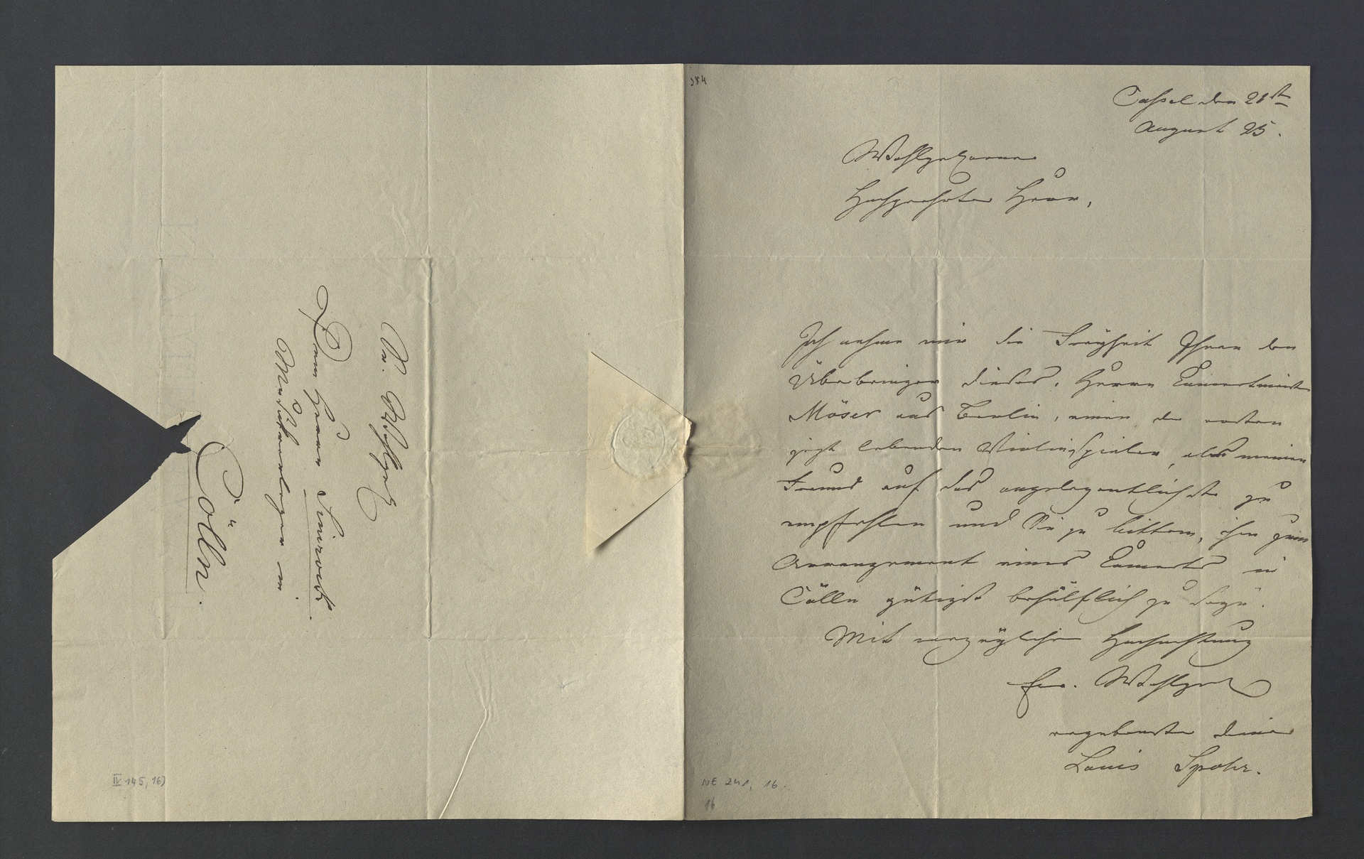 Text: "Wohlgeborner, Hochgeehrter Herr, Ich nahm mir die Freyheit Ihnen den Überbringer dieses, Herrn Concertmeister Möser aus Berlin, einen der ersten jetzt lebenden Violinspieler, als meinen Freund auf das angelegentlichste zu empfehlen und Sie zu bitten, ihm zum Arrangement eines Concerts in Cölln gütigst behilflich zu seyn. Mit vorzüglicher Hochachtung Ew. Wohlgeb. ergebenster Diener Louis Spohr.". Karl Traugott Goldbach, Spohr-Briefe: <http://bit.ly/1mUVrGD>