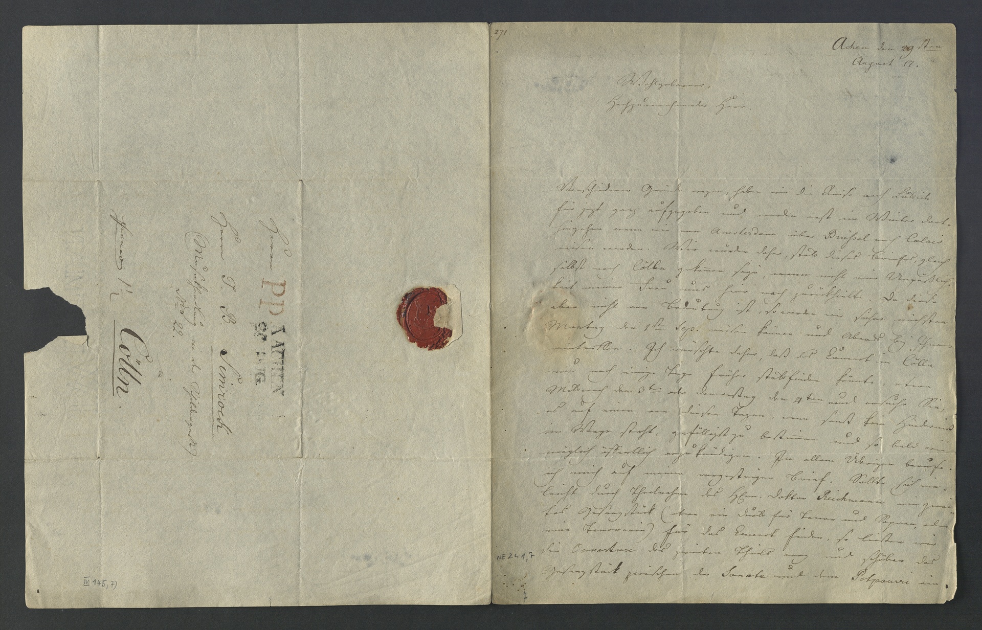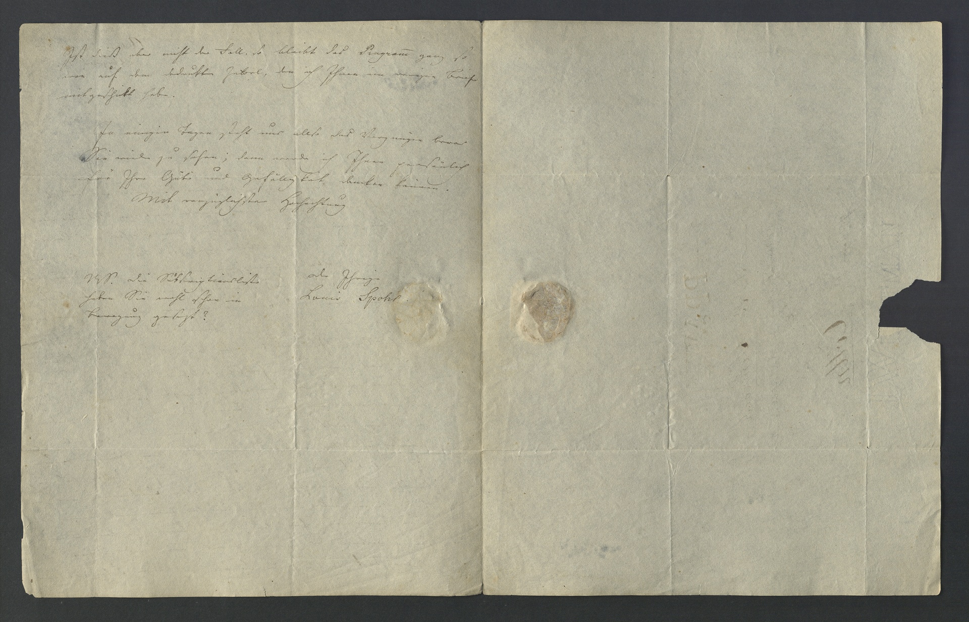 Text: "Wohlgeborner, Hochzuverehrender Herr, Verschiedener Gründe wegen haben wir die Reise nach Lüttich für jezt ganz aufgegeben und werden erst im Winter dorthingehen wenn wir von Amsterdam über Brüssel nach Calais reisen werden. Wir würden daher, statt dieses Briefes, gleich selbst nach Cölln gekommen seyn, wenn nicht eine Unpäßlichkeit meiner Frau uns hier noch zurückhielte. Da diese aber nicht von Bedeutung ist, so werden wir sicher nächsten Montag den 1sten Sep. reisen können und Abends bey Ihnen eintreffen. Ich wünschte daher, daß das Concert in Cölln um noch einige Tage früher stattfinden könnte, etwa Mittwoch den 3ten oder Donnerstag den 4ten und ersuche Sie, es auf einen von diesen Tagen wenn sonst kein Hinderniß im Wege steht, gefälligst zu bestimmen und so bald wie möglich öffentlich anzukündigen. In allem Übrigen berufe ich mich auf meinen vorgestrigen Brief. Sollten sich vieleicht durch Theilnahme des Herrn Doktor Reichmann ein zweites Gesangstück (etwa ein Duett für Tenor und Sopran, oder eine Tenorarie) für das Concert finden, so ließen wir die Ouverture des zweiten Theils weg und schöben das Gesangstück zwischen der Sonate und dem Potpourri ein. Ist dieß aber nicht der Fall, so bleibt das Programm ganz so wie auf dem bedruckten Zettel, den ich Ihnen im vorigen Briefe mitgeschickt habe. In einigen Tagen steht mir also das Vergnügen bevor Sie wieder zu sehen; dann werde ich Ihnen persönlich für Ihre Güte und Gefälligkeit danken können. Mit vorzüglichster Hochachtung der Ihrige Louis Spohr"
