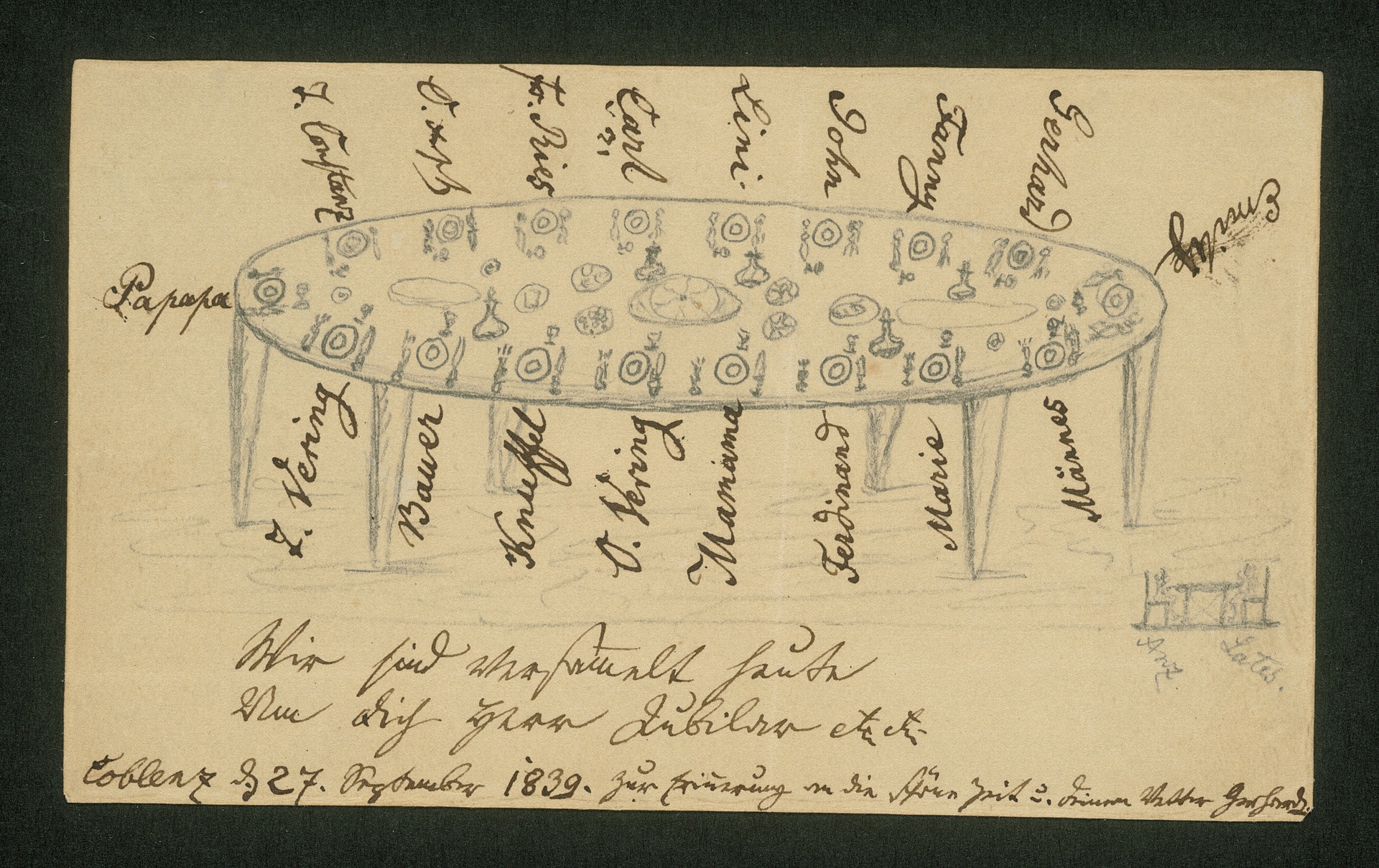 Das 50jährige Doktorjubiläum von Franz Gerhard Wegeler am 1. September 1839 wurde am 27. September im Kreis der Familien Wegeler, Breuning und Ries in Koblenz gefeiert. Zur Erinnerung widmete Gerhard von Breuning seinem Onkel und Namensvetter das von ihm gezeichnete Schema der Tischordnung. (F.G.)