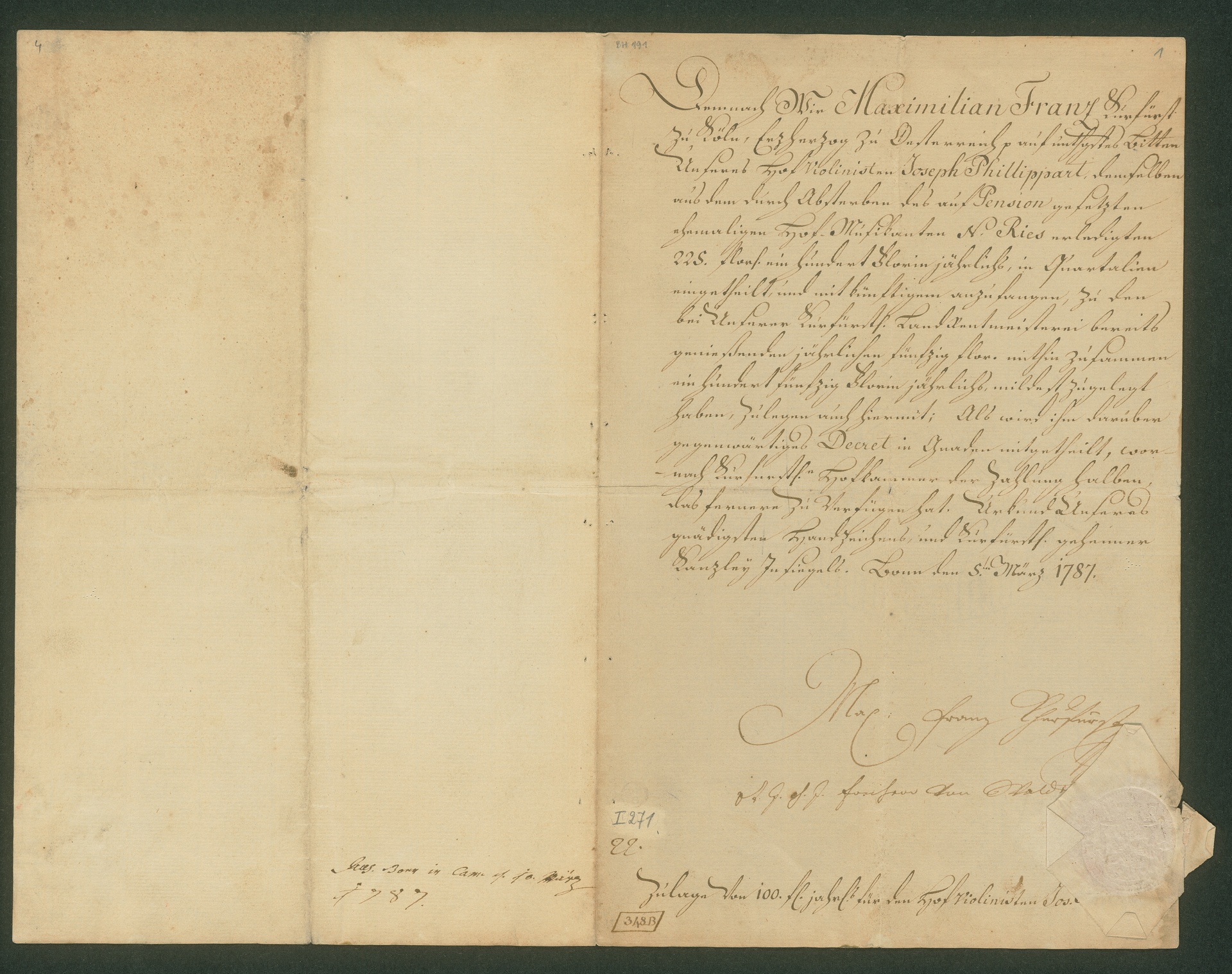 Maximilian Franz (Köln, Erzbischof), Bewilligung einer Zulage von 100 Gulden jährlich für den Hofviolinisten Joseph Phillippart, Bonn, 5. März 1787