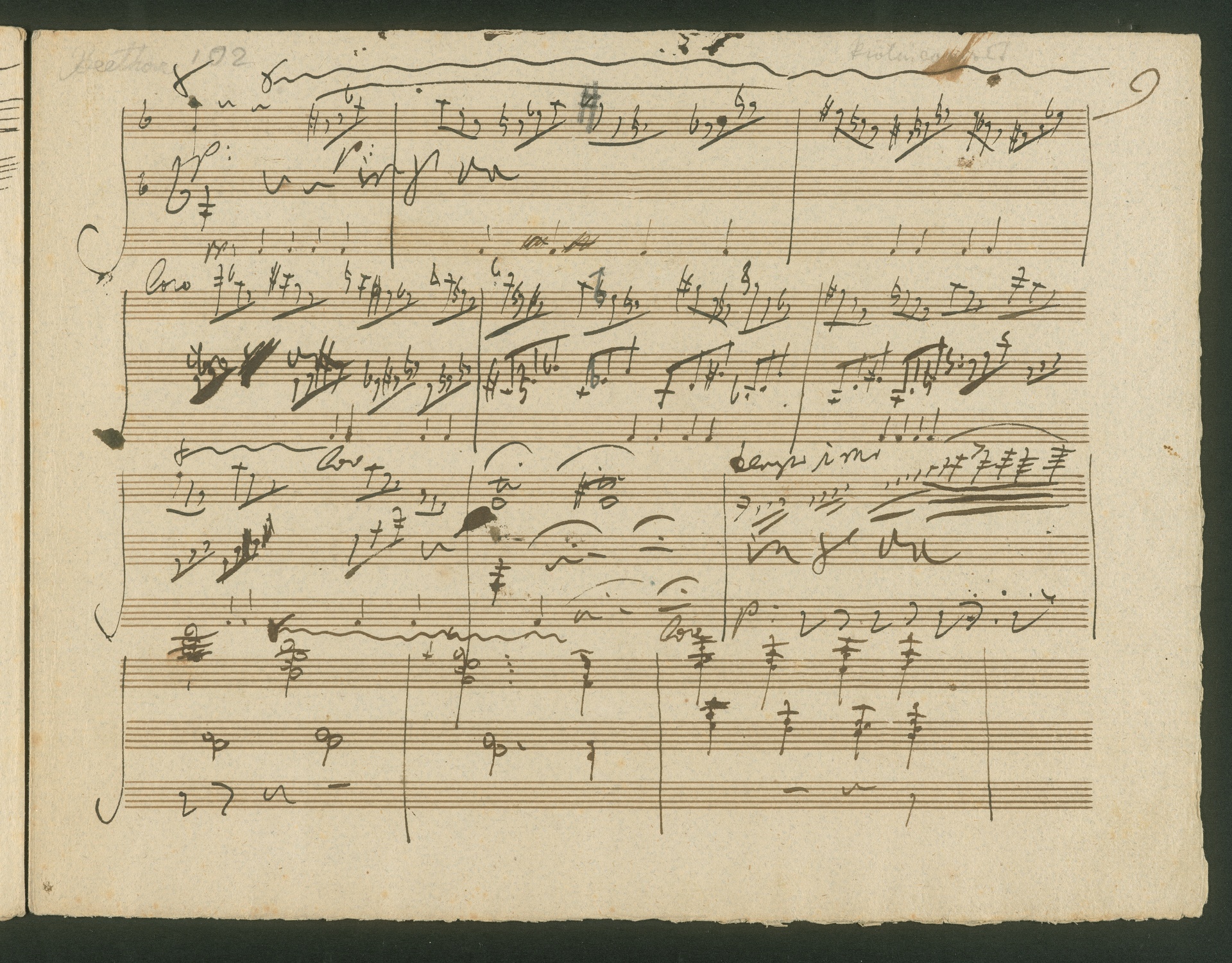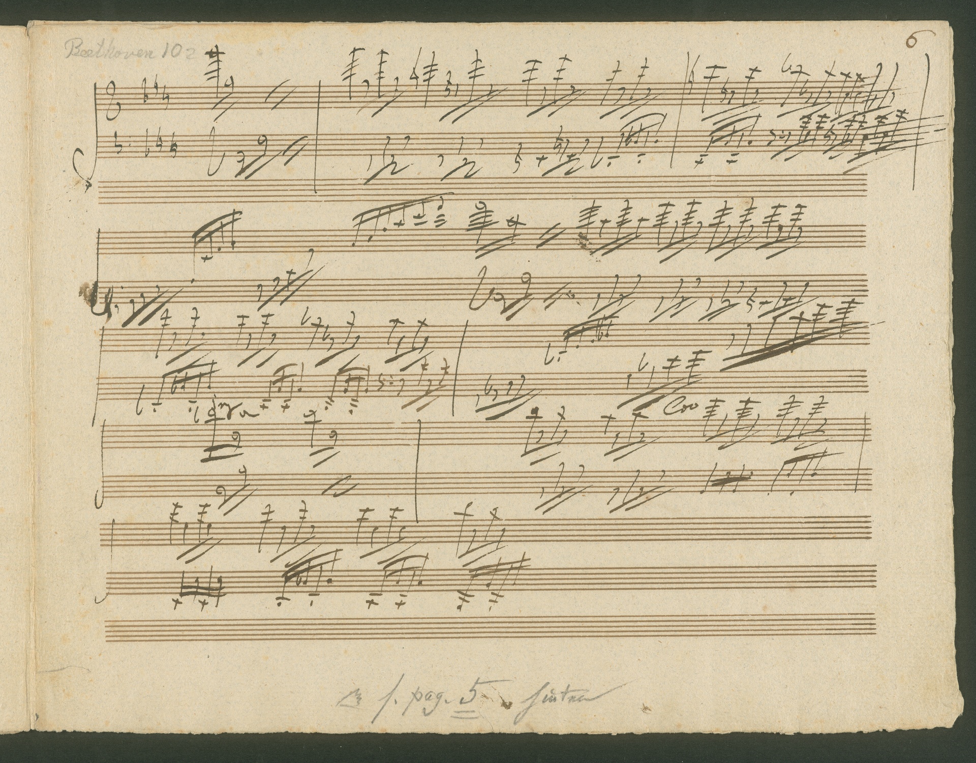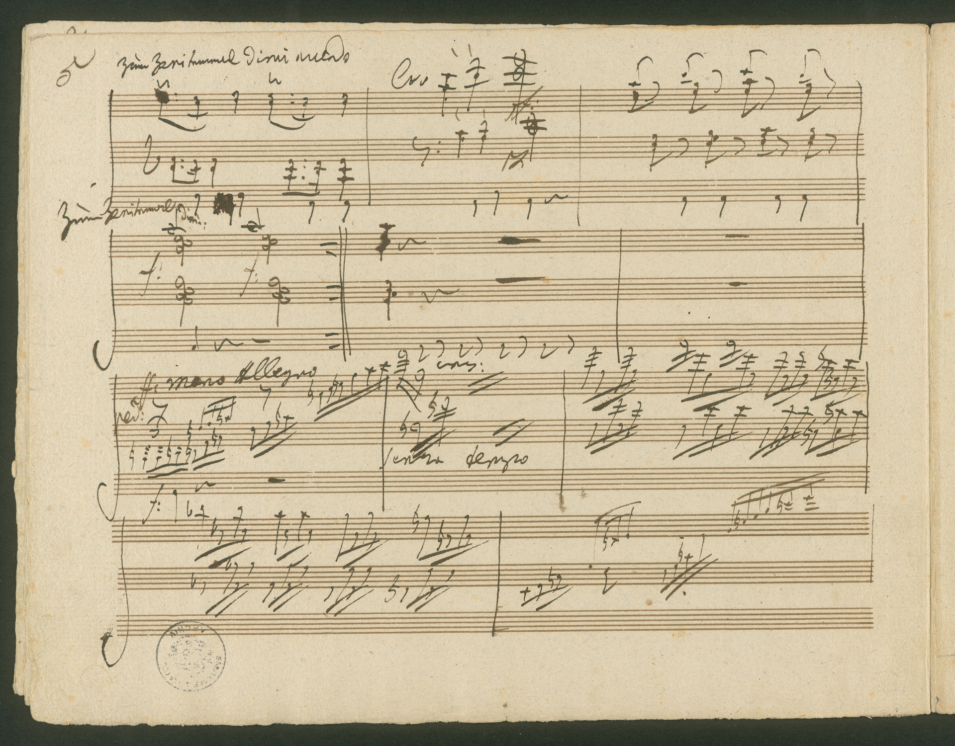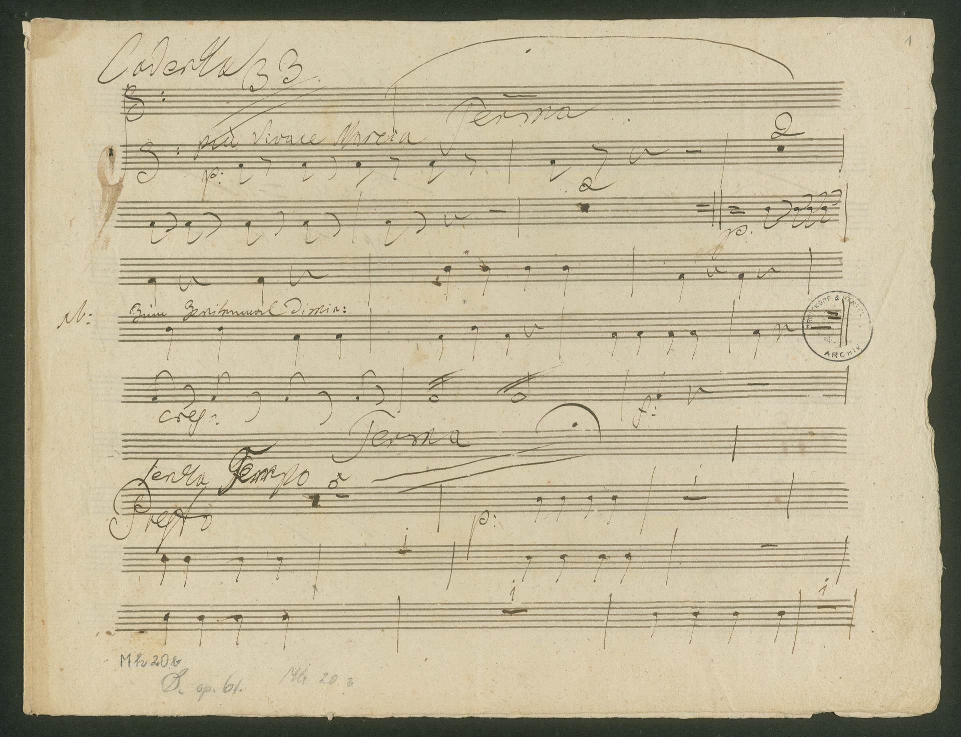 Auf Anregung des Londoner Verlegers Muzio Clementi arbeitete Beethoven sein Violinkonzert op. 61 um zu einer Fassung für Klavier und Orchester. Die Klavierbearbeitung erschien im August 1808. Während von der Bearbeitung kein Autograph überliefert ist, besitzen wir noch originale Kadenzen von Beethovens Hand für dieses Konzert. Hier abgebildet ist die Kadenz zum ersten Satz. Sie ist nicht nur ihrer Länge wegen - zwölf handgeschriebene Seiten! - ungewöhnlich. Der Klavierstimme liegt ein zweites Manuskript, eine extra geschriebene Paukenstimme bei. Eine Begleitstimme zu einer Kadenz? Da sollte doch eigentlich einzig der Solist seine Virtuosität vorführen. Dem Soloklavier ausgerechnet eine Pauke beizustellen, ist singulär in der Klavierliteratur. Schon zu Beginn des Konzerts hat die Pauke eine herausragende Rolle: mit vier Schlägen eröffnet sie solistisch das Geschehen. Vielleicht wollte Beethoven diese Rolle in der Kadenz noch einmal festigen und bestärken.