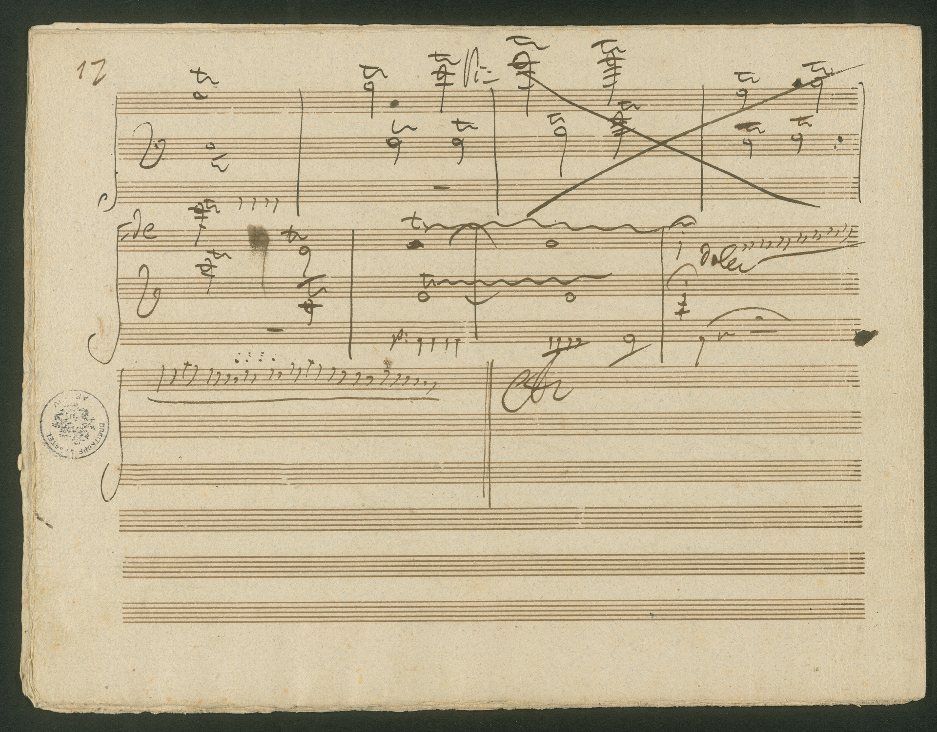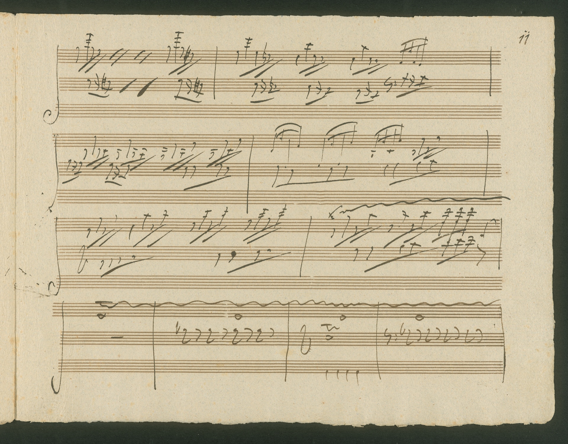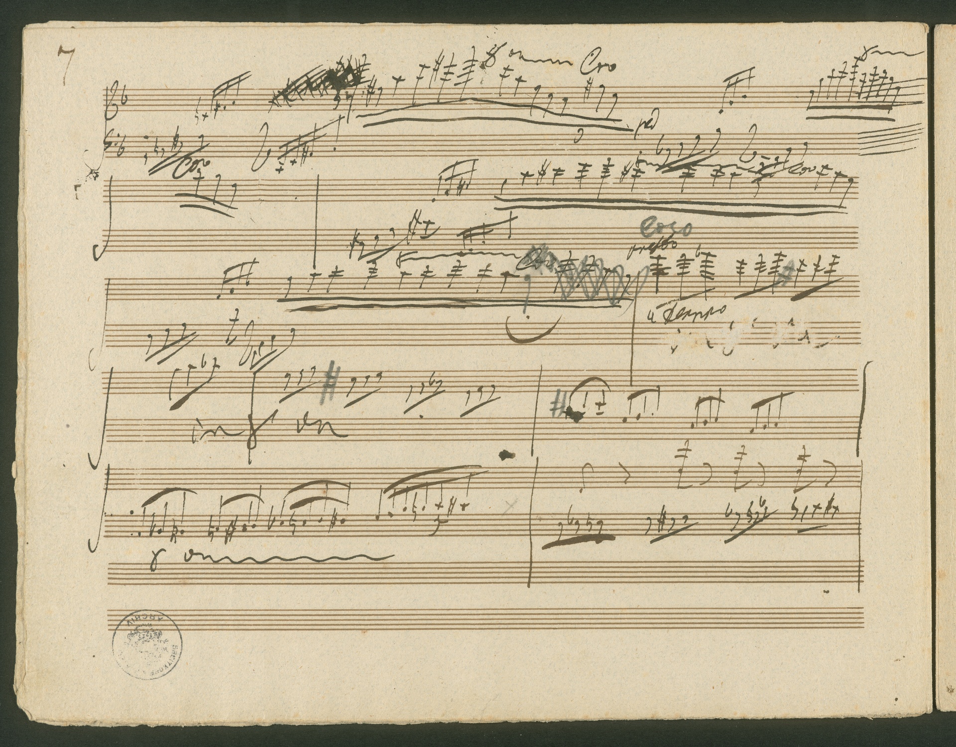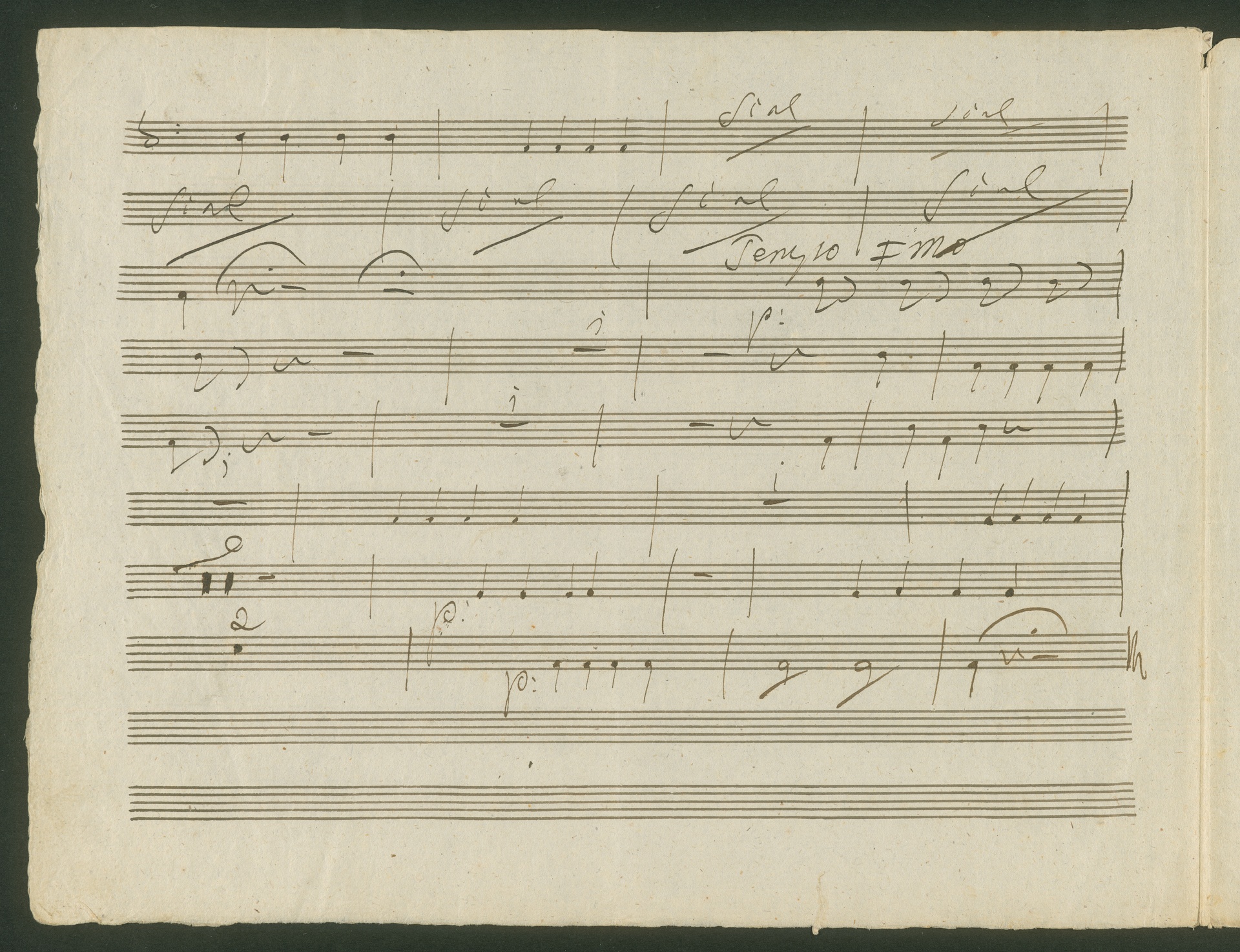 Auf Anregung des Londoner Verlegers Muzio Clementi arbeitete Beethoven sein Violinkonzert op. 61 um zu einer Fassung für Klavier und Orchester. Die Klavierbearbeitung erschien im August 1808. Während von der Bearbeitung kein Autograph überliefert ist, besitzen wir noch originale Kadenzen von Beethovens Hand für dieses Konzert. Hier abgebildet ist die Kadenz zum ersten Satz. Sie ist nicht nur ihrer Länge wegen - zwölf handgeschriebene Seiten! - ungewöhnlich. Der Klavierstimme liegt ein zweites Manuskript, eine extra geschriebene Paukenstimme bei. Eine Begleitstimme zu einer Kadenz? Da sollte doch eigentlich einzig der Solist seine Virtuosität vorführen. Dem Soloklavier ausgerechnet eine Pauke beizustellen, ist singulär in der Klavierliteratur. Schon zu Beginn des Konzerts hat die Pauke eine herausragende Rolle: mit vier Schlägen eröffnet sie solistisch das Geschehen. Vielleicht wollte Beethoven diese Rolle in der Kadenz noch einmal festigen und bestärken.