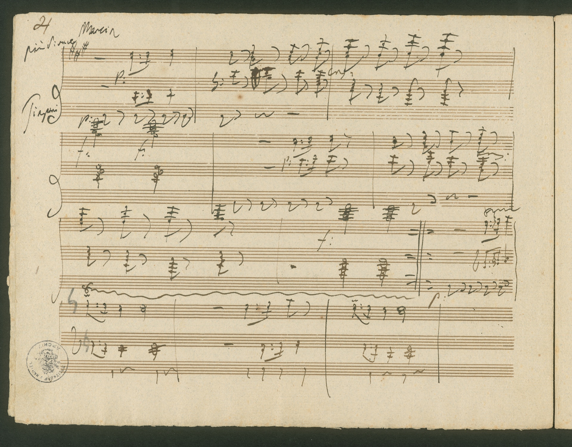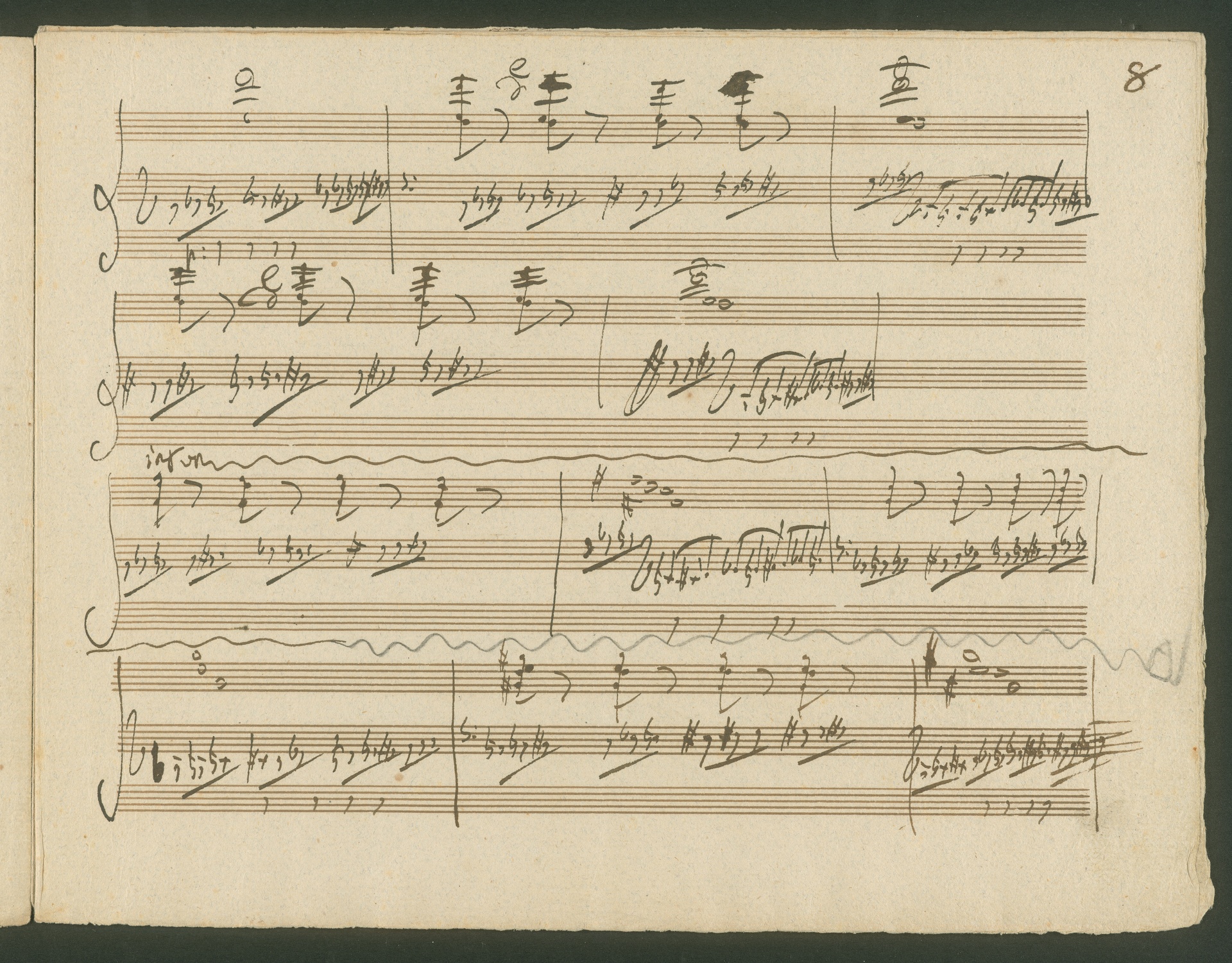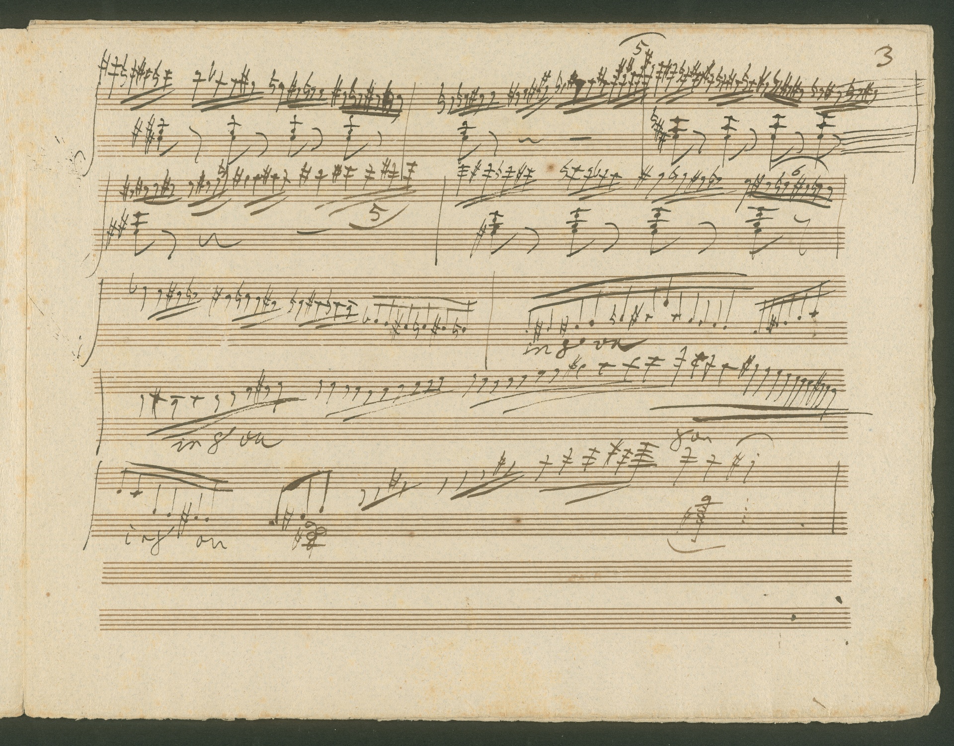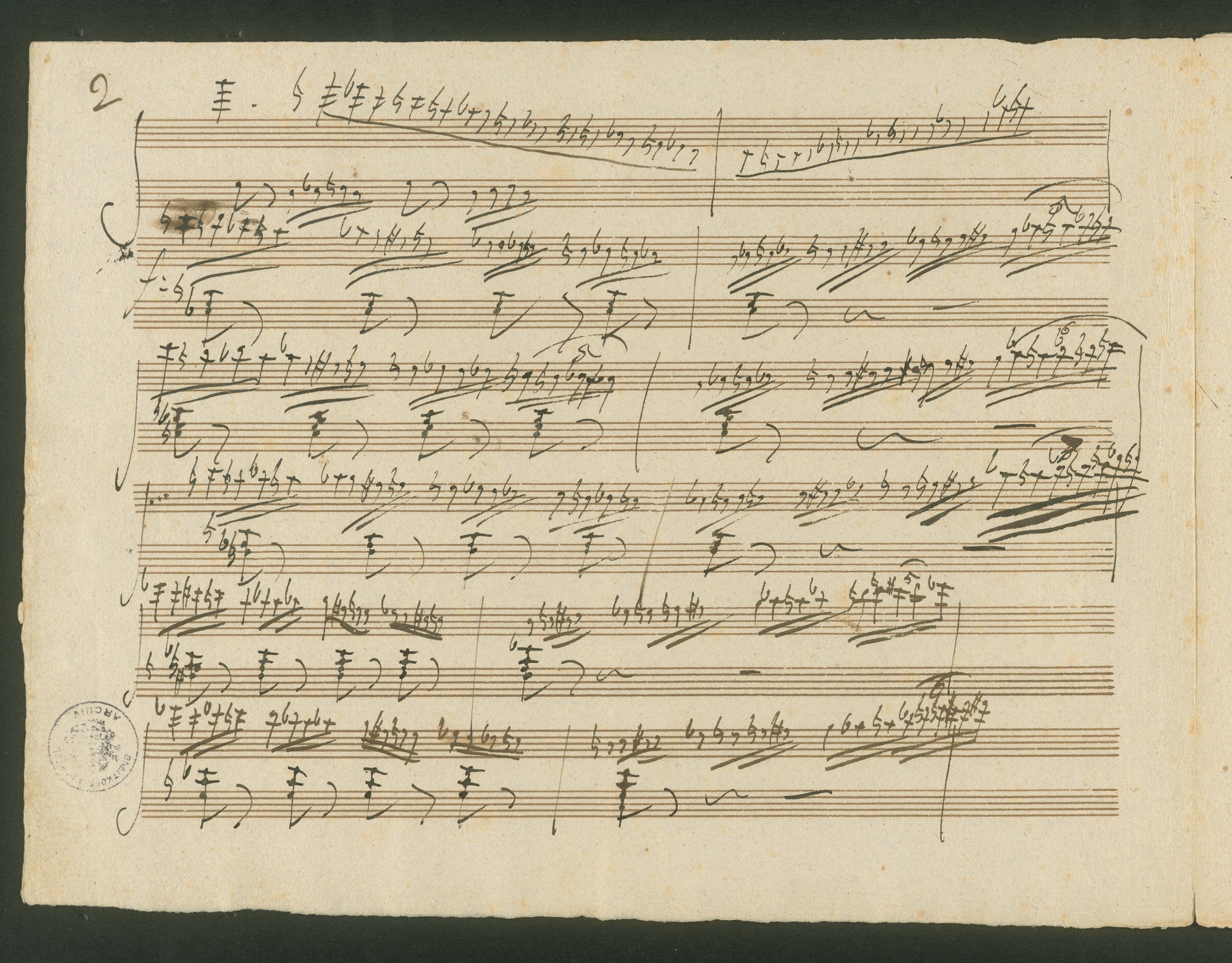 Auf Anregung des Londoner Verlegers Muzio Clementi arbeitete Beethoven sein Violinkonzert op. 61 um zu einer Fassung für Klavier und Orchester. Die Klavierbearbeitung erschien im August 1808. Während von der Bearbeitung kein Autograph überliefert ist, besitzen wir noch originale Kadenzen von Beethovens Hand für dieses Konzert. Hier abgebildet ist die Kadenz zum ersten Satz. Sie ist nicht nur ihrer Länge wegen - zwölf handgeschriebene Seiten! - ungewöhnlich. Der Klavierstimme liegt ein zweites Manuskript, eine extra geschriebene Paukenstimme bei. Eine Begleitstimme zu einer Kadenz? Da sollte doch eigentlich einzig der Solist seine Virtuosität vorführen. Dem Soloklavier ausgerechnet eine Pauke beizustellen, ist singulär in der Klavierliteratur. Schon zu Beginn des Konzerts hat die Pauke eine herausragende Rolle: mit vier Schlägen eröffnet sie solistisch das Geschehen. Vielleicht wollte Beethoven diese Rolle in der Kadenz noch einmal festigen und bestärken.