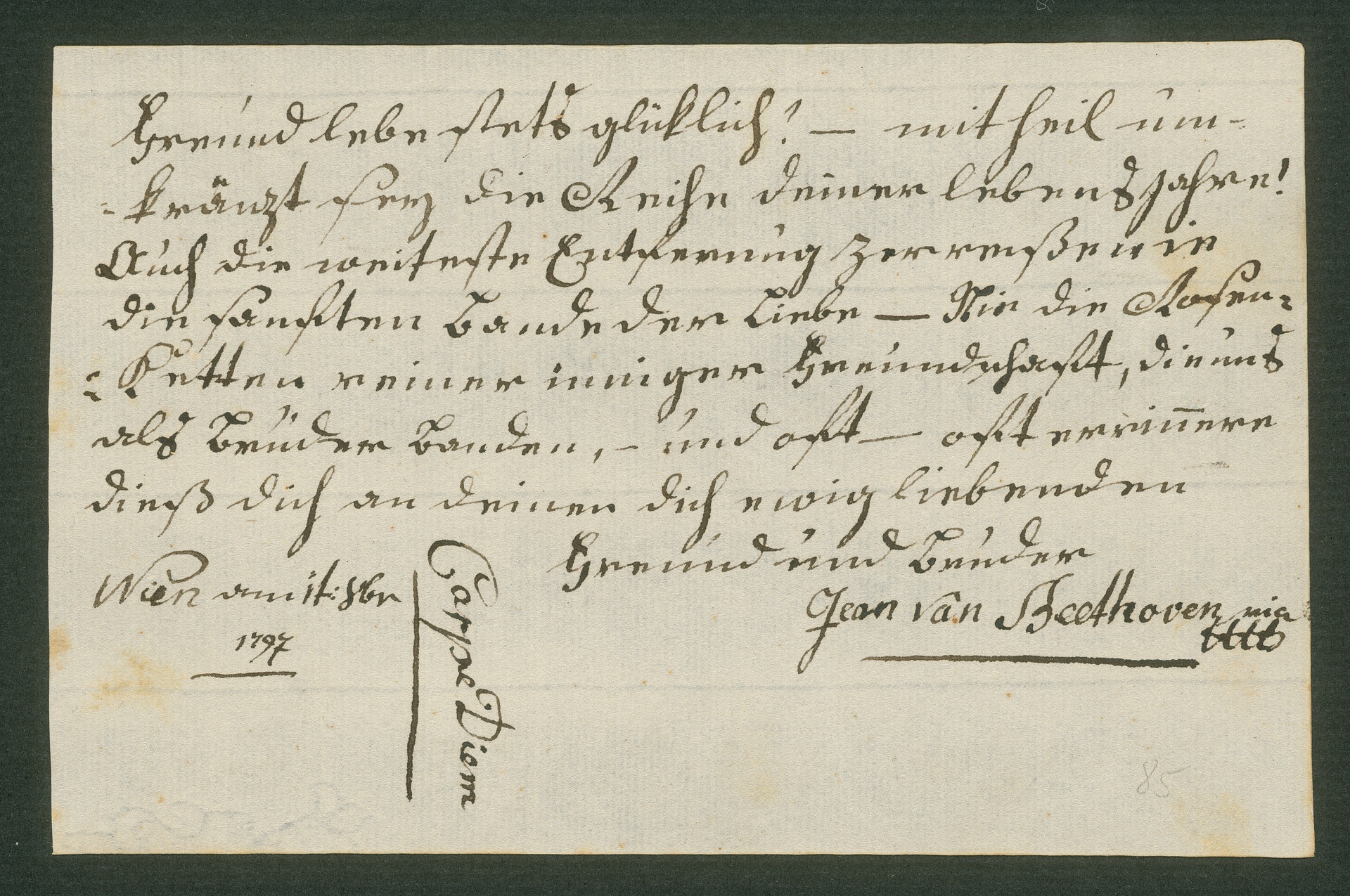 Widmung: "Freund lebe stets glücklich! - mit heil um= / =kränzt sey die Reihe deiner lebensjahre! / Auch die weiteste Entfernung zerreiße nie / die sanften Bande der Liebe - Nie die Rosen= / =Ketten reiner inniger Freundschaft, die uns / als Brüder Banden, - und oft - oft erinnere / dieß dich an deinen dich ewig liebenden / Freund und Bruder / Jean van Beethoven m[anu propr]ia [links quer:] Carpe Diem"