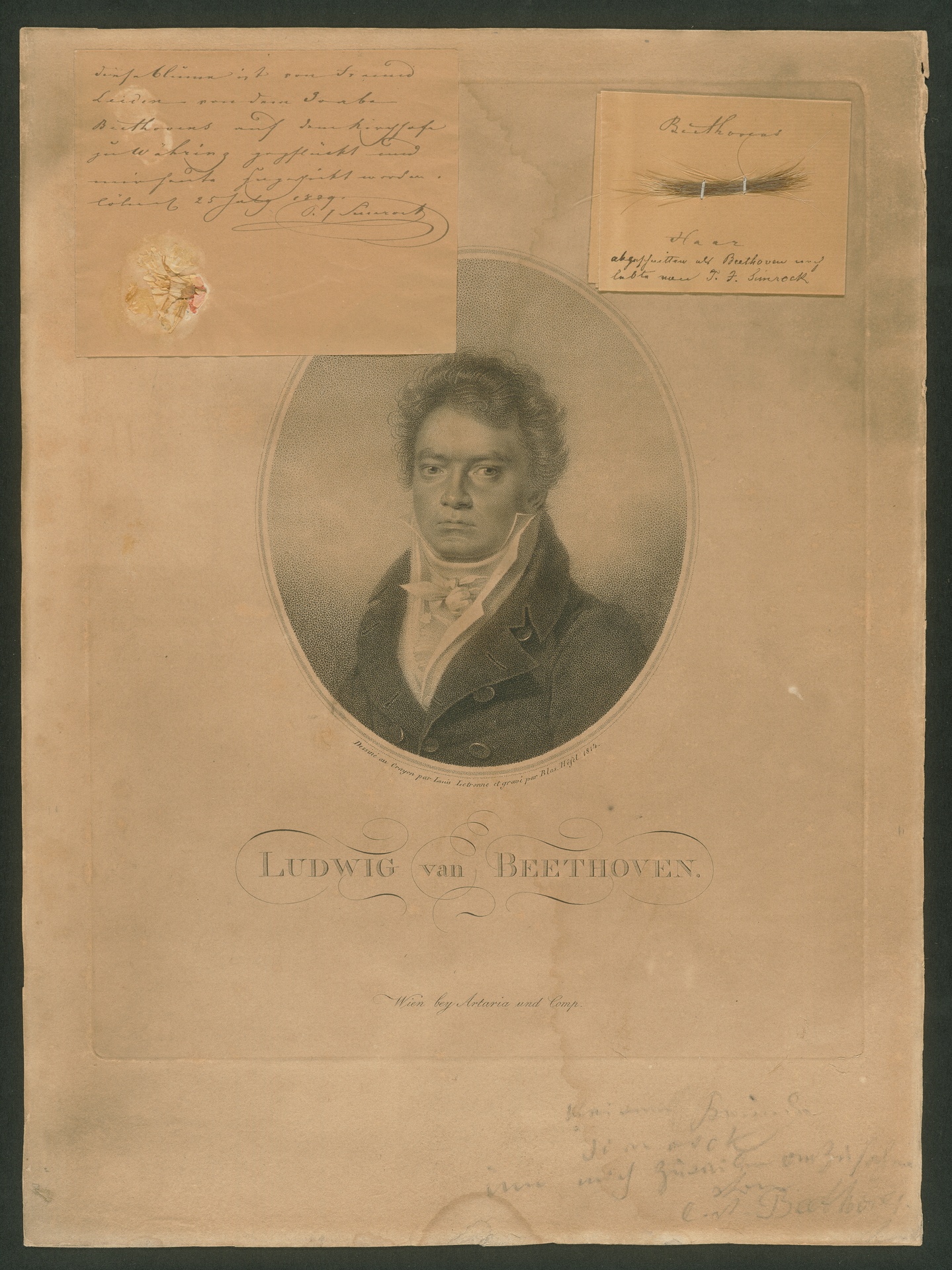 Ludwig van Beethoven - Kupferstich von Blasius Höfel nach einer Zeichnung von Louis Letronne, erschienen bei Artaria, mit eigenhändiger Widmung und Haaren Beethovens, Wien, 1814