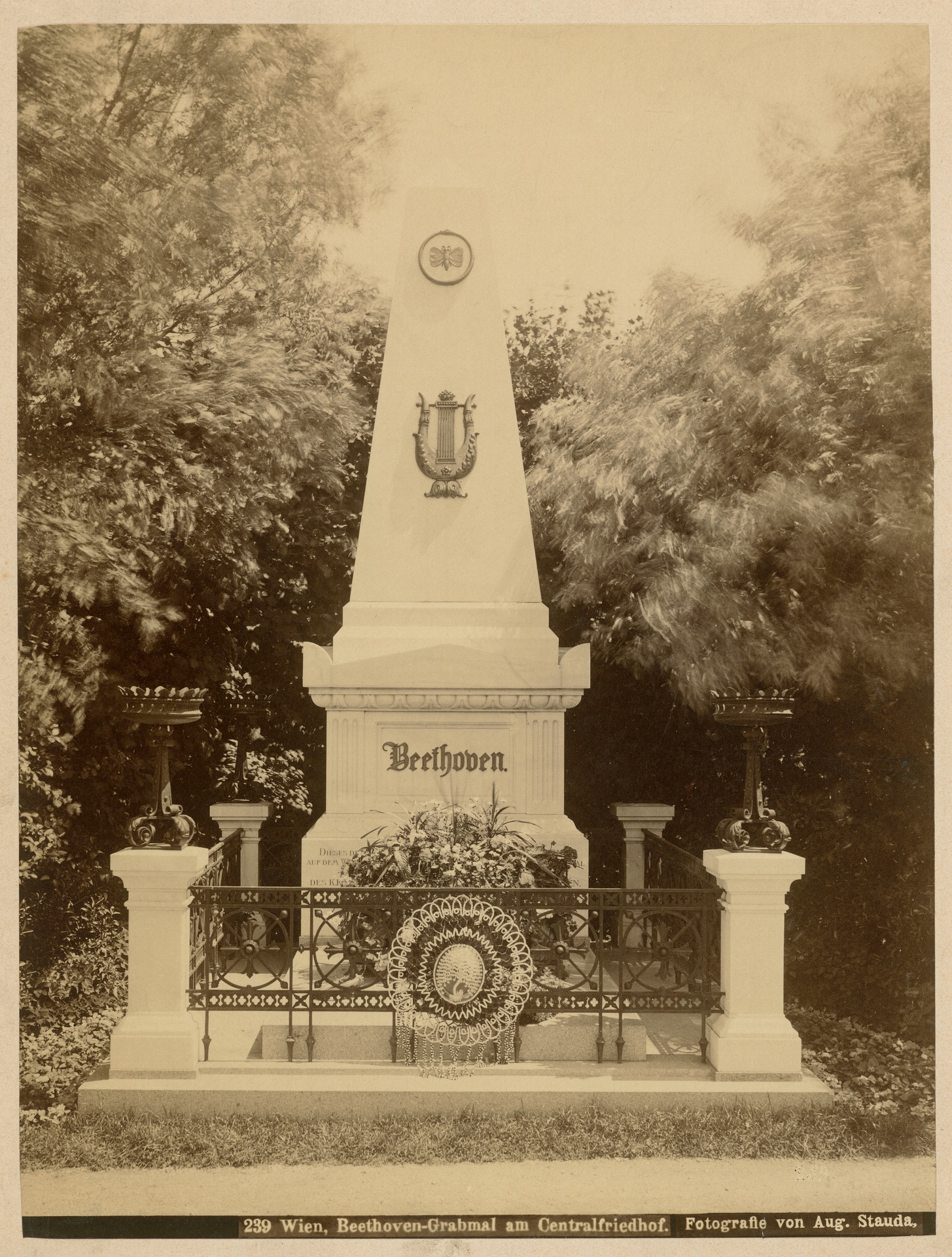 Beethovens Grabstätte auf dem Wiener Zentralfriedhof, um 1895/1900 - Fotografie von August Stauda mit der Abbildung des 1888 errichteten Ehrengrabes