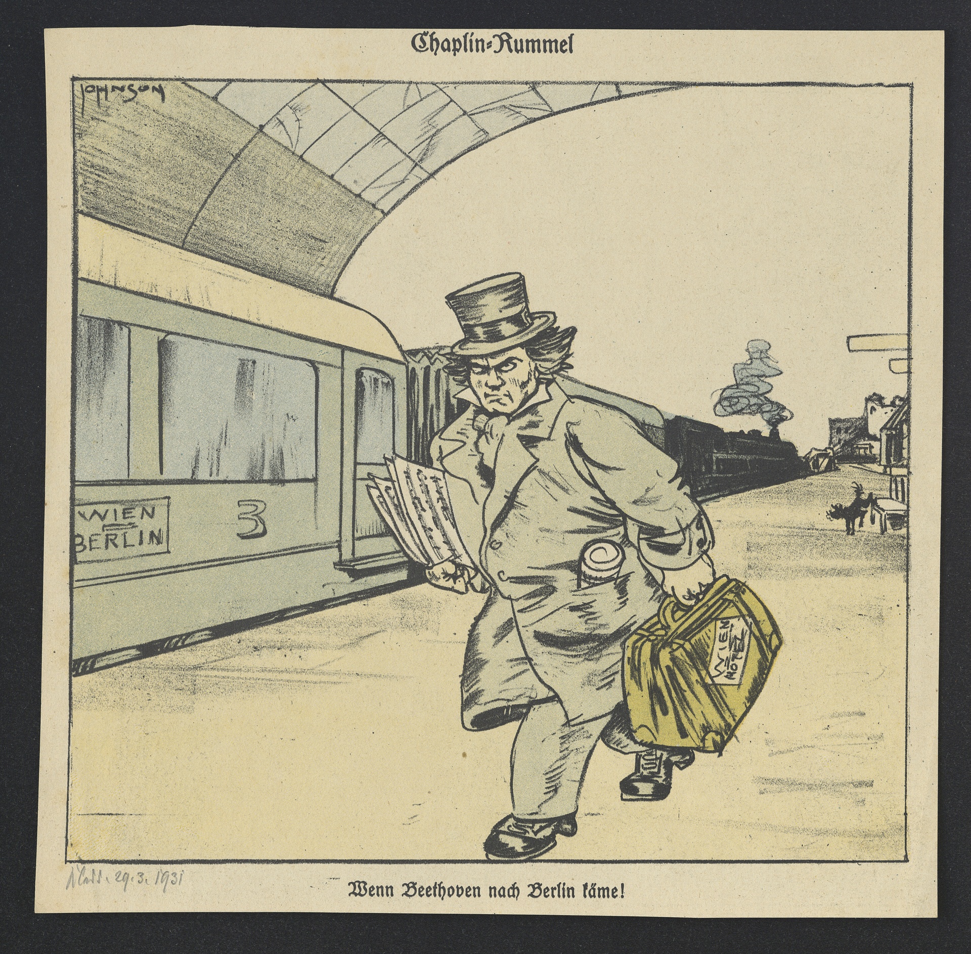 Ludwig van Beethoven, Karikatur: "Chaplin-Rummel - Wenn Beethoven nach Berlin käme!" - Reproduktion einer, vermutlich von Arthur Johnson stammenden Zeichnung