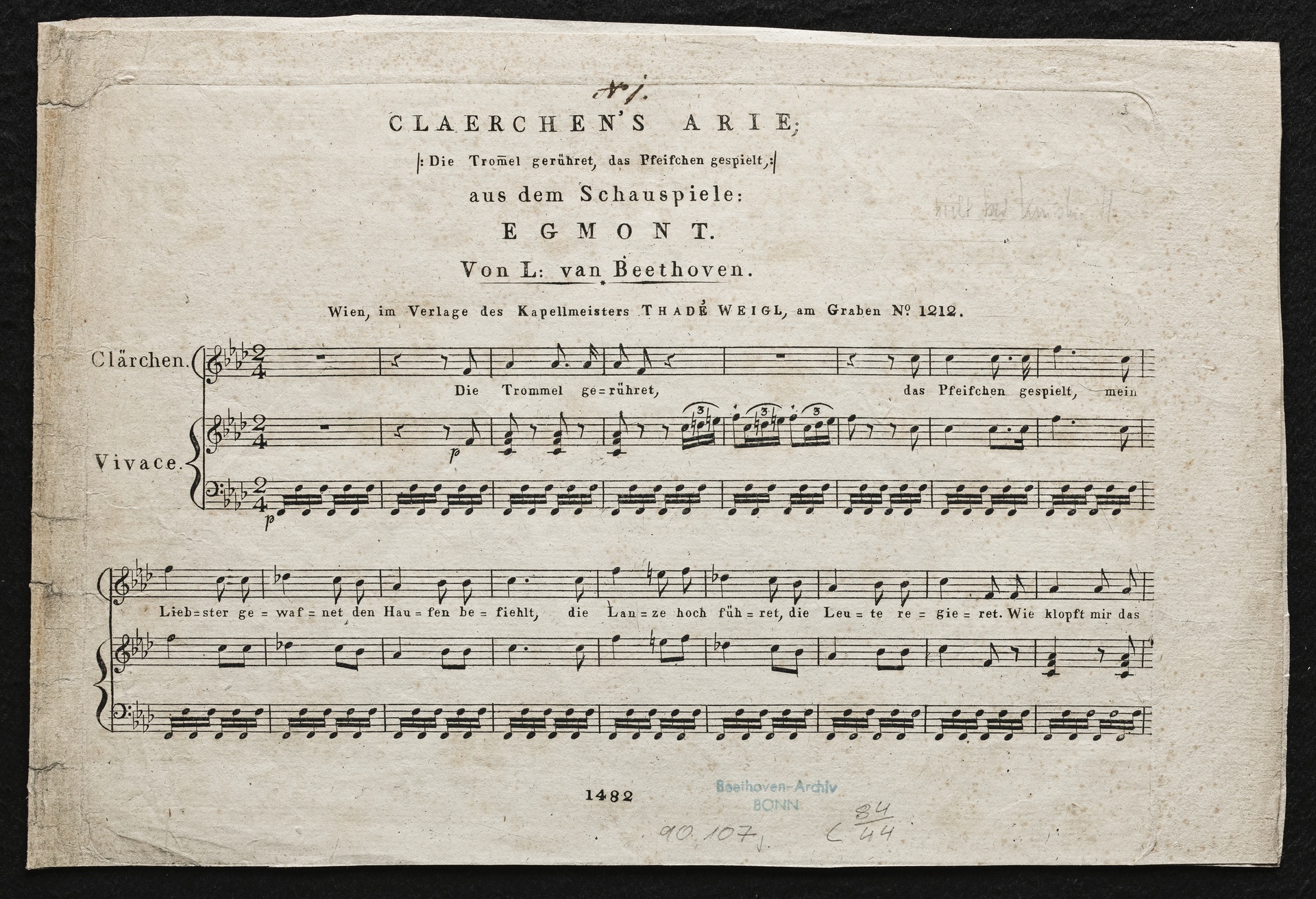 Ludwig van Beethoven, Musik zu Johann Wolfgang von Goethes Trauerspiel "Egmont", "Die Trommel gerühret", op. 84, 1, Klavierauszug, Weigl, 1482