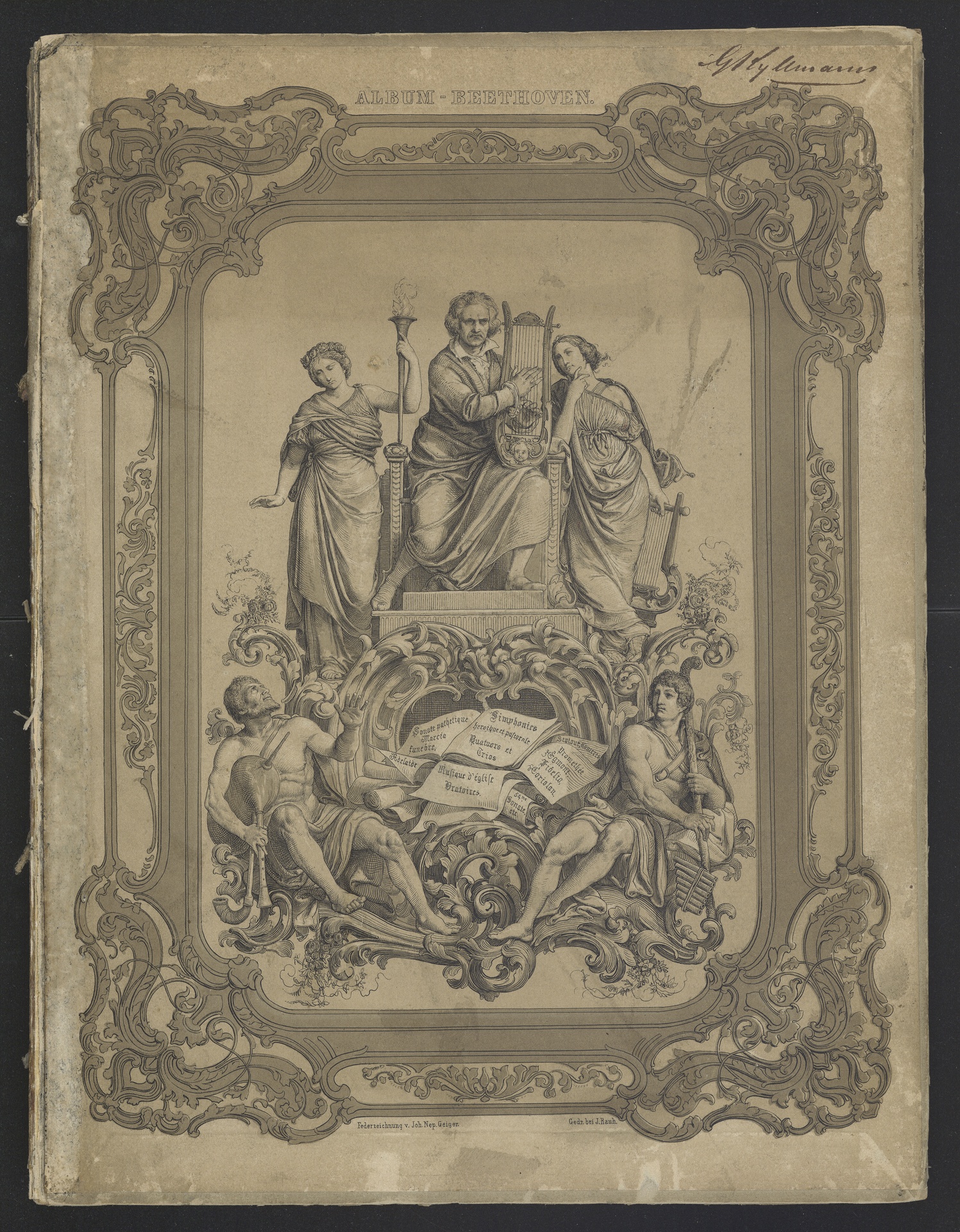 Bonn, Rheingasse, Wohnung der Familie van Beethoven, Wien, Schwarzspanierhaus, Grab Beethovens - Federzeichnung von Peter Johann Nepomuk Geiger, gedruckt bei J. Rauh, erschienen bei Mechetti, Wien, 1842