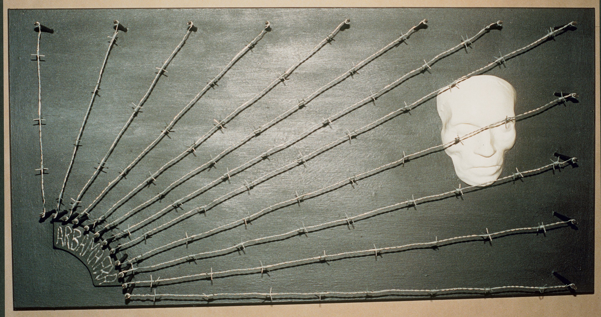 "Auschwitz" - Installation aus Stacheldraht und Totenmaske Beethovens - Fotografie einer Arbeit von P. Sotiriadis