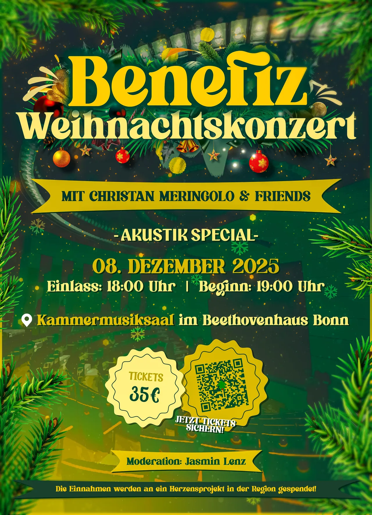 Bereits zum dritten Mal findet das Benefizweihnachtskonzert statt und lädt ein, sich gemeinsam mit Familie und Freunden auf die besinnliche Weihnachtszeit einzustimmen. In diesem Jahr gibt es ein exklusives Akustik Special. Mit gefühlvollen Interpretationen von Weihnachtsklassikern und beliebten Songs zum Mitsingen sind echte Gänsehautmomente vorprogrammiert. Ein intimes Konzert mit besonderen Klängen.