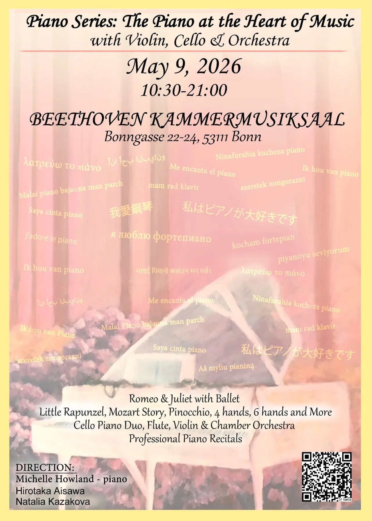 Romeo and Juliet with Ballet, Little Rapunzel, Mozart Story, Pinocchio, 4 hands, 6 hands and More, Cello Piano Duo, Flute, Violin and Chamber Orchestra, Professional Piano Recitals