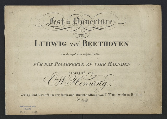 Die neue Ouvertüre op. 124 wurde hoch geschätzt und kam in den Folgejahren noch mehrfach zur Aufführung. Auf Vermittlung von Ferdinand Ries in London erwarb die London Philharmonic Society im Januar 1823 für 18 Monate das Exklusivrecht an der noch unveröffentlichten Ouvertüre und führte sie am 21.4.1823 unter der Leitung von George Smart in ihrem 5. Abonnementskonzert auf. Beethoven selbst brachte die Ouvertüre in seinen großen Akademien vom Mai 1824 neben seiner 9. Symphonie und Teilen aus der Missa solemnis zur Gehör, wo sie von der Kritik "unstreitig zu Beethovens allervollendetsten Arbeiten" gezählt wurde. Im August 1824 wurde op. 124 bei der Eröffnung des Königstädter Theaters in Berlin als "Festsymphonie" und im Dezember desselben Jahres im Rahmen der alljährlichen Wohltätigkeitsveranstaltung für das Bürgerspital im großen Redoutensaal in Wien aufgeführt. (J.R.)