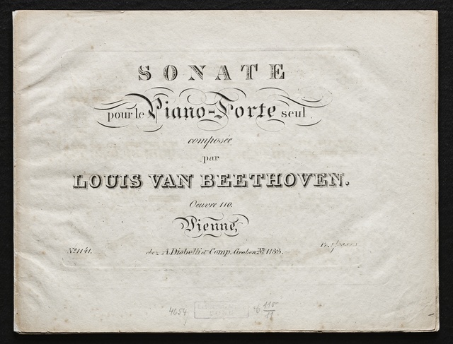 Am 12. Dezember 1821 kündete Beethoven Schlesinger bezüglich op. 110 an, die "Sonate werden sie wohl jezt sehr bald erhalten". Das Autograph stellte er laut Datierung am 25.12.1821 fertig und schickte es zwei Wochen später nach Berlin. Der Druck geht vergleichsweise unkompliziert vonstatten, die Sonate erscheint im August oder September 1822.