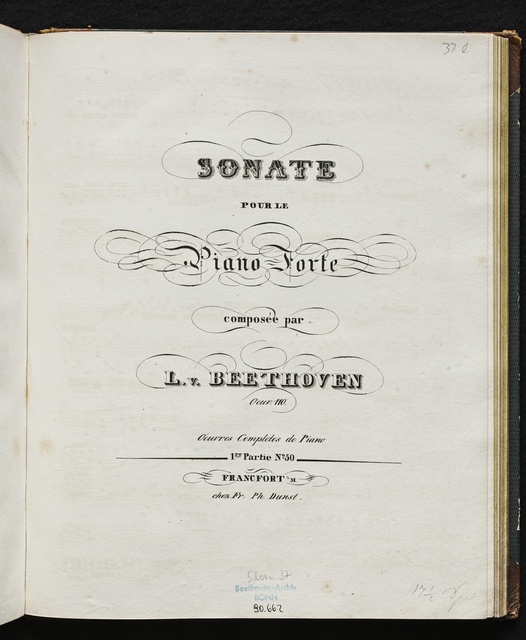 Opus 111 wird kurz nach op. 110 im Frühjahr 1822 fertig gestellt. Im Gegensatz zur vorangegangenen Sonate dauert der Druck- und Herstellungsprozess von Beethovens letzter, 32. Klaviersonate lange. Beethoven dringt auf Korrekturabzüge, die er auch erhält, jedoch erst im Februar 1823 wieder zurückschickt. Die Originalausgabe erscheint im Verlag des Sohnes Maurice Schlesinger in Paris vermutlich im April 1823, bei dessen Vater in Berlin im Mai 1823. Die Ausgabe hat jedoch so viele Fehler, dass Beethoven erbost darüber den Wiener Verleger Diabelli mit einem korrigierten Nachdruck beauftragt. (J.R.)