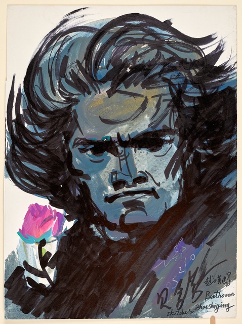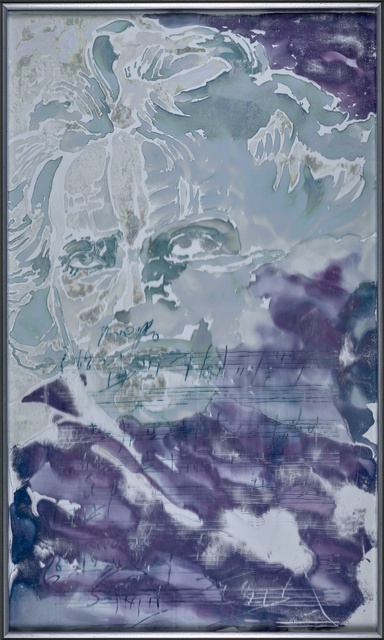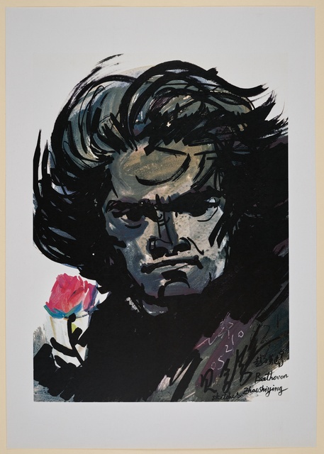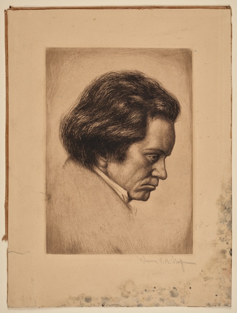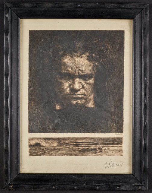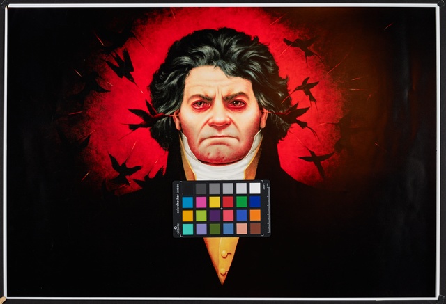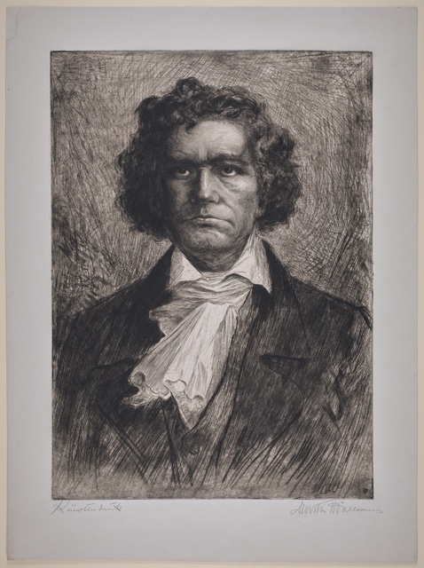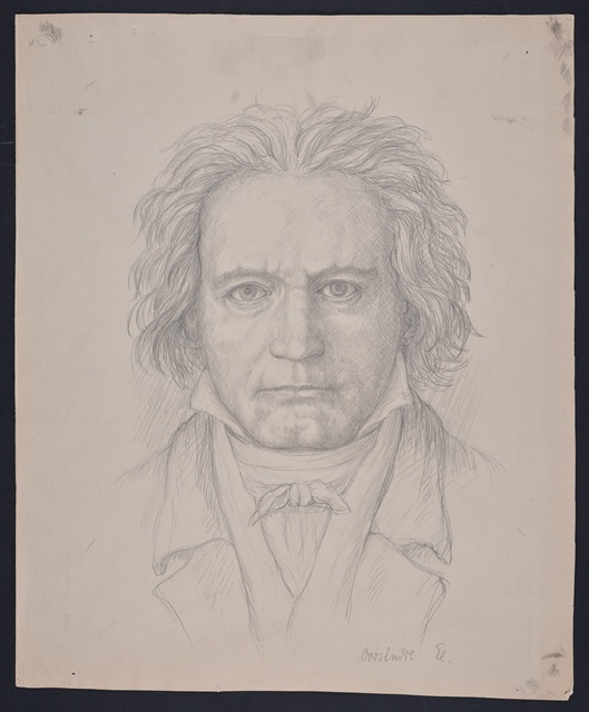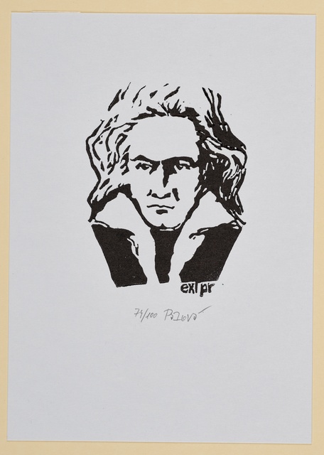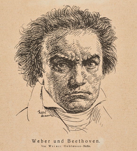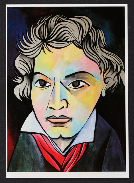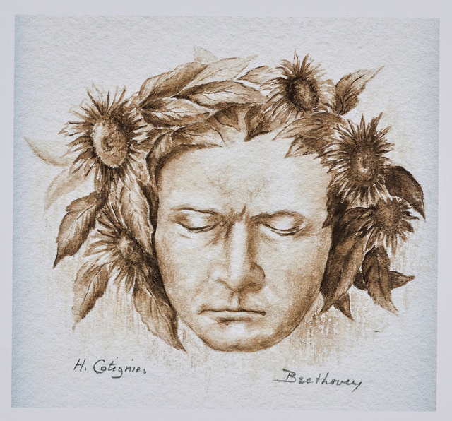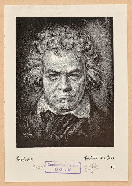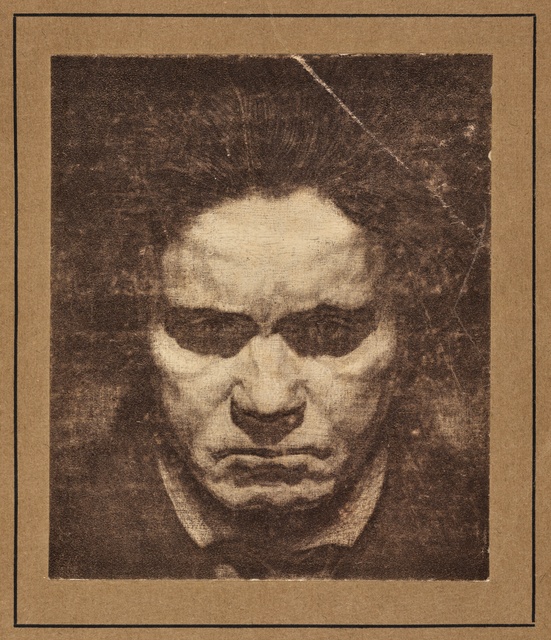 Ludwig van Beethoven, Kopf, gefüllt mit weiblichen Gestalten und Putten - anonyme Graphik, wohl aus dem 1. Drittel des 20. Jahrhunderts, Reproduktionsfotografie einer Aufnahme des Ateliers A.R. & C., Bonn, um 1980?