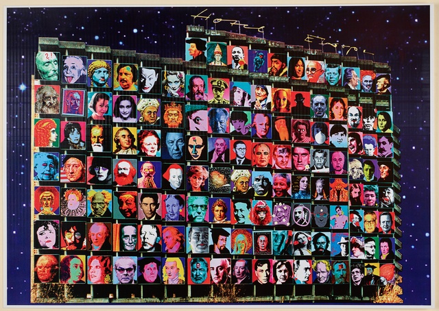 "Hotel Europa" - Installation von HA Schult aus dem Jahr 1999 mit 130 Portraits bekannter Persönlichkeiten aus der europäischen Geschichte, darunter Ludwig van Beethoven nach Mähler, an der Hotel-Bauruine des sogenannten "Kaiserbaus" an der Autobahn 59 bei Troisdorf-Sieglar, Farbreproduktion einer Fotografie, Bonn, um 2010